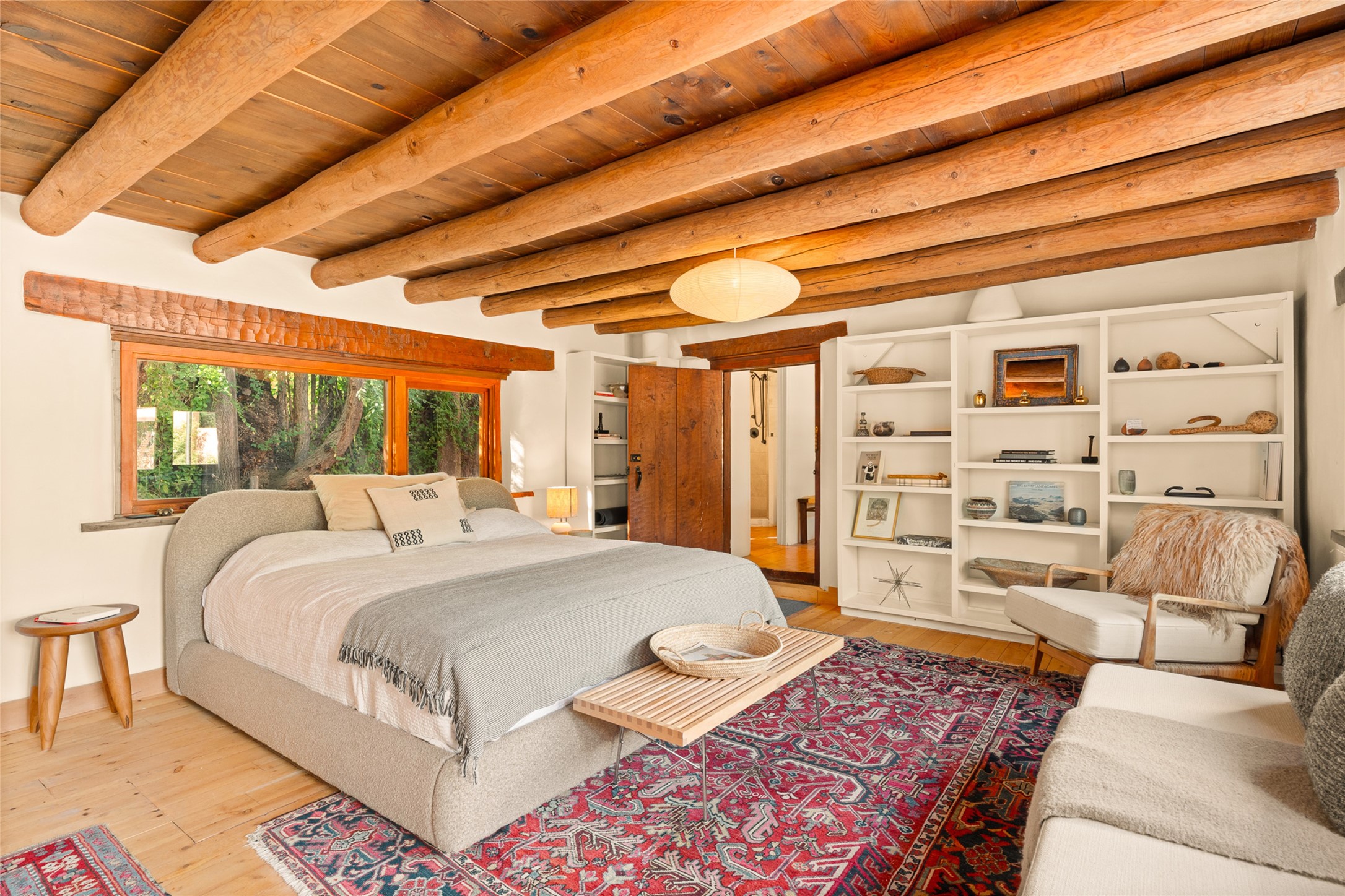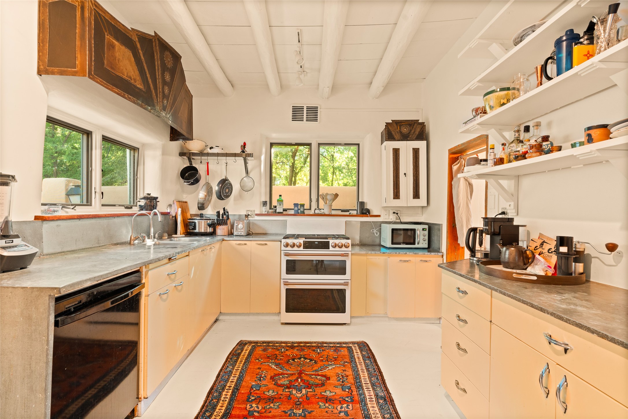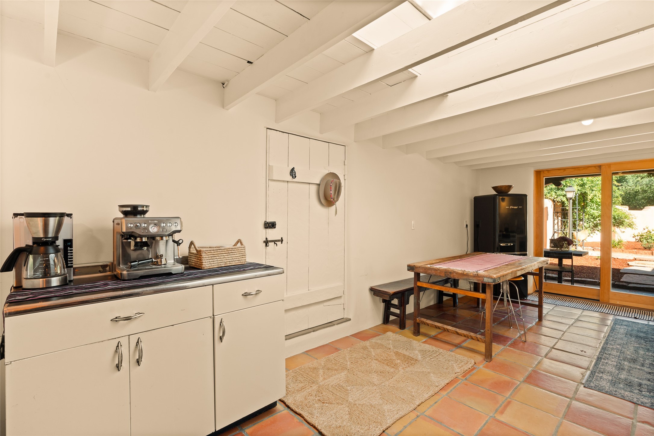 Recently updated with a rich old world charm and history (formerly El Cuervito Ranch), this private and gated compound is situated in the lush village of Tesuque just steps away from El Nido Restaurant, the famed Tesuque Village Market and the world-renowned Santa Fe Opera. Consisting of 0.754 beautifully manicured acres, the entry courtyard has stone pathways and seasonal greenery, creating a warm and inviting playground for the senses. The property consists of a main house (two bedrooms/two baths), guesthouse (one bedroom/one bath), and three separate studio spaces all served by both a shared well and the Tesuque Community Water System. The interiors of these adobe and frame constructed homes are washed with light and have vast tree-lined views in every direction. Formal living spaces open out onto a plethora of indoor/outdoor entertaining options with sitting portals weaving the beauty of nature into the living environment. There is a nice separation of space between the structures, but the property also offers many uses as it is zoned Rural Commercial, allowing many business options for the homeowner. Classic in style, this sensuous property has been fitted with mini-split heating and A/C, plastered walls, wood floors, vigas and beams, completely walled and tucked away in one of Santa Fe's finest idyllic locales.