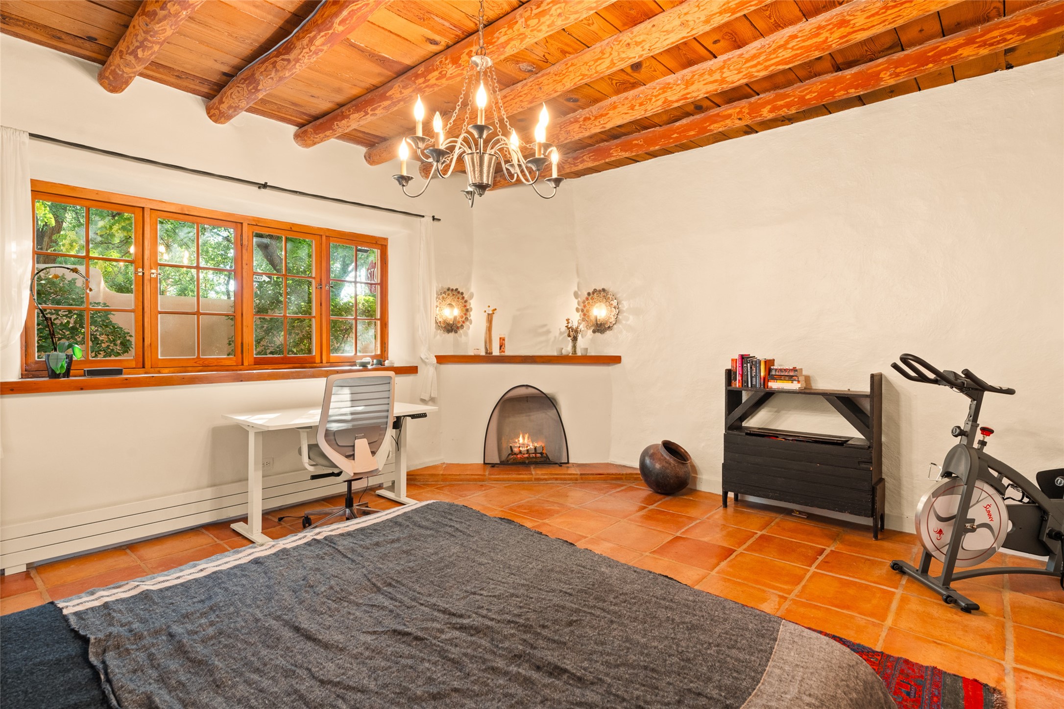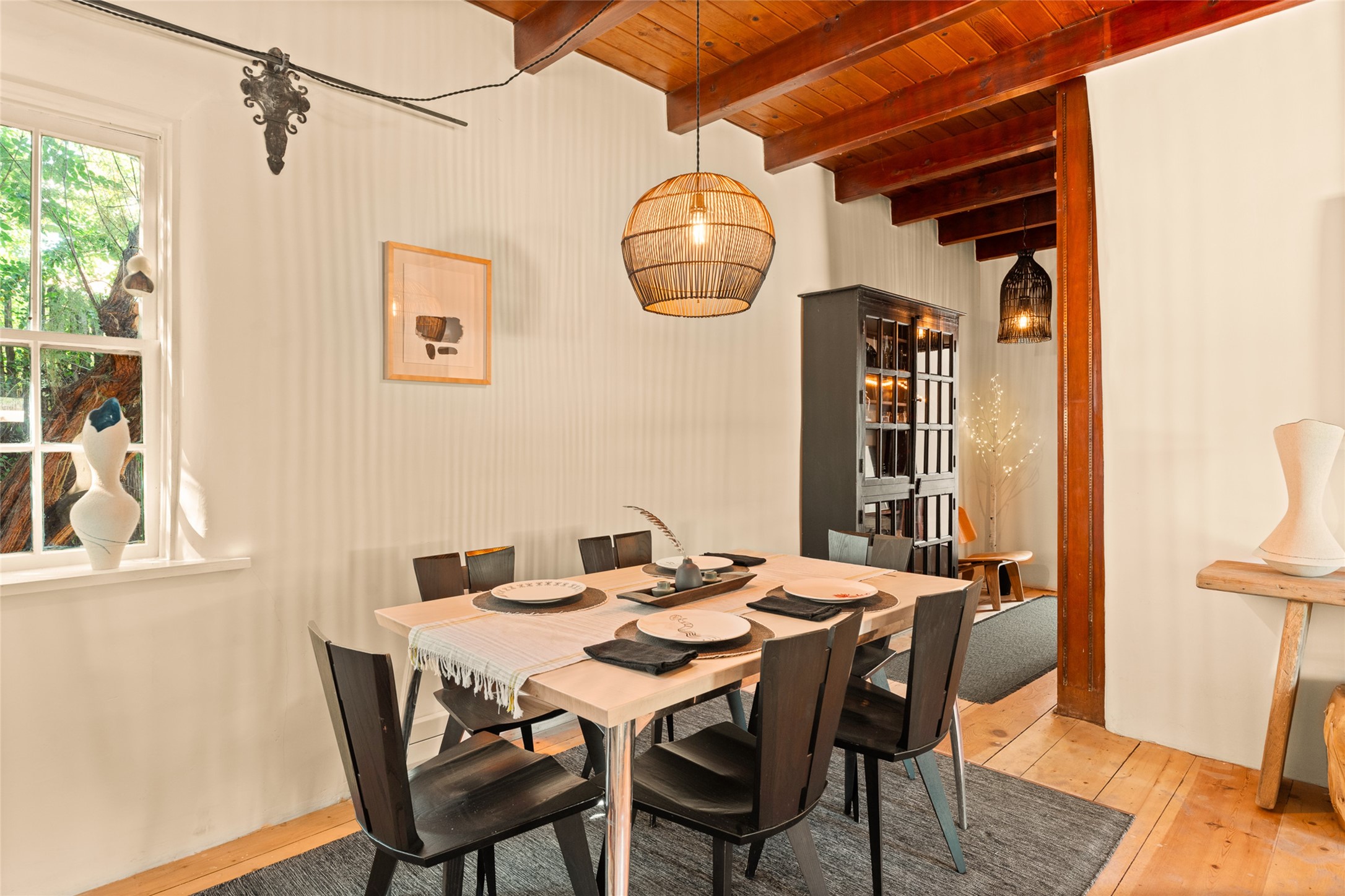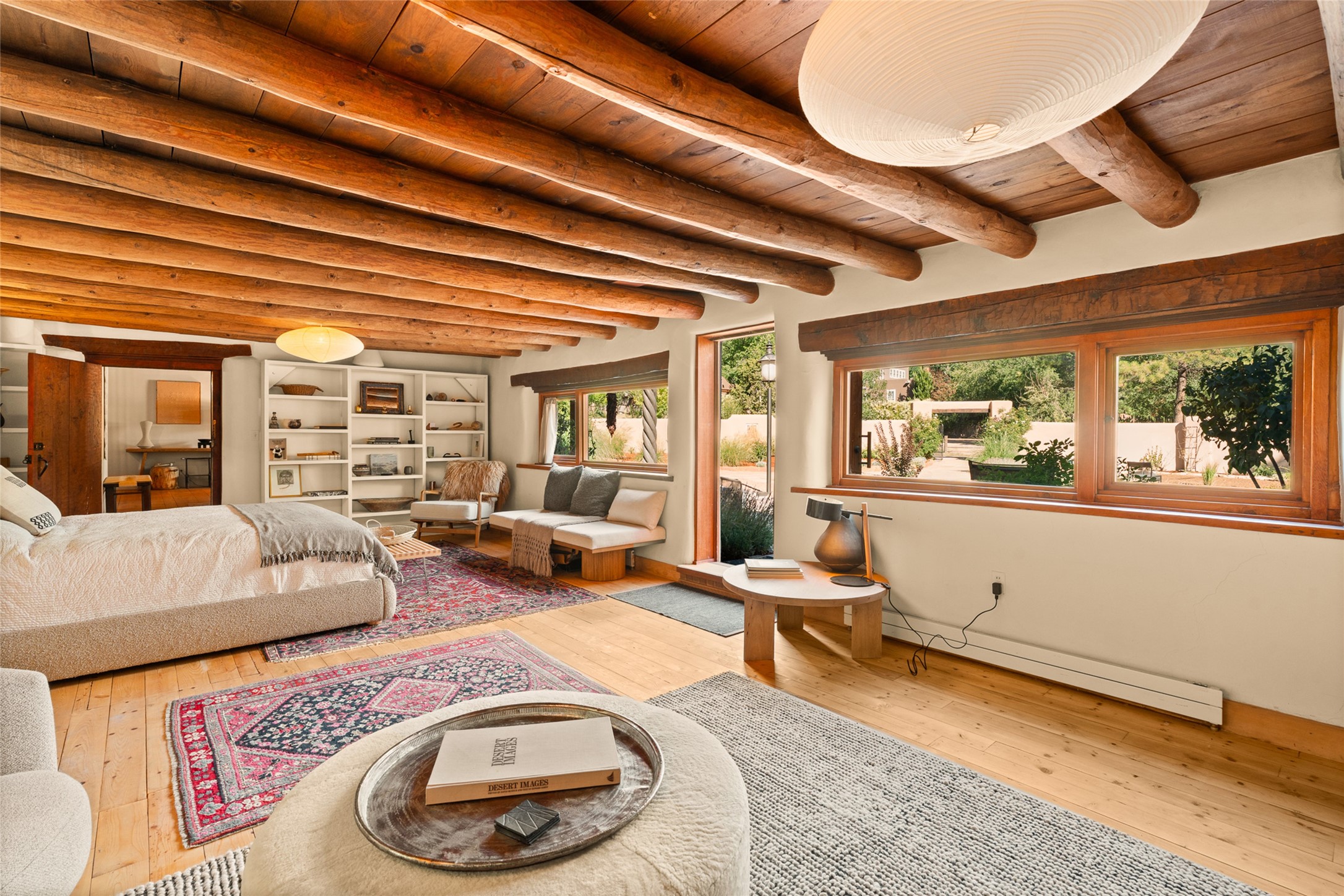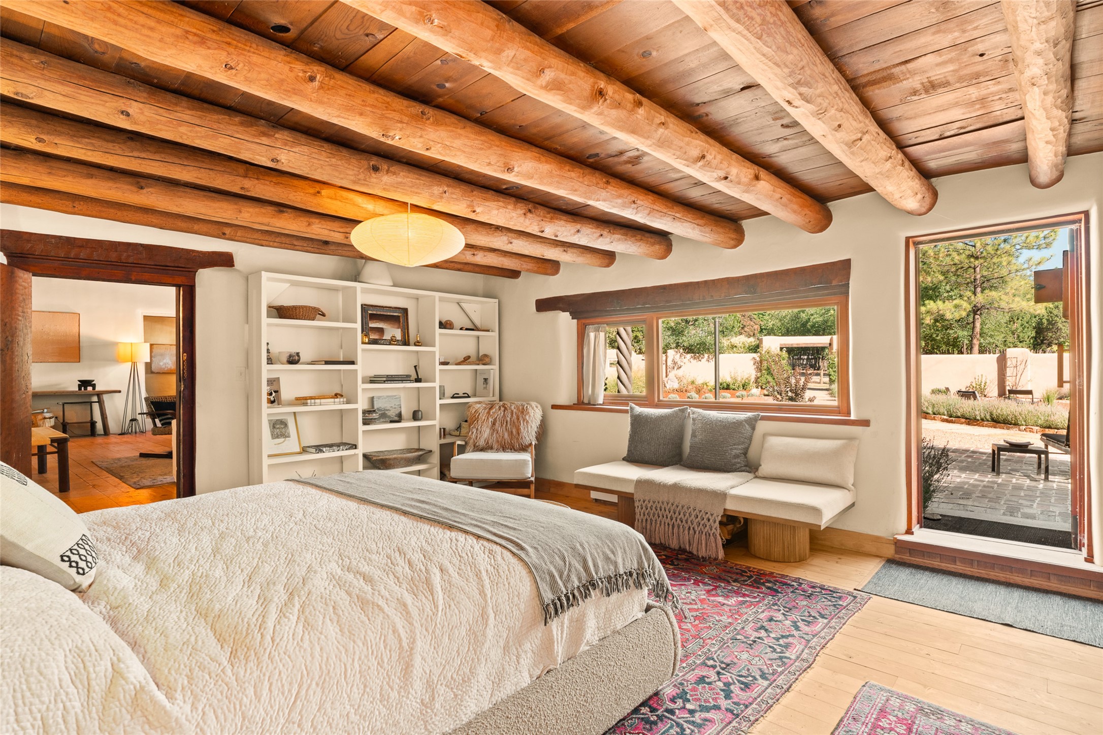 Recently updated with a rich old world charm and history (formerly El Cuervito Ranch), this private and gated compound is situated in the lush village of Tesuque just steps away from El Nido Restaurant, the famed Tesuque Village Market and the world-renowned Santa Fe Opera. Consisting of 0.754 beautifully manicured acres, the entry courtyard has stone pathways and seasonal greenery, creating a warm and inviting playground for the senses. The property consists of a main house (two bedrooms/two baths), guesthouse (one bedroom/one bath), and three separate studio spaces all served by both a shared well and the Tesuque Community Water System. The interiors of these adobe and frame constructed homes are washed with light and have vast tree-lined views in every direction. Formal living spaces open out onto a plethora of indoor/outdoor entertaining options with sitting portals weaving the beauty of nature into the living environment. There is a nice separation of space between the structures, but the property also offers many uses as it is zoned Rural Commercial, allowing many business options for the homeowner. Classic in style, this sensuous property has been fitted with mini-split heating and A/C, plastered walls, wood floors, vigas and beams, completely walled and tucked away in one of Santa Fe's finest idyllic locales.
