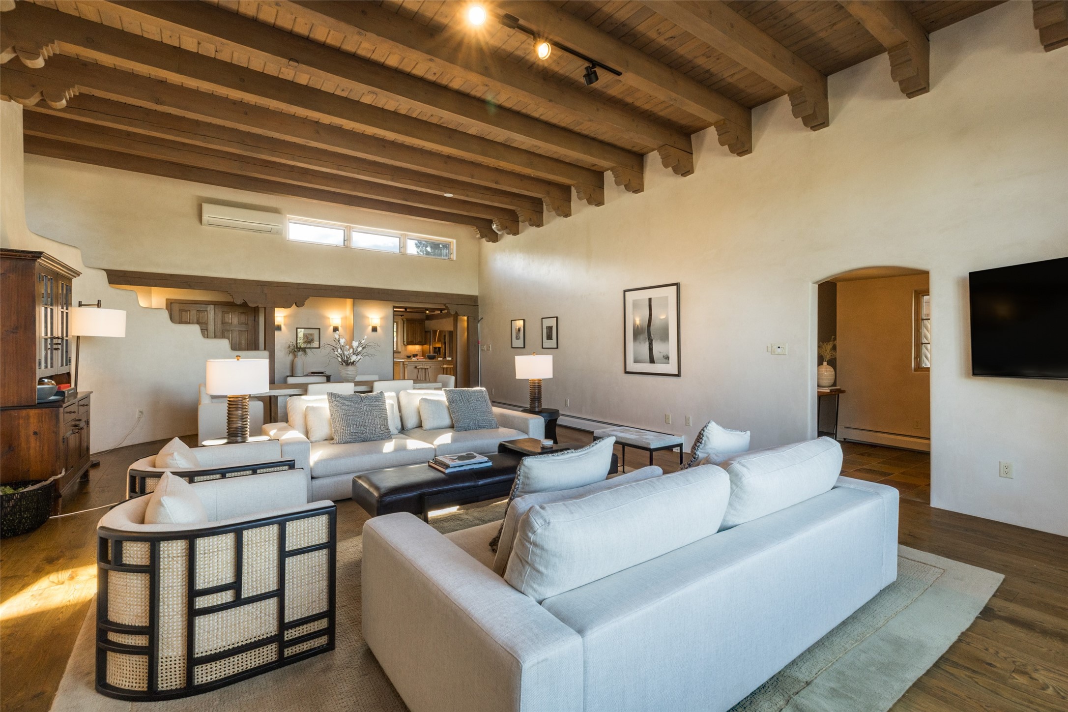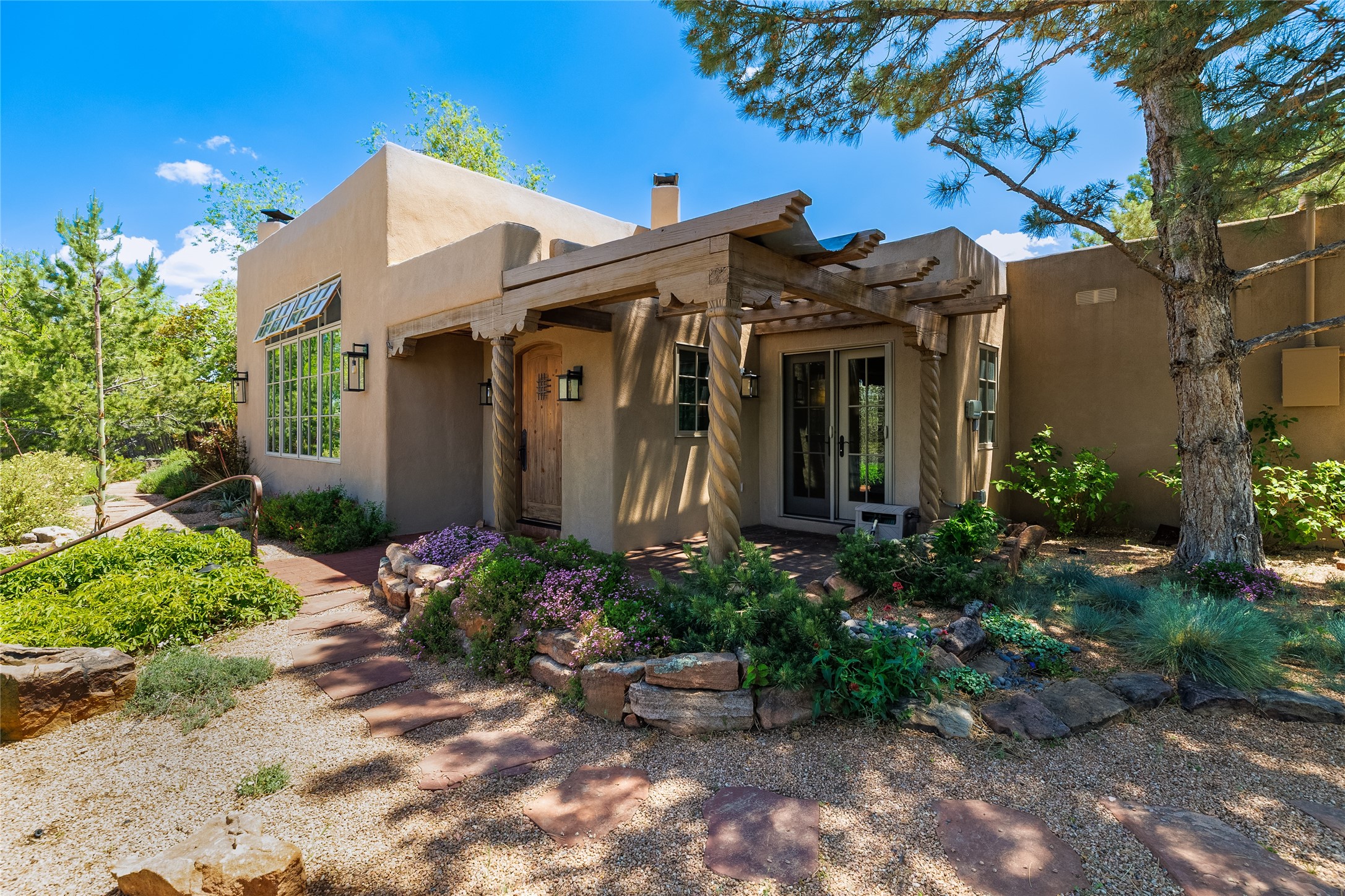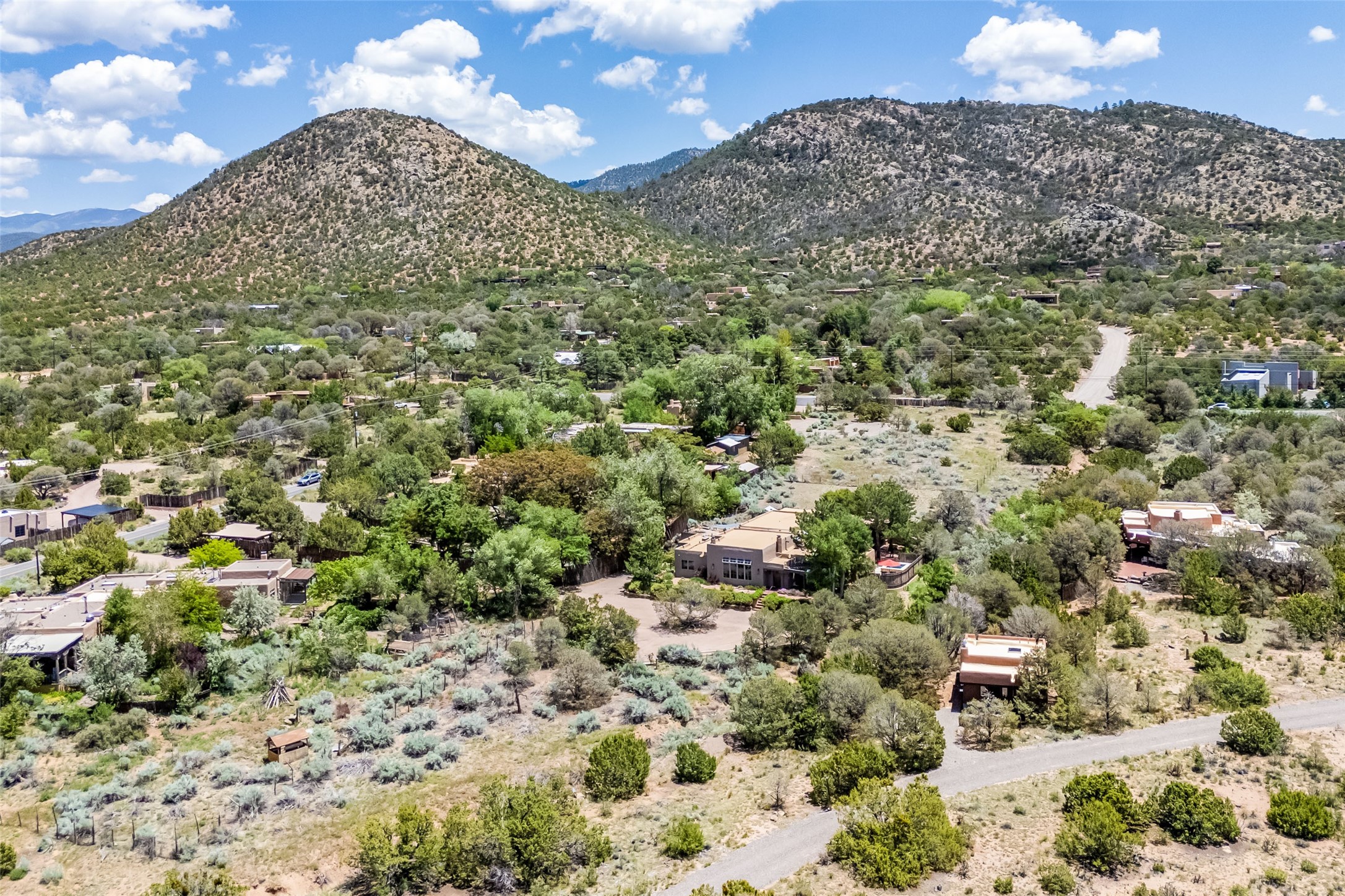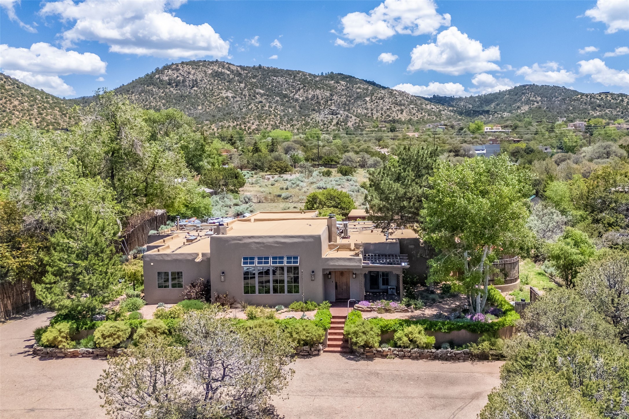 Built in 1983-84 by Grover/Ivey, nestled in the cherished Santa Fe Eastside, this home sits on a very private 1.045 acre parcel just off the Old Santa Fe Trail with magnificent East and West views of Sun & Moon Mountains as well as the Jemez Range, all but assuring the daily drama of powerful sunrise and sunset views. A very inviting and large living room immediately sets a gracious entertaining ambience with 12' ceilings, long elegant vigas and embossed corbels that are accented with a west facing picture window and accompanying corner kiva fireplace. A grand Chef's kitchen stands ready for friends and family equally providing outdoor access to a large terraced dining and media venue with a recently added (2022) heated plunge pool festive zone nearby!The house footprint (3,640 sq ft) includes three formal bedrooms (one being primary), two larger optional use suites for creative uses and needs, three and one half bathrooms surround these rooms with 3 interior Kiva fireplaces and one exterior stone fireplace surround for those Winter moments! The Primary bedroom has a newly renovated bathroom, shower, sink and closet installs by Lisa Samuel's Alchemy providing a nice Contemporary feel to the Owner quarters.Neighborhood access to E Zia Road as well as Old SF Trail provides quick & easy shopping, grocery, health care and athletic services. Sun Mountain Trailhead is 5 minutes away...and various local School possibilities are nearby. A Lifetime fiberglass storage shed with double door entry two skylights and fixed window convey on to Buyer at Closing. Should new Owner be wondering about a Casita possibility onsite, there is ample room to build eastwards in the open field subject to Historic Review District overlay approval. Mature and abundant landscaping is readily apparent throughout the property. Privacy and grace are signature features of this lovely distinguished home.