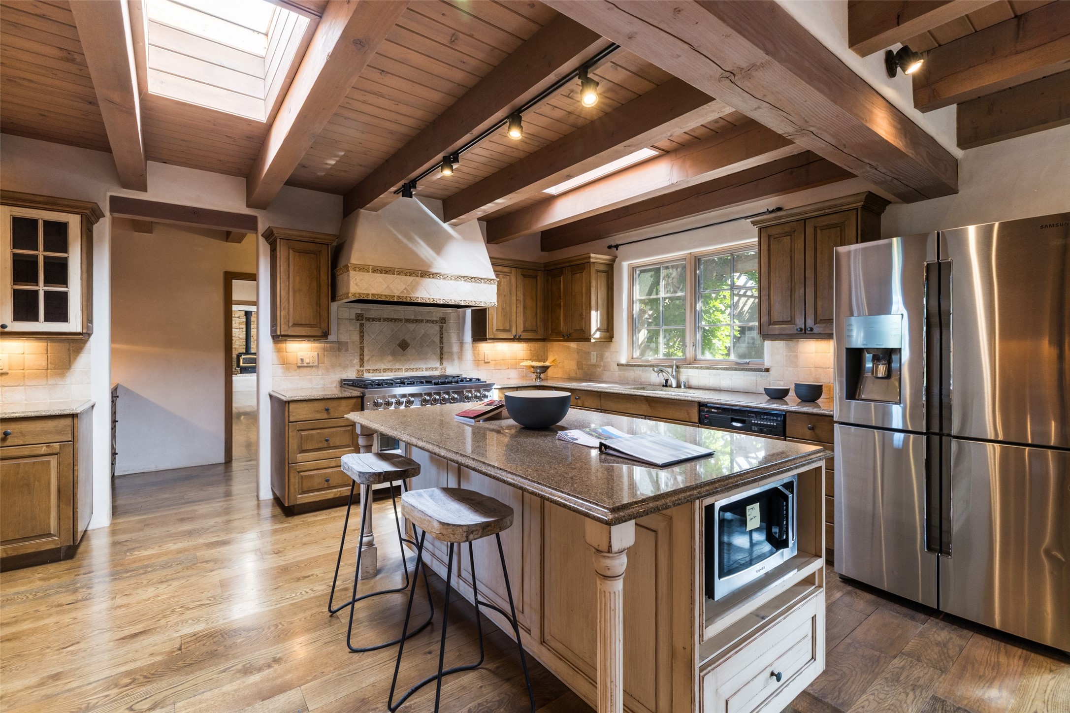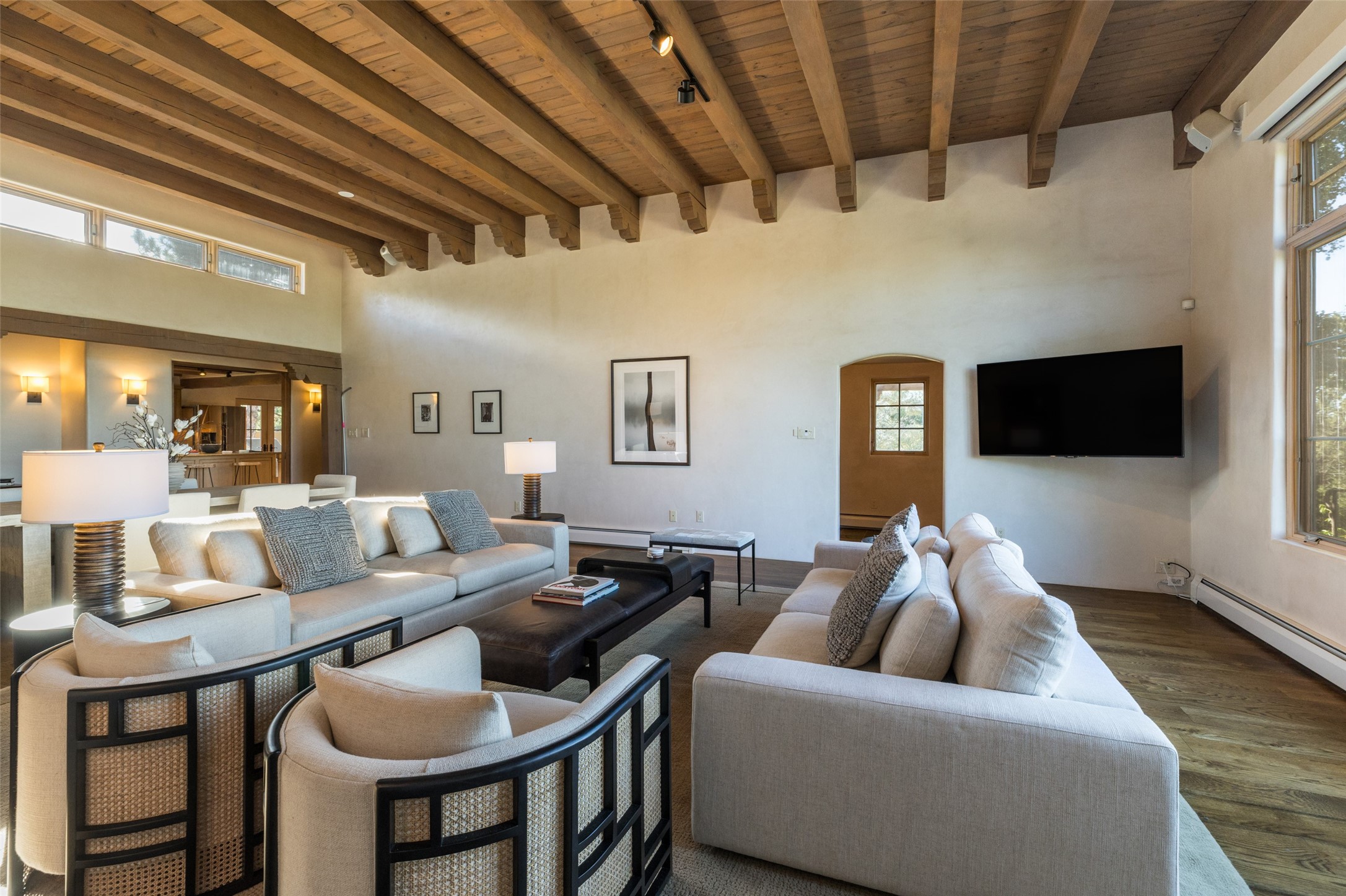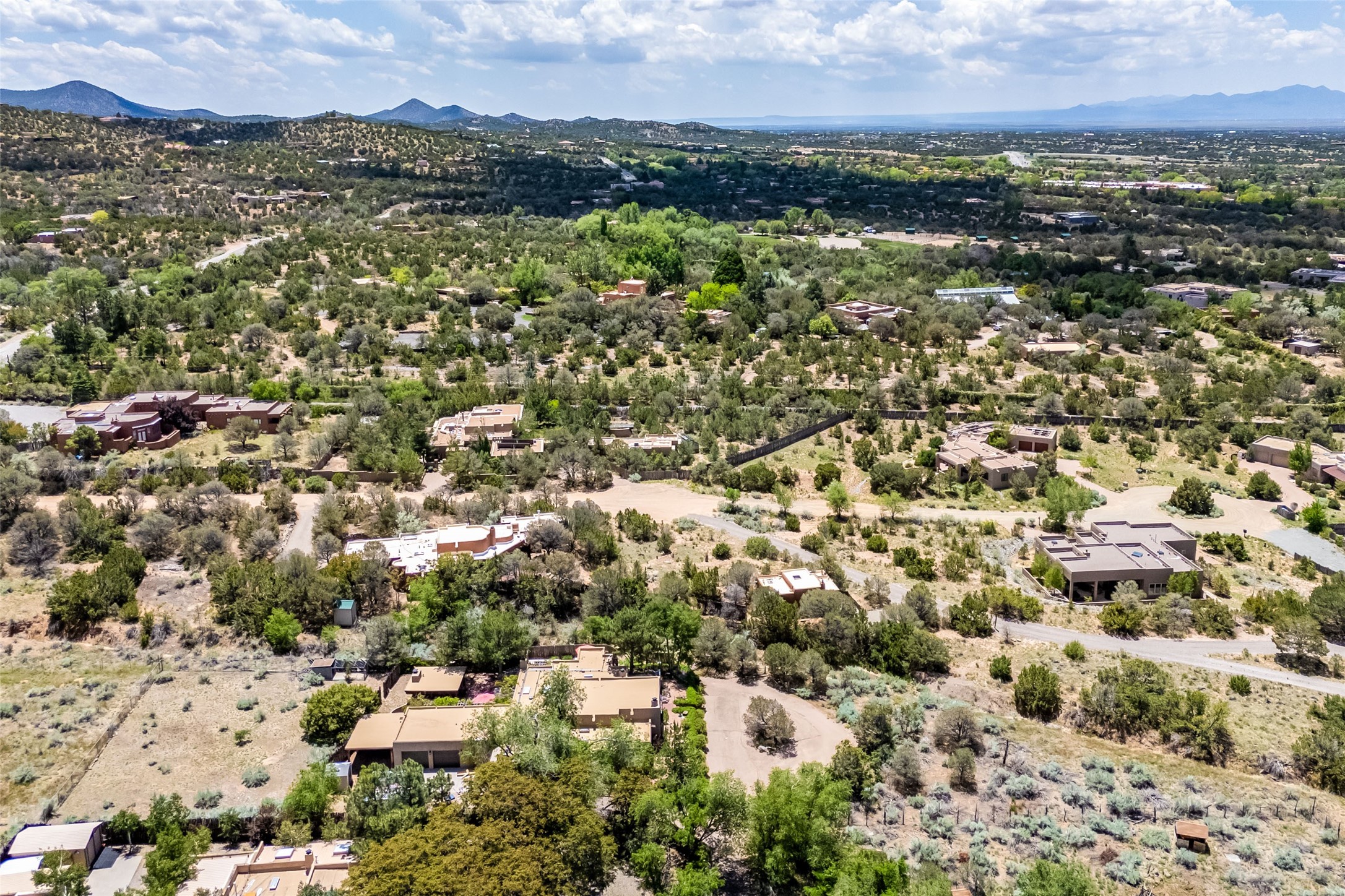 Built in 1983-84 by Grover/Ivey, nestled in the cherished Santa Fe Eastside, this home sits on a very private 1.045 acre parcel just off the Old Santa Fe Trail with magnificent East and West views of Sun & Moon Mountains as well as the Jemez Range, all but assuring the daily drama of powerful sunrise and sunset views. A very inviting and large living room immediately sets a gracious entertaining ambience with 12' ceilings, long elegant vigas and embossed corbels that are accented with a west facing picture window and accompanying corner kiva fireplace. A grand Chef's kitchen stands ready for friends and family equally providing outdoor access to a large terraced dining and media venue with a recently added (2022) heated plunge pool festive zone nearby!The house footprint (3,640 sq ft) includes three formal bedrooms (one being primary), two larger optional use suites for creative uses and needs, three and one half bathrooms surround these rooms with 3 interior Kiva fireplaces and one exterior stone fireplace surround for those Winter moments! The Primary bedroom has a newly renovated bathroom, shower, sink and closet installs by Lisa Samuel's Alchemy providing a nice Contemporary feel to the Owner quarters.Neighborhood access to E Zia Road as well as Old SF Trail provides quick & easy shopping, grocery, health care and athletic services. Sun Mountain Trailhead is 5 minutes away...and various local School possibilities are nearby. A Lifetime fiberglass storage shed with double door entry two skylights and fixed window convey on to Buyer at Closing. Should new Owner be wondering about a Casita possibility onsite, there is ample room to build eastwards in the open field subject to Historic Review District overlay approval. Mature and abundant landscaping is readily apparent throughout the property. Privacy and grace are signature features of this lovely distinguished home.