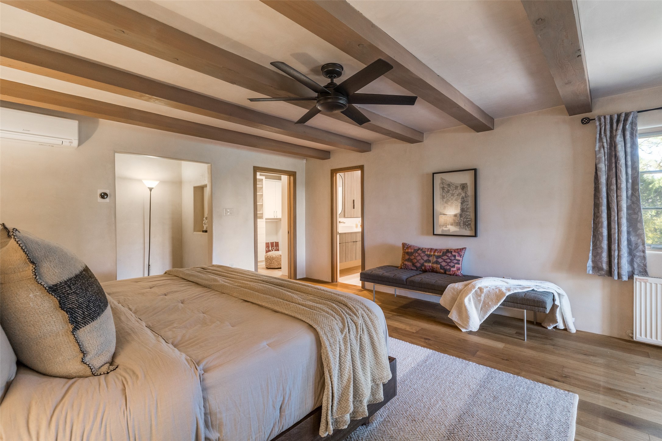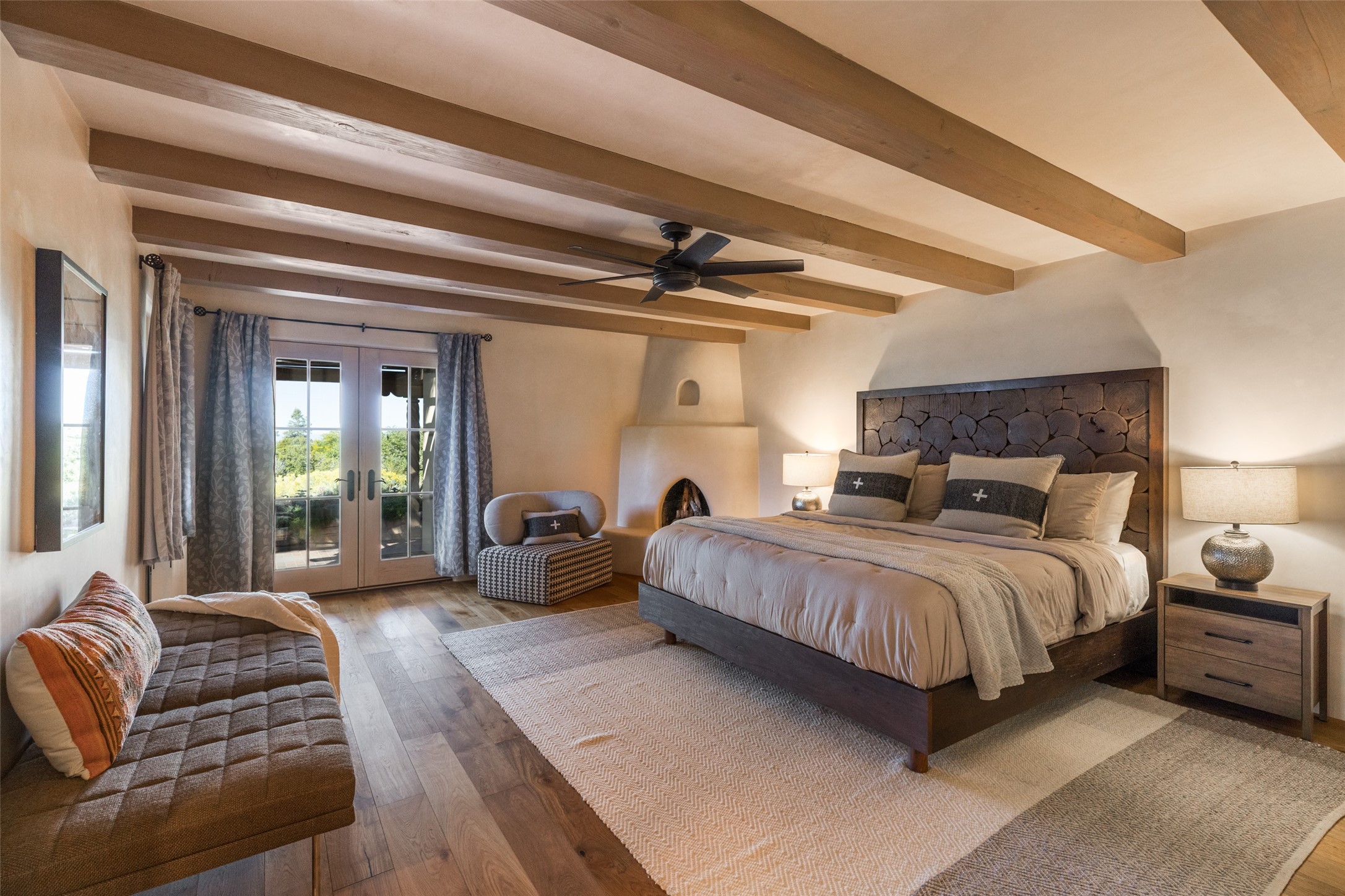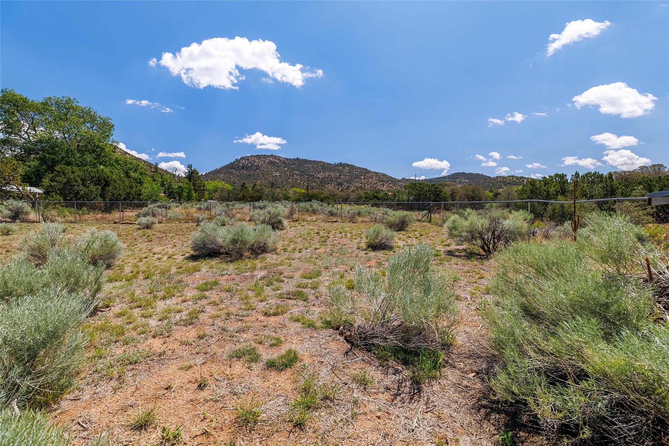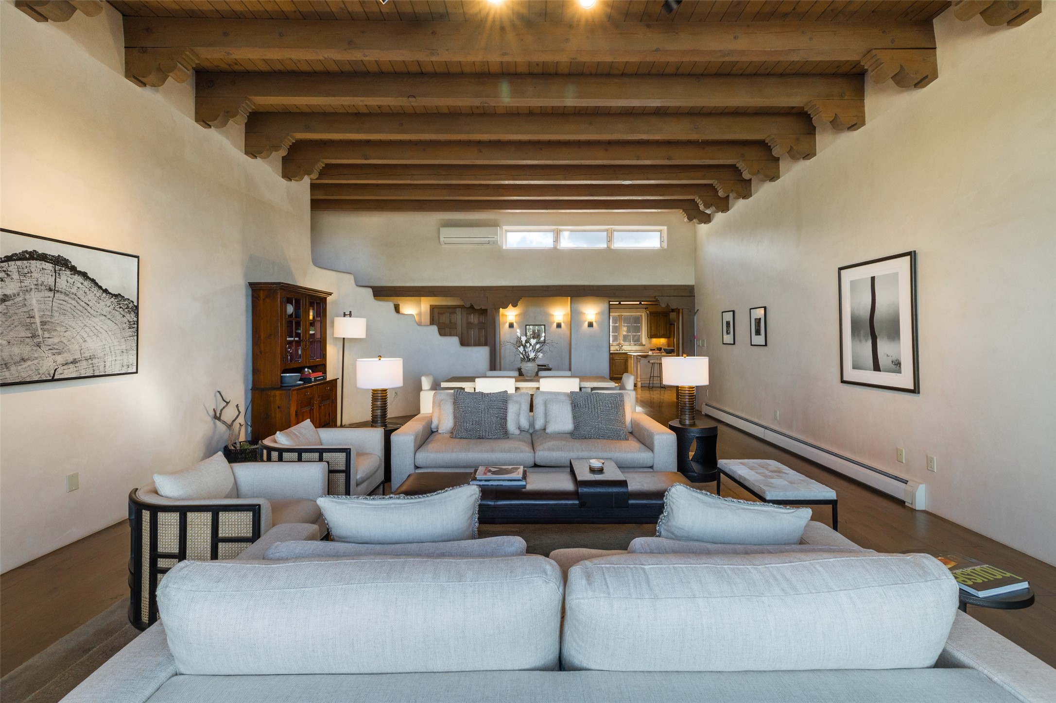 Built in 1983-84 by Grover/Ivey, nestled in the cherished Santa Fe Eastside, this home sits on a very private 1.045 acre parcel just off the Old Santa Fe Trail with magnificent East and West views of Sun & Moon Mountains as well as the Jemez Range, all but assuring the daily drama of powerful sunrise and sunset views. A very inviting and large living room immediately sets a gracious entertaining ambience with 12' ceilings, long elegant vigas and embossed corbels that are accented with a west facing picture window and accompanying corner kiva fireplace. A grand Chef's kitchen stands ready for friends and family equally providing outdoor access to a large terraced dining and media venue with a recently added (2022) heated plunge pool festive zone nearby!The house footprint (3,640 sq ft) includes three formal bedrooms (one being primary), two larger optional use suites for creative uses and needs, three and one half bathrooms surround these rooms with 3 interior Kiva fireplaces and one exterior stone fireplace surround for those Winter moments! The Primary bedroom has a newly renovated bathroom, shower, sink and closet installs by Lisa Samuel's Alchemy providing a nice Contemporary feel to the Owner quarters.Neighborhood access to E Zia Road as well as Old SF Trail provides quick & easy shopping, grocery, health care and athletic services. Sun Mountain Trailhead is 5 minutes away...and various local School possibilities are nearby. A Lifetime fiberglass storage shed with double door entry two skylights and fixed window convey on to Buyer at Closing. Should new Owner be wondering about a Casita possibility onsite, there is ample room to build eastwards in the open field subject to Historic Review District overlay approval. Mature and abundant landscaping is readily apparent throughout the property. Privacy and grace are signature features of this lovely distinguished home.