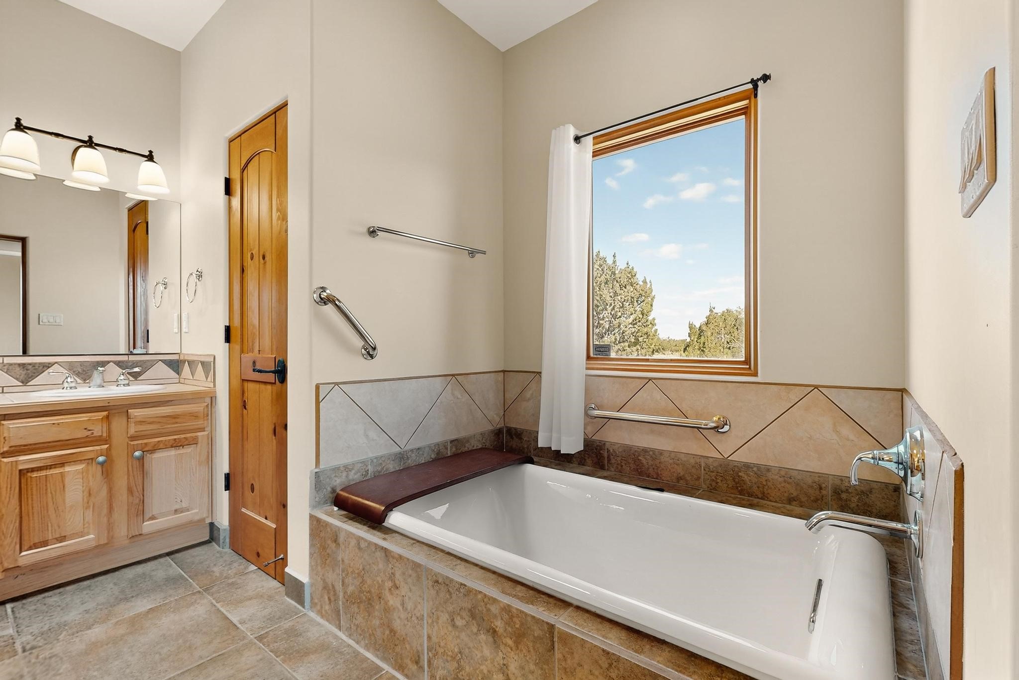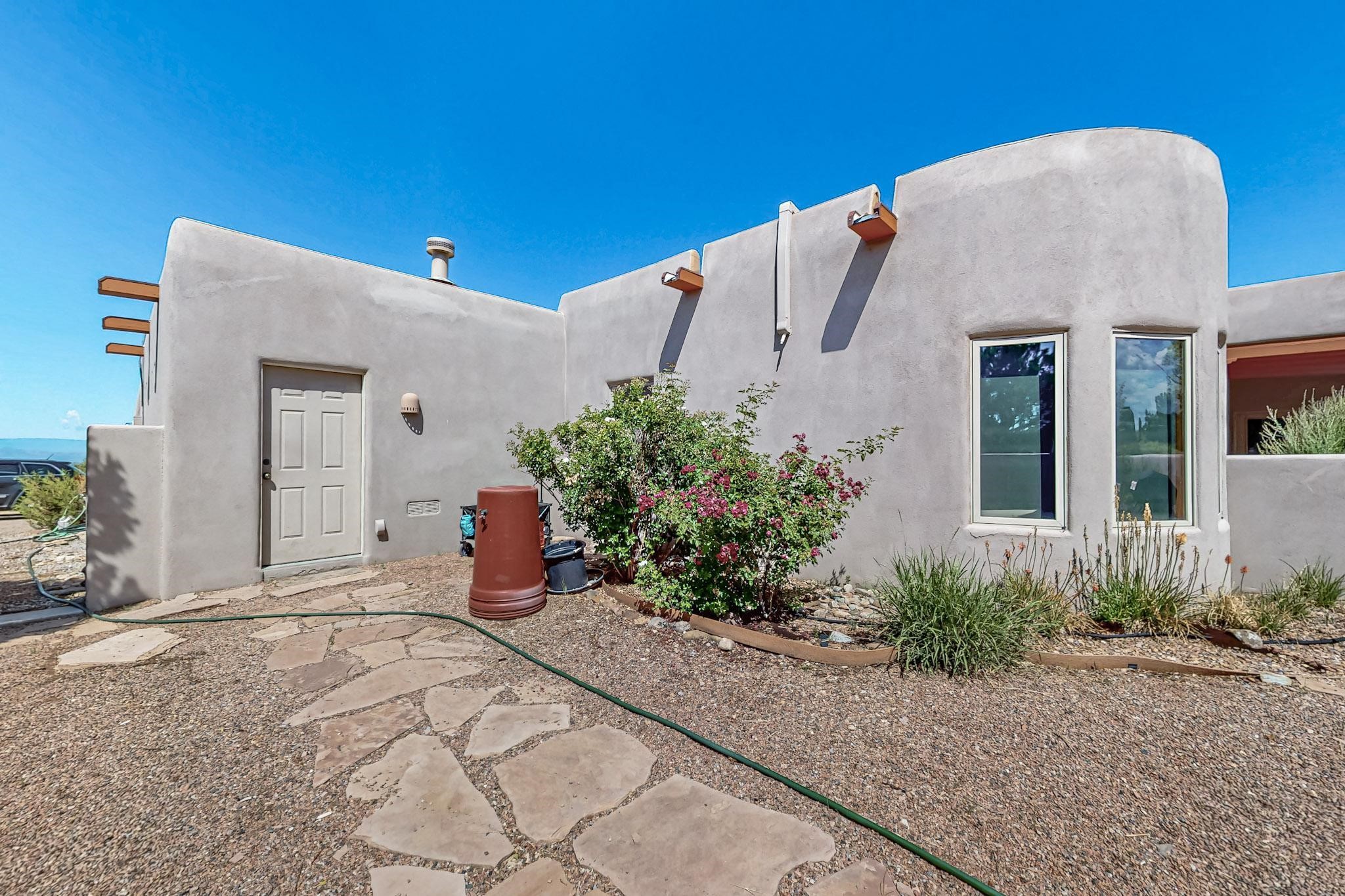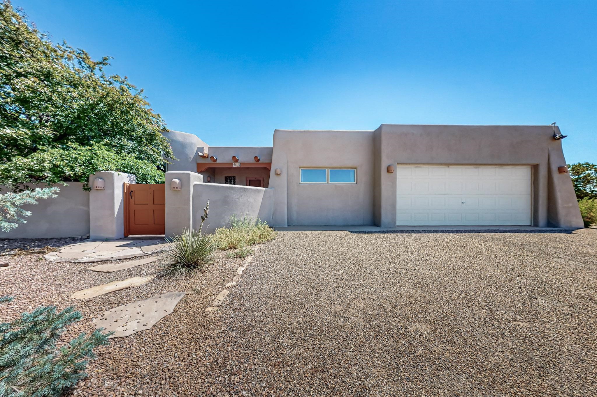 Priced to Sell! Potential multigenerational living. Expansive contemporary pueblo, split bedroom open plan design with high ceilings throughout. The main home includes a formal dining area, spacious great room with kiva fireplace, a large primary suite with kiva fireplace, large walk in closet and spa-like bathroom. Excellent separation from the two guest bedrooms and bath, plus a den/study. The kitchen has been remodeled including an induction range top, custom lighted cabinetry and pantry. The radiant heating is supplemented by 5 mini splits to keep a comfortable temperature summer and winter. There is a large heated storage room/workroom for hobbies and toys plus an oversized 2 car garage. Behind the home sits a detached 478 sq.ft. heated 2 room studio/guest with a 3/4 bathroom for extra guests/office or studio with a separate septic system. A lovely walled garden with a 3rd kiva fireplace for enjoyment plus a large portal for morning or evening outside entertainment. Enjoy the historic railway and rail trail bordering the back of your land. Plenty of guest parking with a paved driveway and easy access to Eldorado amenities, local shopping only minutes into Santa Fe.