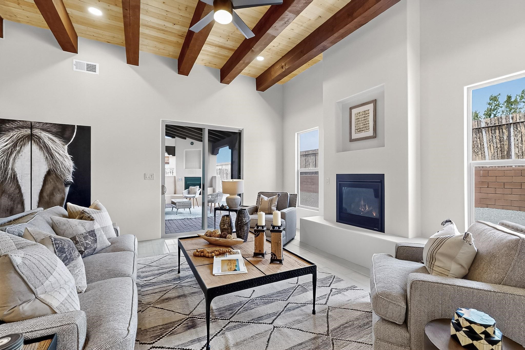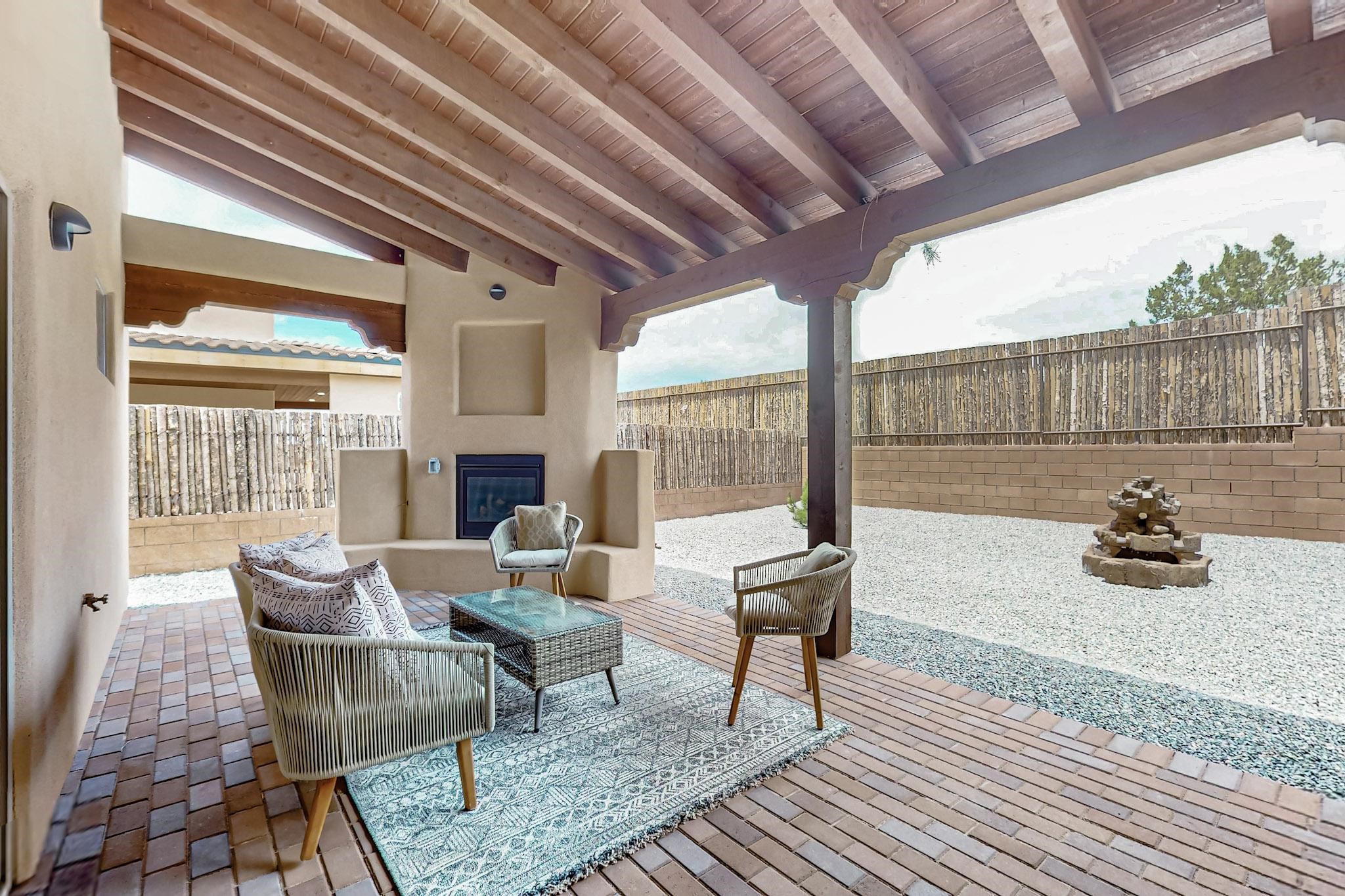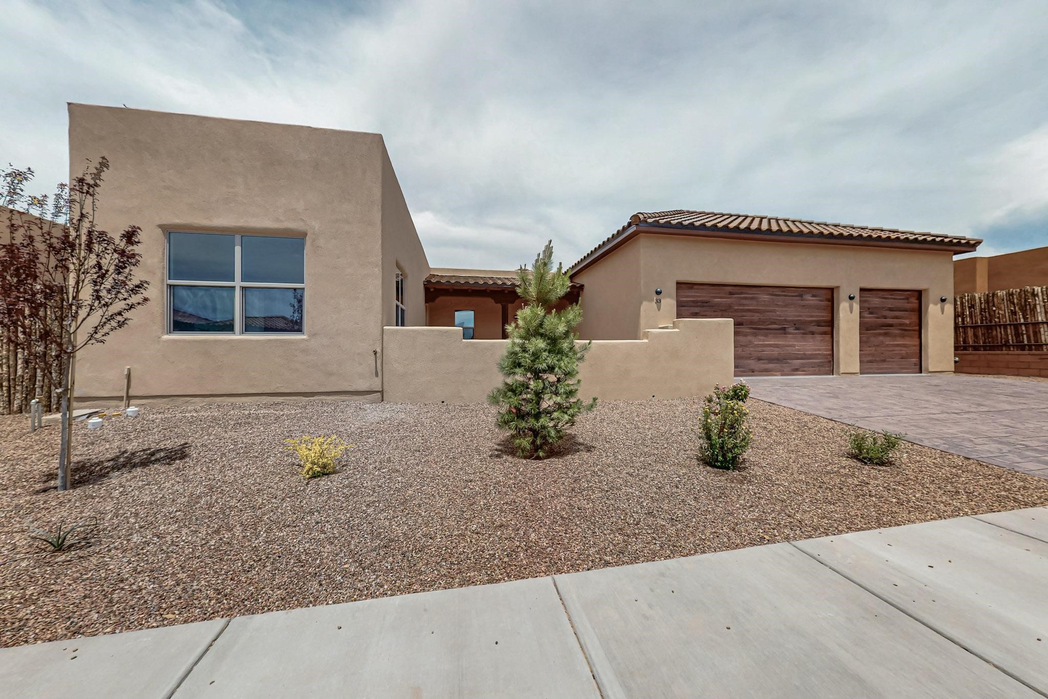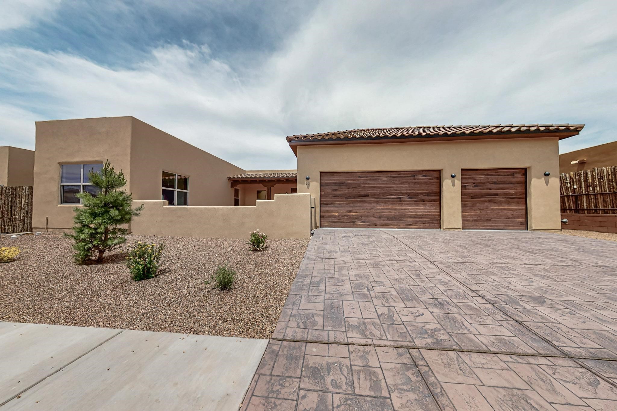 With a gated front courtyard wall and a 3 Car garage, this San Antonio Plan consists of 2260 sq. ft., 3 bedrooms and 2 1/2 baths. Located at 33 La Pradera in the La Pradera Subdivision, the exterior is a pitched roof Spanish design with clay-like tile roofs and covered portals with heavy wood beams and brick pavers. The 3-car driveway is a colored stamped- concrete design. The home is entered through an 8 ft. high door to a foyer with a boveda ceiling and beige, wood-like porcelain floor tiles. To the right is a powder room and to the left is a hallway with a nicho-accented wall leading to the two (2) guest bedrooms. The foyer leads into the living/dining room which has a 12-foot-high ceiling with cedar-stained wood beams and clear-coated T & G trim and a gas fireplace. The living room and the owner's suite open out to a covered portal with brick pavers and a gas-fired fireplace. The open kitchen has white cabinets mahogany- colored backsplash tile. An exceptionally large pantry is directly off the kitchen. The utility room is then accessed from the pantry and has ample cabinets, skylight, and a sink.The owner's bath has a large walk-in shower with euro-style shower fixtures and an overhead rain shower head. There is also an exceptionally large walk-incloset. The insulated garage includes a storage room and an epoxy-coated floor.