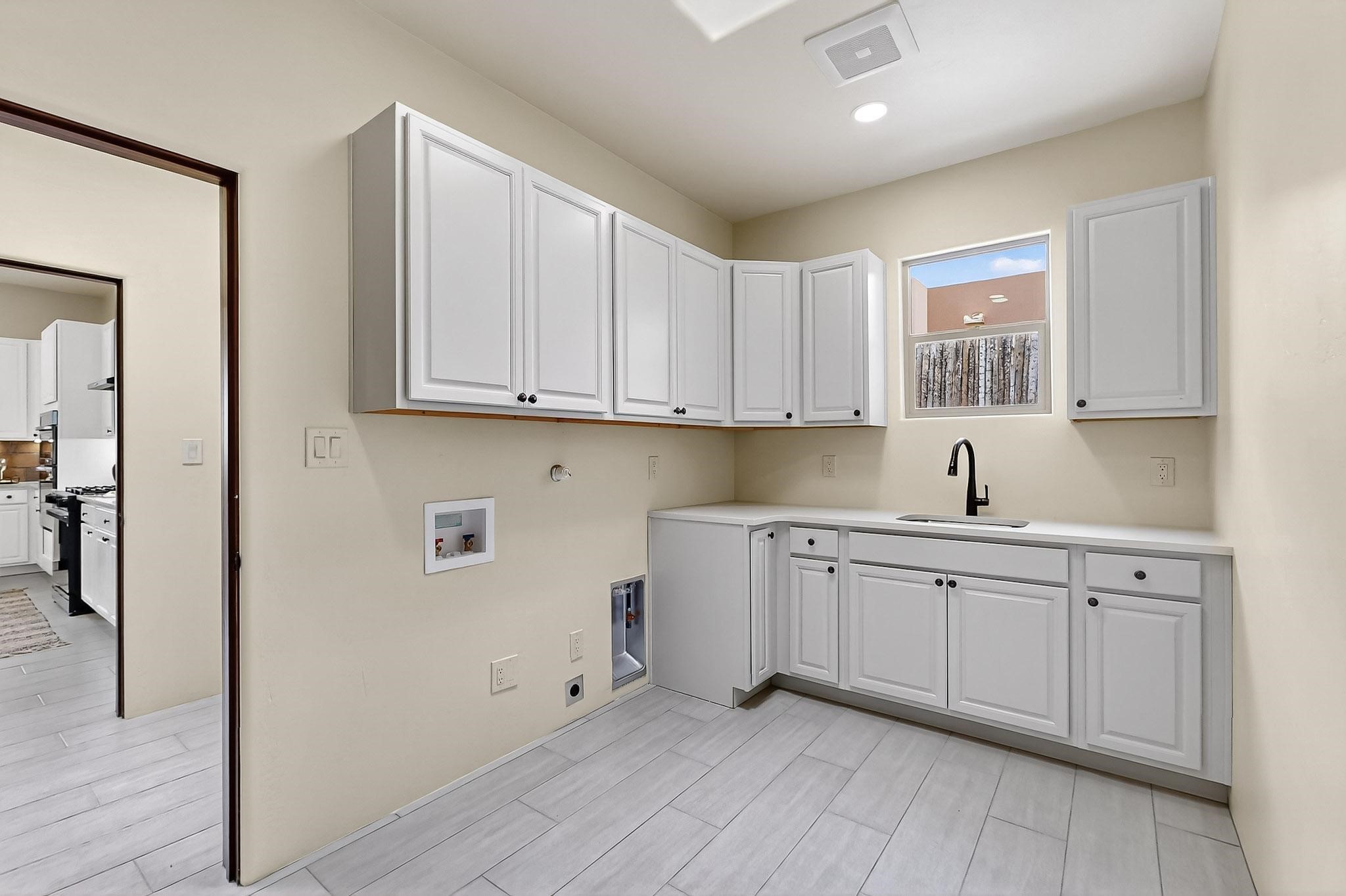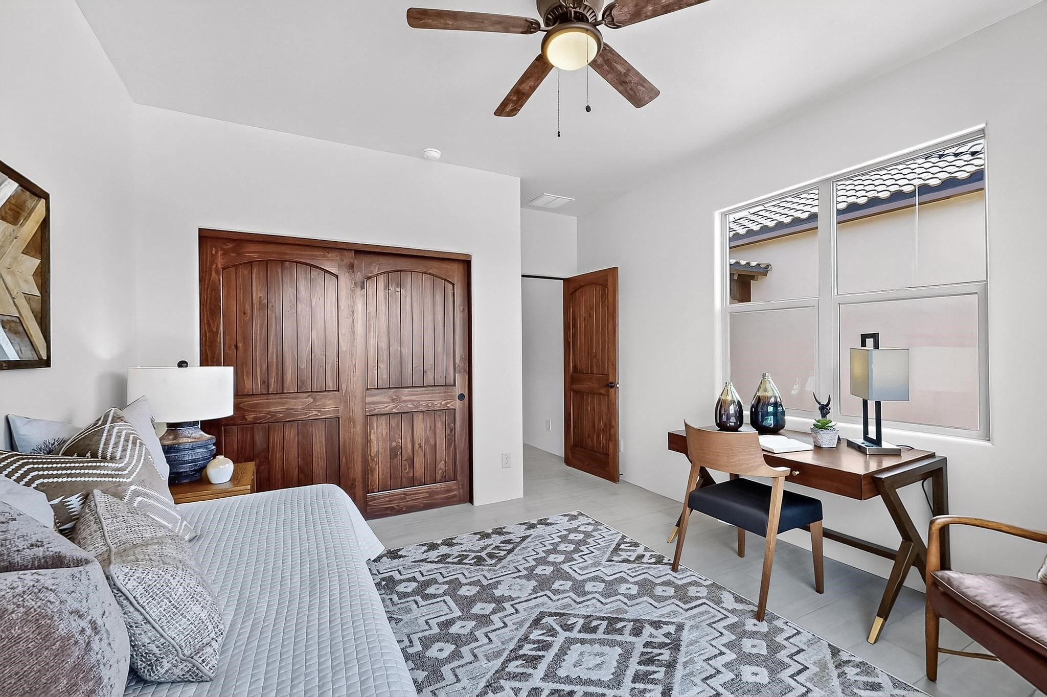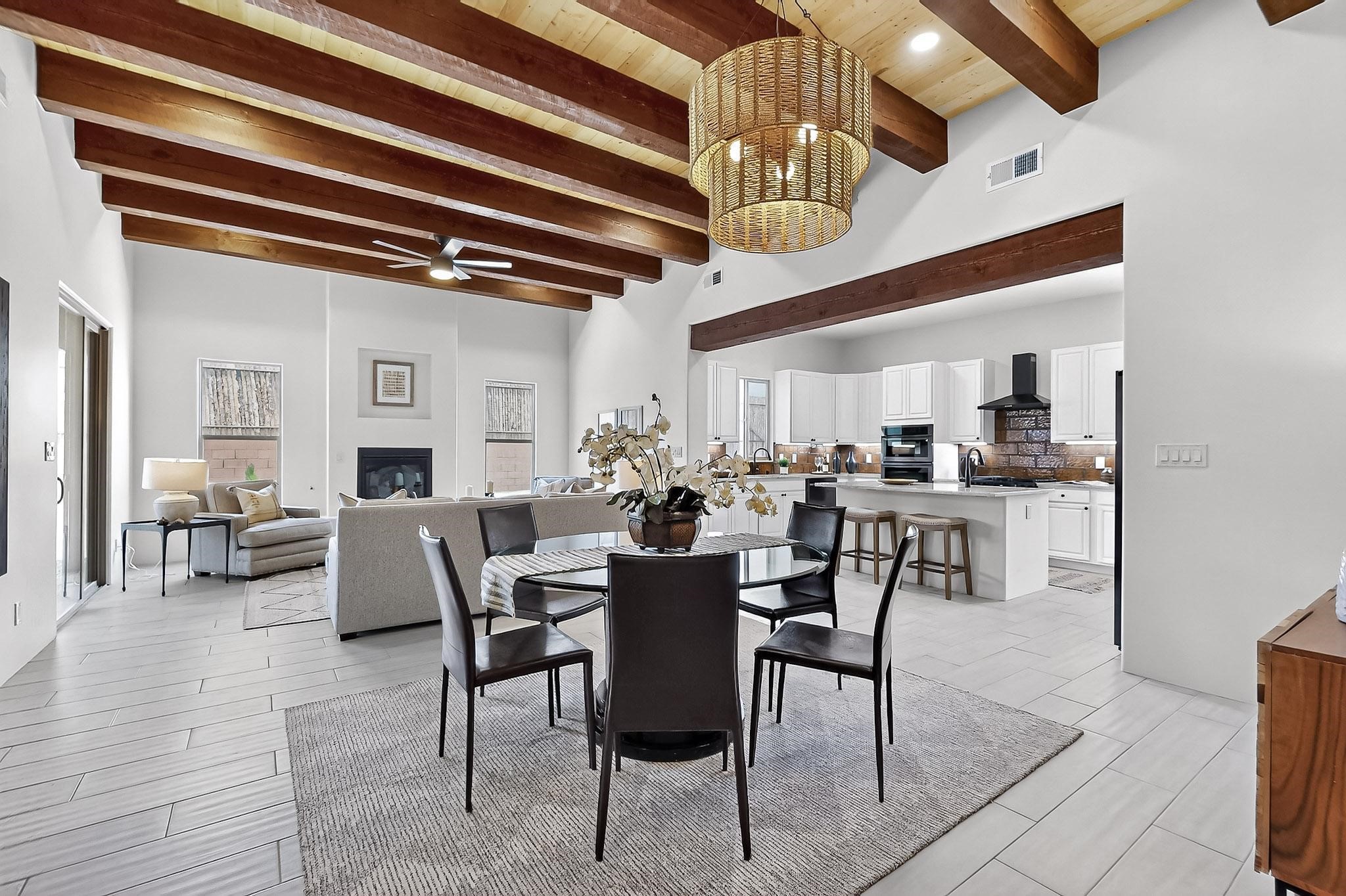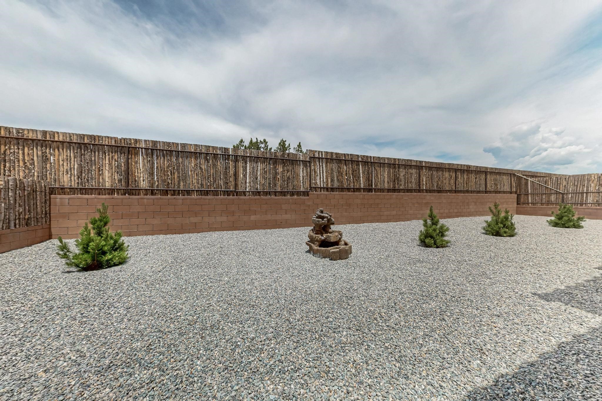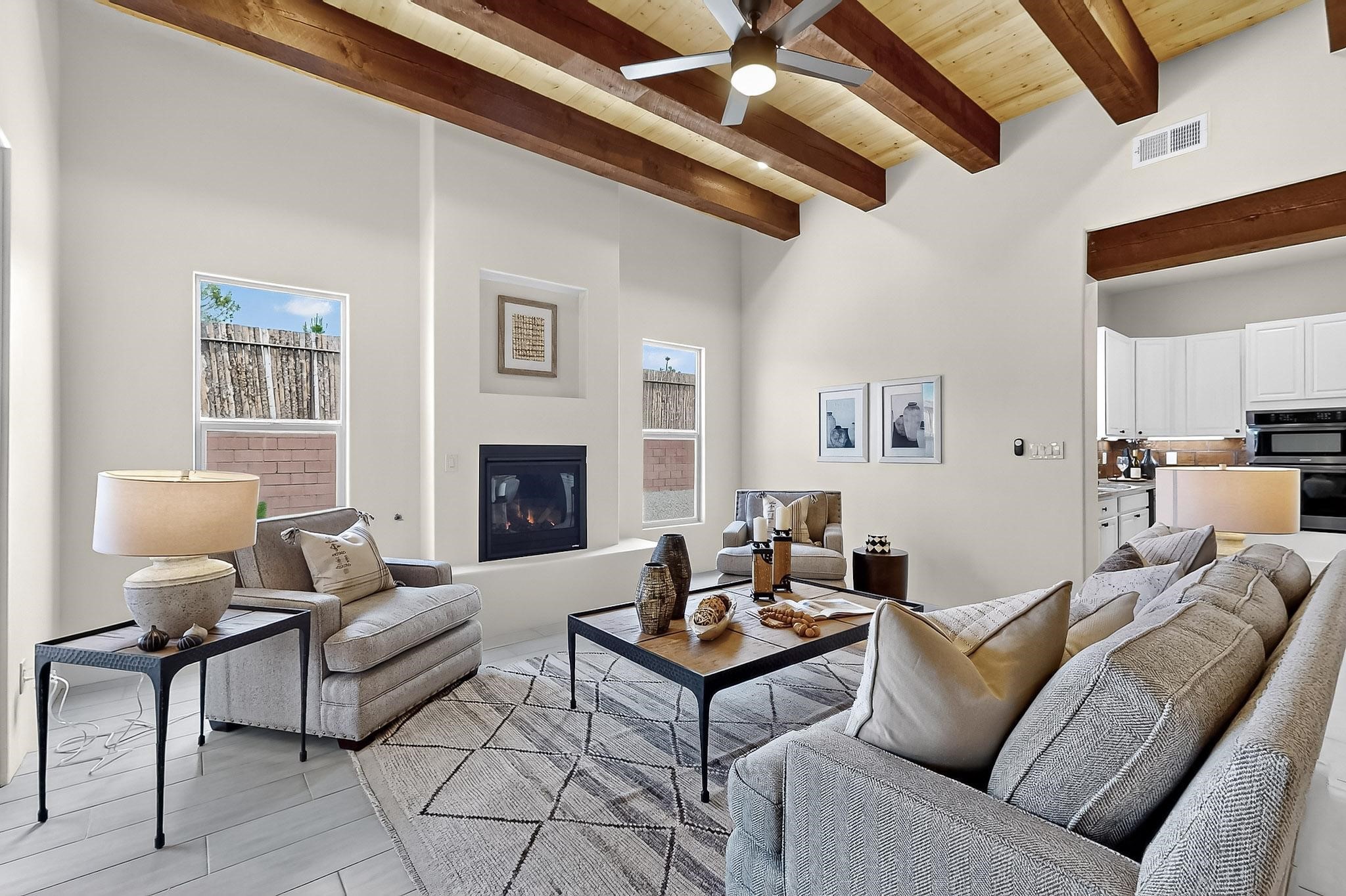 With a gated front courtyard wall and a 3 Car garage, this San Antonio Plan consists of 2260 sq. ft., 3 bedrooms and 2 1/2 baths. Located at 33 La Pradera in the La Pradera Subdivision, the exterior is a pitched roof Spanish design with clay-like tile roofs and covered portals with heavy wood beams and brick pavers. The 3-car driveway is a colored stamped- concrete design. The home is entered through an 8 ft. high door to a foyer with a boveda ceiling and beige, wood-like porcelain floor tiles. To the right is a powder room and to the left is a hallway with a nicho-accented wall leading to the two (2) guest bedrooms. The foyer leads into the living/dining room which has a 12-foot-high ceiling with cedar-stained wood beams and clear-coated T & G trim and a gas fireplace. The living room and the owner's suite open out to a covered portal with brick pavers and a gas-fired fireplace. The open kitchen has white cabinets mahogany- colored backsplash tile. An exceptionally large pantry is directly off the kitchen. The utility room is then accessed from the pantry and has ample cabinets, skylight, and a sink.The owner's bath has a large walk-in shower with euro-style shower fixtures and an overhead rain shower head. There is also an exceptionally large walk-incloset. The insulated garage includes a storage room and an epoxy-coated floor.
