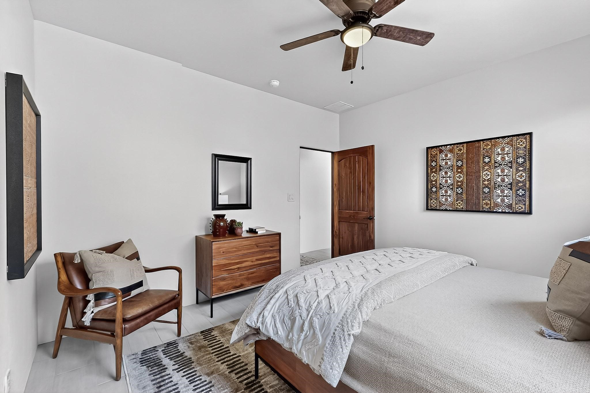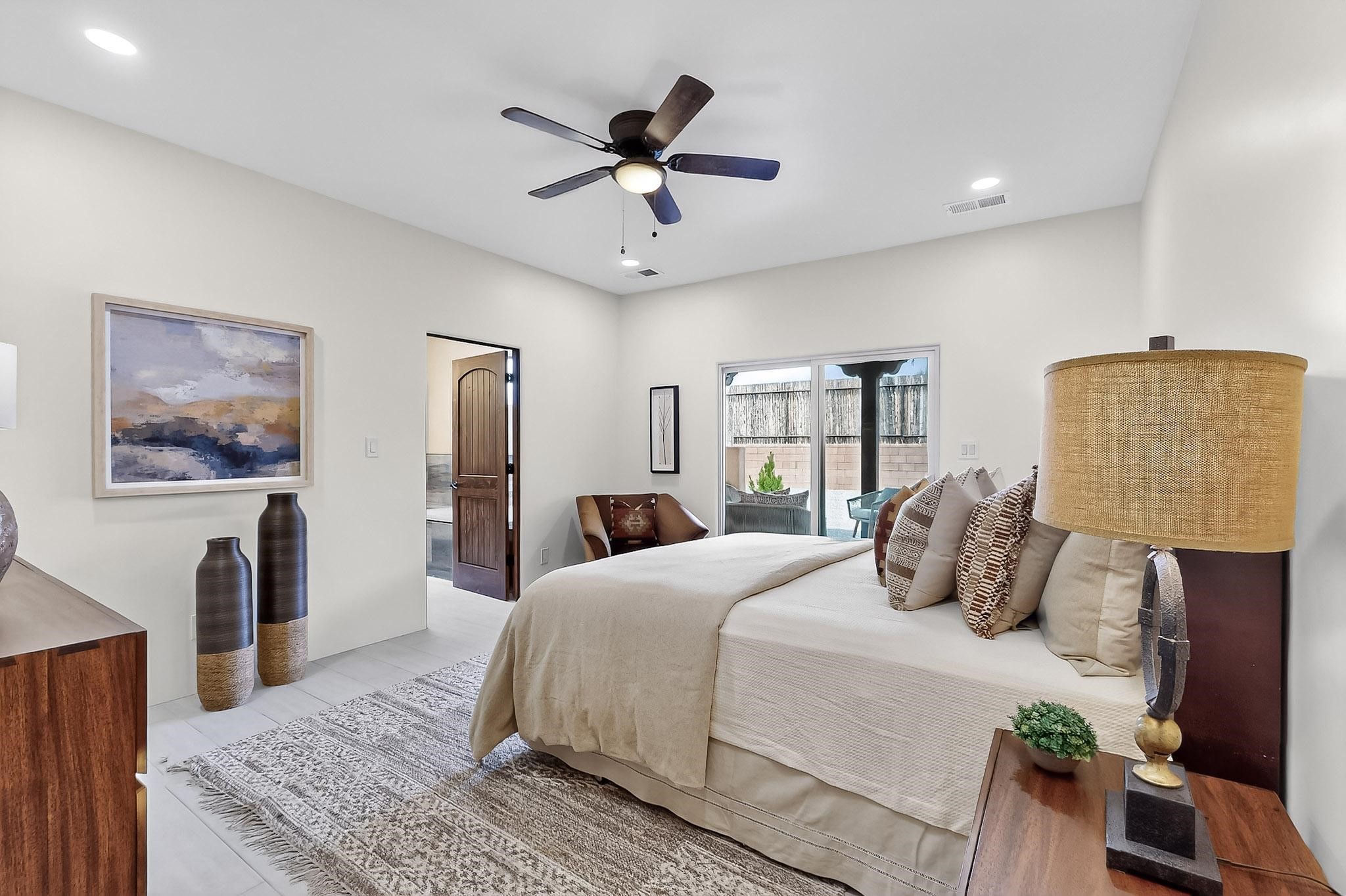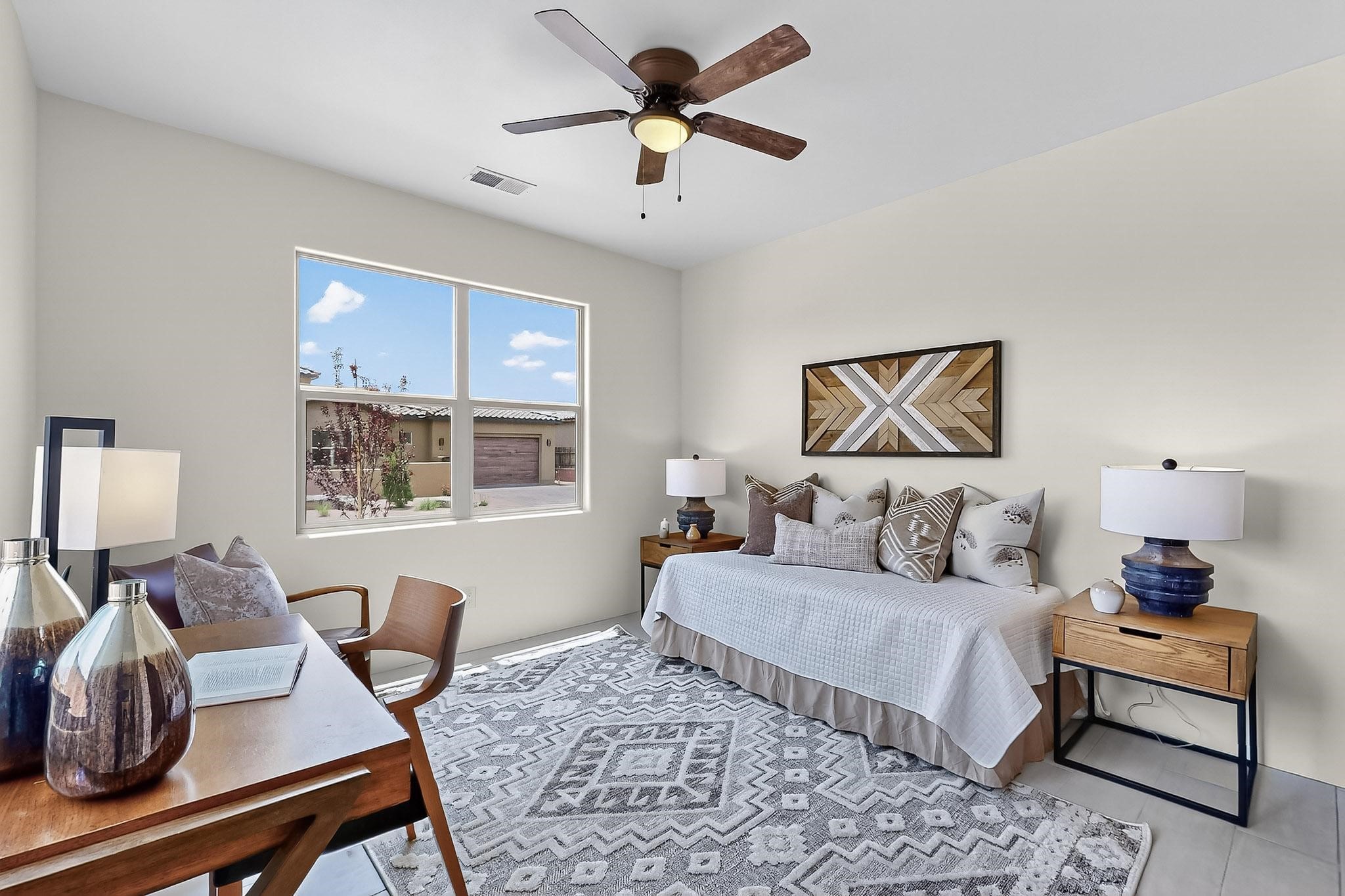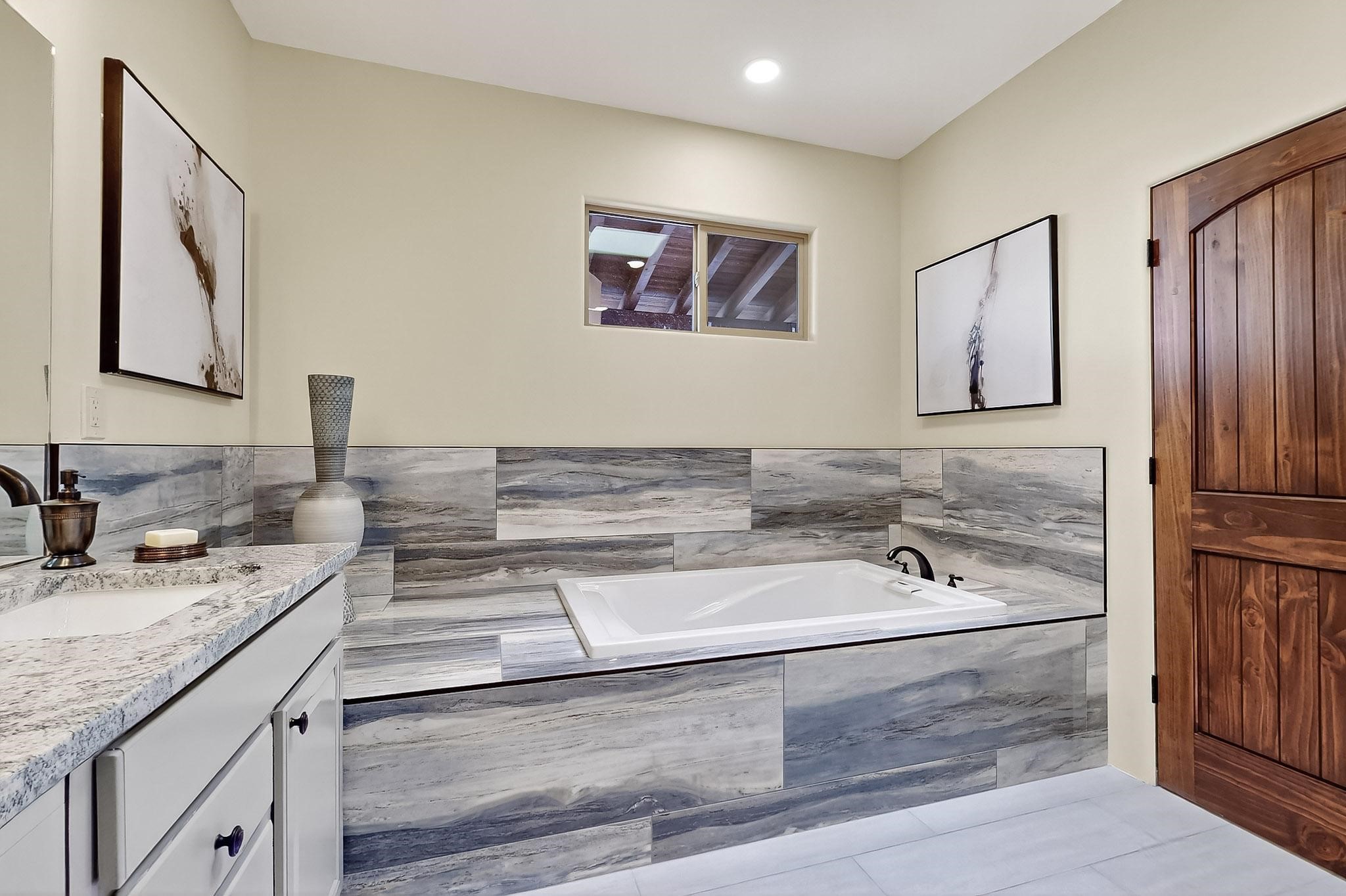 With a gated front courtyard wall and a 3 Car garage, this San Antonio Plan consists of 2260 sq. ft., 3 bedrooms and 2 1/2 baths. Located at 33 La Pradera in the La Pradera Subdivision, the exterior is a pitched roof Spanish design with clay-like tile roofs and covered portals with heavy wood beams and brick pavers. The 3-car driveway is a colored stamped- concrete design. The home is entered through an 8 ft. high door to a foyer with a boveda ceiling and beige, wood-like porcelain floor tiles. To the right is a powder room and to the left is a hallway with a nicho-accented wall leading to the two (2) guest bedrooms. The foyer leads into the living/dining room which has a 12-foot-high ceiling with cedar-stained wood beams and clear-coated T & G trim and a gas fireplace. The living room and the owner's suite open out to a covered portal with brick pavers and a gas-fired fireplace. The open kitchen has white cabinets mahogany- colored backsplash tile. An exceptionally large pantry is directly off the kitchen. The utility room is then accessed from the pantry and has ample cabinets, skylight, and a sink.The owner's bath has a large walk-in shower with euro-style shower fixtures and an overhead rain shower head. There is also an exceptionally large walk-incloset. The insulated garage includes a storage room and an epoxy-coated floor.