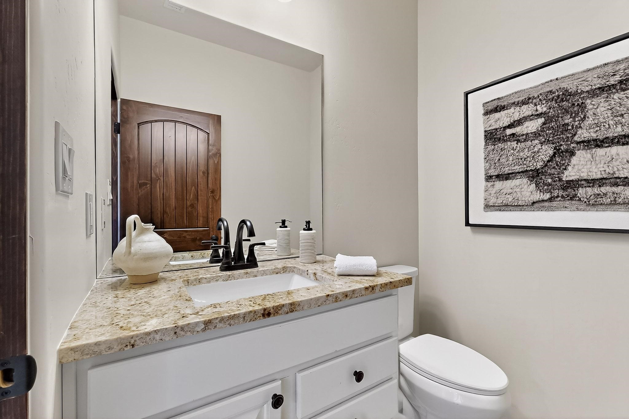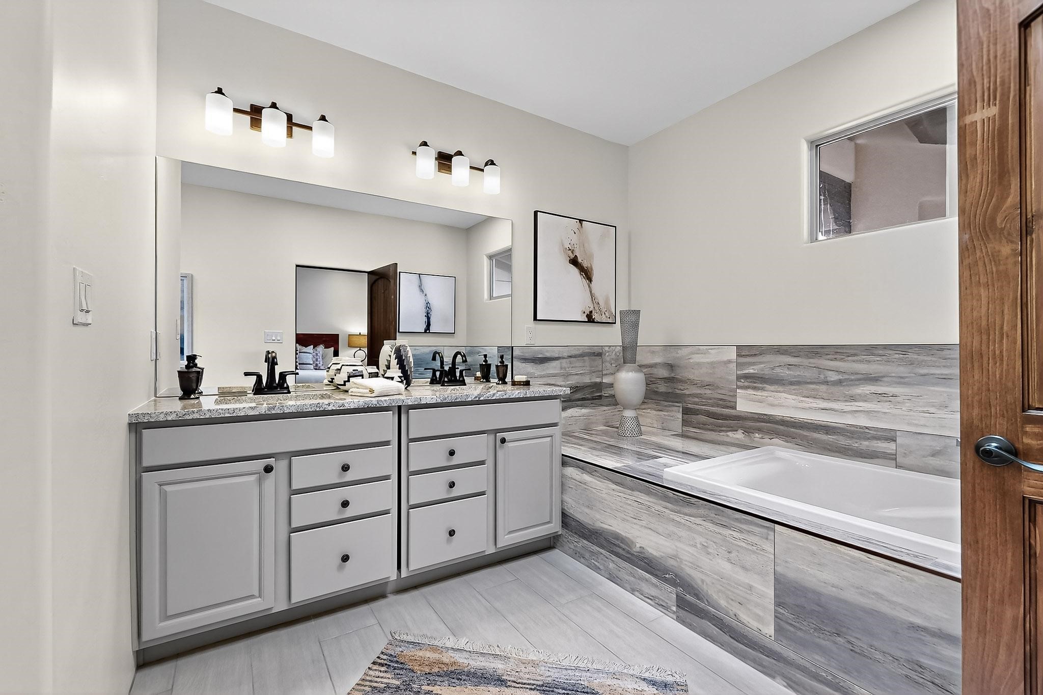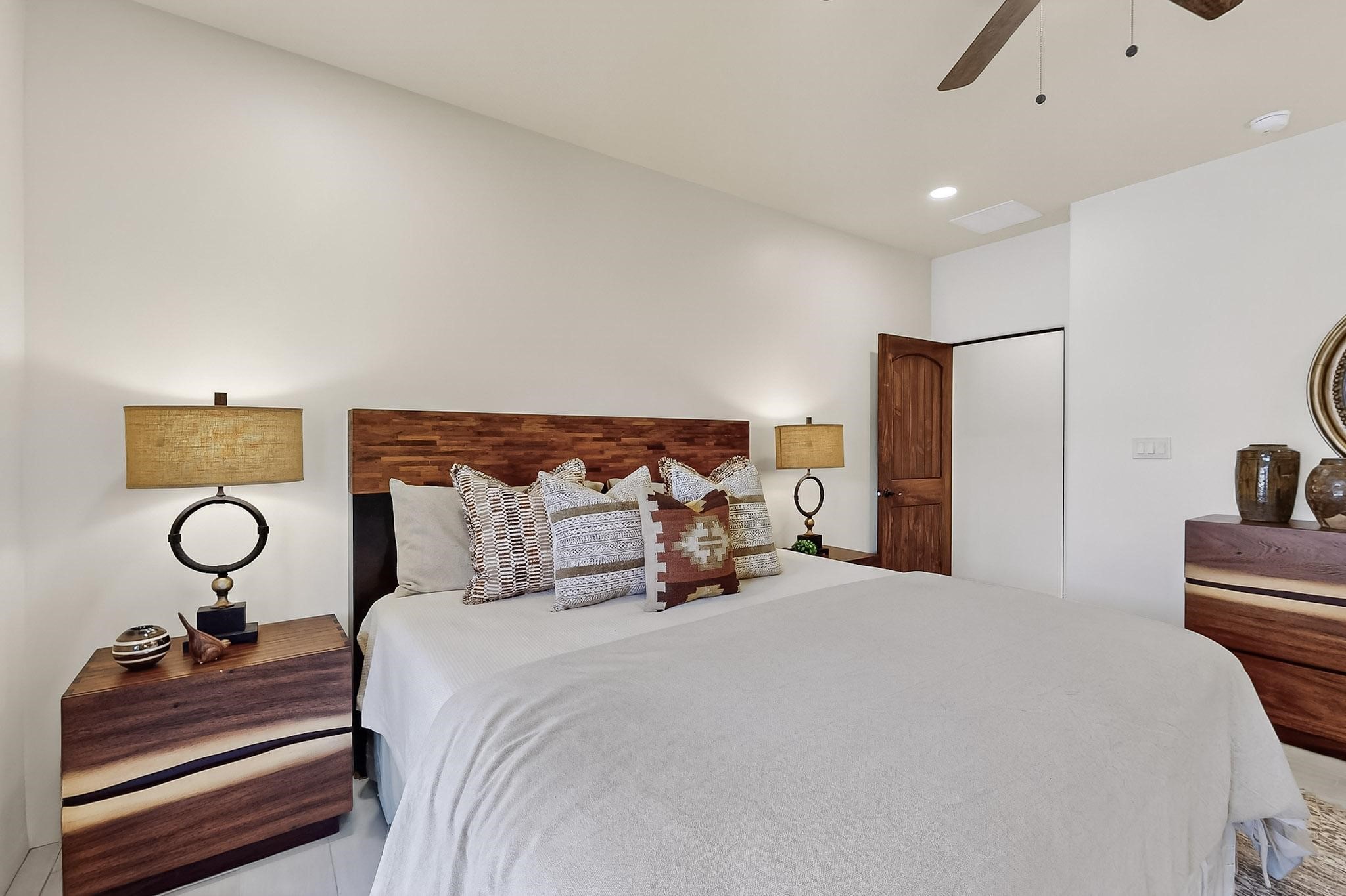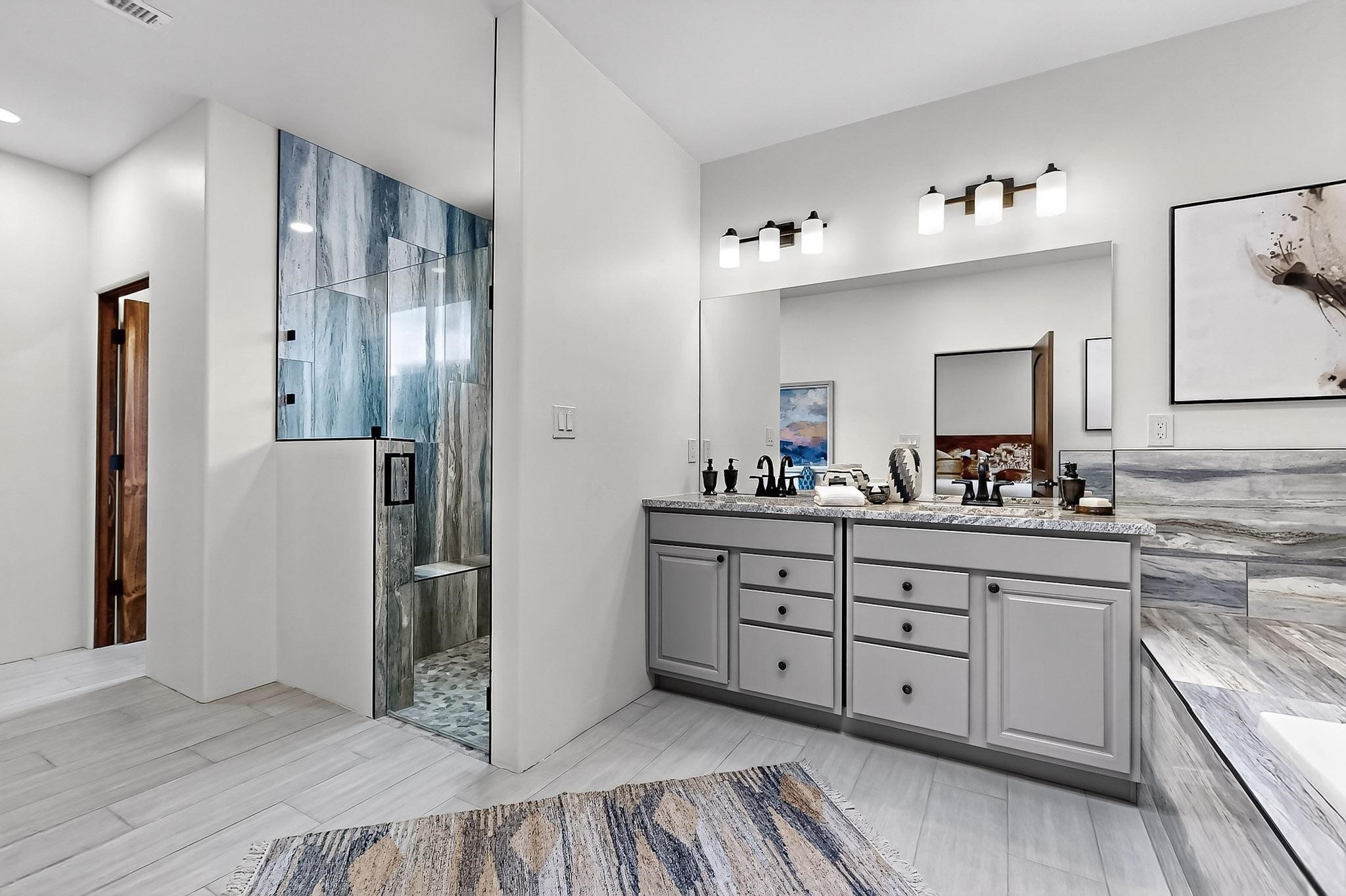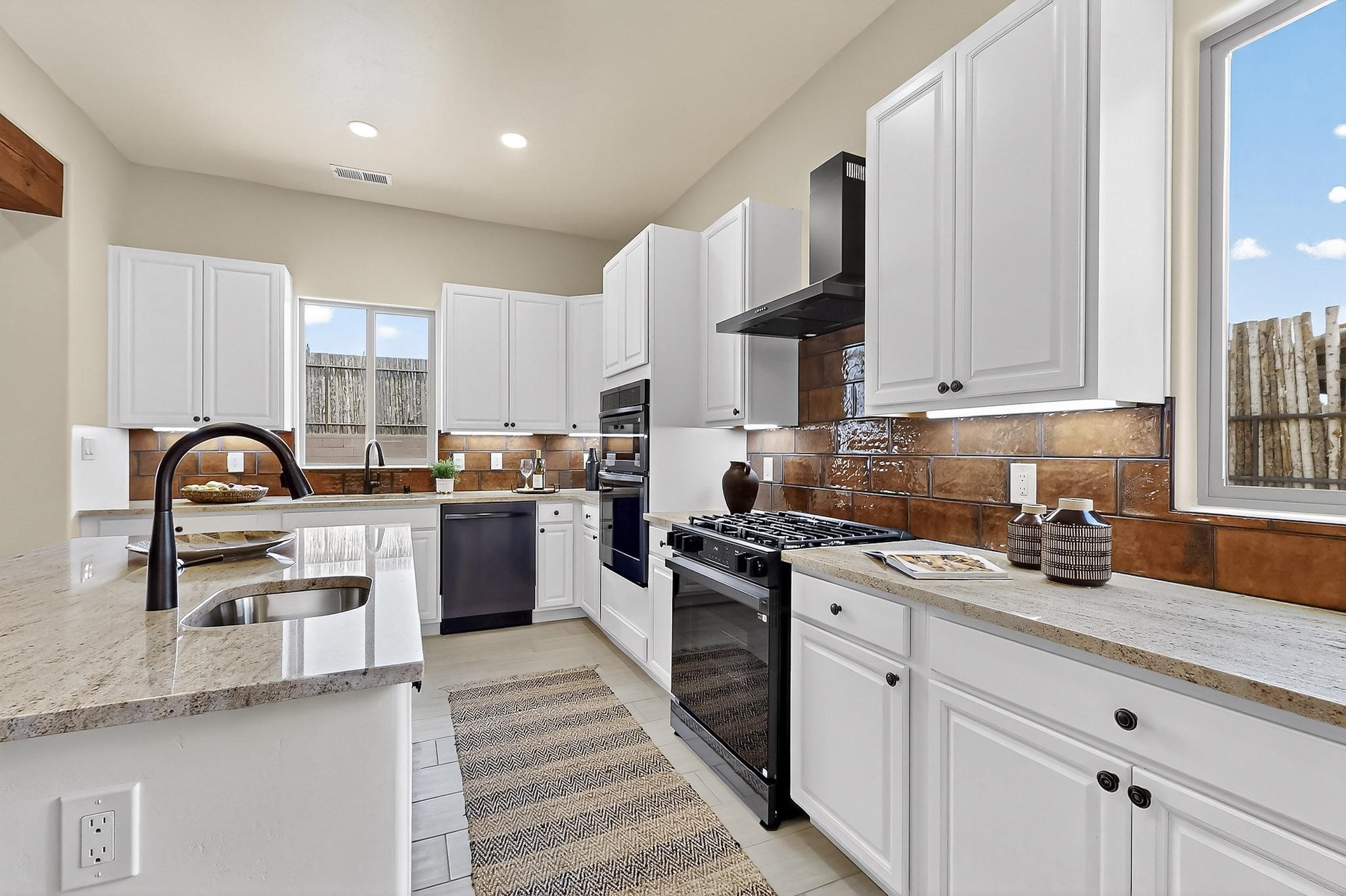 With a gated front courtyard wall and a 3 Car garage, this San Antonio Plan consists of 2260 sq. ft., 3 bedrooms and 2 1/2 baths. Located at 33 La Pradera in the La Pradera Subdivision, the exterior is a pitched roof Spanish design with clay-like tile roofs and covered portals with heavy wood beams and brick pavers. The 3-car driveway is a colored stamped- concrete design. The home is entered through an 8 ft. high door to a foyer with a boveda ceiling and beige, wood-like porcelain floor tiles. To the right is a powder room and to the left is a hallway with a nicho-accented wall leading to the two (2) guest bedrooms. The foyer leads into the living/dining room which has a 12-foot-high ceiling with cedar-stained wood beams and clear-coated T & G trim and a gas fireplace. The living room and the owner's suite open out to a covered portal with brick pavers and a gas-fired fireplace. The open kitchen has white cabinets mahogany- colored backsplash tile. An exceptionally large pantry is directly off the kitchen. The utility room is then accessed from the pantry and has ample cabinets, skylight, and a sink.The owner's bath has a large walk-in shower with euro-style shower fixtures and an overhead rain shower head. There is also an exceptionally large walk-incloset. The insulated garage includes a storage room and an epoxy-coated floor.