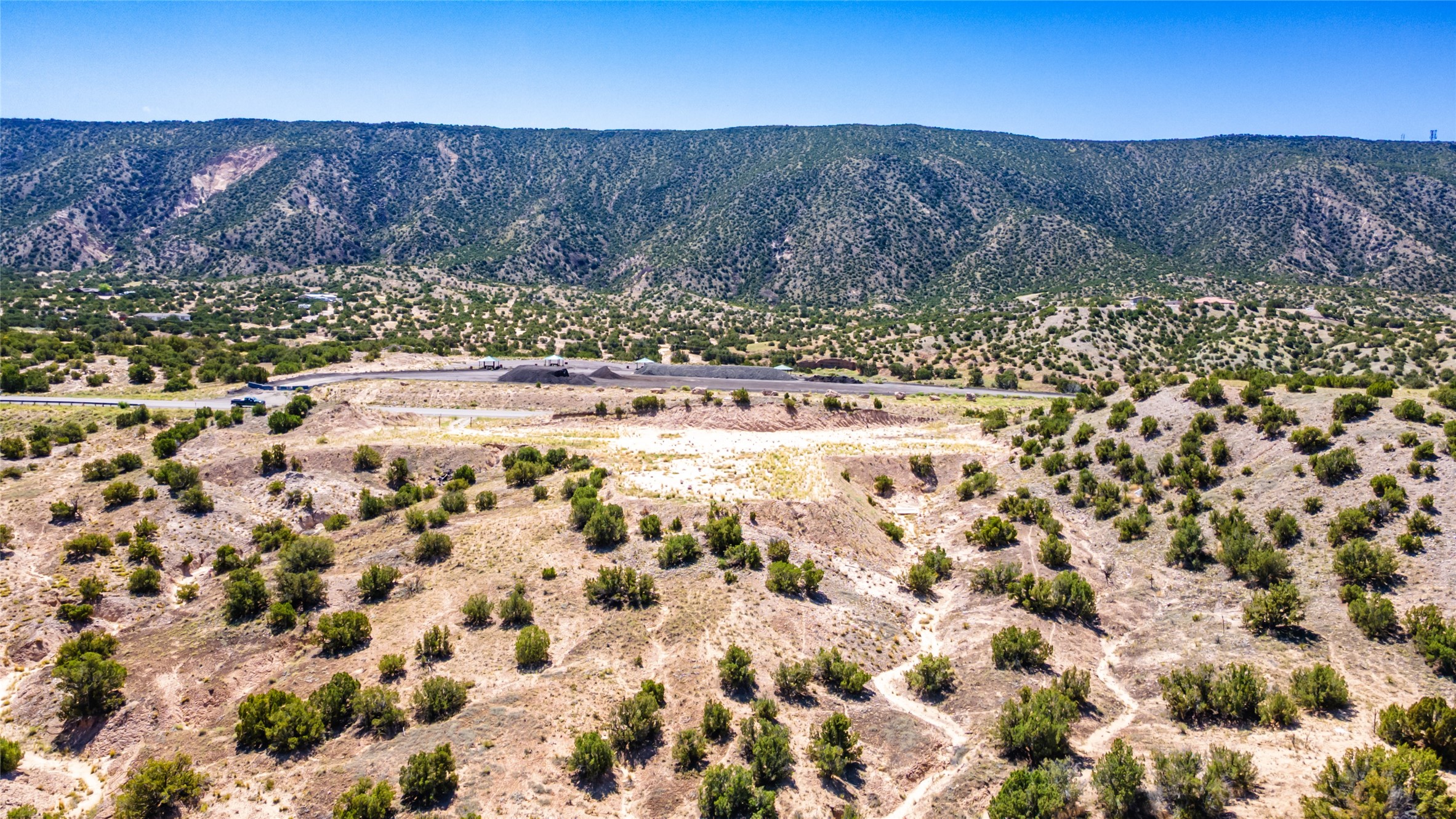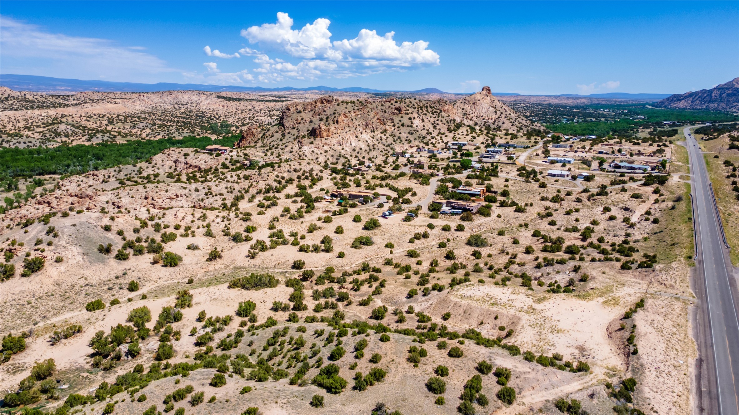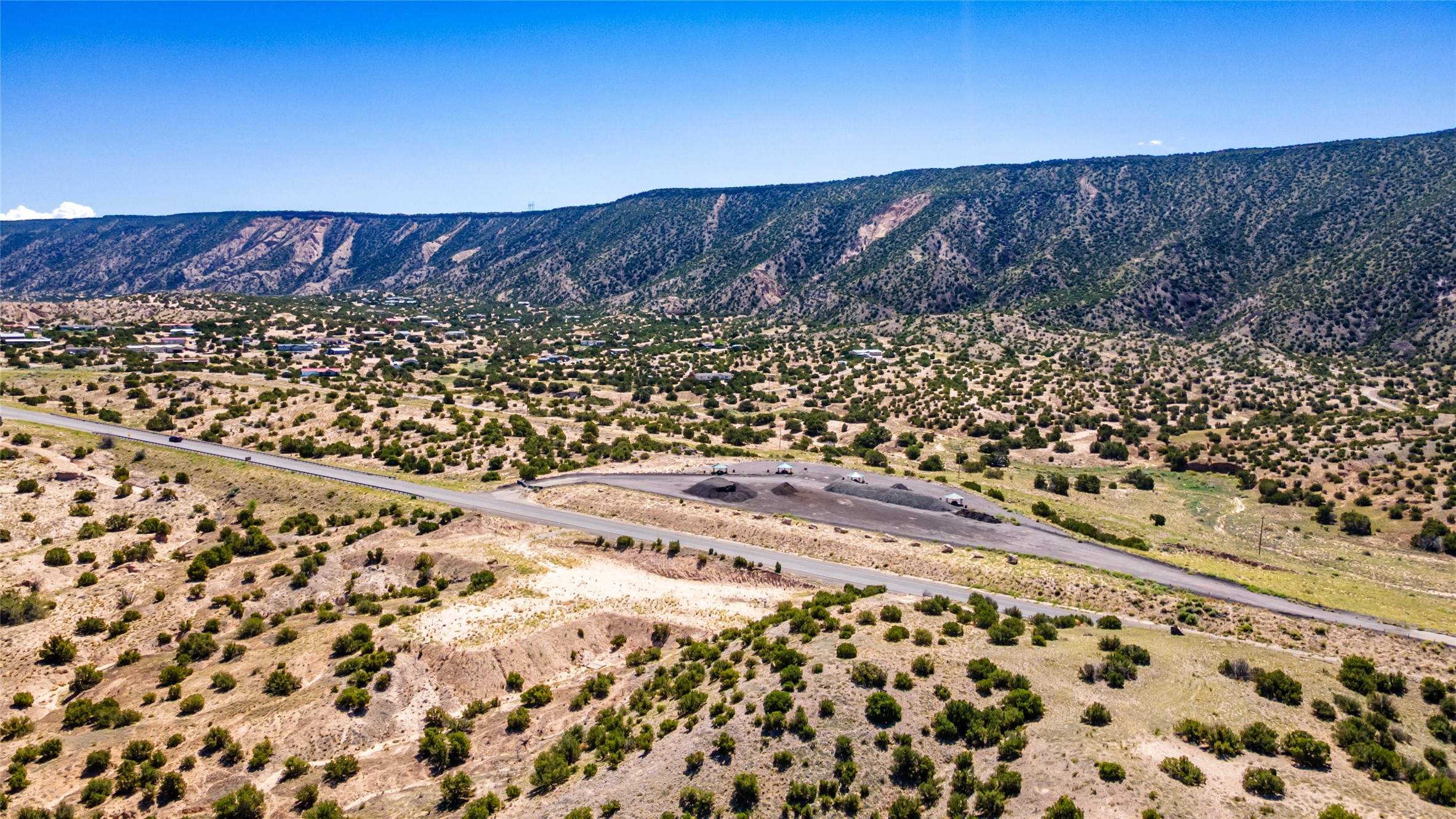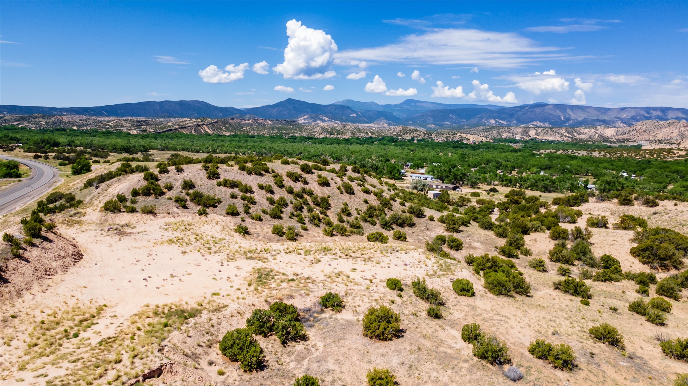 Amazing views without having a bumpy, out of the way trek up a mountain. This kind of opportunity doesn't come very often. Build your dream home, wake up to spectacular sights over the valley, but still have access directly off highway 285, and still feel secluded because of the hills on either side of the entrance which give buffers between home and highway. Perfection! The higher area has already been flattened in preparation for building. This point overlooks arroyos, valleys. and mountain formations. Electricity isn't very far away. Access directly off 285 will make other utilities easier to bring in as well. Not a far commute to Los Alamos. Two lots being sold together for a total of 3.93 acres.