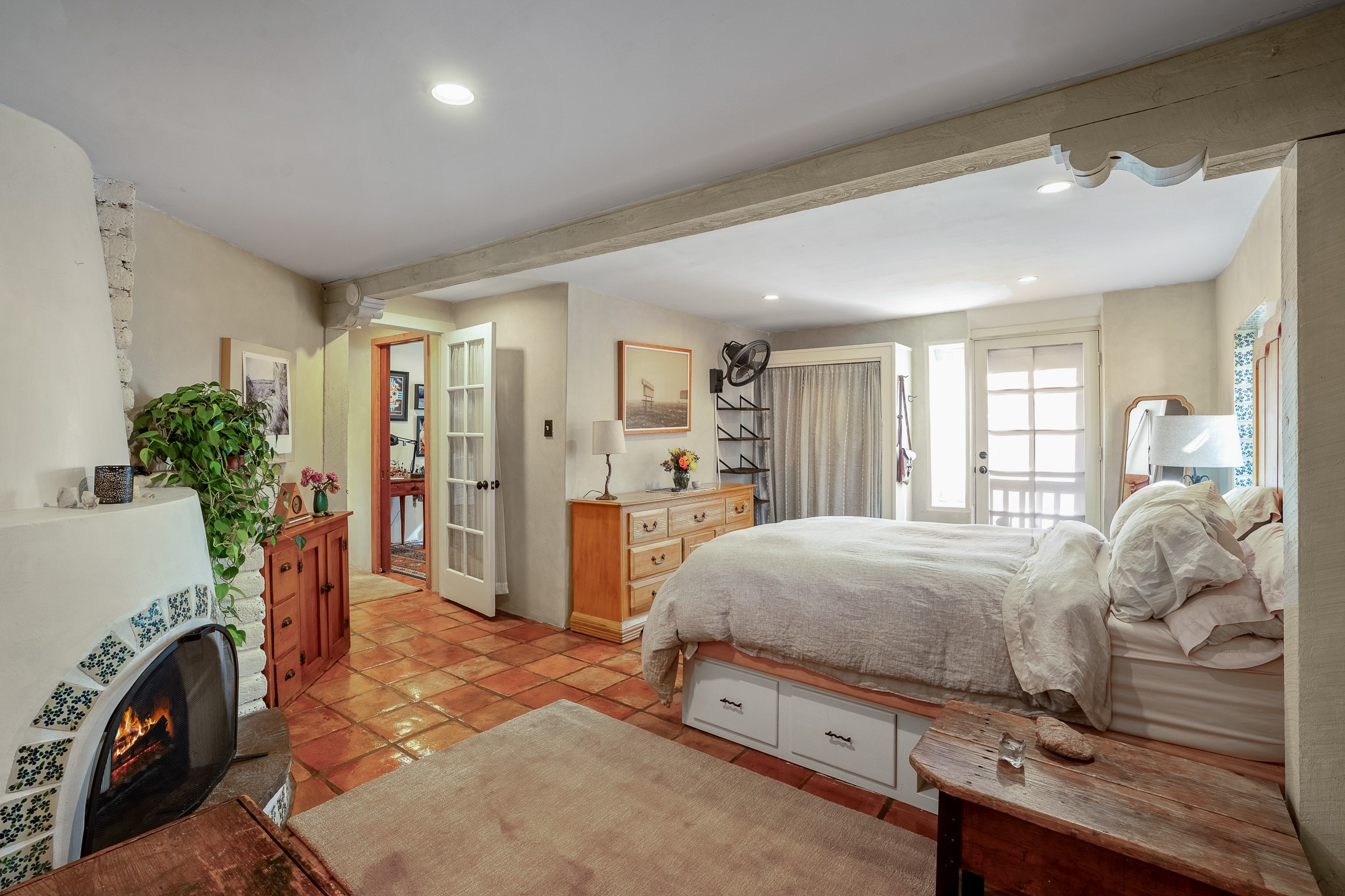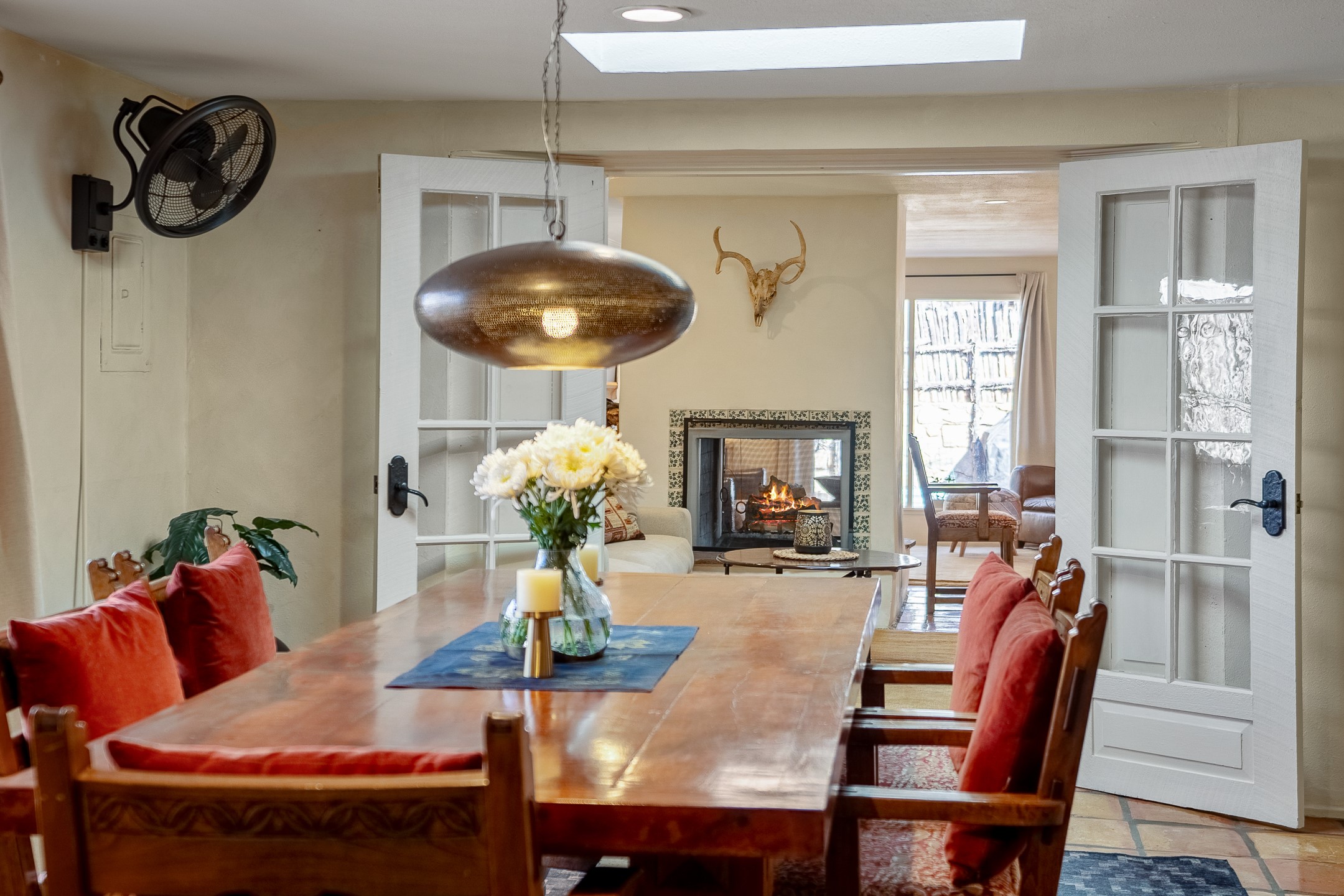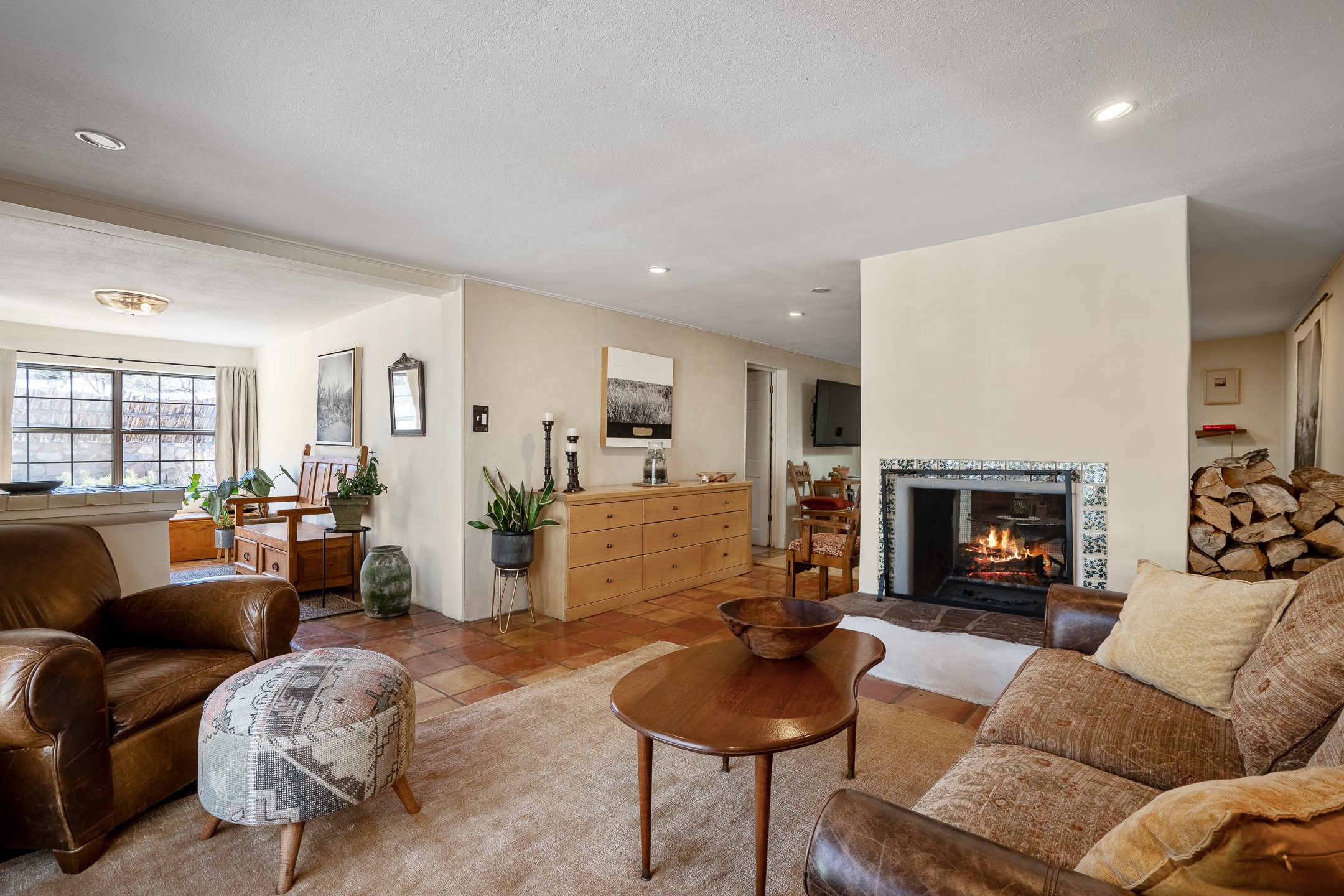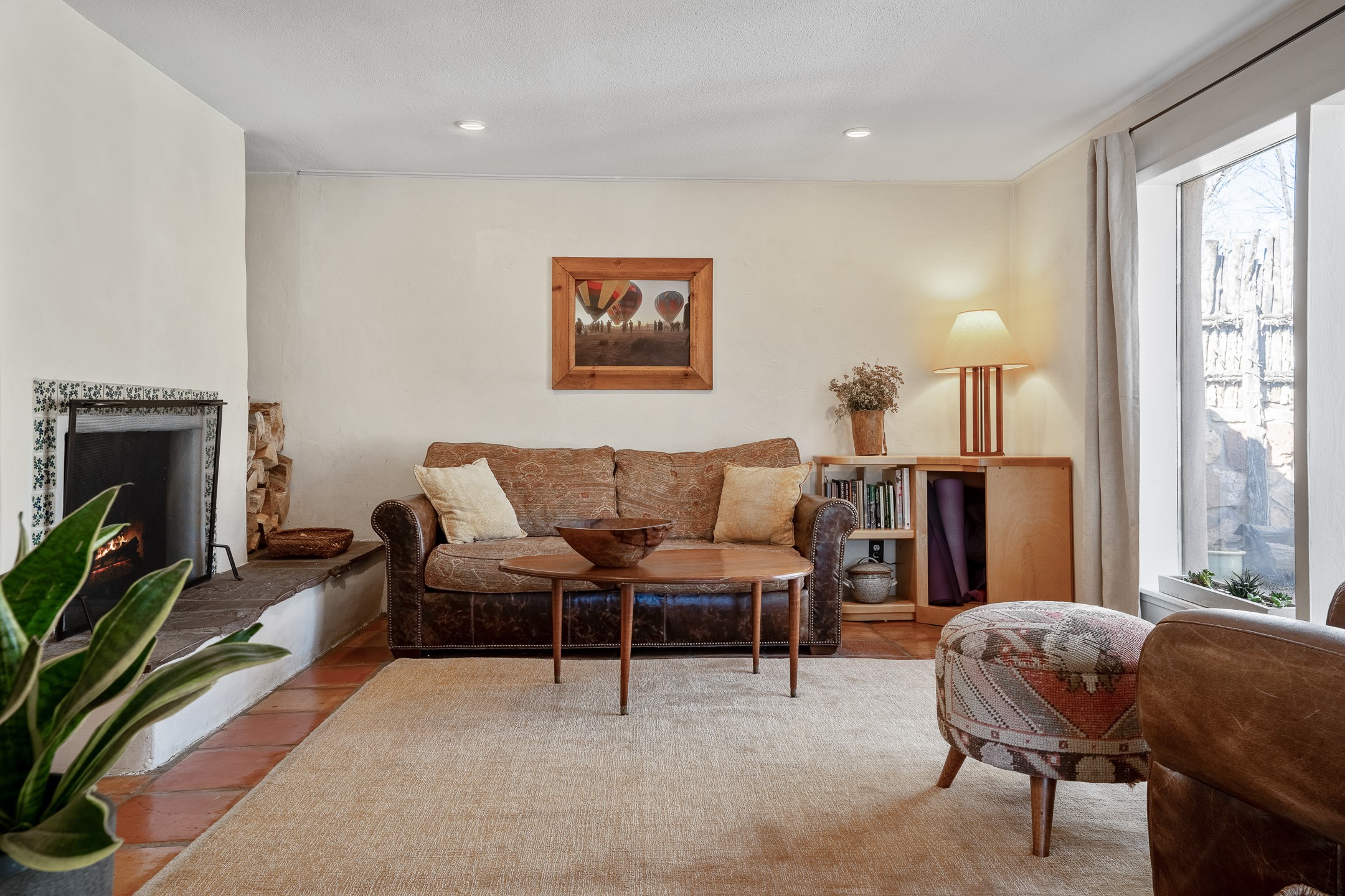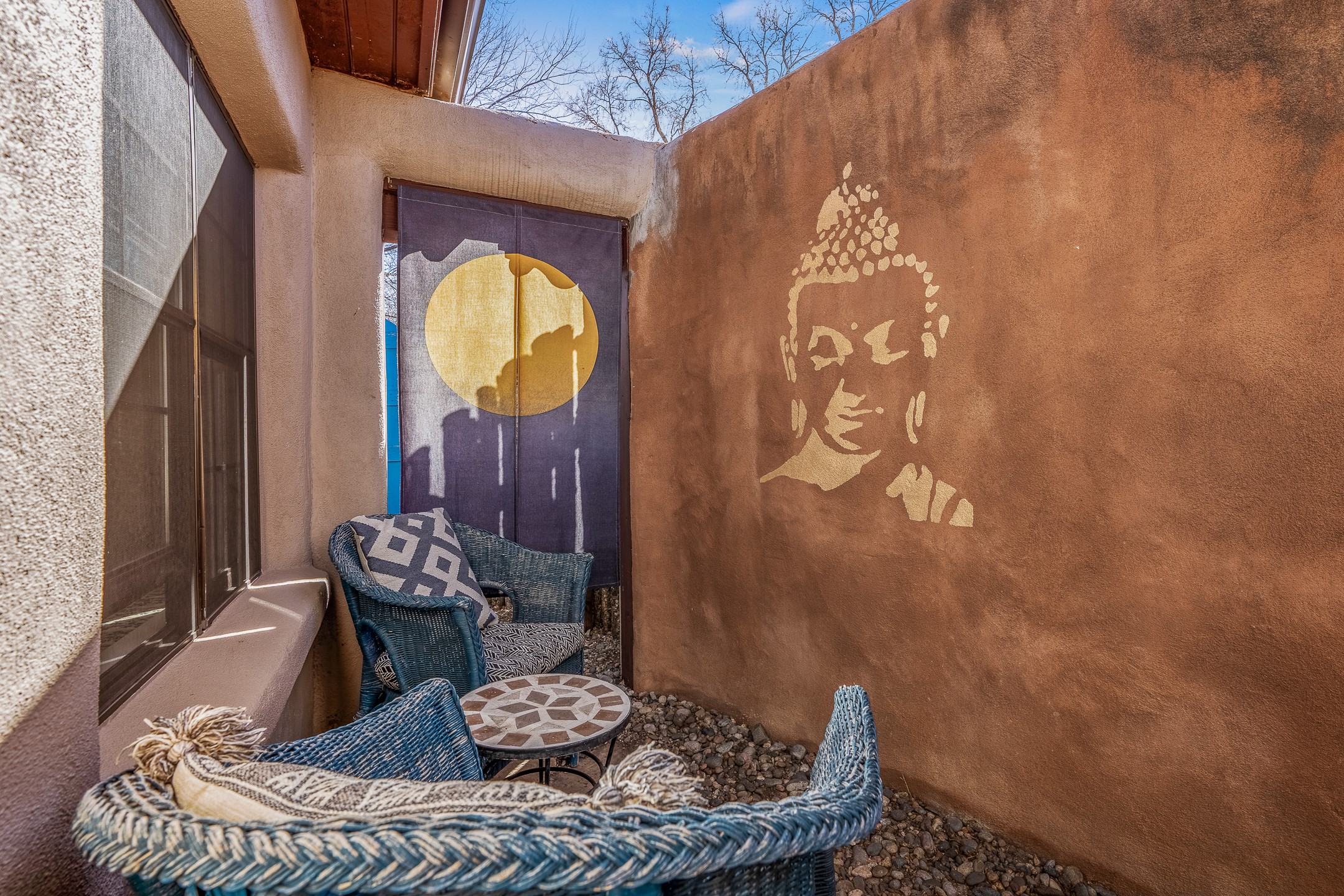 Historic Charm Meets Modern Elegance.Discover the perfect blend of historic charm and modern updates in this stunning, mostly adobe home located in the heart of Tesuque. This exquisite 3-bedroom, 2-bathroom residence features a spacious double-sided fireplace and an expansive dining area. The recently remodeled chef's kitchen boasts soapstone countertops, a quartz sink, and locally crafted cabinetry, including a hand-hewn mahogany pantry. The single-level layout ensures a seamless flow throughout the home. Interior highlights include a light-filled artist studio, skylights, handmade antique Saltillo tile floors, a Reverse Osmosis water system, a new washer and dryer, and a newer heating system (installed in 2022). Additional features include outdoor storage, a large attic, and ample parking.Step outside to a charming courtyard adorned with apple, pear, and pine trees--perfect for lounging during the warmer months. The native plant landscaping, surrounded by majestic Cottonwood trees, adds to the home's serene ambiance.Located just a few minutes' drive from Santa Fe Plaza, this home is conveniently near Tesuque Market and the Santa Fe Opera. Nature lovers will appreciate the proximity to the Santa Fe National Forest hiking trails and the Windsor Trail, with the soothing sound of the Rio Tesuque greeting you at the front door.This home is a rare find in the historic and highly sought-after Tesuque Village area of Northern New Mexico. It is part of a two-home condominium association with zero HOA fees. For more information, please visit http://tesuque-charm.com/