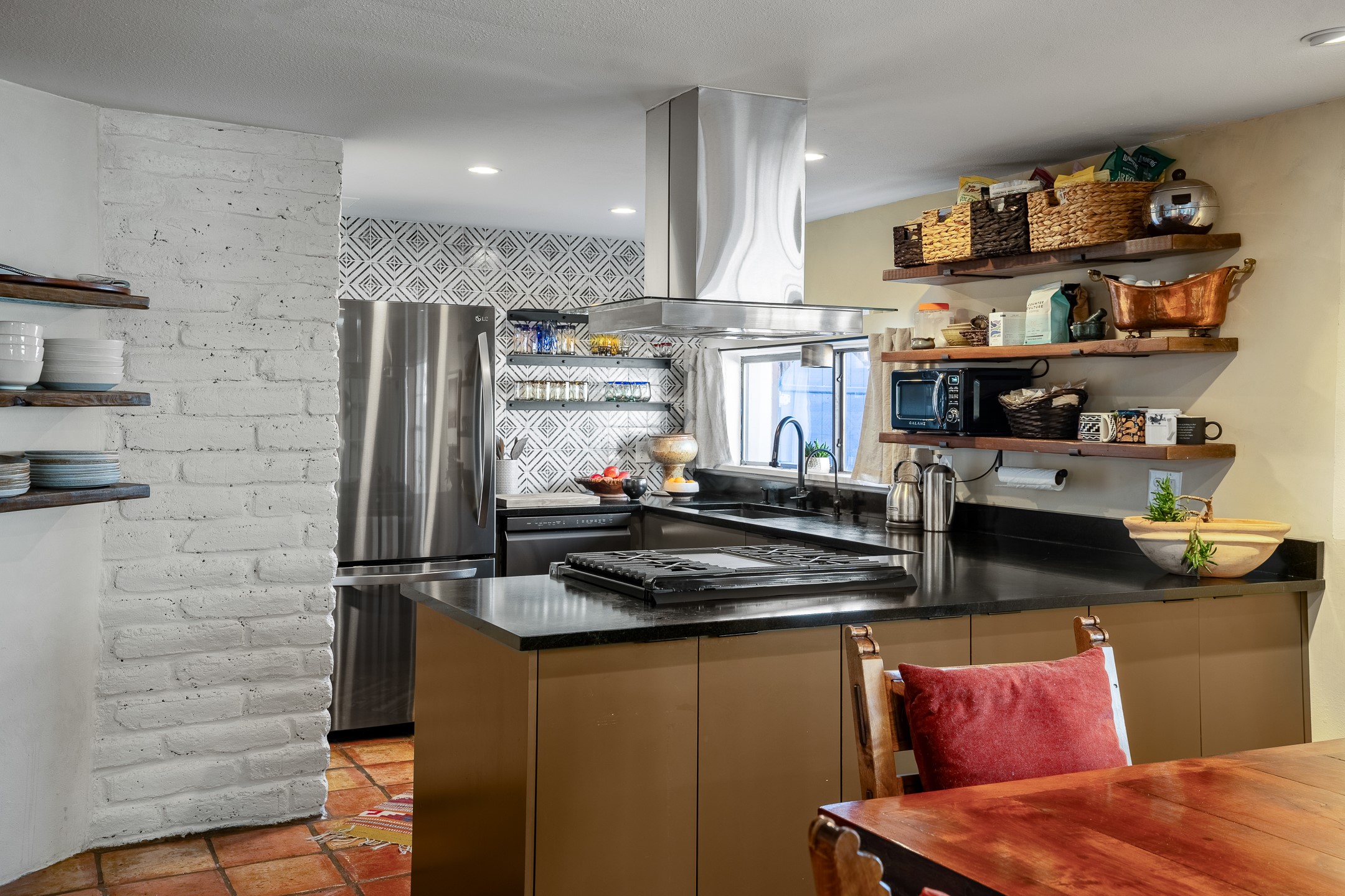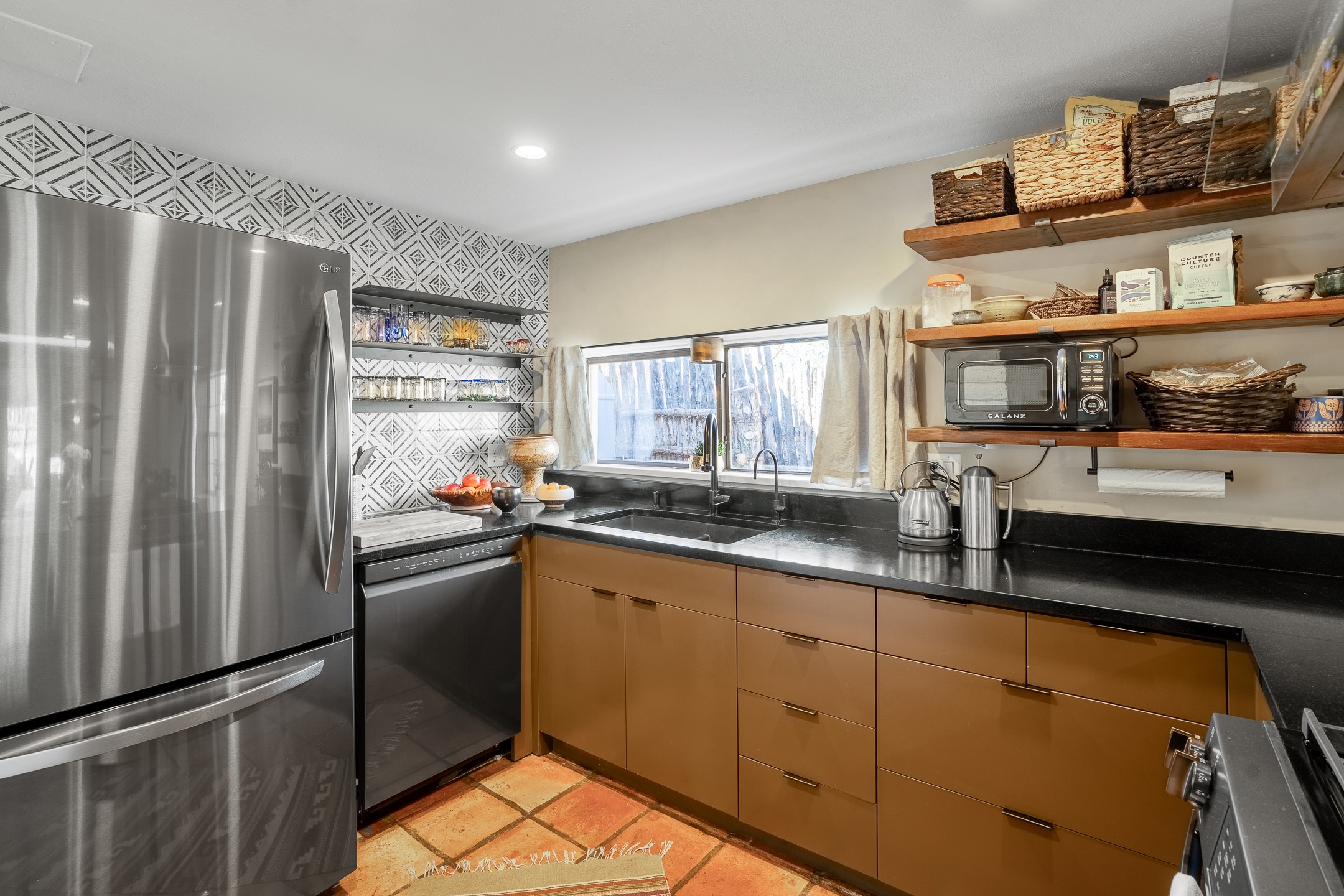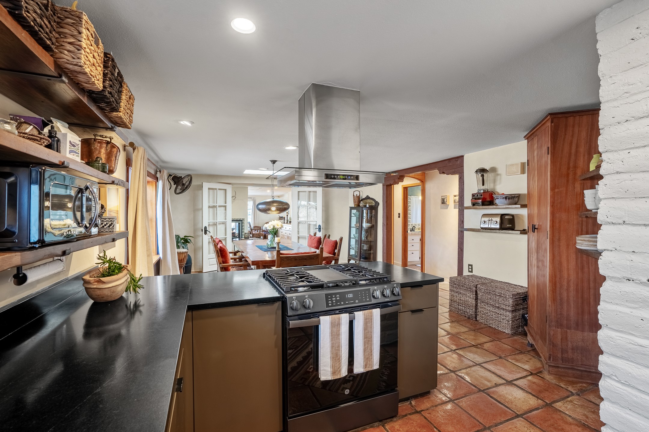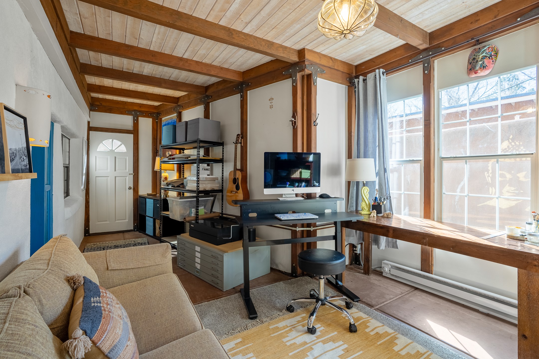 Historic Charm Meets Modern Elegance.Discover the perfect blend of historic charm and modern updates in this stunning, mostly adobe home located in the heart of Tesuque. This exquisite 3-bedroom, 2-bathroom residence features a spacious double-sided fireplace and an expansive dining area. The recently remodeled chef's kitchen boasts soapstone countertops, a quartz sink, and locally crafted cabinetry, including a hand-hewn mahogany pantry. The single-level layout ensures a seamless flow throughout the home. Interior highlights include a light-filled artist studio, skylights, handmade antique Saltillo tile floors, a Reverse Osmosis water system, a new washer and dryer, and a newer heating system (installed in 2022). Additional features include outdoor storage, a large attic, and ample parking.Step outside to a charming courtyard adorned with apple, pear, and pine trees--perfect for lounging during the warmer months. The native plant landscaping, surrounded by majestic Cottonwood trees, adds to the home's serene ambiance.Located just a few minutes' drive from Santa Fe Plaza, this home is conveniently near Tesuque Market and the Santa Fe Opera. Nature lovers will appreciate the proximity to the Santa Fe National Forest hiking trails and the Windsor Trail, with the soothing sound of the Rio Tesuque greeting you at the front door.This home is a rare find in the historic and highly sought-after Tesuque Village area of Northern New Mexico. It is part of a two-home condominium association with zero HOA fees. For more information, please visit http://tesuque-charm.com/