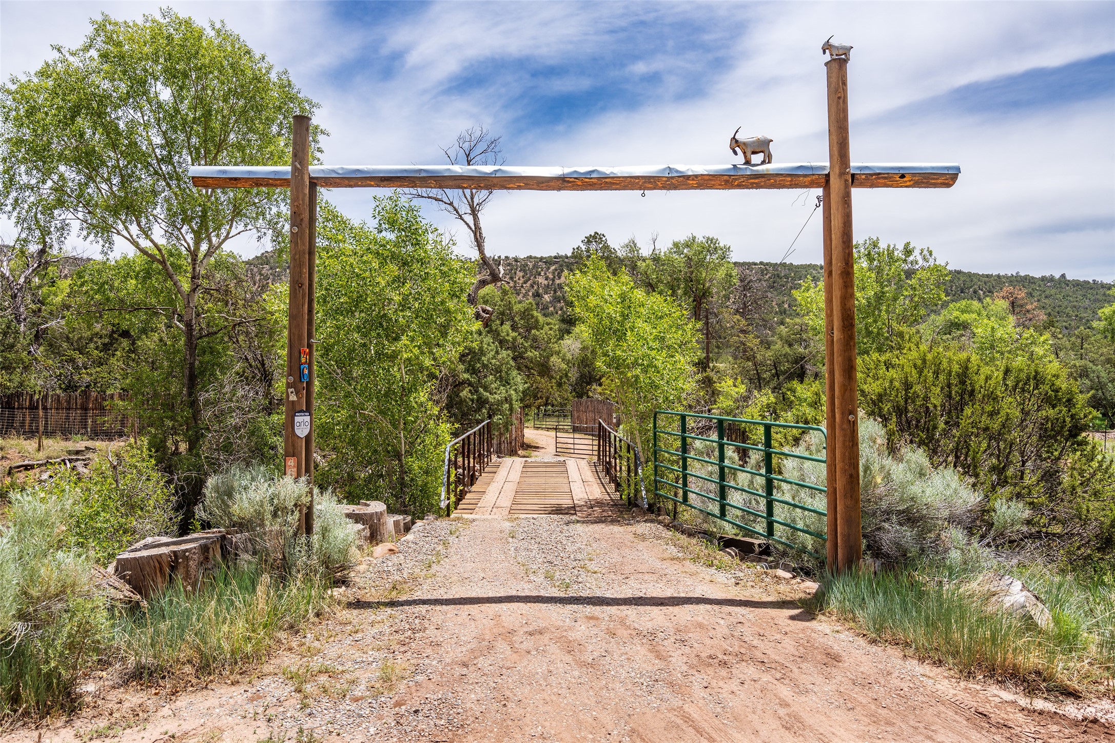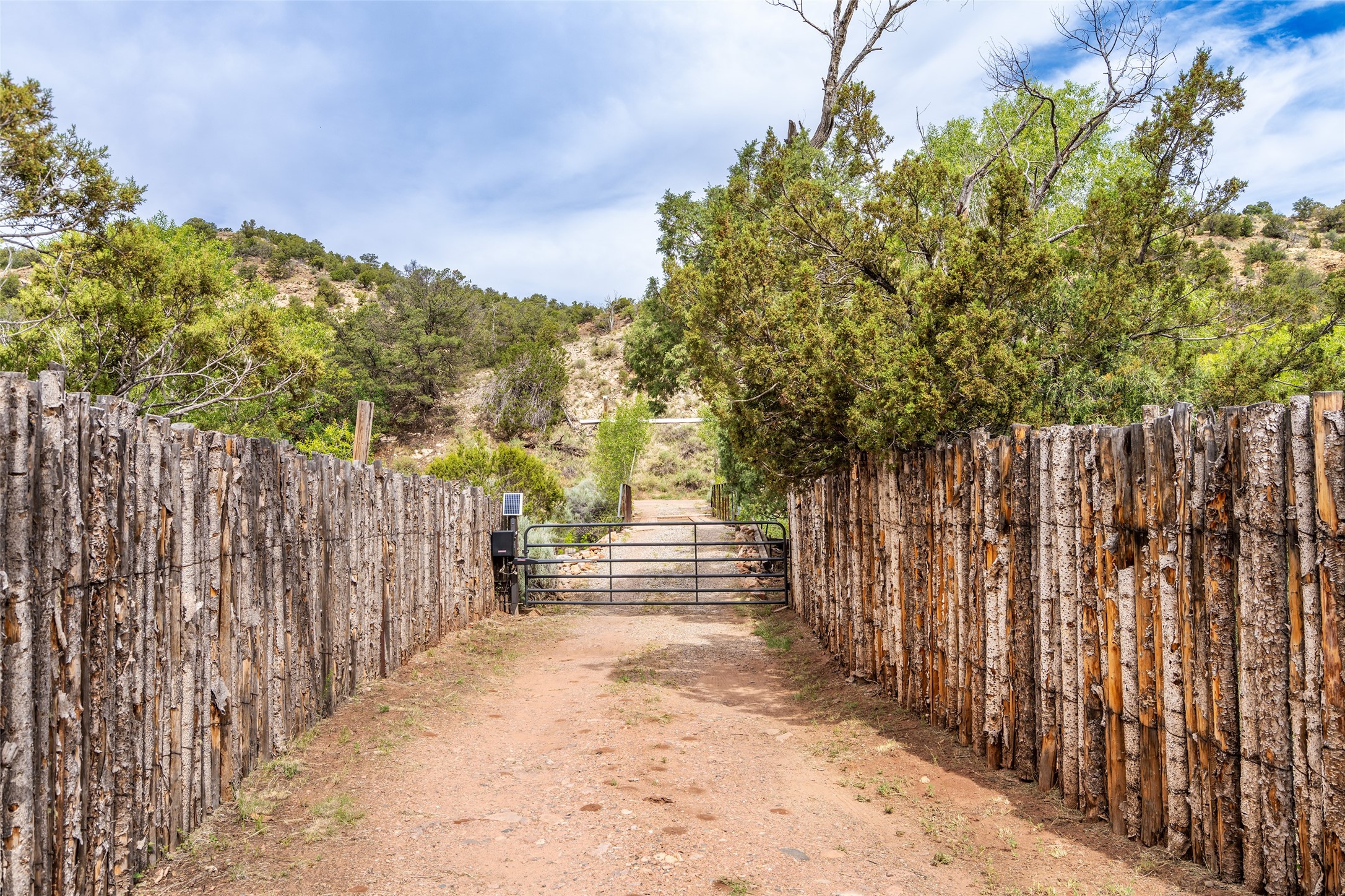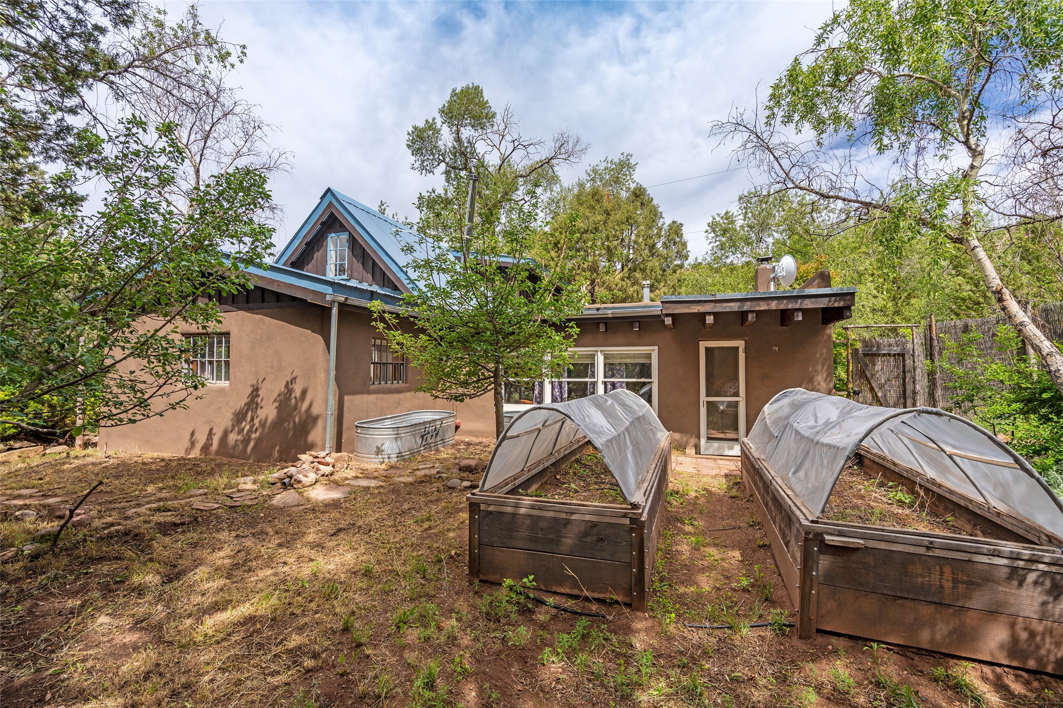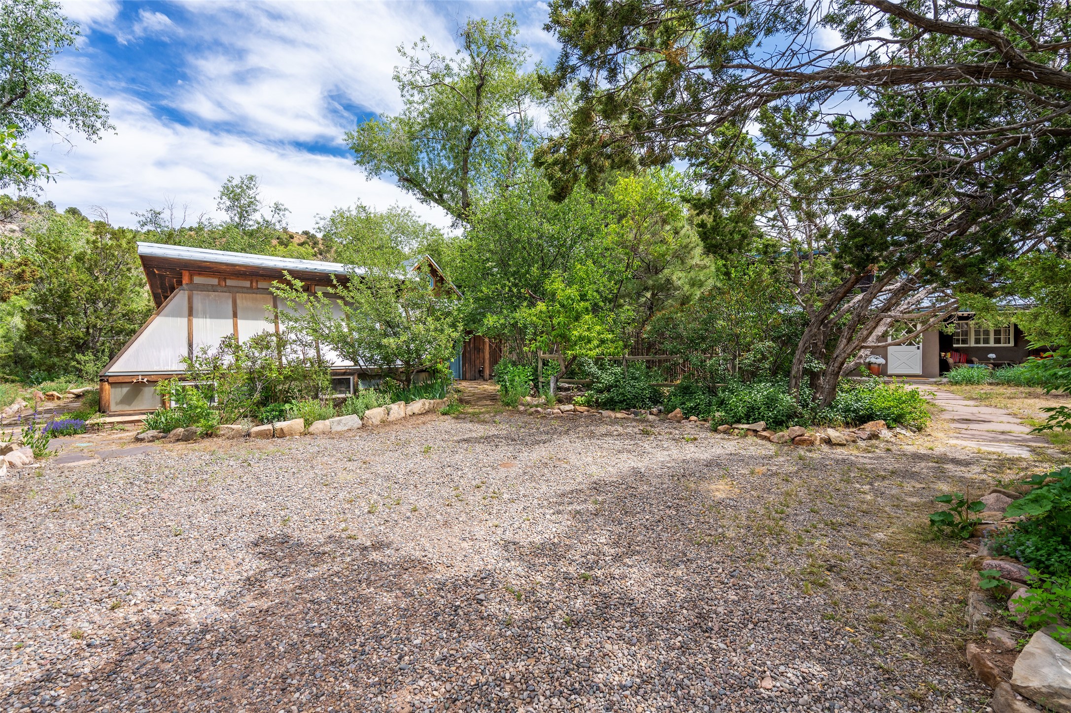 Nature-lover's paradise on 6 Acres- Tucked beneath red rock hills--Cross the bridge from Sibley Road and enter your private sanctuary nestled on six acres of lush, mature land in the serene community of Caoncito. This one-of-a-kind property features a thoughtfully updated three-bedroom, two-bathroom adobe and frame main house that blends timeless charm with modern luxury. Highlights include fully renovated luxury bathrooms and a gourmet kitchen with artisan tile, locally crafted ironwork throughout, and new sustainable wood floors. The home showcases diamond finish plaster and low-VOC finishes, ensuring both beauty and environmental consciousness. The hand-built guest house, perfect for visitors, rental income, or a creative studio, includes a cozy bedroom, bath, kitchenette, and a loft. Attached is a greenhouse for year-round gardening. Outdoors, you'll find a detached carport/shop featuring stonework sourced from the nearby Glorieta Mesa, which doubles as an open-air workspace or additional storage. A traditional underground kiva structure provides a private ceremonial space.The grounds are a horticultural haven with old-growth cottonwoods, pions, and raised garden beds. A private well adds to the property's potential for self-sufficient living. Whether you're a homesteader, gardener, artist, or seeking a peaceful retreat, this property offers the perfect setting.Set in a classic rural NM neighborhood, the house sits on three acres fenced in with coyote fencing, providing safety and privacy. An additional three acres remain wild, with a neighborhood path leading you to public hiking trails and sunset views. Located just 25 minutes from downtown Santa Fe, this tranquil retreat offers the best of both worlds: a private haven with access to the vibrant city. With its artisanal remodel and high desert landscape, this property is an extraordinary opportunity for those seeking comfort, luxury, and self-sufficient living.