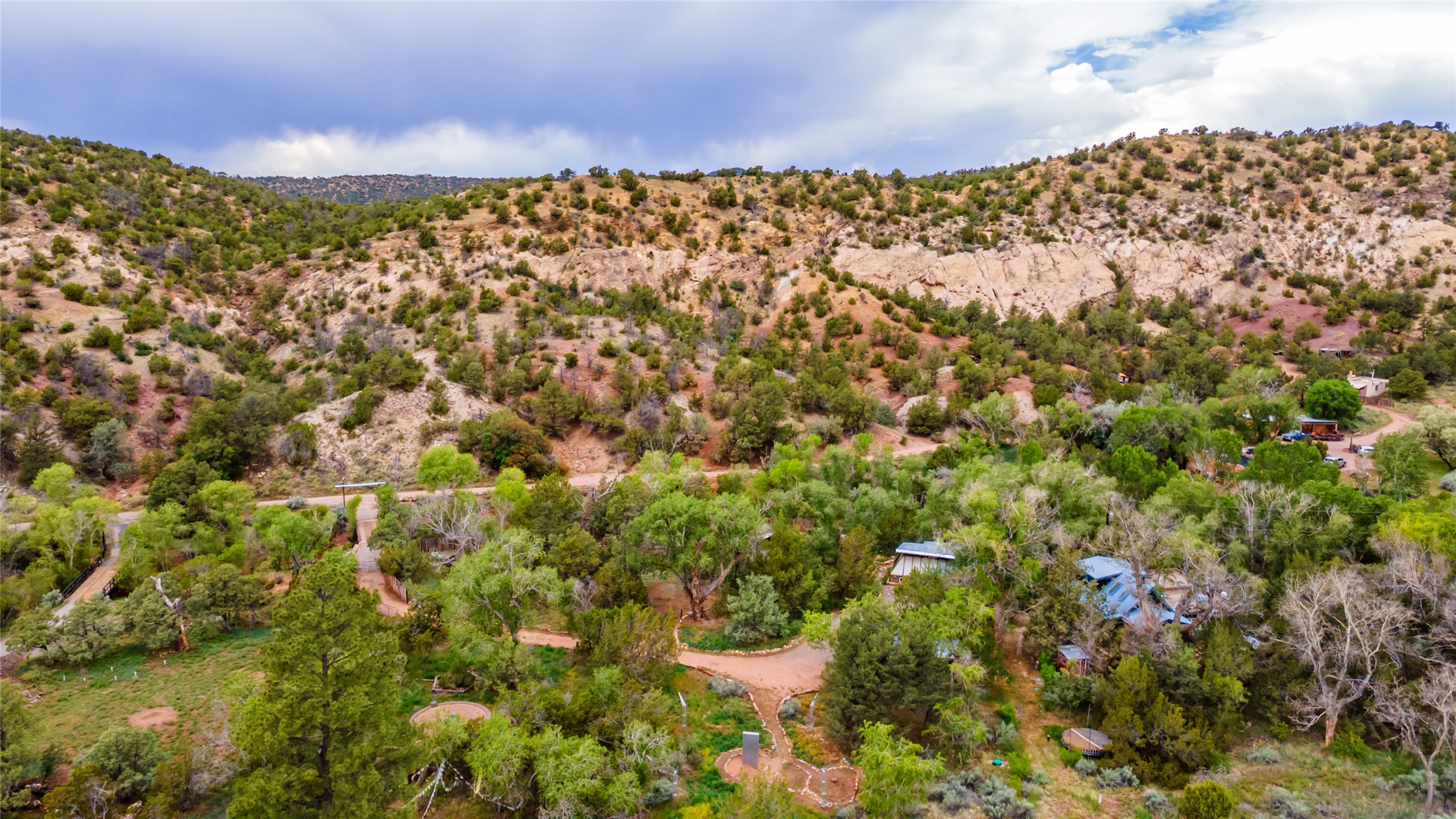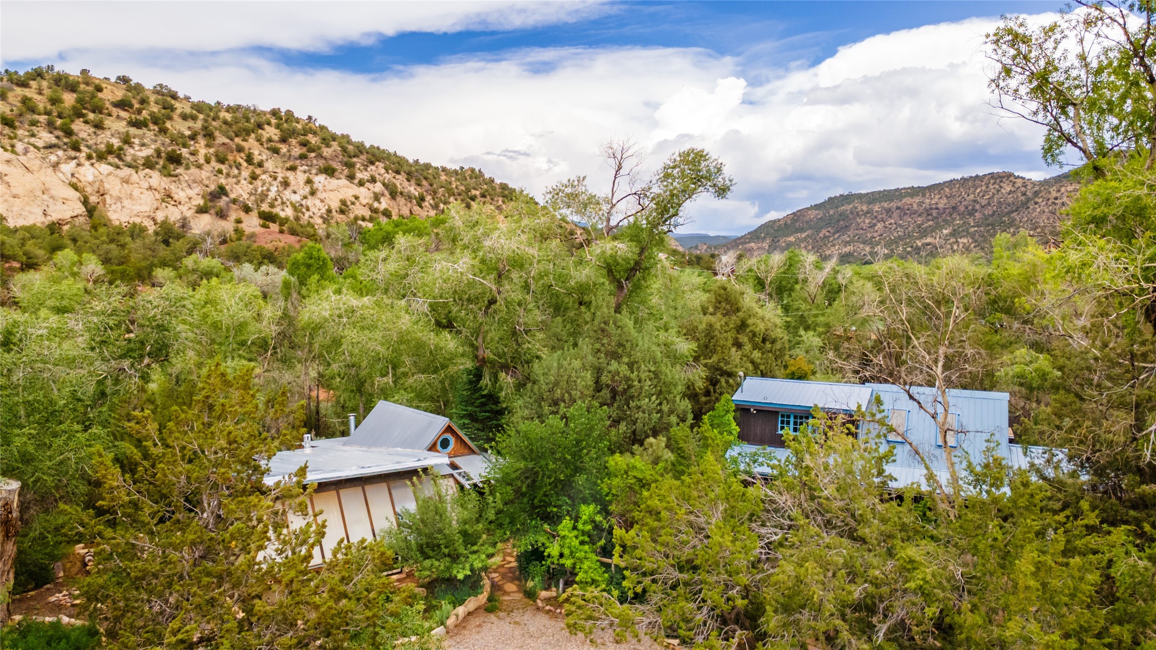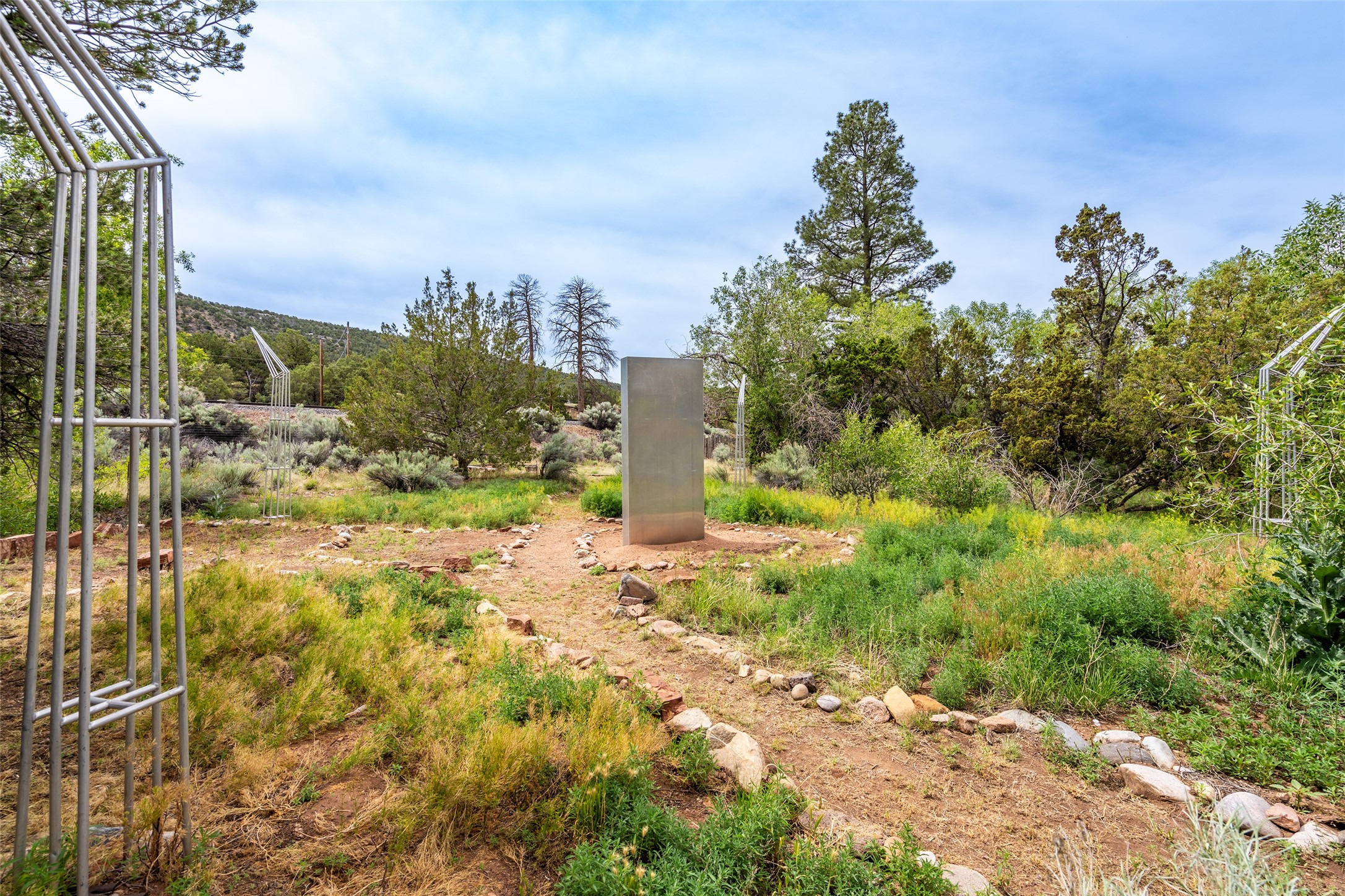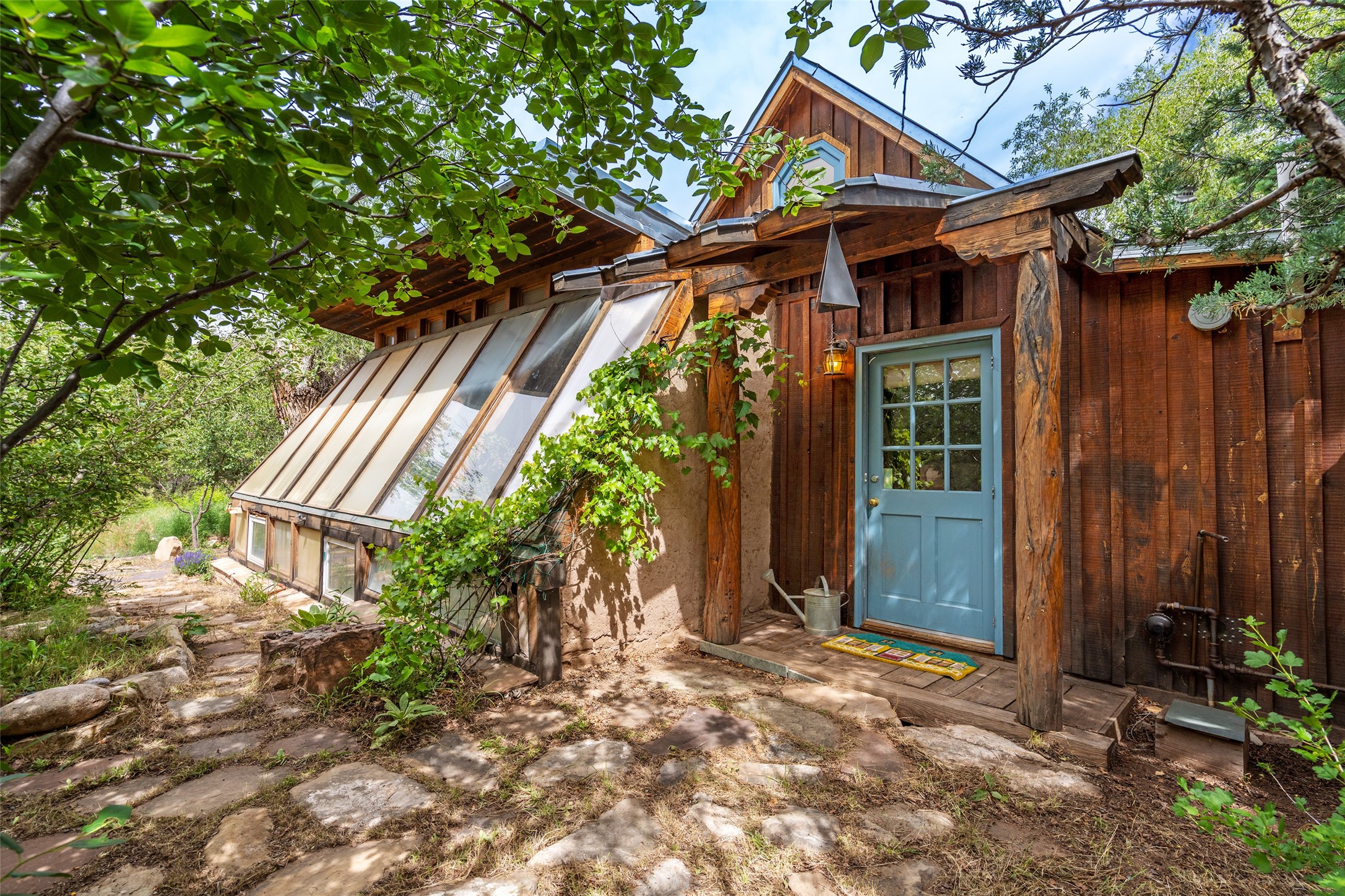 Nature-lover's paradise on 6 Acres- Tucked beneath red rock hills--Cross the bridge from Sibley Road and enter your private sanctuary nestled on six acres of lush, mature land in the serene community of Caoncito. This one-of-a-kind property features a thoughtfully updated three-bedroom, two-bathroom adobe and frame main house that blends timeless charm with modern luxury. Highlights include fully renovated luxury bathrooms and a gourmet kitchen with artisan tile, locally crafted ironwork throughout, and new sustainable wood floors. The home showcases diamond finish plaster and low-VOC finishes, ensuring both beauty and environmental consciousness. The hand-built guest house, perfect for visitors, rental income, or a creative studio, includes a cozy bedroom, bath, kitchenette, and a loft. Attached is a greenhouse for year-round gardening. Outdoors, you'll find a detached carport/shop featuring stonework sourced from the nearby Glorieta Mesa, which doubles as an open-air workspace or additional storage. A traditional underground kiva structure provides a private ceremonial space.The grounds are a horticultural haven with old-growth cottonwoods, pions, and raised garden beds. A private well adds to the property's potential for self-sufficient living. Whether you're a homesteader, gardener, artist, or seeking a peaceful retreat, this property offers the perfect setting.Set in a classic rural NM neighborhood, the house sits on three acres fenced in with coyote fencing, providing safety and privacy. An additional three acres remain wild, with a neighborhood path leading you to public hiking trails and sunset views. Located just 25 minutes from downtown Santa Fe, this tranquil retreat offers the best of both worlds: a private haven with access to the vibrant city. With its artisanal remodel and high desert landscape, this property is an extraordinary opportunity for those seeking comfort, luxury, and self-sufficient living.