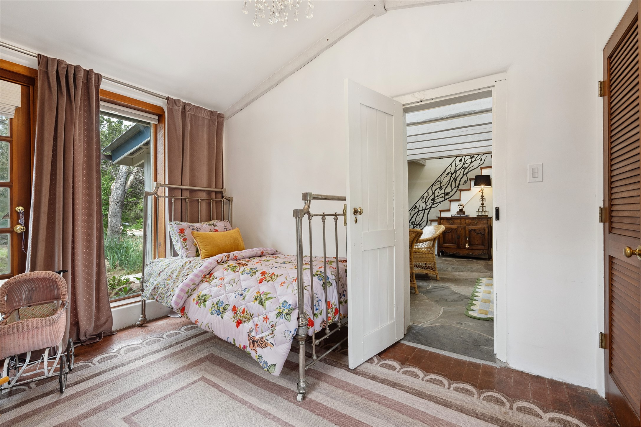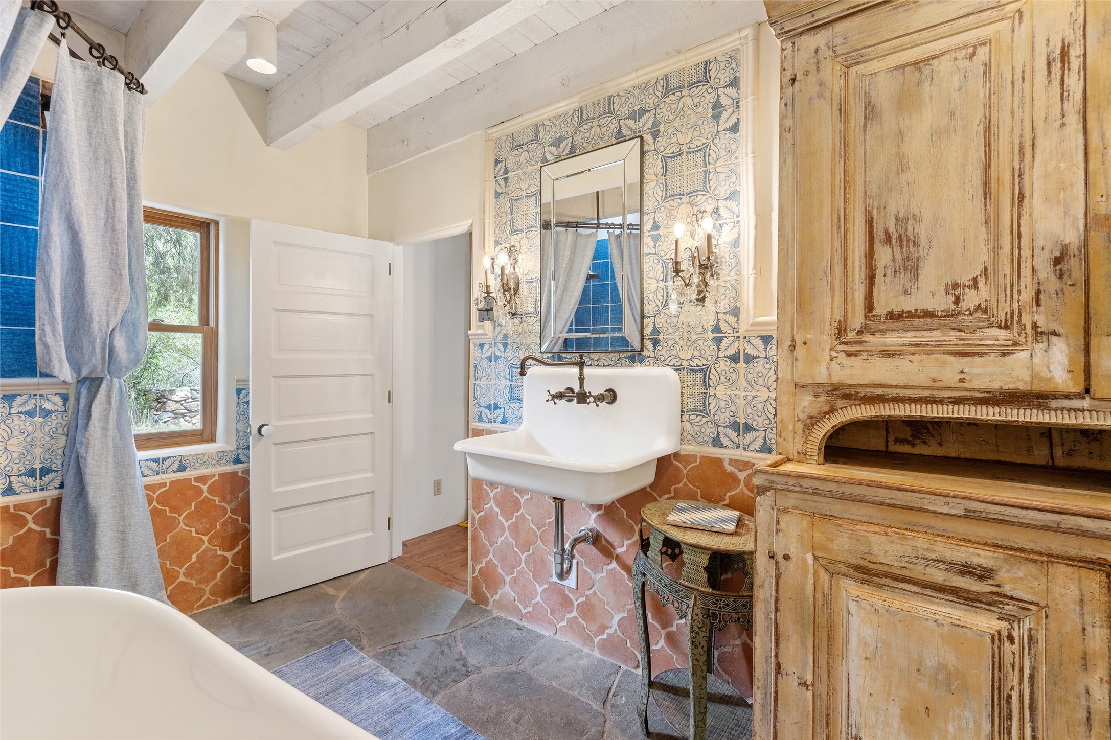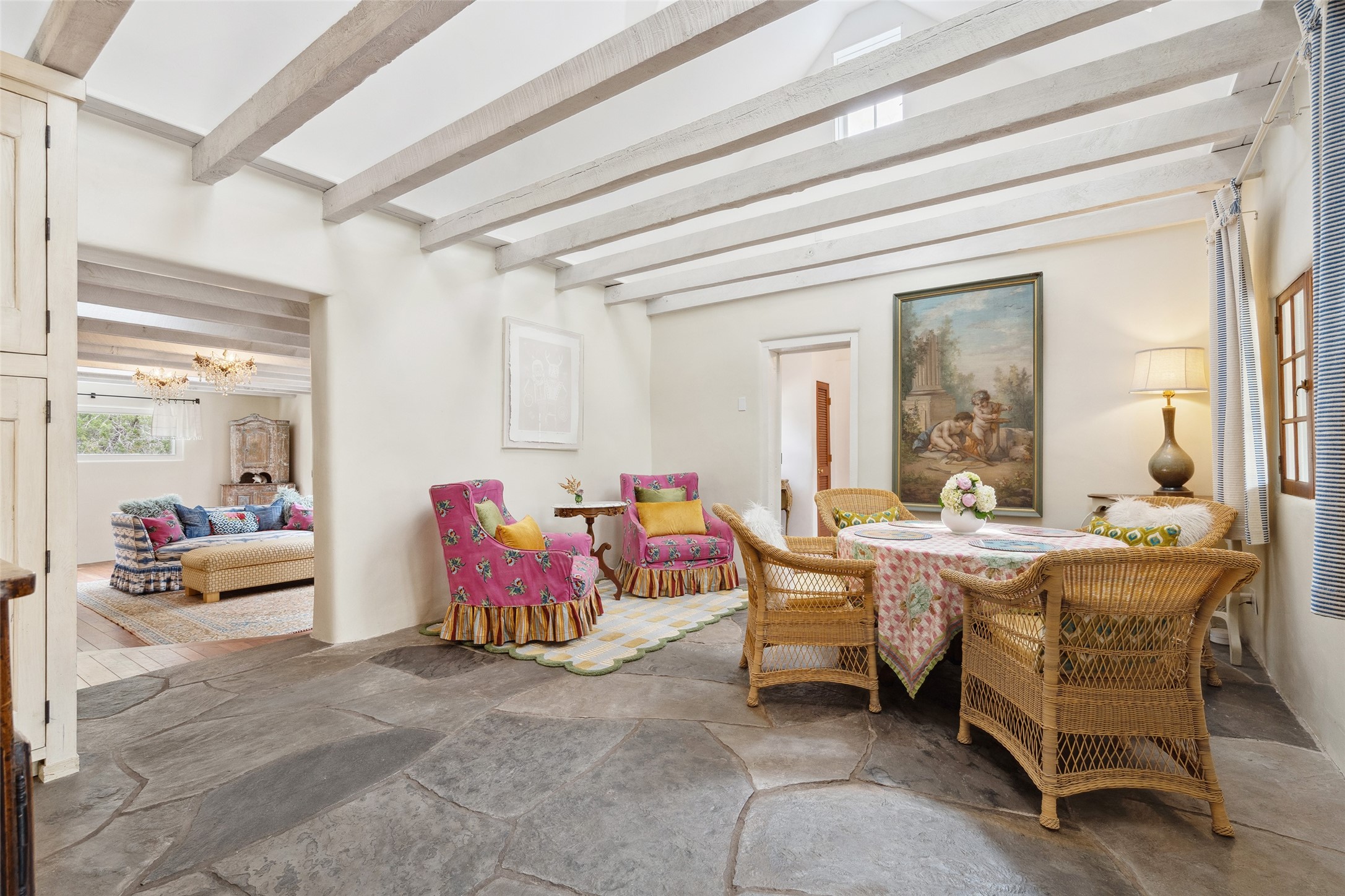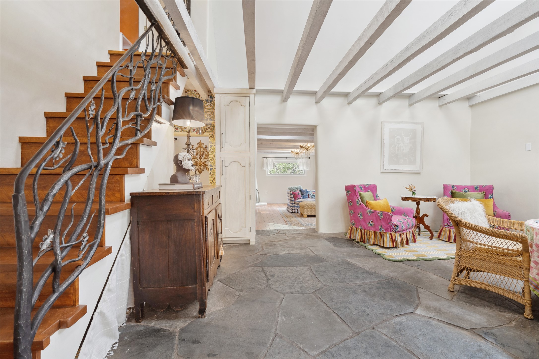 Nature-lover's paradise on 6 Acres- Tucked beneath red rock hills--Cross the bridge from Sibley Road and enter your private sanctuary nestled on six acres of lush, mature land in the serene community of Caoncito. This one-of-a-kind property features a thoughtfully updated three-bedroom, two-bathroom adobe and frame main house that blends timeless charm with modern luxury. Highlights include fully renovated luxury bathrooms and a gourmet kitchen with artisan tile, locally crafted ironwork throughout, and new sustainable wood floors. The home showcases diamond finish plaster and low-VOC finishes, ensuring both beauty and environmental consciousness. The hand-built guest house, perfect for visitors, rental income, or a creative studio, includes a cozy bedroom, bath, kitchenette, and a loft. Attached is a greenhouse for year-round gardening. Outdoors, you'll find a detached carport/shop featuring stonework sourced from the nearby Glorieta Mesa, which doubles as an open-air workspace or additional storage. A traditional underground kiva structure provides a private ceremonial space.The grounds are a horticultural haven with old-growth cottonwoods, pions, and raised garden beds. A private well adds to the property's potential for self-sufficient living. Whether you're a homesteader, gardener, artist, or seeking a peaceful retreat, this property offers the perfect setting.Set in a classic rural NM neighborhood, the house sits on three acres fenced in with coyote fencing, providing safety and privacy. An additional three acres remain wild, with a neighborhood path leading you to public hiking trails and sunset views. Located just 25 minutes from downtown Santa Fe, this tranquil retreat offers the best of both worlds: a private haven with access to the vibrant city. With its artisanal remodel and high desert landscape, this property is an extraordinary opportunity for those seeking comfort, luxury, and self-sufficient living.