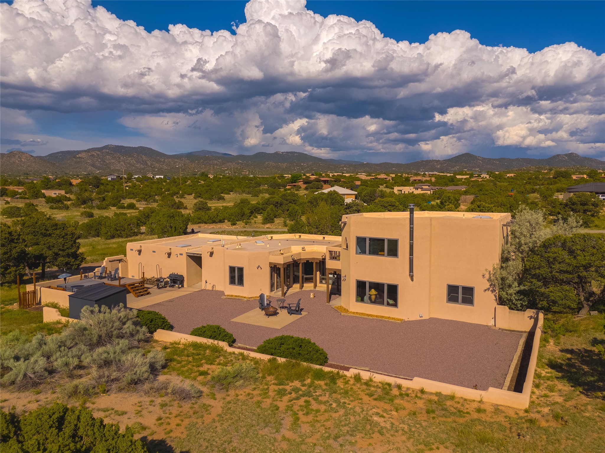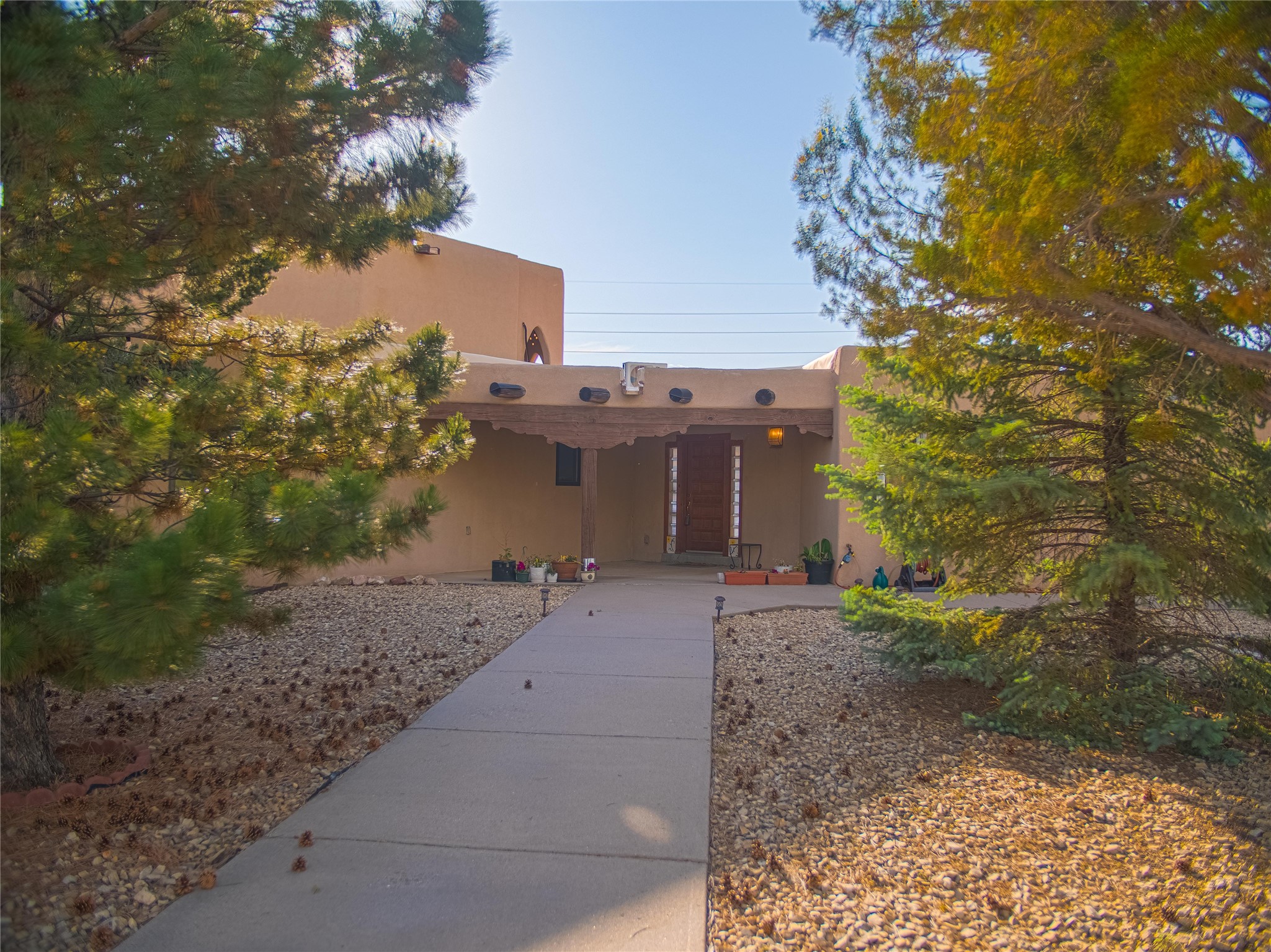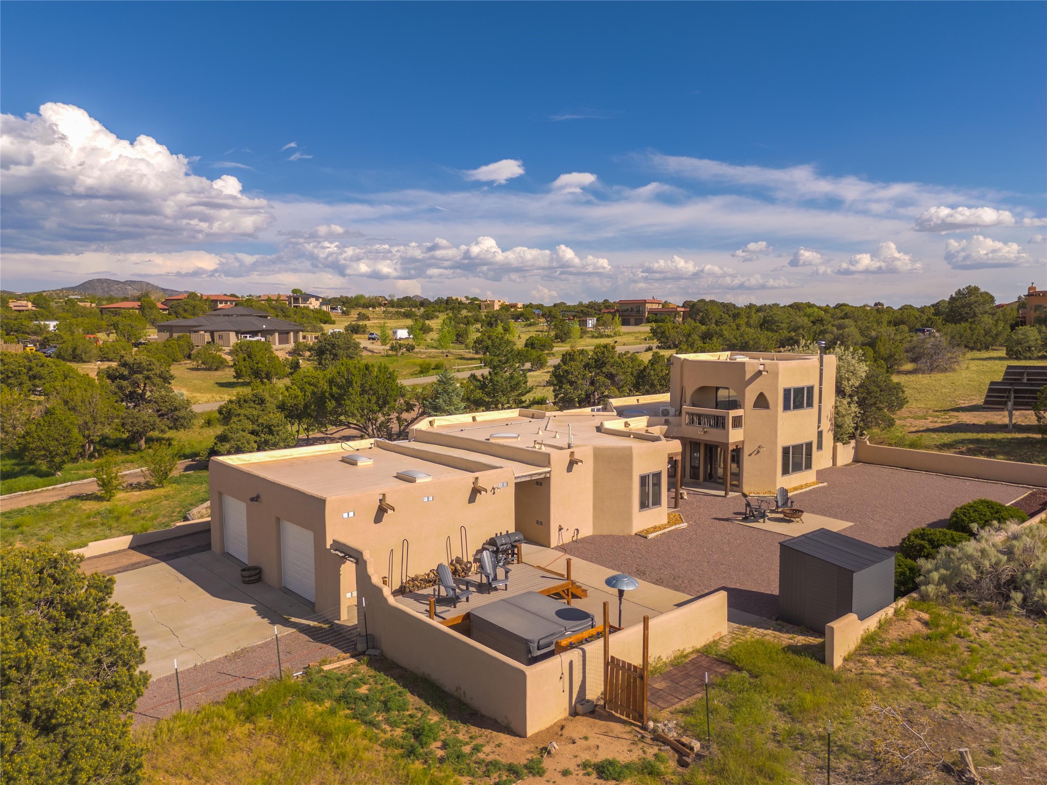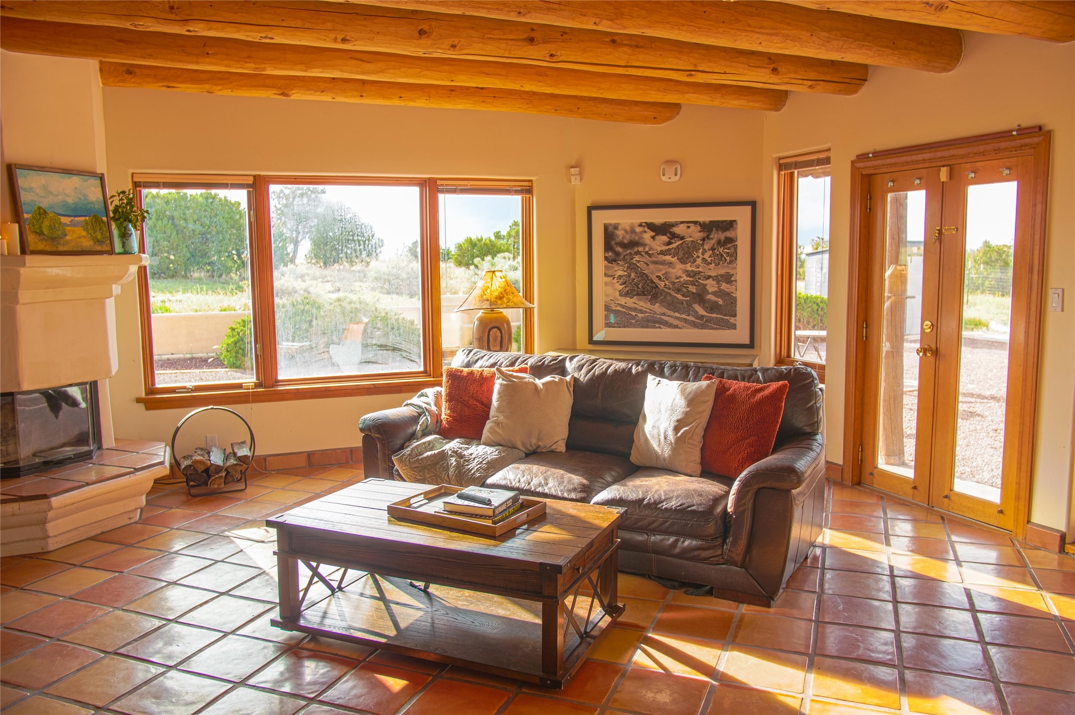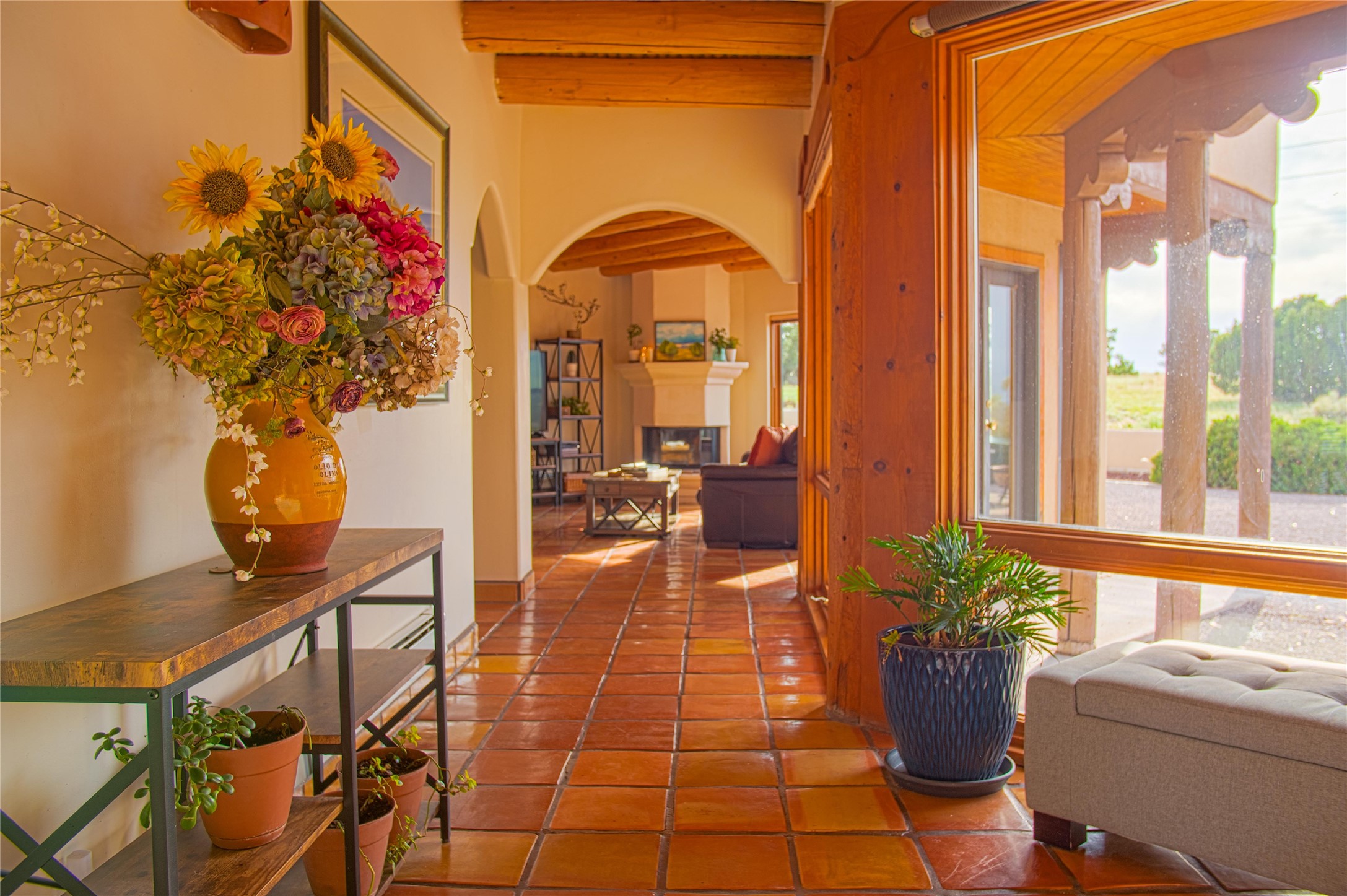 This stunning Santa Fe-style home features saltillo tile, with rustic vigas and charming latilla ceilings downstairs, celebrating the timeless Southwestern aesthetic. Create a culinary delight in the chef's kitchen or cozy up by the warm, inviting fireplace. Unwind in the soothing hot tub while soaking in panoramic views from your expansive lot. This residence is not only visually striking but also environmentally conscious, featuring a solar system with 200 amp service and EV charging capabilities in the garage. Ideally situated close to I-25, it provides an effortless commute to Albuquerque and Los Alamos, making it a perfect sanctuary for those seeking both luxury and convenience.