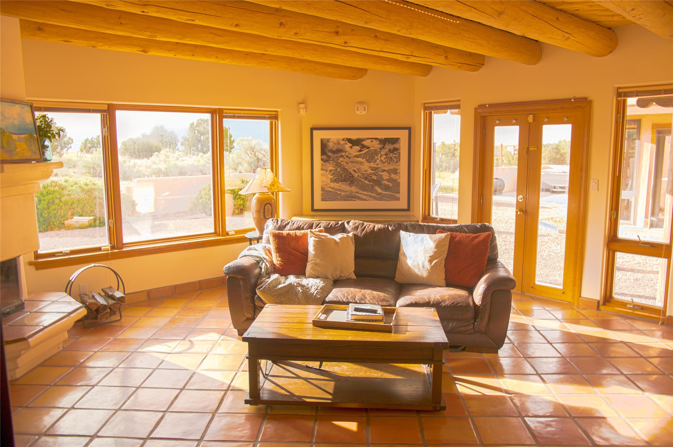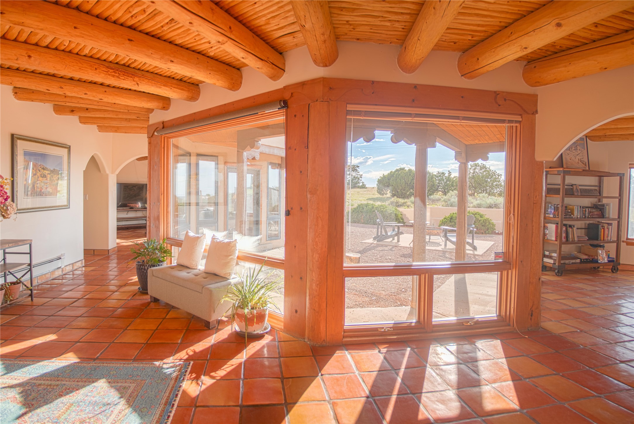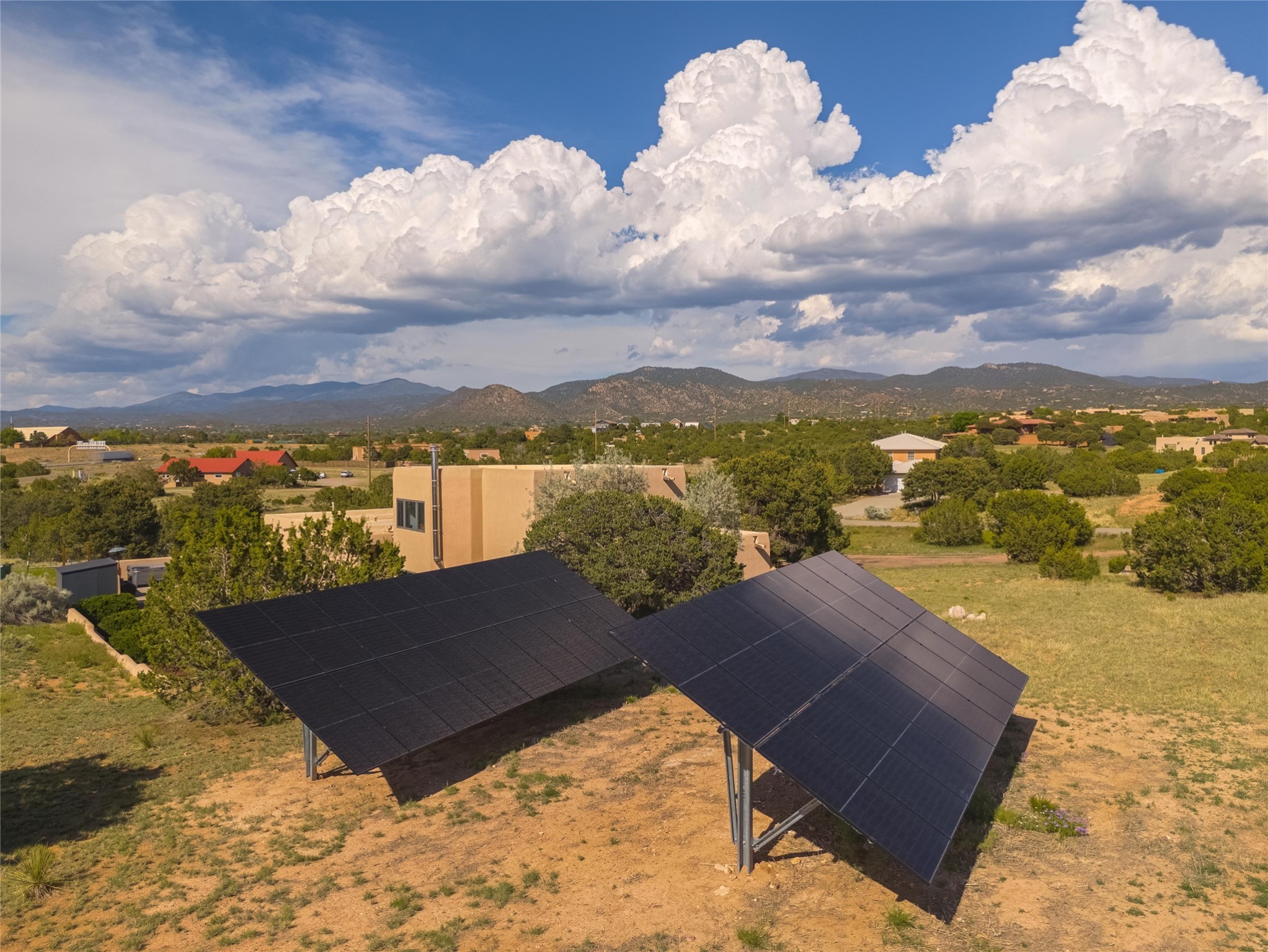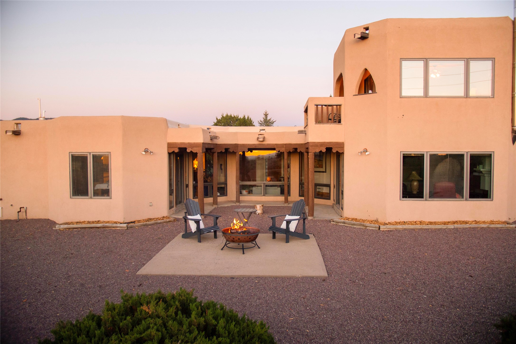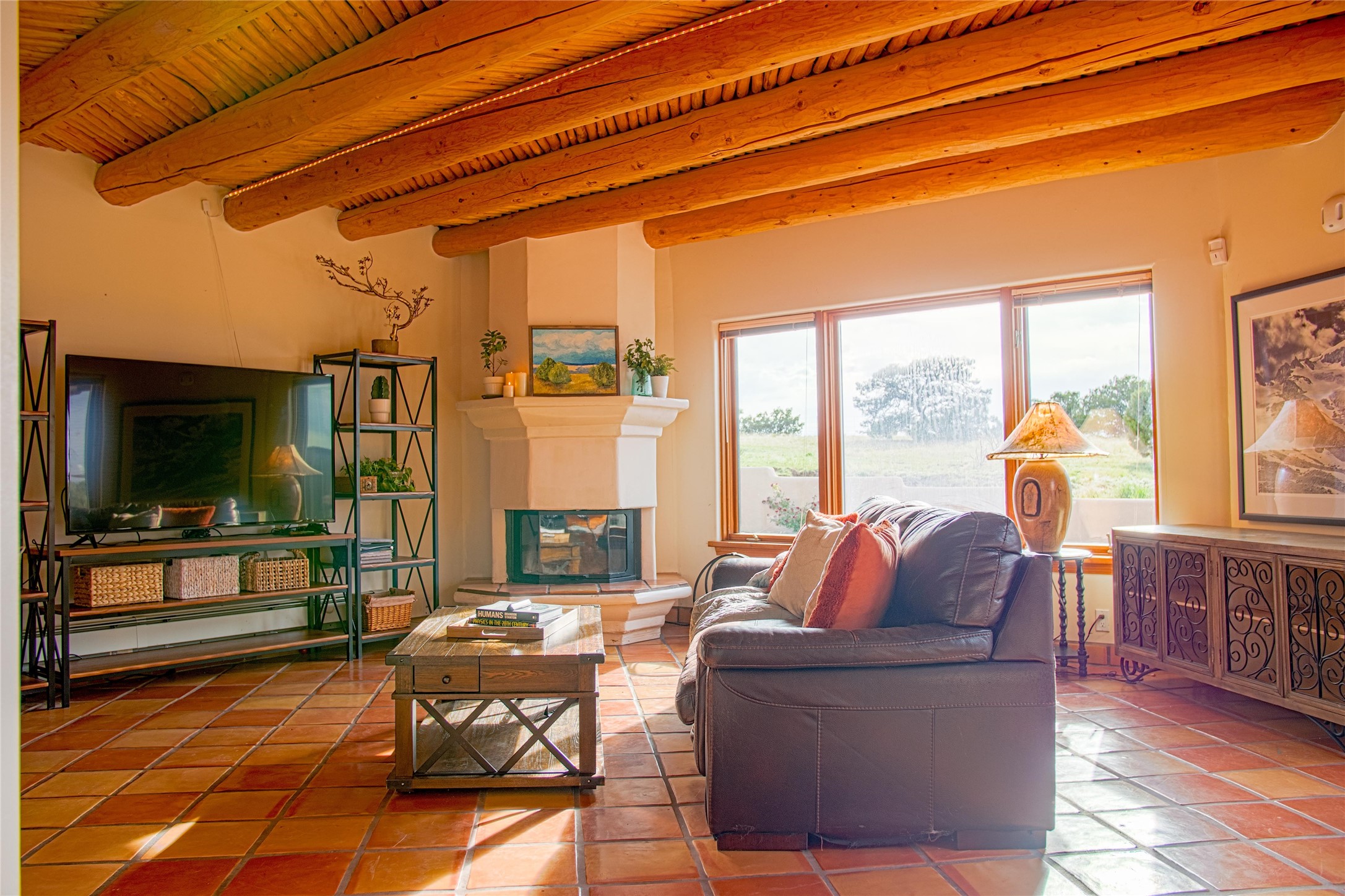 This stunning Santa Fe-style home features saltillo tile, with rustic vigas and charming latilla ceilings downstairs, celebrating the timeless Southwestern aesthetic. Create a culinary delight in the chef's kitchen or cozy up by the warm, inviting fireplace. Unwind in the soothing hot tub while soaking in panoramic views from your expansive lot. This residence is not only visually striking but also environmentally conscious, featuring a solar system with 200 amp service and EV charging capabilities in the garage. Ideally situated close to I-25, it provides an effortless commute to Albuquerque and Los Alamos, making it a perfect sanctuary for those seeking both luxury and convenience.