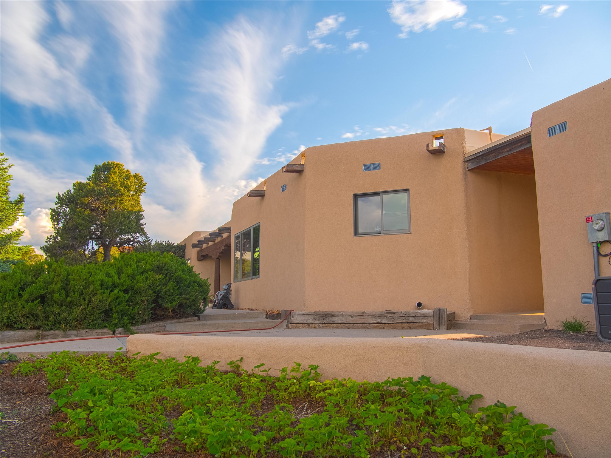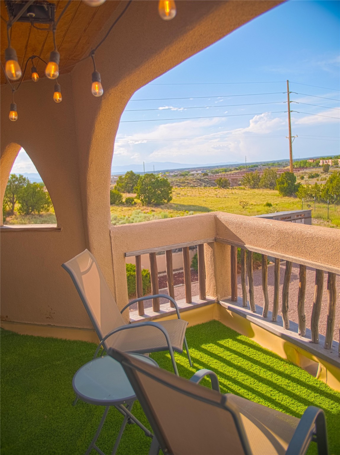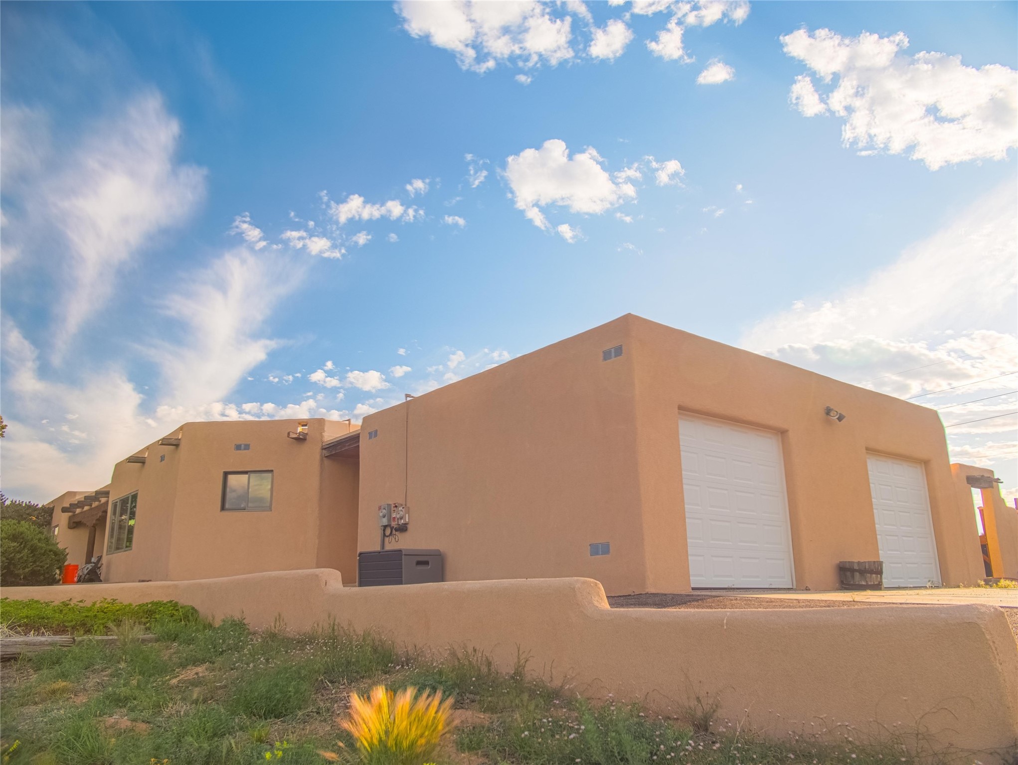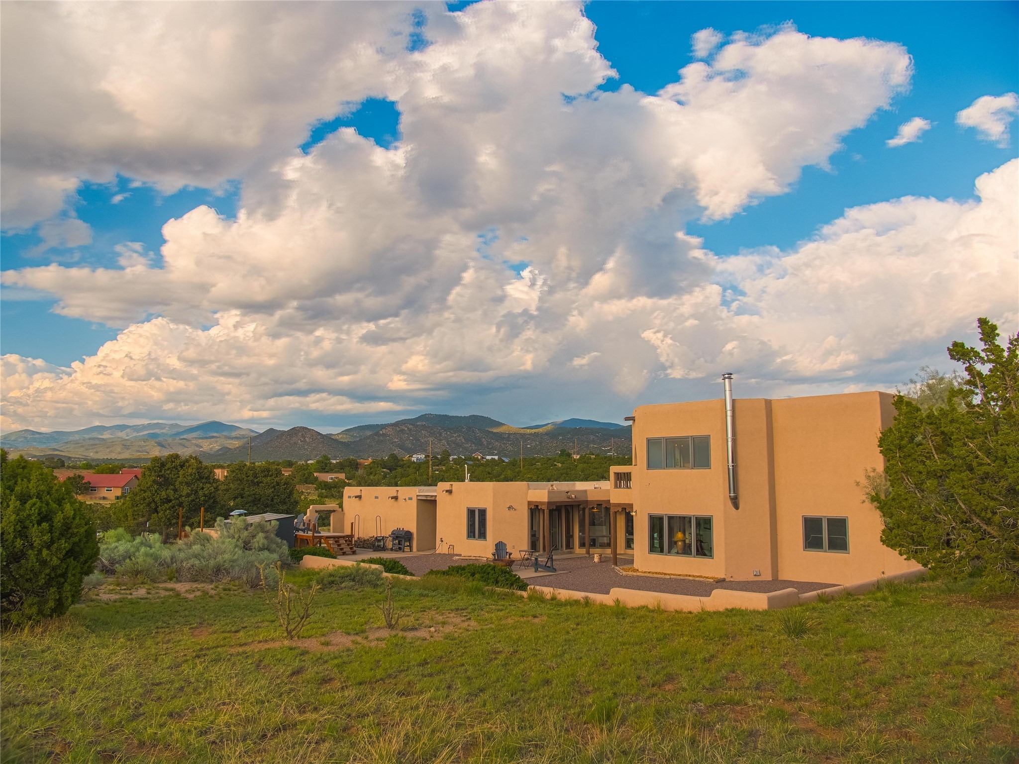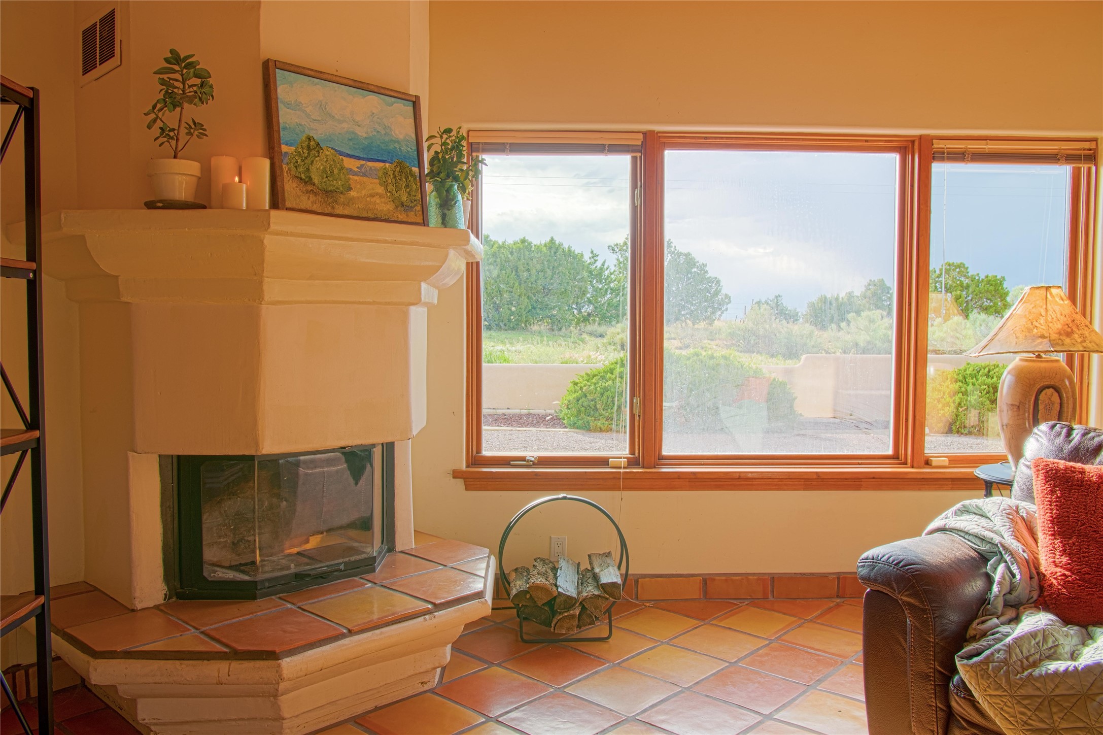 This stunning Santa Fe-style home features saltillo tile, with rustic vigas and charming latilla ceilings downstairs, celebrating the timeless Southwestern aesthetic. Create a culinary delight in the chef's kitchen or cozy up by the warm, inviting fireplace. Unwind in the soothing hot tub while soaking in panoramic views from your expansive lot. This residence is not only visually striking but also environmentally conscious, featuring a solar system with 200 amp service and EV charging capabilities in the garage. Ideally situated close to I-25, it provides an effortless commute to Albuquerque and Los Alamos, making it a perfect sanctuary for those seeking both luxury and convenience.