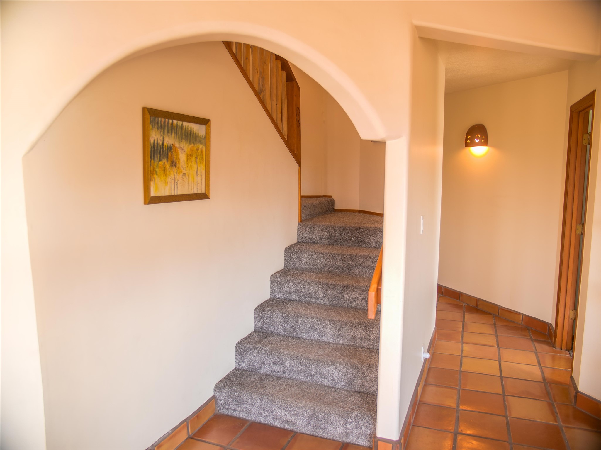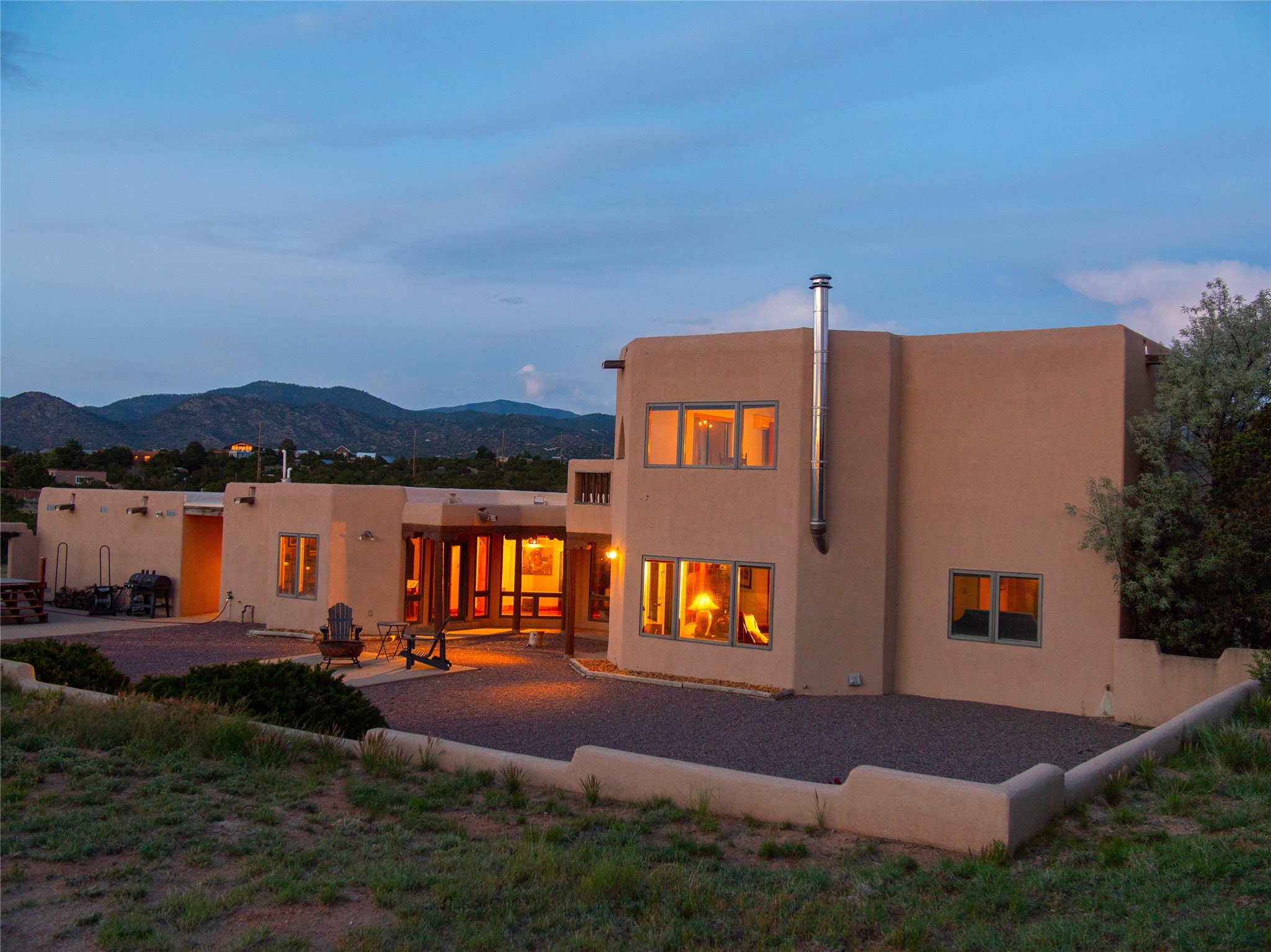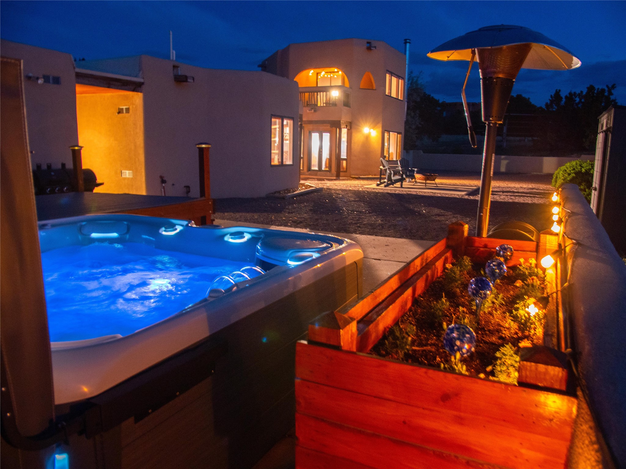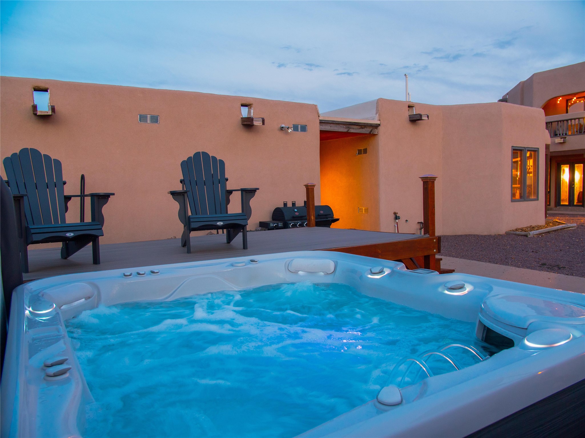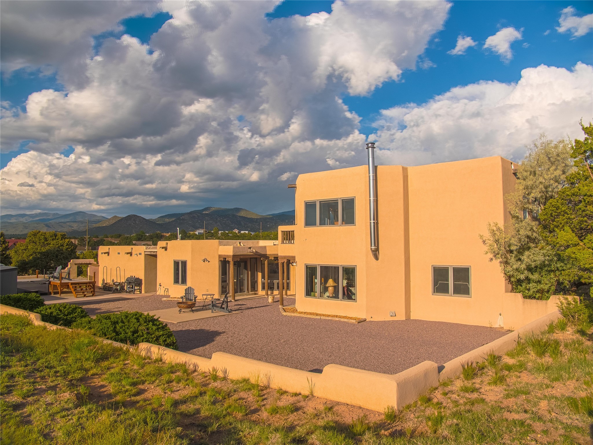 This stunning Santa Fe-style home features saltillo tile, with rustic vigas and charming latilla ceilings downstairs, celebrating the timeless Southwestern aesthetic. Create a culinary delight in the chef's kitchen or cozy up by the warm, inviting fireplace. Unwind in the soothing hot tub while soaking in panoramic views from your expansive lot. This residence is not only visually striking but also environmentally conscious, featuring a solar system with 200 amp service and EV charging capabilities in the garage. Ideally situated close to I-25, it provides an effortless commute to Albuquerque and Los Alamos, making it a perfect sanctuary for those seeking both luxury and convenience.