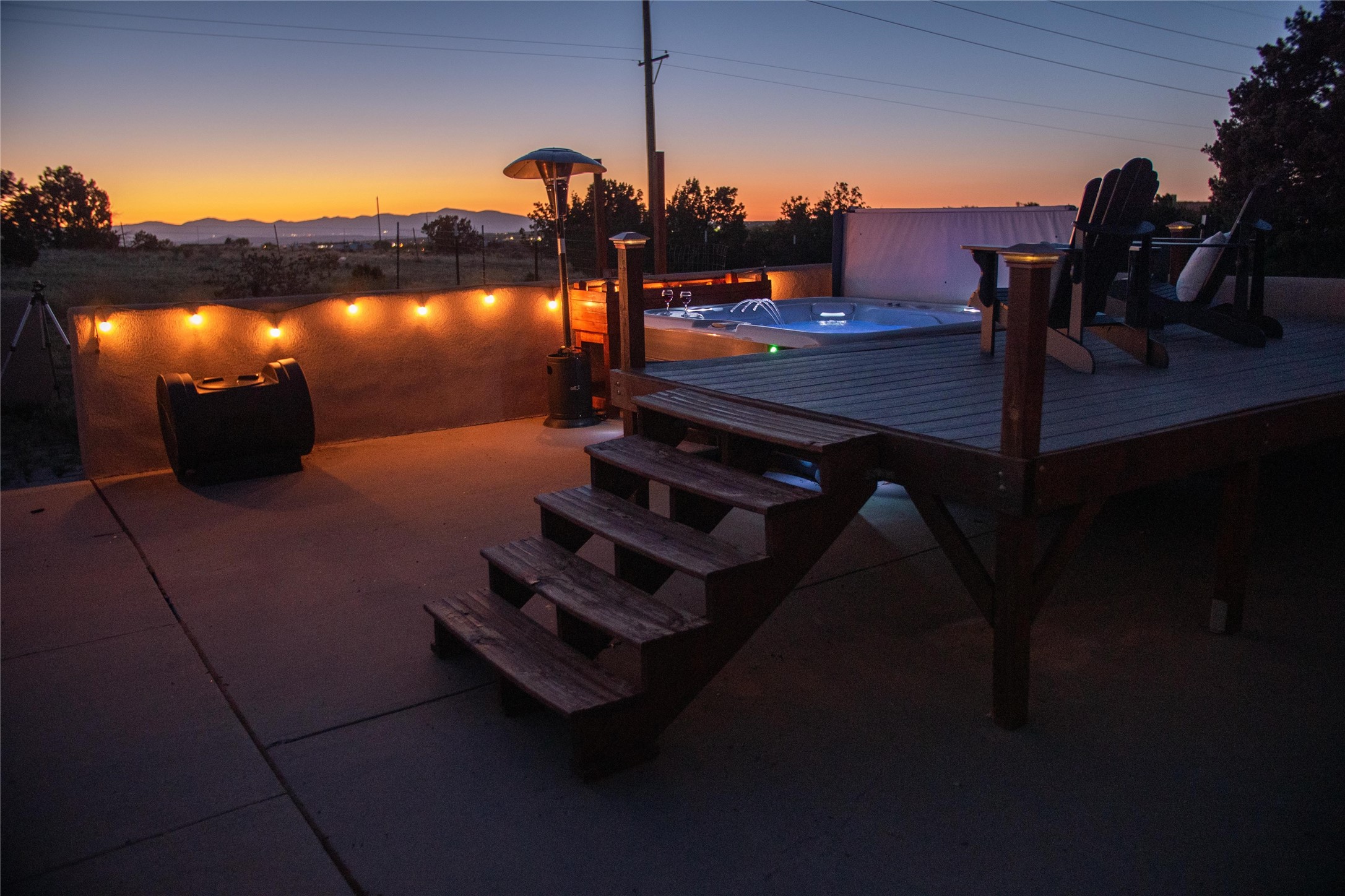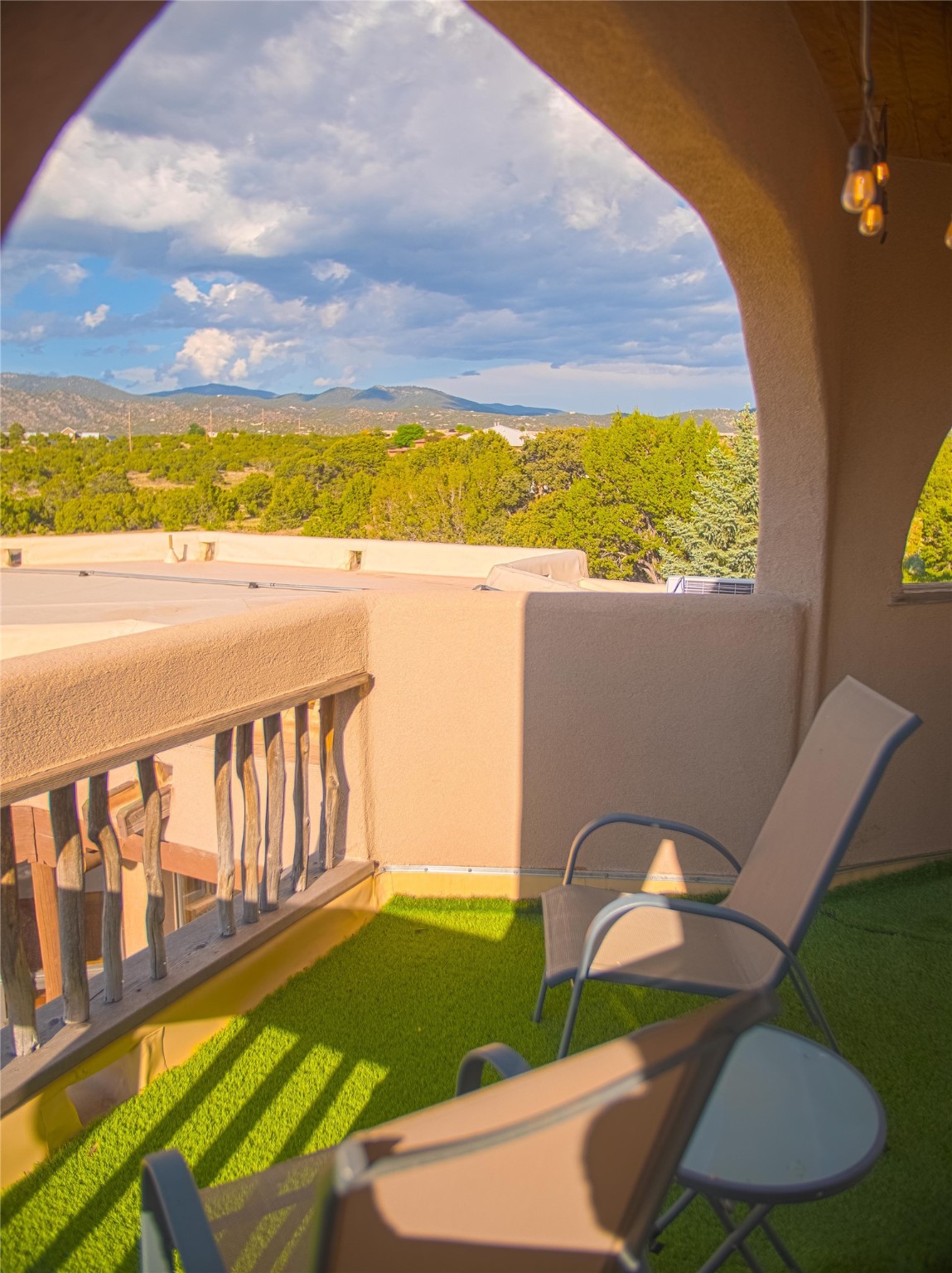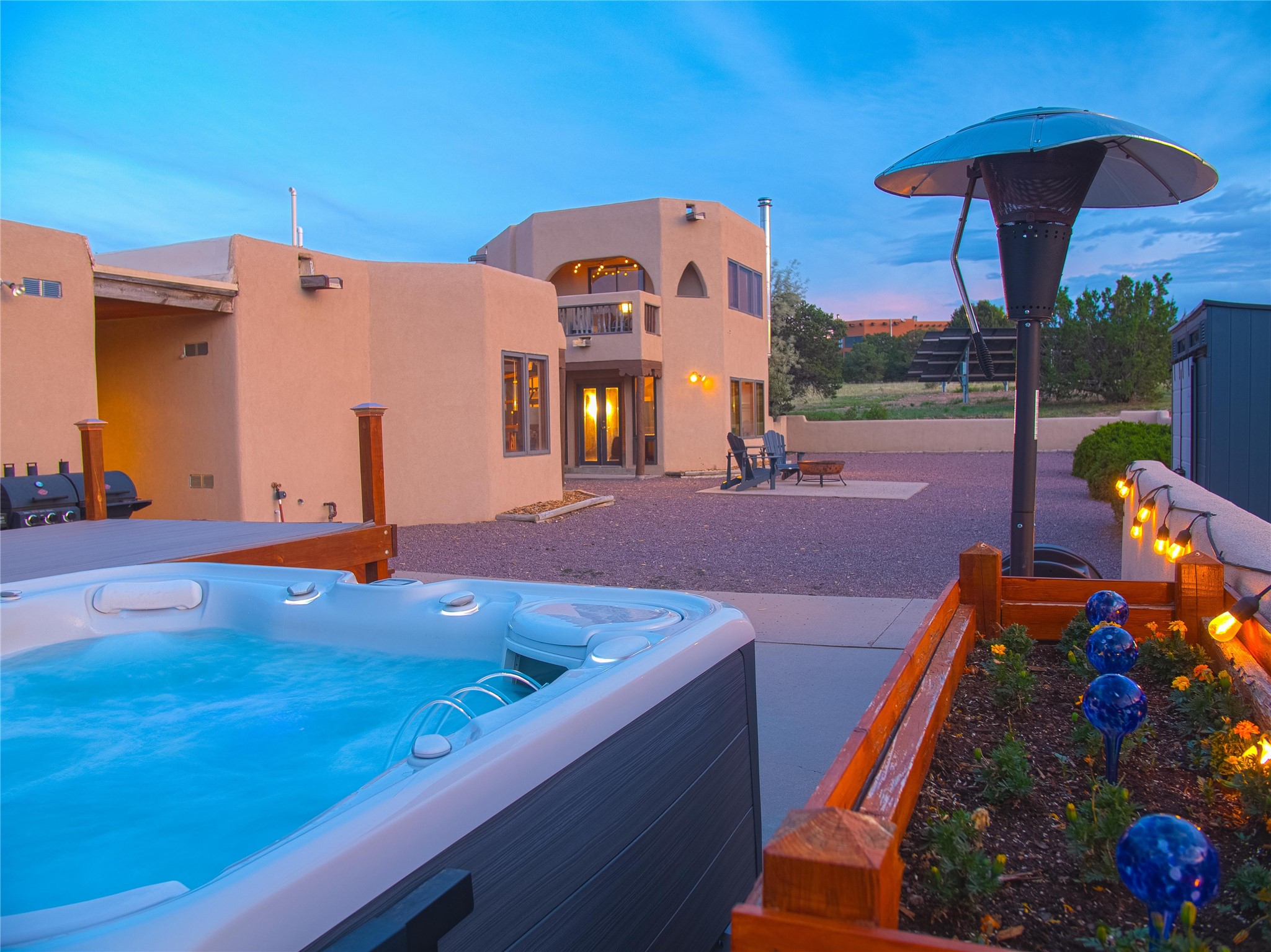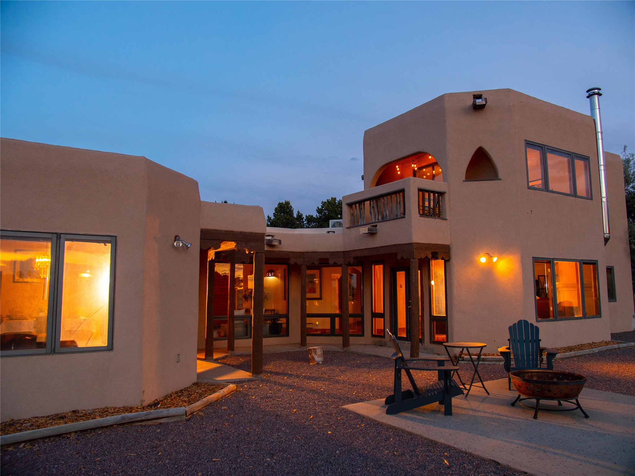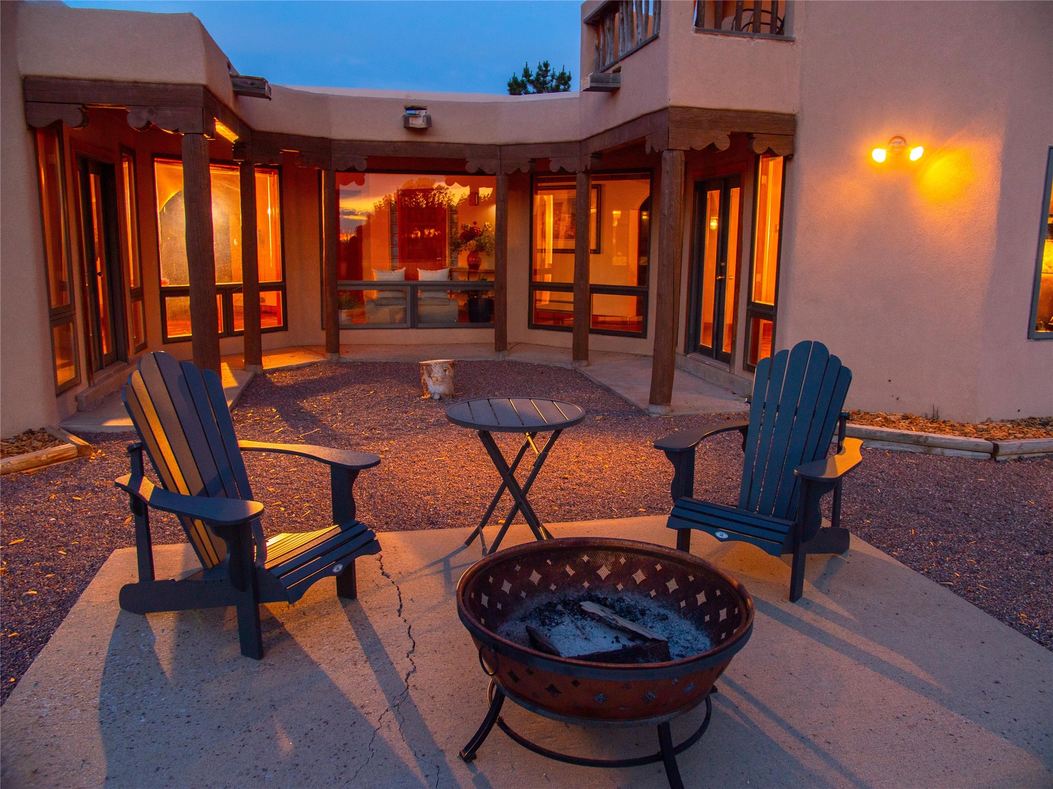 This stunning Santa Fe-style home features saltillo tile, with rustic vigas and charming latilla ceilings downstairs, celebrating the timeless Southwestern aesthetic. Create a culinary delight in the chef's kitchen or cozy up by the warm, inviting fireplace. Unwind in the soothing hot tub while soaking in panoramic views from your expansive lot. This residence is not only visually striking but also environmentally conscious, featuring a solar system with 200 amp service and EV charging capabilities in the garage. Ideally situated close to I-25, it provides an effortless commute to Albuquerque and Los Alamos, making it a perfect sanctuary for those seeking both luxury and convenience.