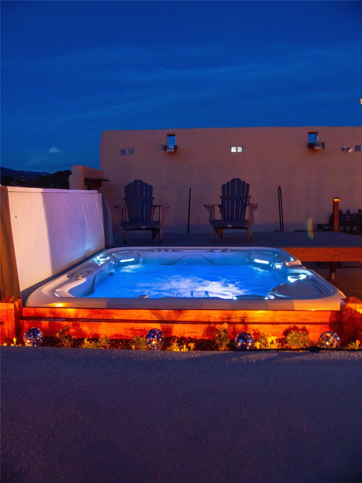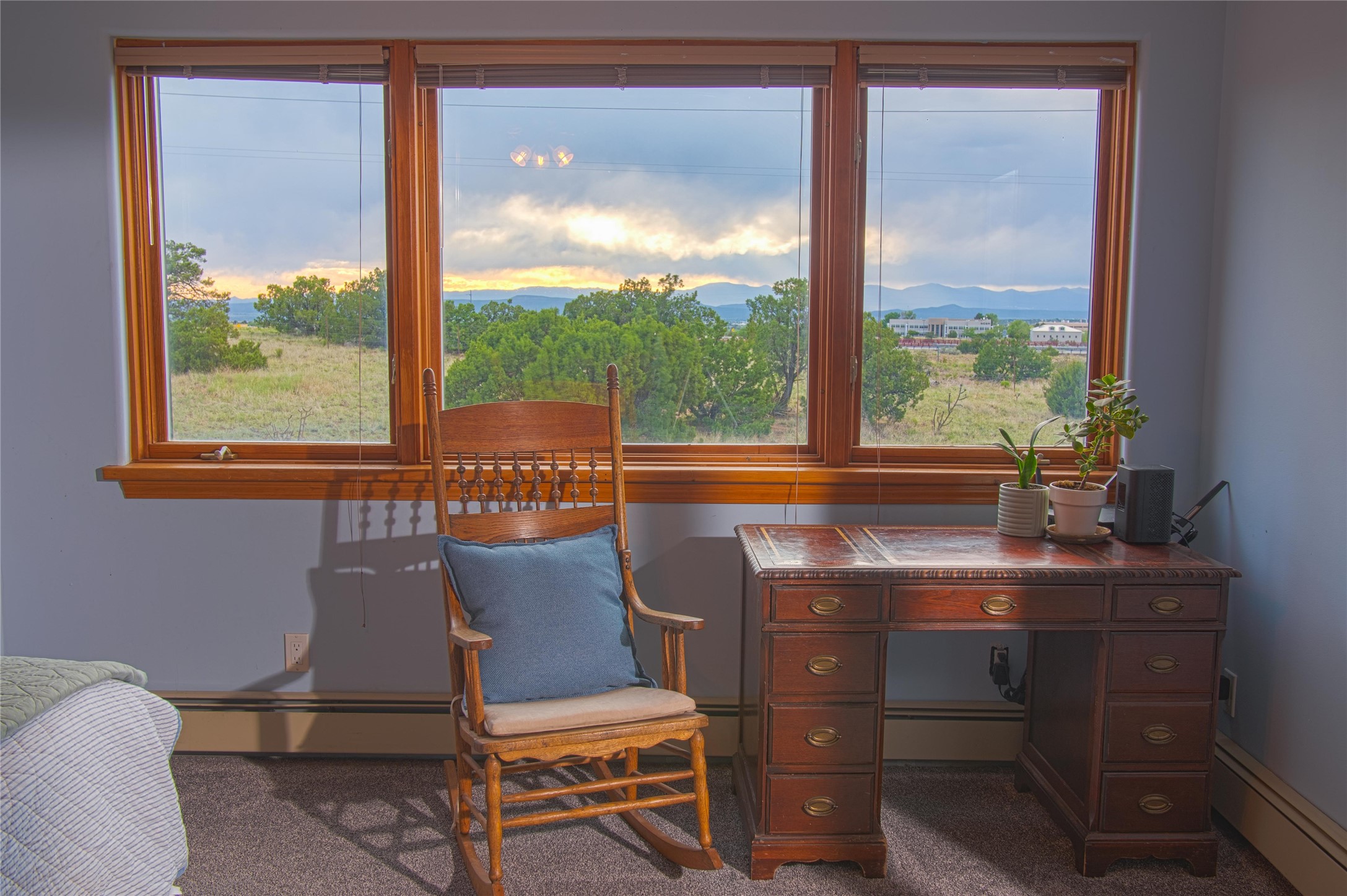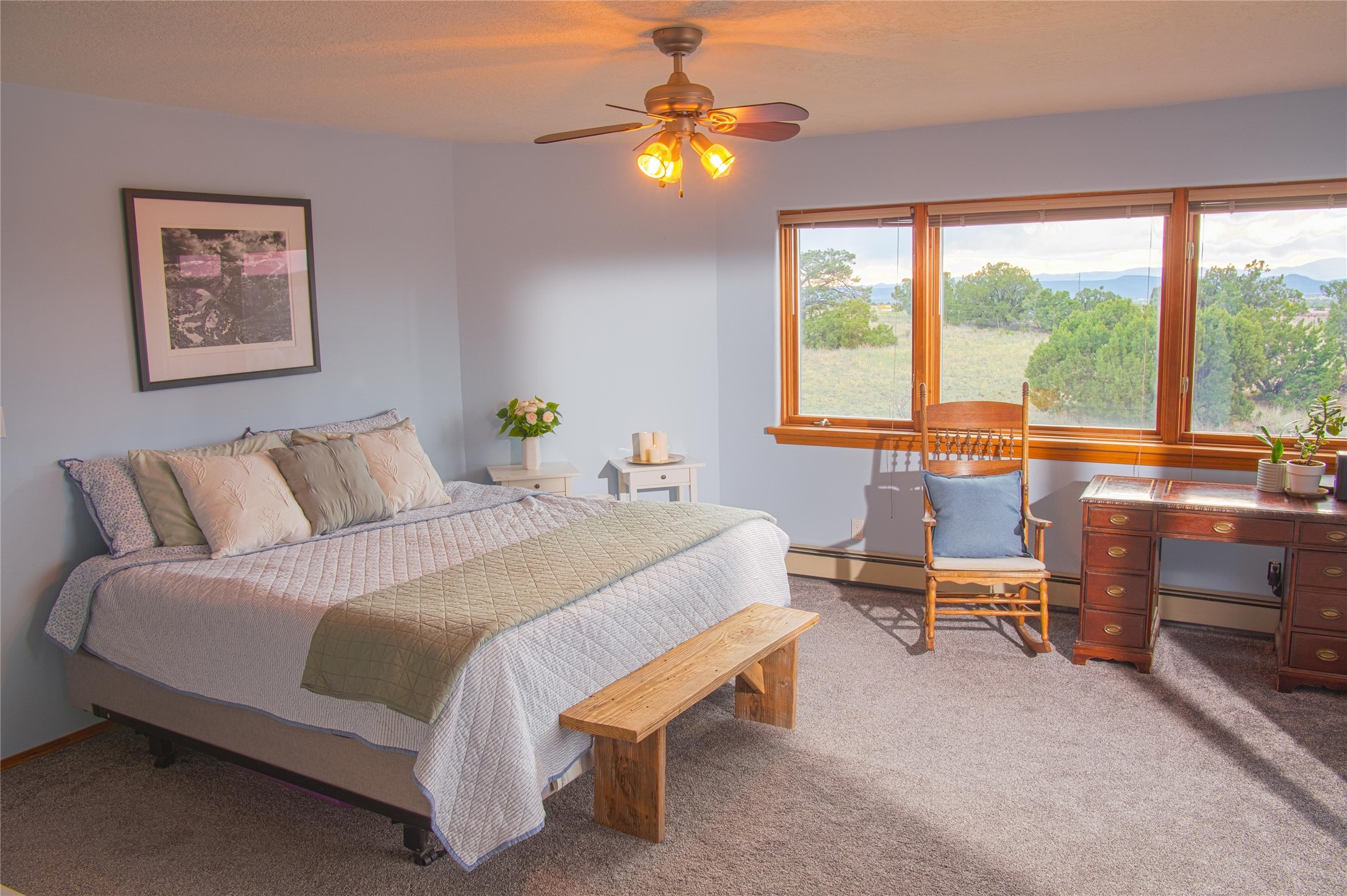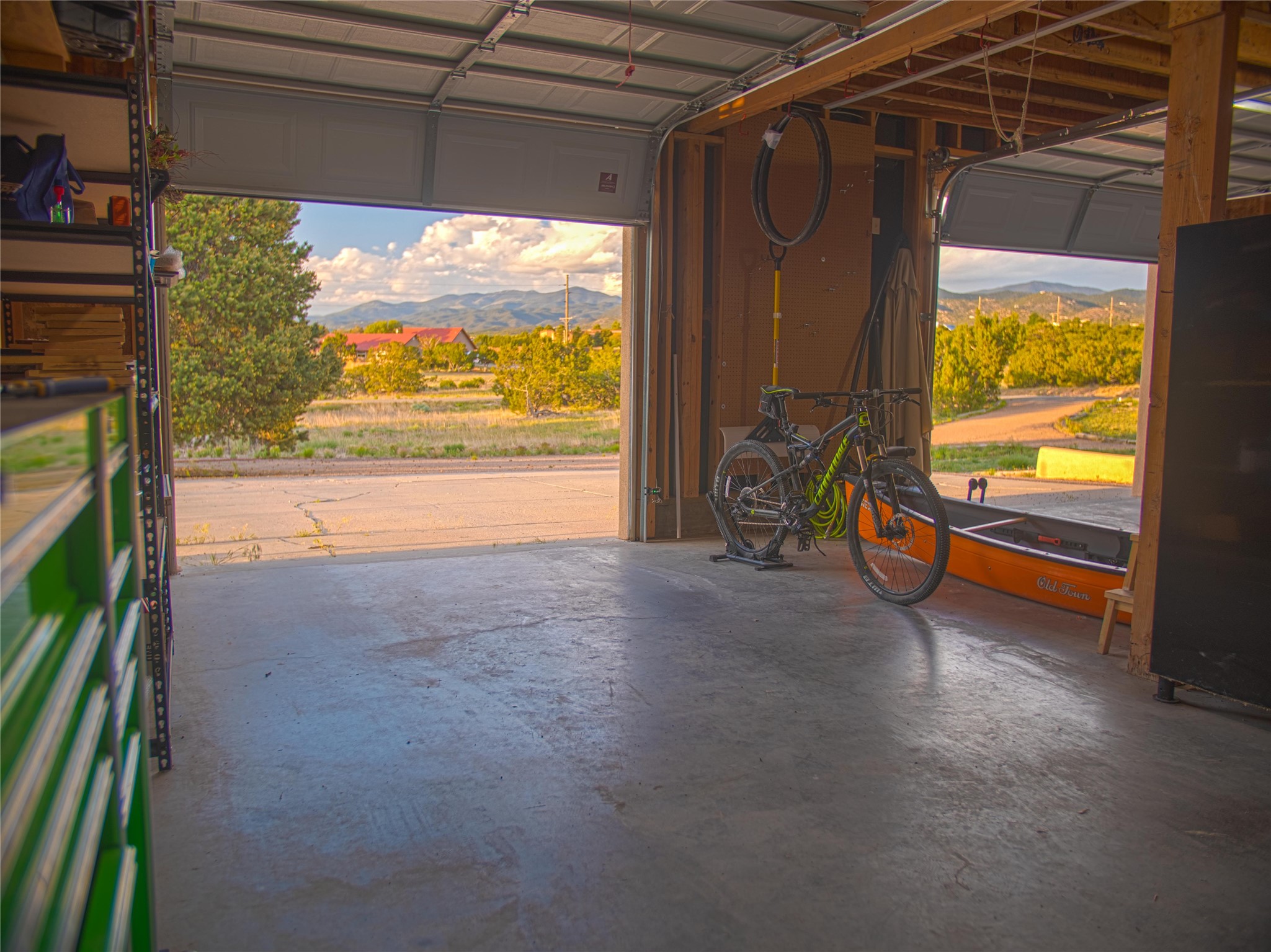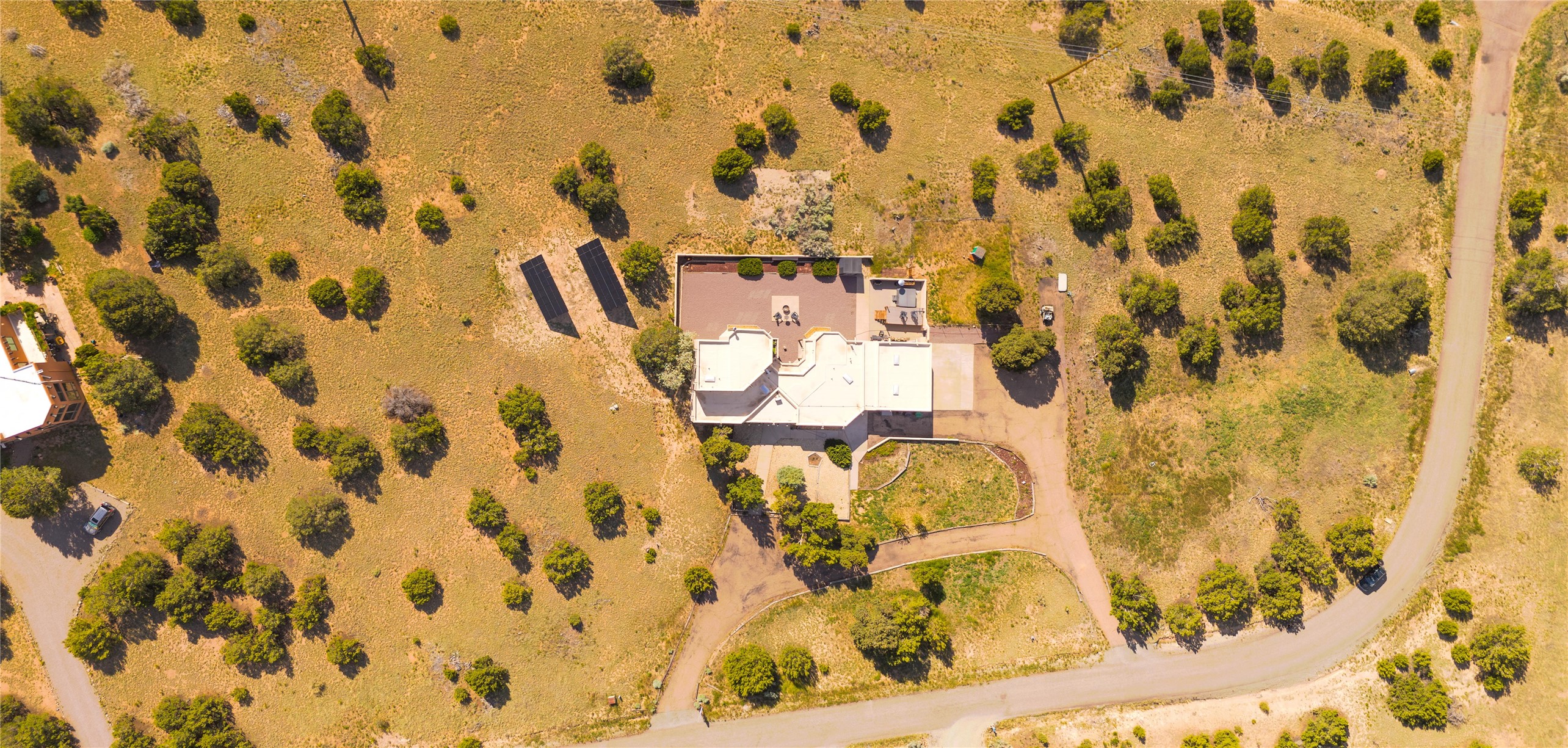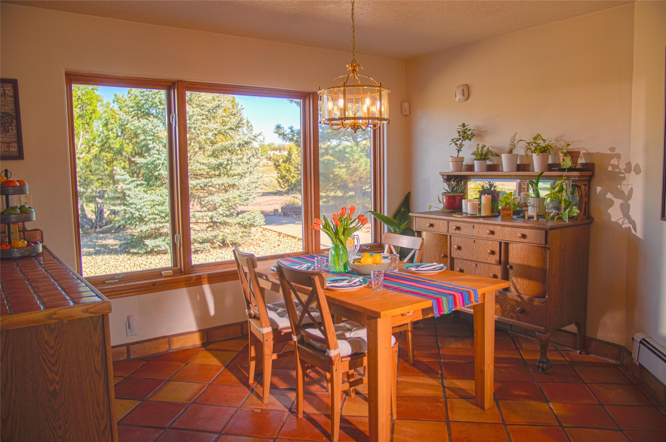 This stunning Santa Fe-style home features saltillo tile, with rustic vigas and charming latilla ceilings downstairs, celebrating the timeless Southwestern aesthetic. Create a culinary delight in the chef's kitchen or cozy up by the warm, inviting fireplace. Unwind in the soothing hot tub while soaking in panoramic views from your expansive lot. This residence is not only visually striking but also environmentally conscious, featuring a solar system with 200 amp service and EV charging capabilities in the garage. Ideally situated close to I-25, it provides an effortless commute to Albuquerque and Los Alamos, making it a perfect sanctuary for those seeking both luxury and convenience.