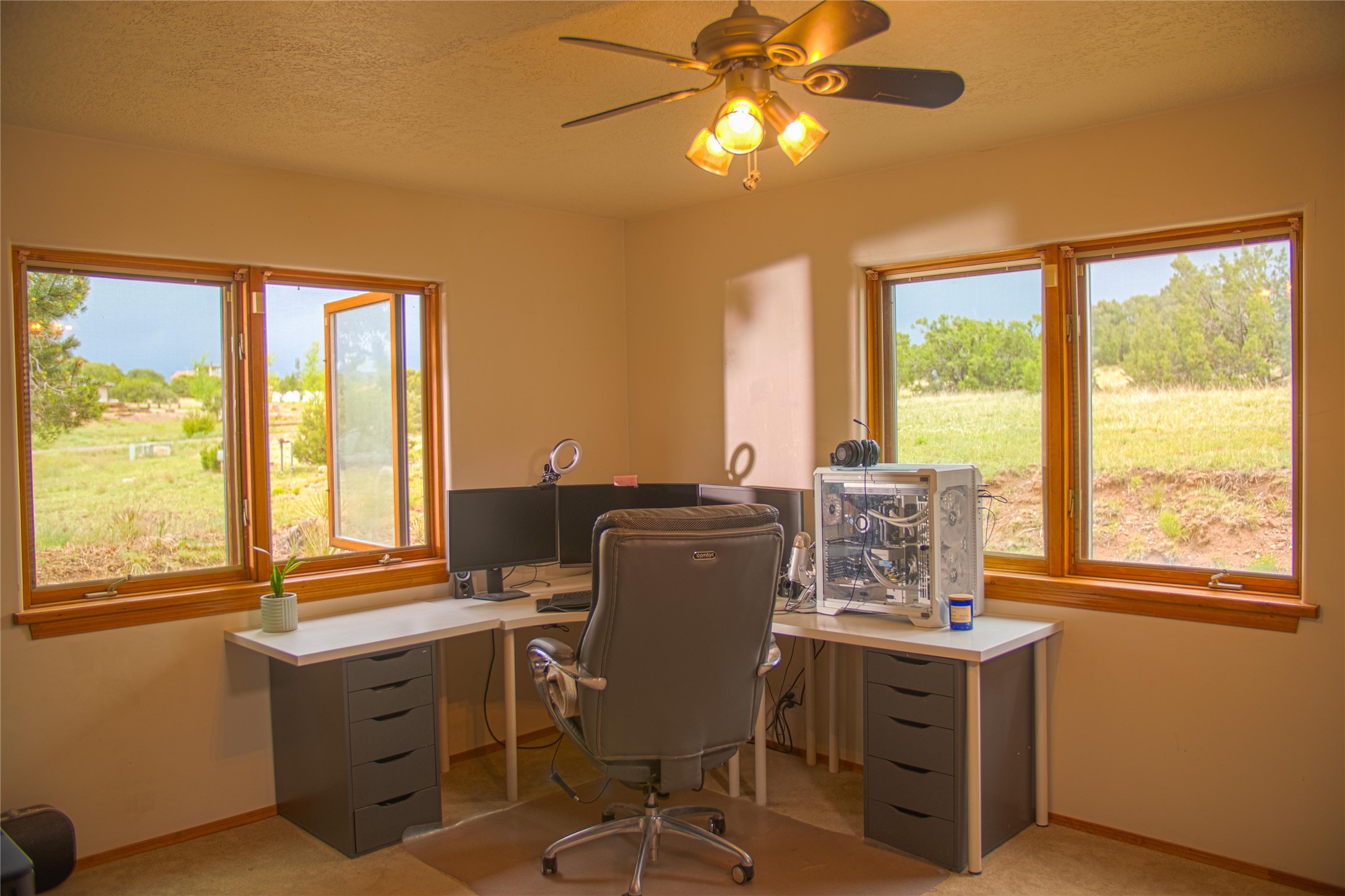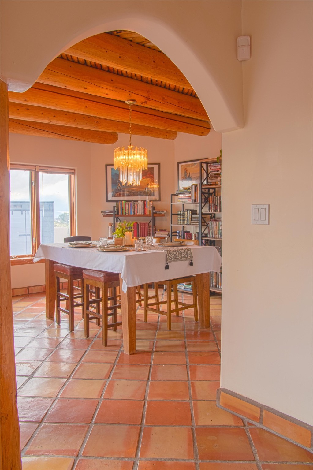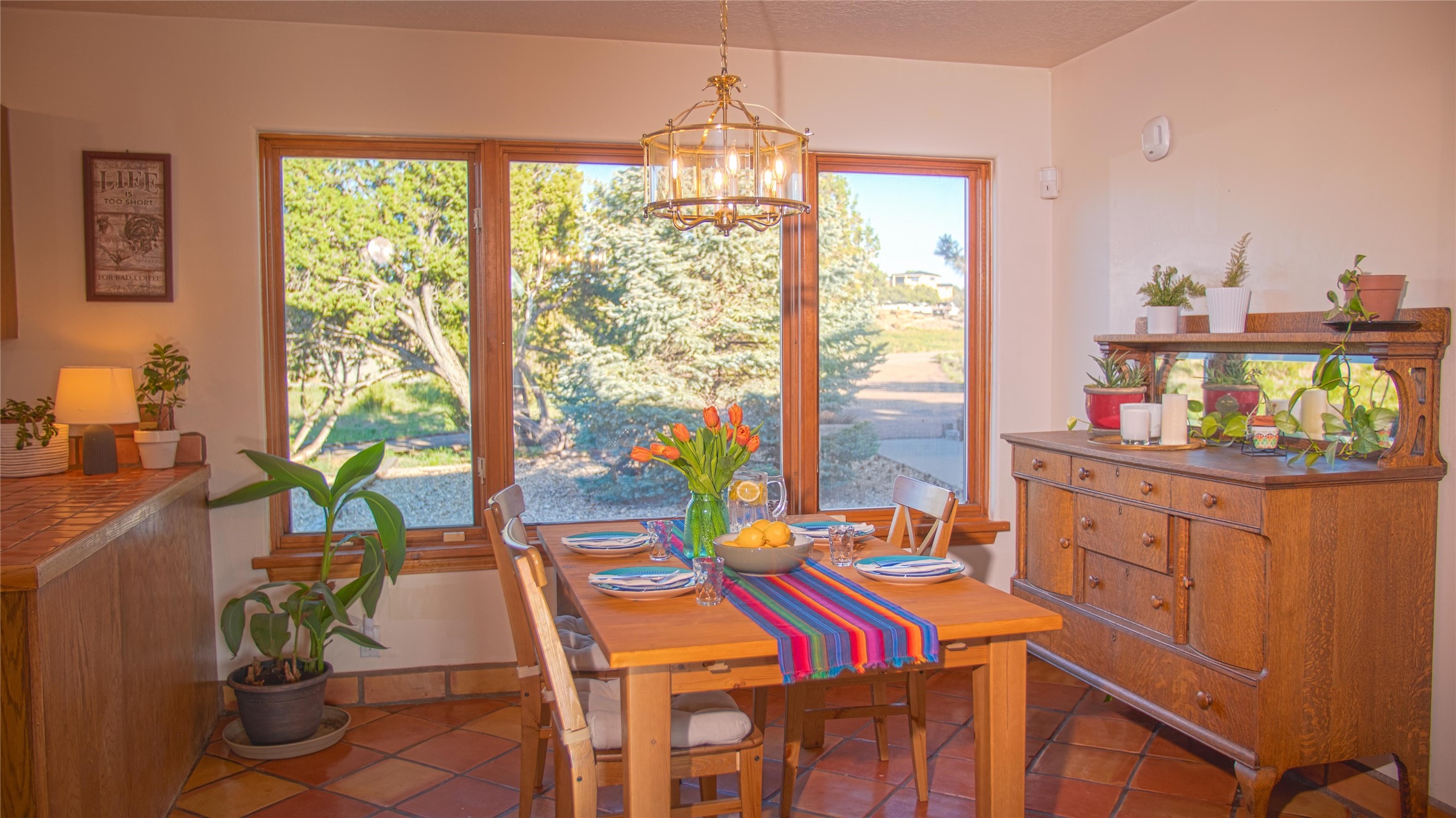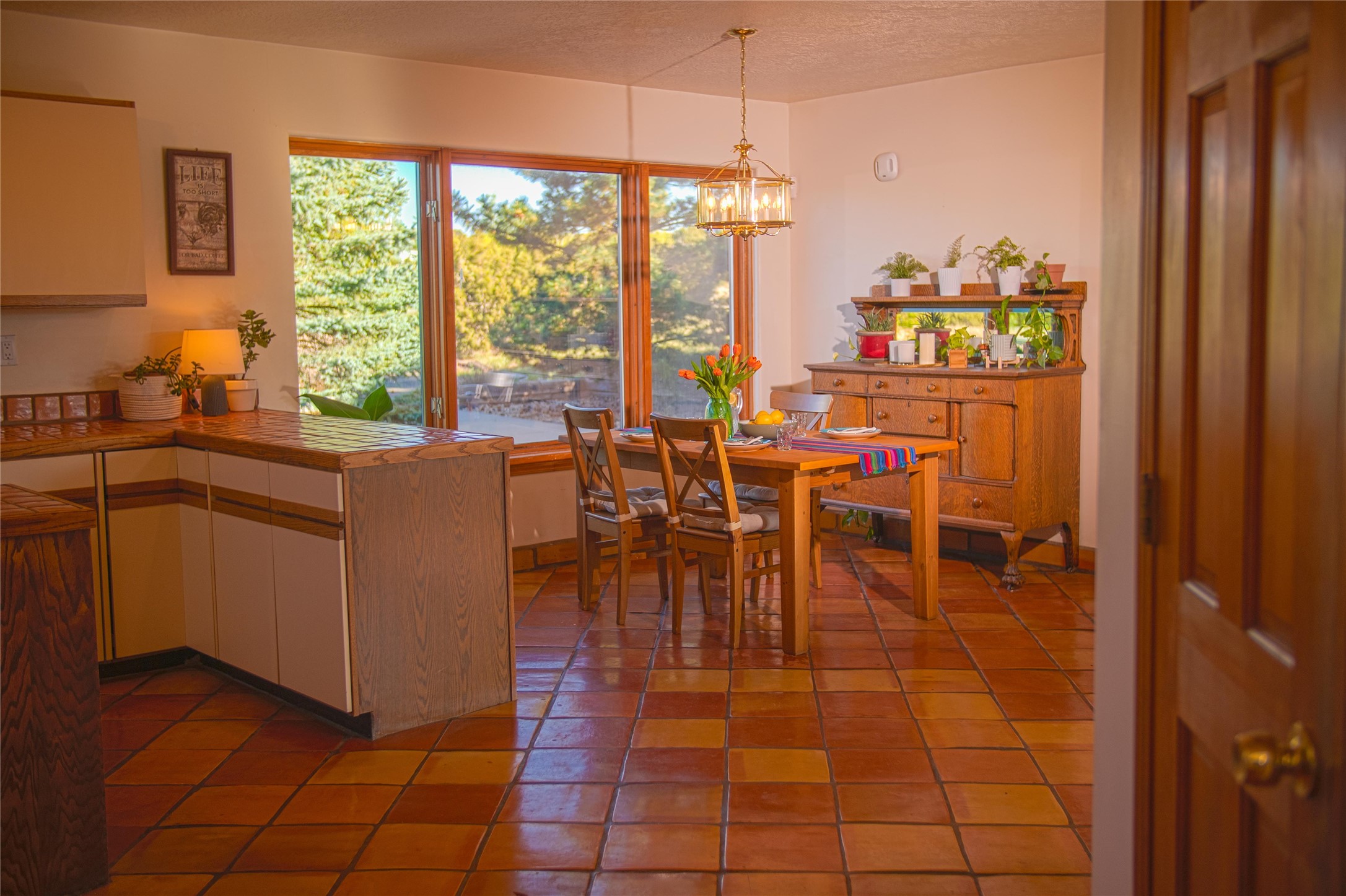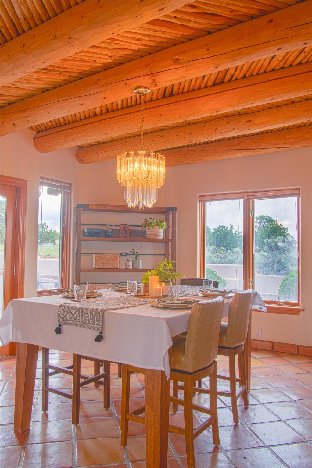 This stunning Santa Fe-style home features saltillo tile, with rustic vigas and charming latilla ceilings downstairs, celebrating the timeless Southwestern aesthetic. Create a culinary delight in the chef's kitchen or cozy up by the warm, inviting fireplace. Unwind in the soothing hot tub while soaking in panoramic views from your expansive lot. This residence is not only visually striking but also environmentally conscious, featuring a solar system with 200 amp service and EV charging capabilities in the garage. Ideally situated close to I-25, it provides an effortless commute to Albuquerque and Los Alamos, making it a perfect sanctuary for those seeking both luxury and convenience.