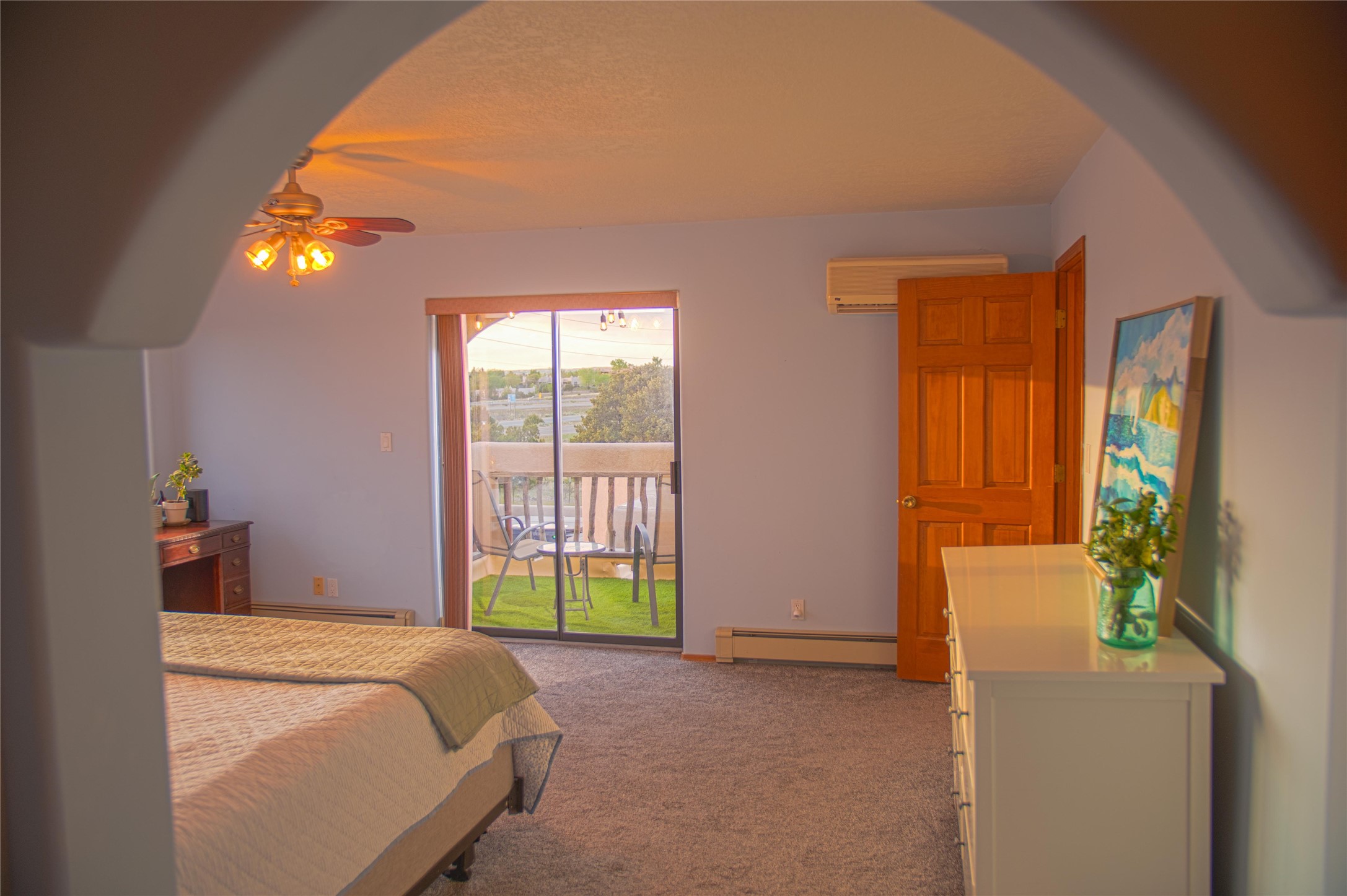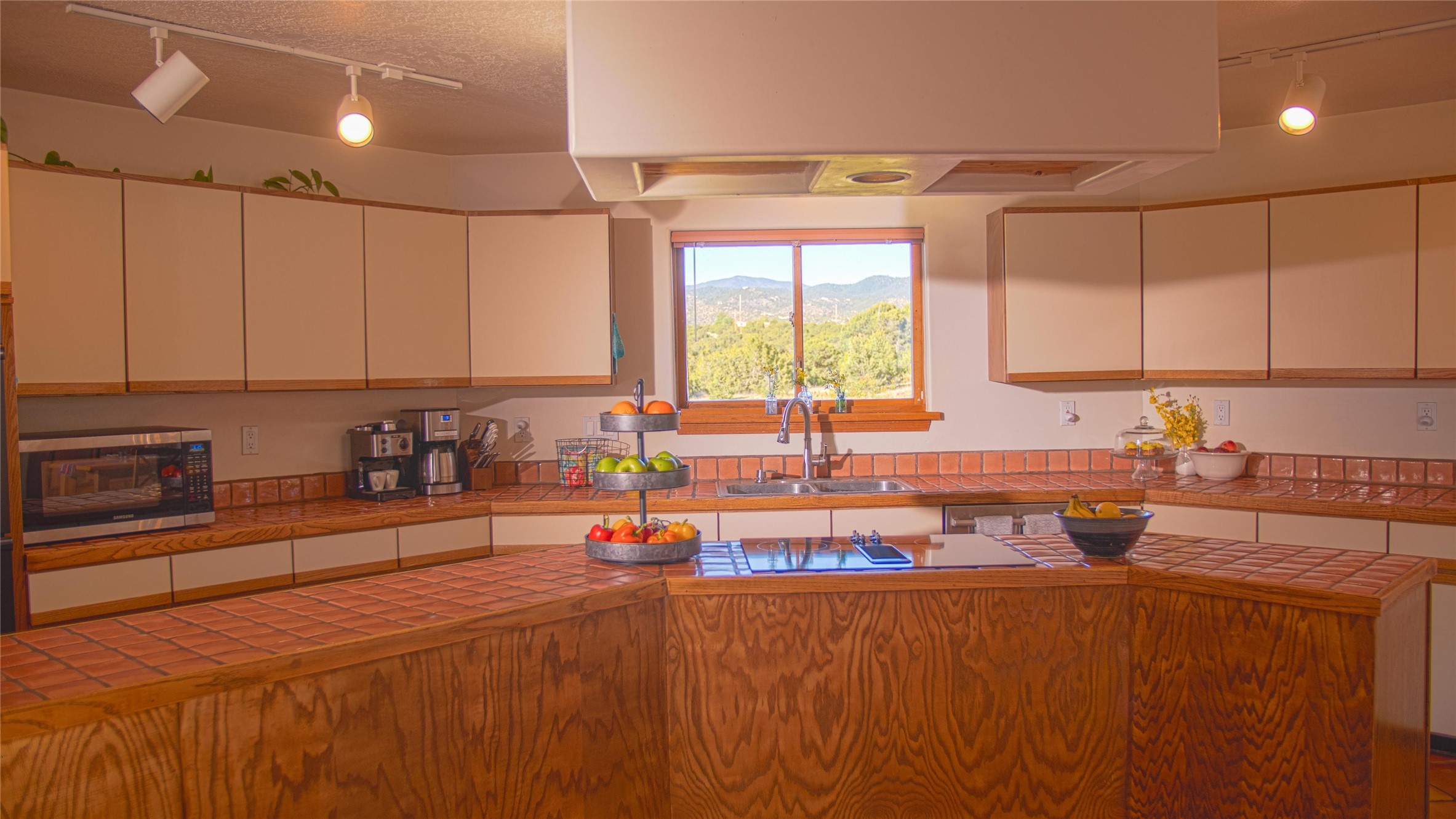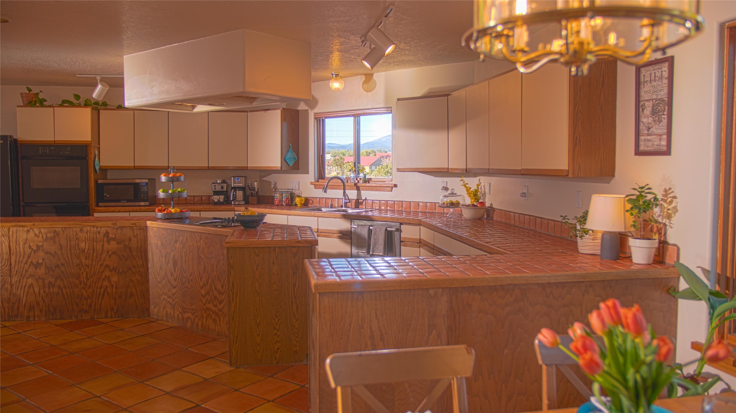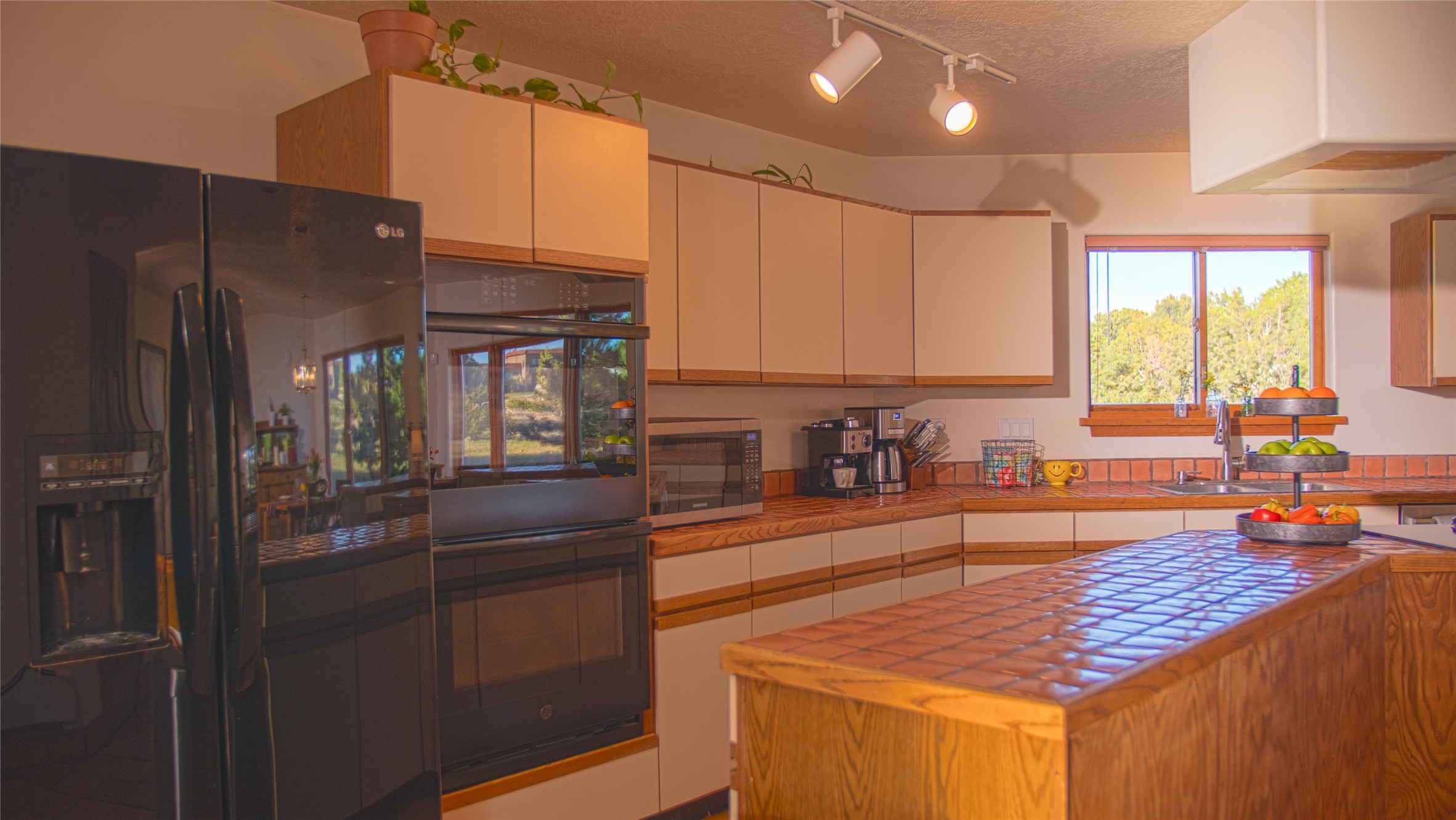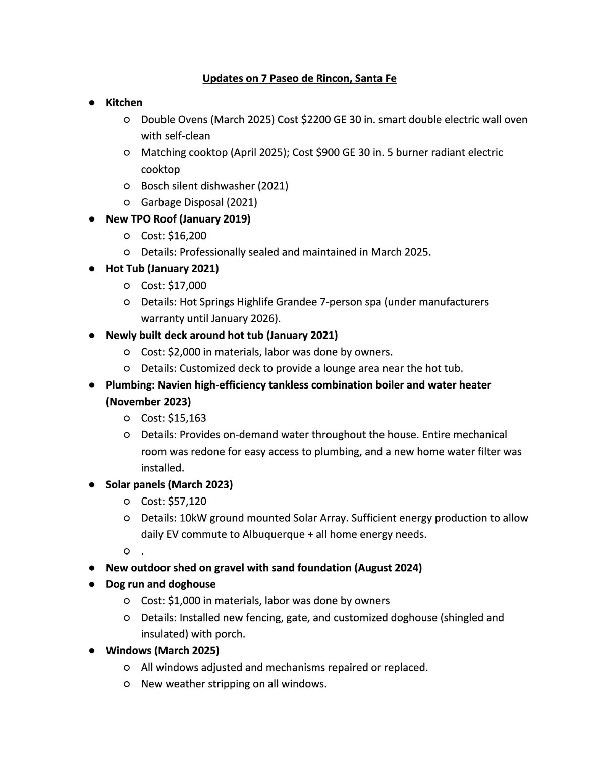This stunning Santa Fe-style home features saltillo tile, with rustic vigas and charming latilla ceilings downstairs, celebrating the timeless Southwestern aesthetic. Create a culinary delight in the chef's kitchen or cozy up by the warm, inviting fireplace. Unwind in the soothing hot tub while soaking in panoramic views from your expansive lot. This residence is not only visually striking but also environmentally conscious, featuring a solar system with 200 amp service and EV charging capabilities in the garage. Ideally situated close to I-25, it provides an effortless commute to Albuquerque and Los Alamos, making it a perfect sanctuary for those seeking both luxury and convenience.