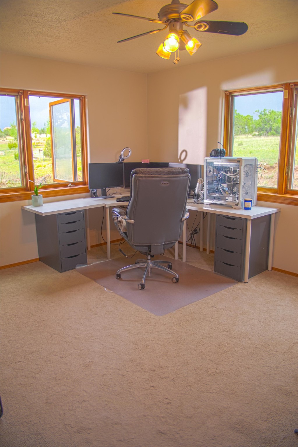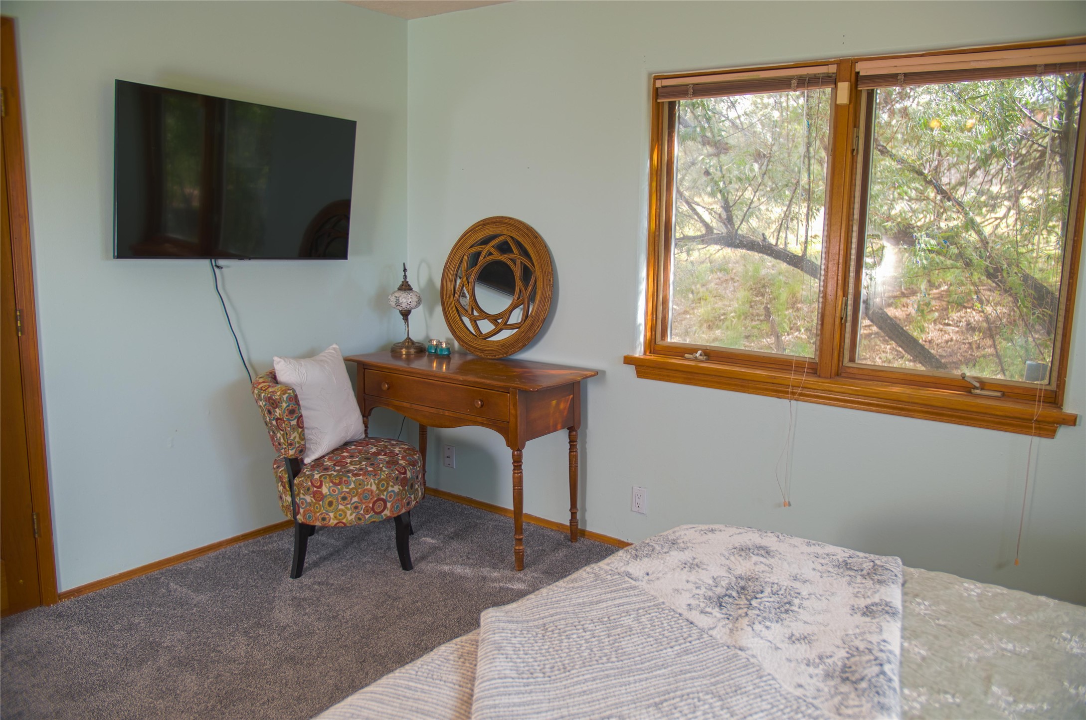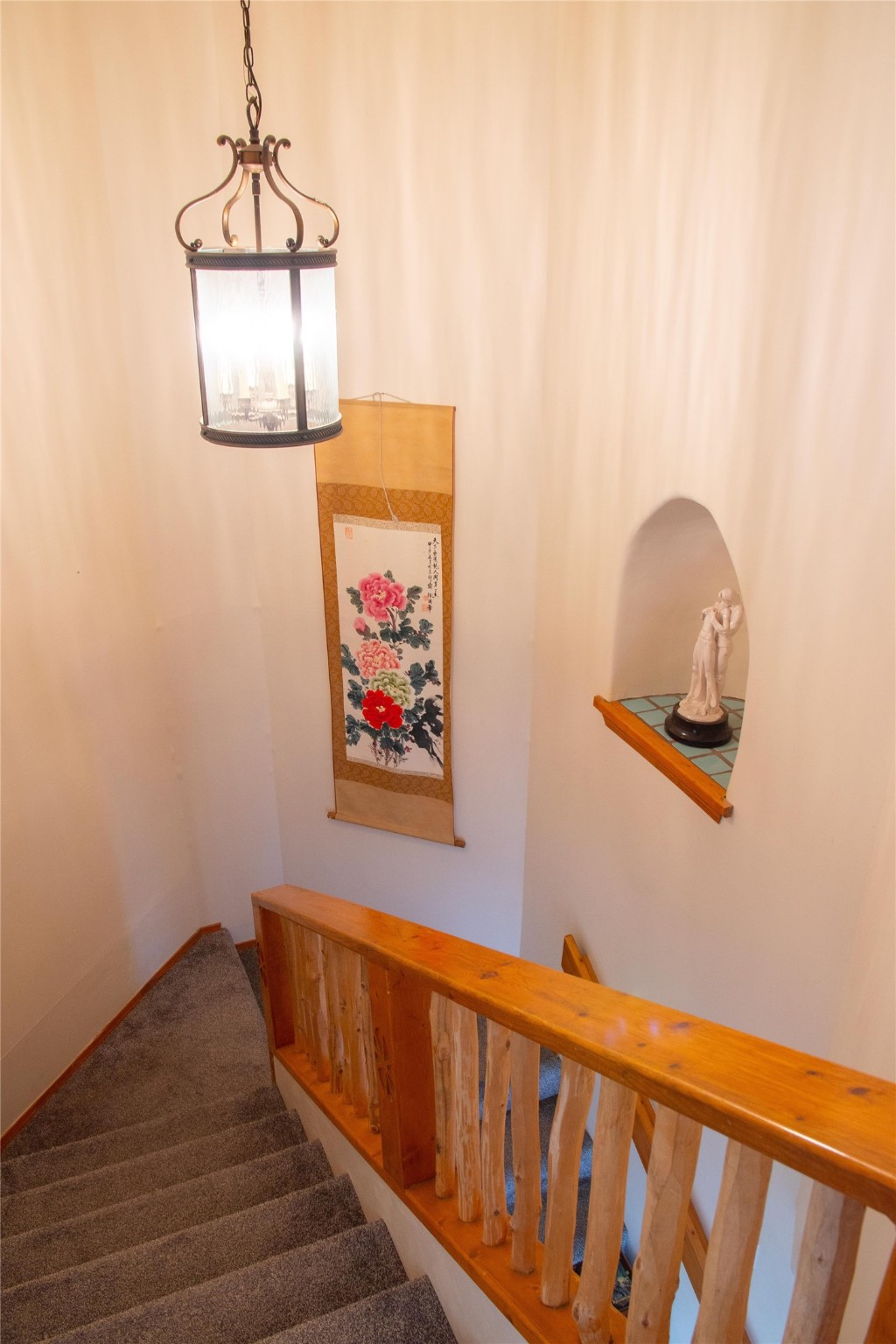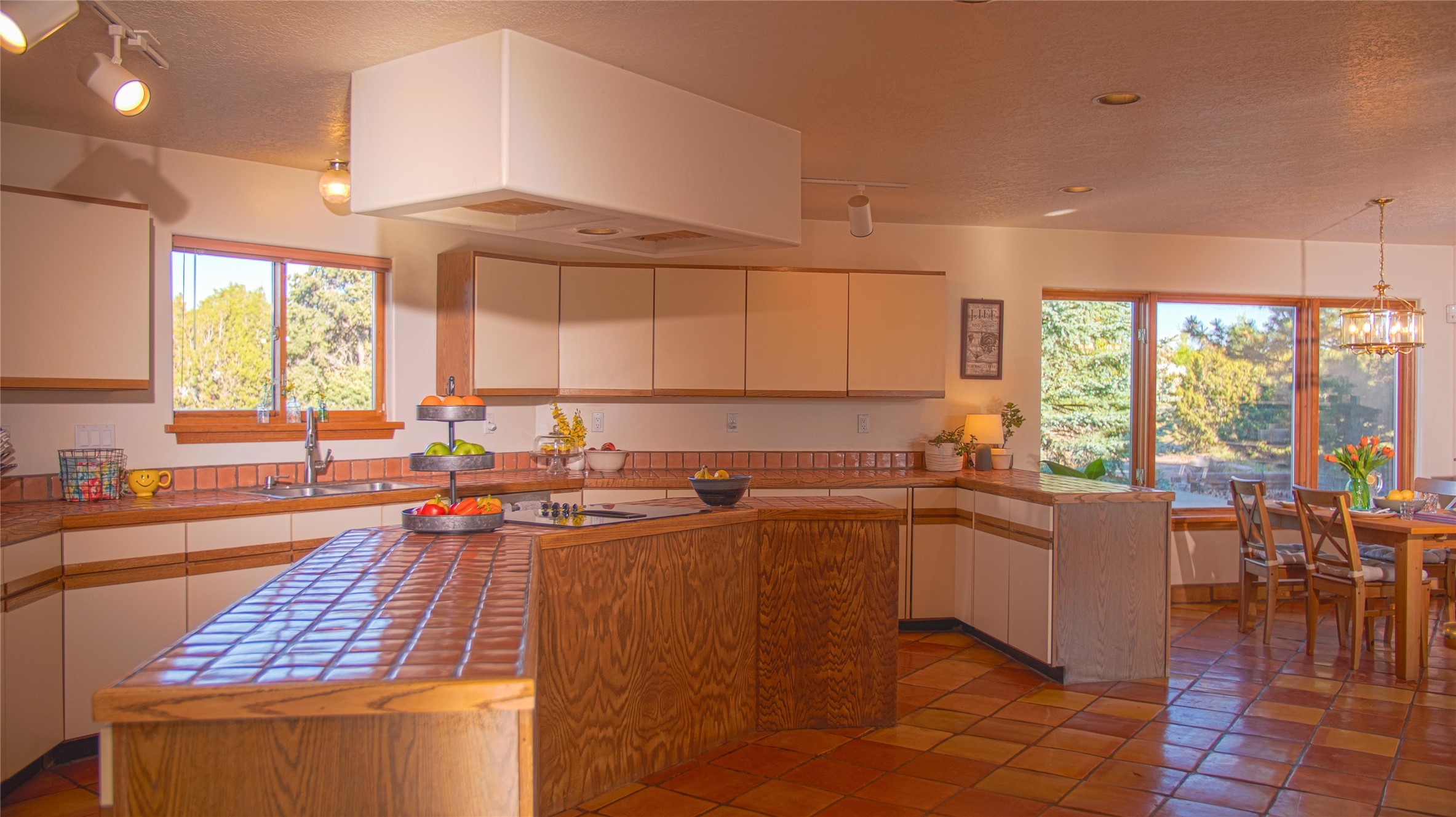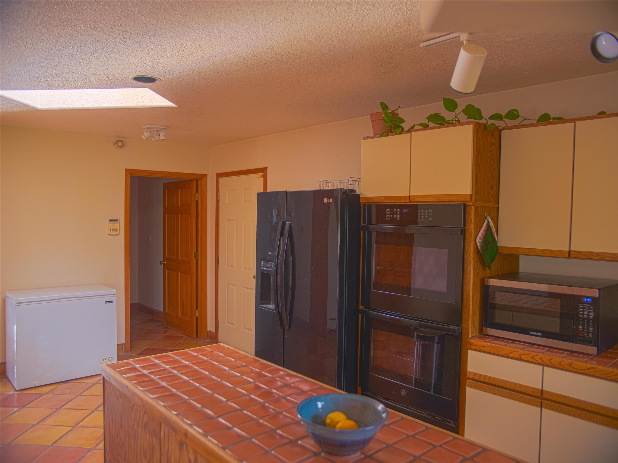 This stunning Santa Fe-style home features saltillo tile, with rustic vigas and charming latilla ceilings downstairs, celebrating the timeless Southwestern aesthetic. Create a culinary delight in the chef's kitchen or cozy up by the warm, inviting fireplace. Unwind in the soothing hot tub while soaking in panoramic views from your expansive lot. This residence is not only visually striking but also environmentally conscious, featuring a solar system with 200 amp service and EV charging capabilities in the garage. Ideally situated close to I-25, it provides an effortless commute to Albuquerque and Los Alamos, making it a perfect sanctuary for those seeking both luxury and convenience.