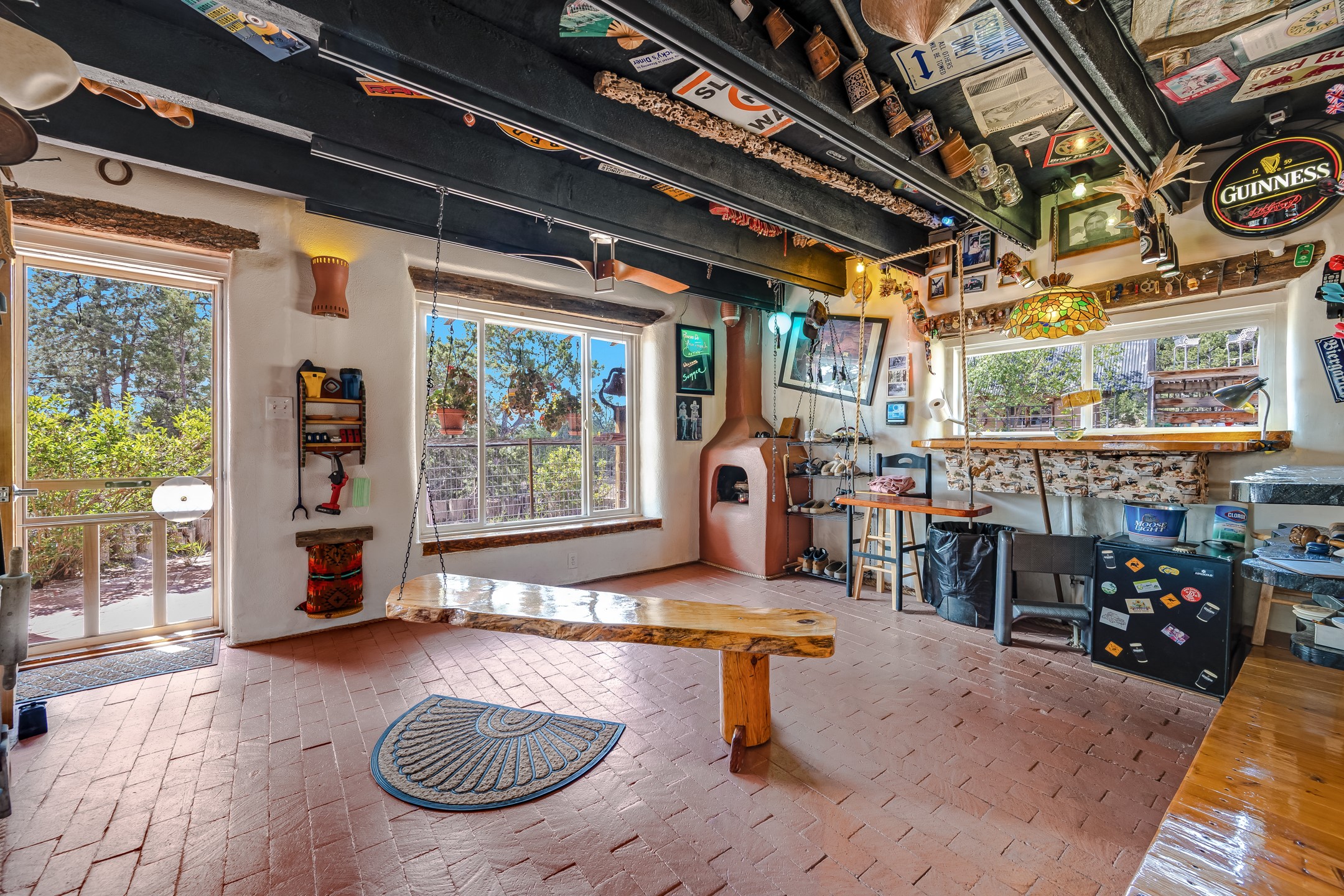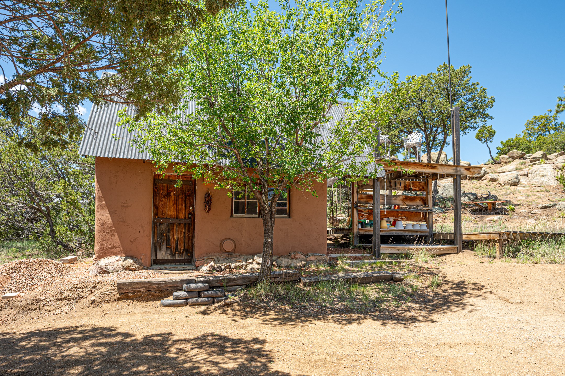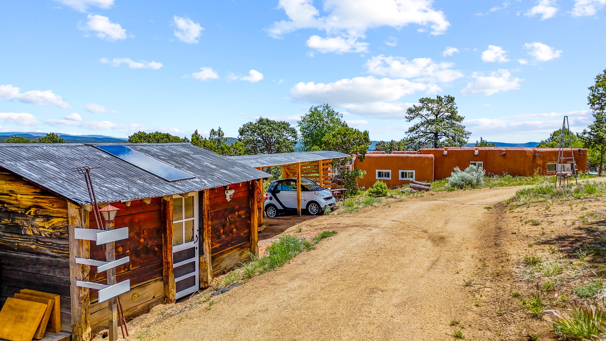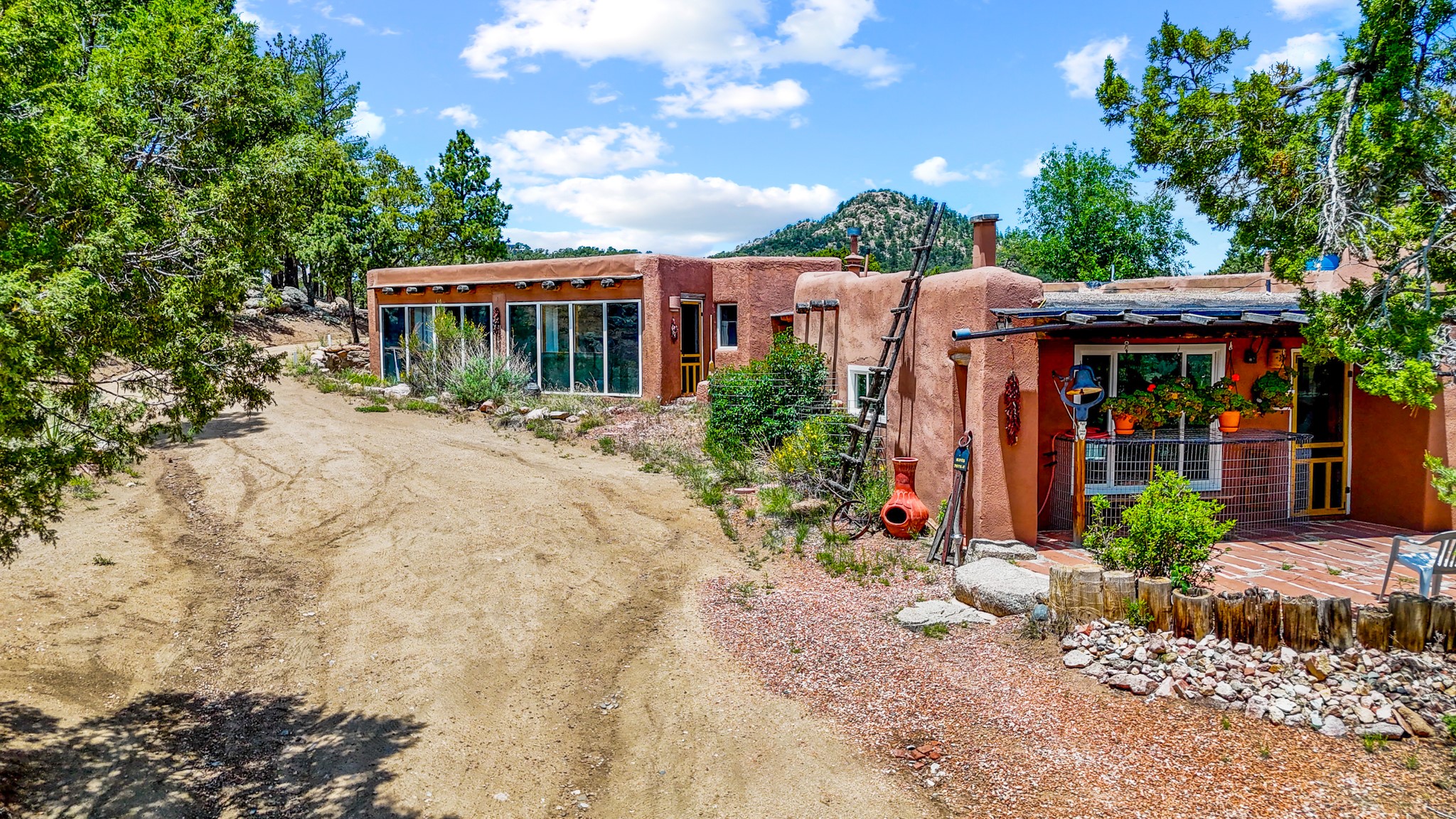 Set on 10 serene acres on the Old Santa Fe Trail and with striking mountain views, this unique 2-bedroom, 2.5-bath home offers space, versatility, and charm. Thoughtfully designed with high ceilings, custom woodwork, wood-burning fireplaces, and windows to capture the high desert terrain and fill the interiors with natural light, the open-concept living, kitchen, and dining areas create an inviting atmosphere. Additional workspace has been created with a built-ins and the bar/game room is sure to house many a fun night. The layout allows for an easy division into two one-bedroom units, presenting excellent rental income opportunities. Enjoy a peaceful lifestyle with whimsical gardens, a vibrant bar room, and a detached studio perfect for creative pursuits. A workshop with tools and a carport add function and value. The property features a private well, septic system, and can be divided into two 5-acre parcels for added potential. Located near Santa Fe's rail station, shopping at The Agora, and cultural destinations like Santa Fe Plaza only minutes away, this home blends rural tranquility with access to urban amenities--ideal for both full-time living or a flexible investment. **Details as provided by Sellers. See additional information in Broker Remarks and attached documents.