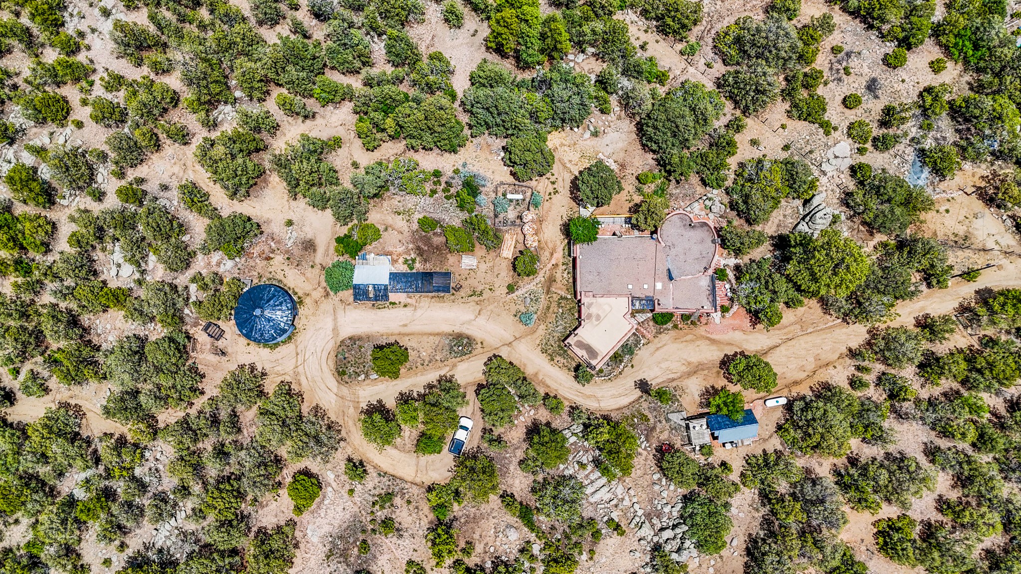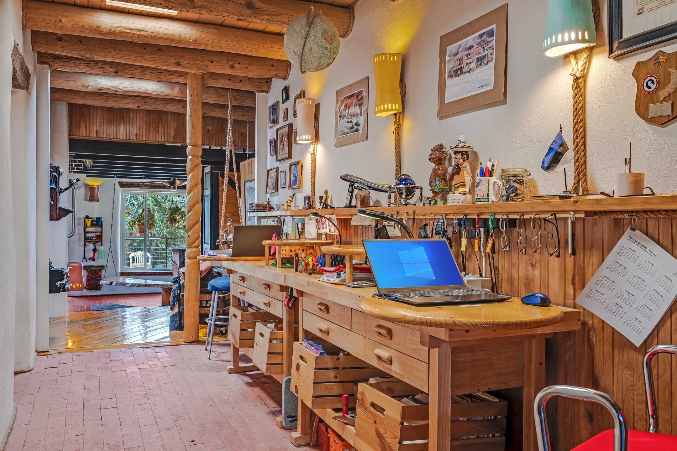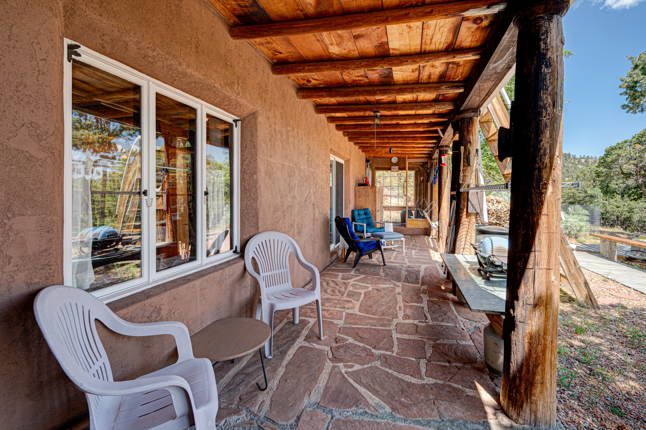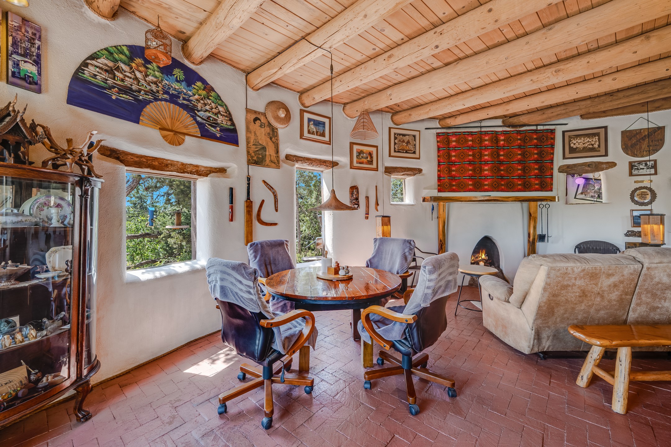 Set on 10 serene acres on the Old Santa Fe Trail and with striking mountain views, this unique 2-bedroom, 2.5-bath home offers space, versatility, and charm. Thoughtfully designed with high ceilings, custom woodwork, wood-burning fireplaces, and windows to capture the high desert terrain and fill the interiors with natural light, the open-concept living, kitchen, and dining areas create an inviting atmosphere. Additional workspace has been created with a built-ins and the bar/game room is sure to house many a fun night. The layout allows for an easy division into two one-bedroom units, presenting excellent rental income opportunities. Enjoy a peaceful lifestyle with whimsical gardens, a vibrant bar room, and a detached studio perfect for creative pursuits. A workshop with tools and a carport add function and value. The property features a private well, septic system, and can be divided into two 5-acre parcels for added potential. Located near Santa Fe's rail station, shopping at The Agora, and cultural destinations like Santa Fe Plaza only minutes away, this home blends rural tranquility with access to urban amenities--ideal for both full-time living or a flexible investment. **Details as provided by Sellers. See additional information in Broker Remarks and attached documents.