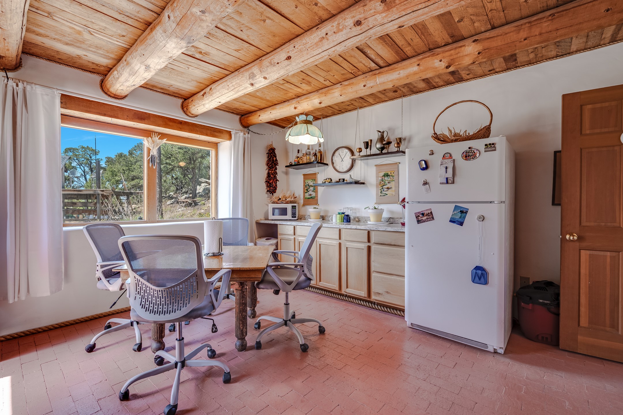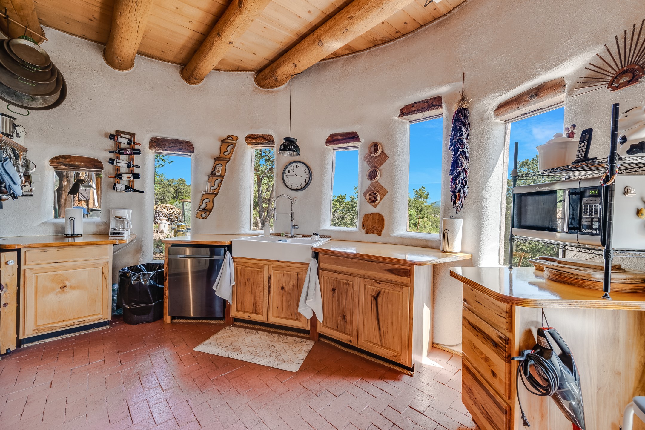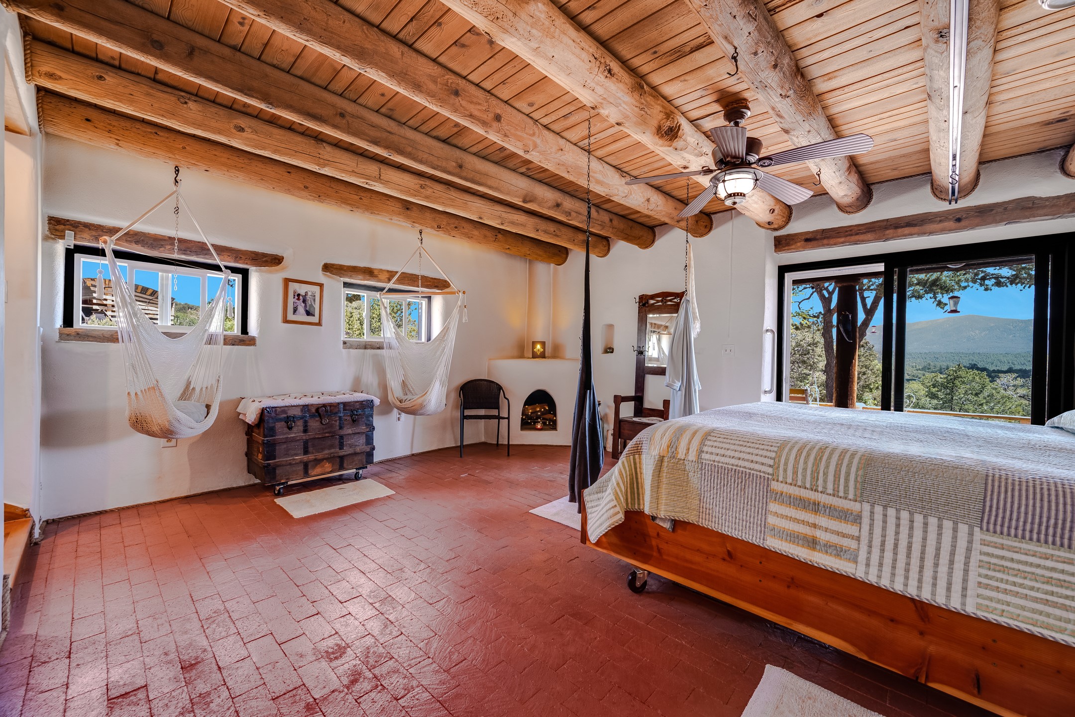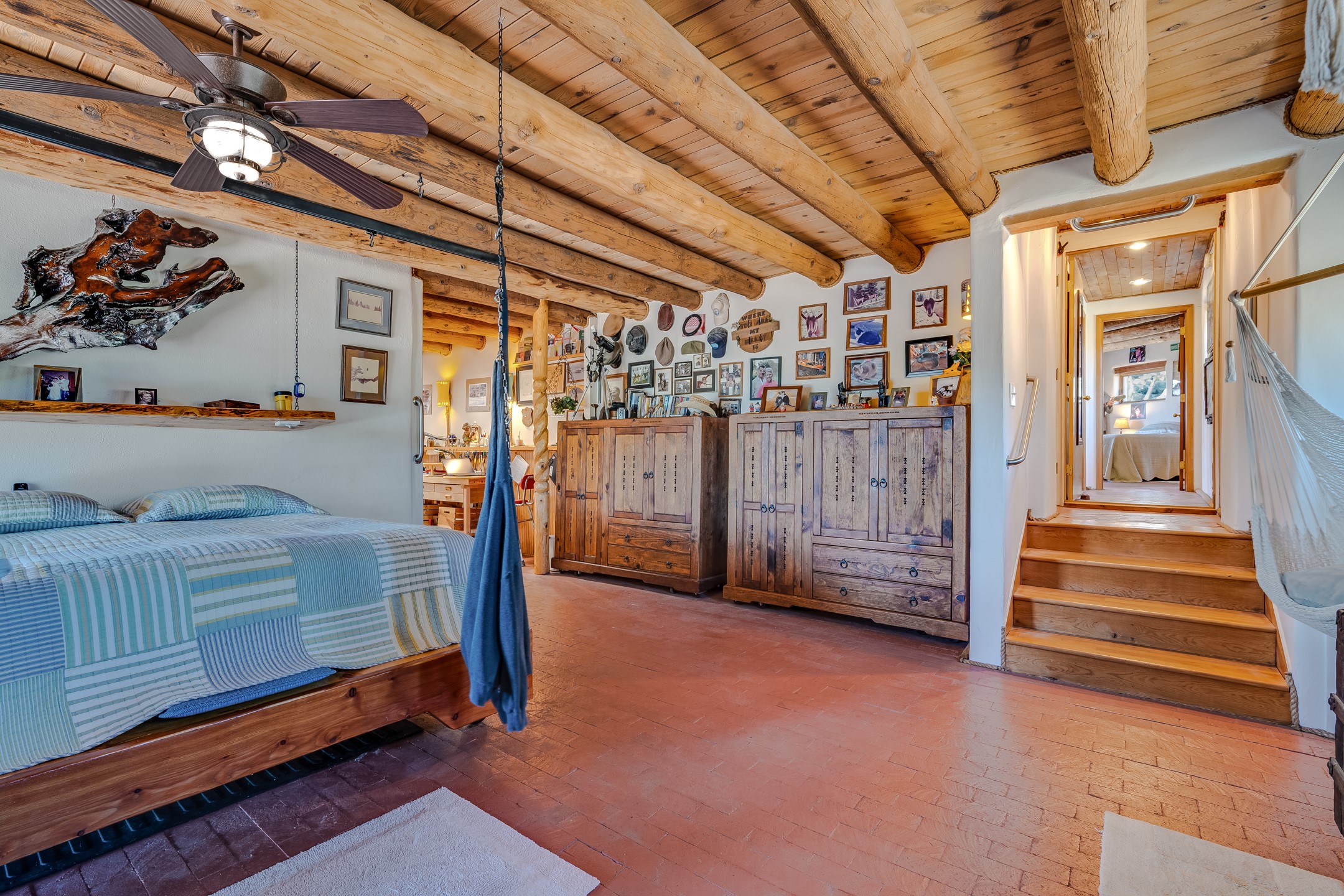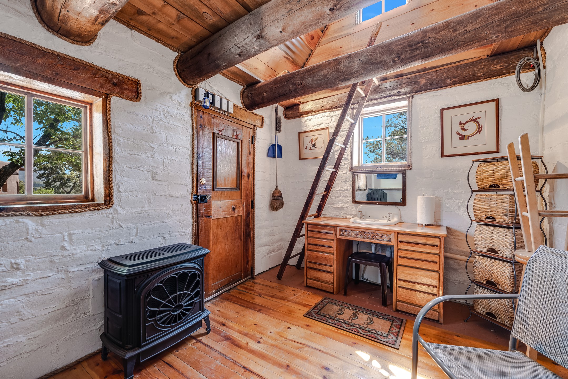 Set on 10 serene acres on the Old Santa Fe Trail and with striking mountain views, this unique 2-bedroom, 2.5-bath home offers space, versatility, and charm. Thoughtfully designed with high ceilings, custom woodwork, wood-burning fireplaces, and windows to capture the high desert terrain and fill the interiors with natural light, the open-concept living, kitchen, and dining areas create an inviting atmosphere. Additional workspace has been created with a built-ins and the bar/game room is sure to house many a fun night. The layout allows for an easy division into two one-bedroom units, presenting excellent rental income opportunities. Enjoy a peaceful lifestyle with whimsical gardens, a vibrant bar room, and a detached studio perfect for creative pursuits. A workshop with tools and a carport add function and value. The property features a private well, septic system, and can be divided into two 5-acre parcels for added potential. Located near Santa Fe's rail station, shopping at The Agora, and cultural destinations like Santa Fe Plaza only minutes away, this home blends rural tranquility with access to urban amenities--ideal for both full-time living or a flexible investment. **Details as provided by Sellers. See additional information in Broker Remarks and attached documents.