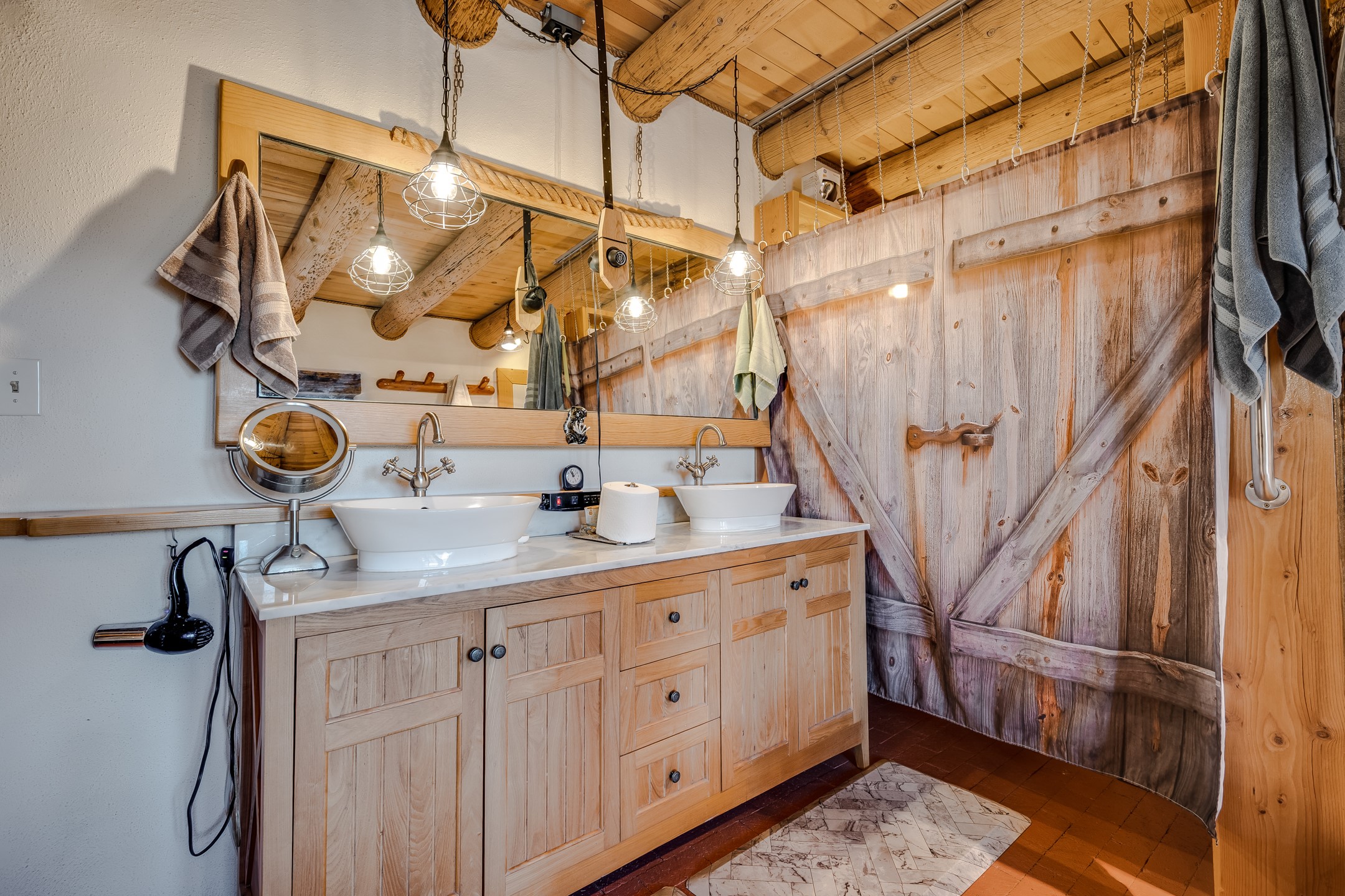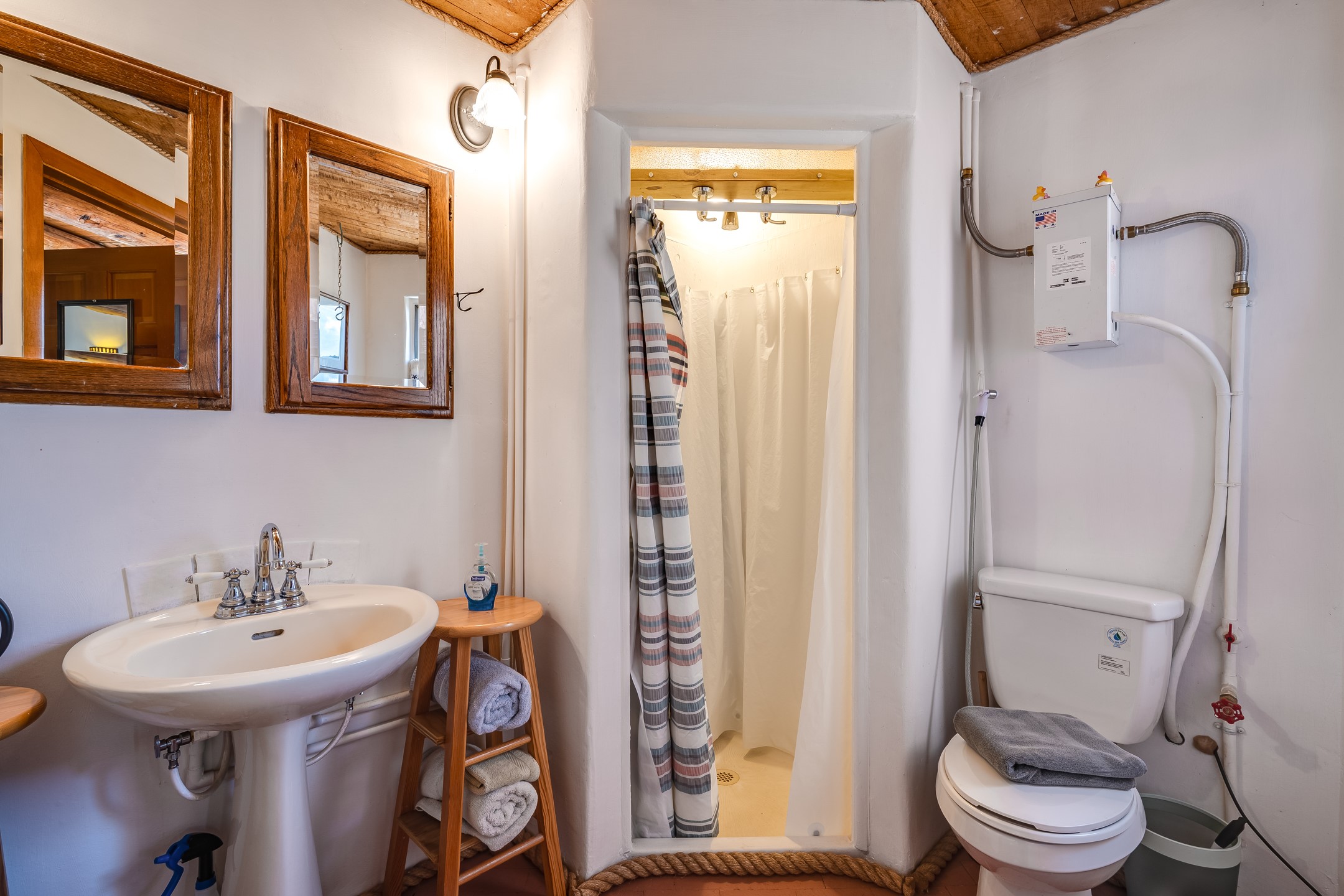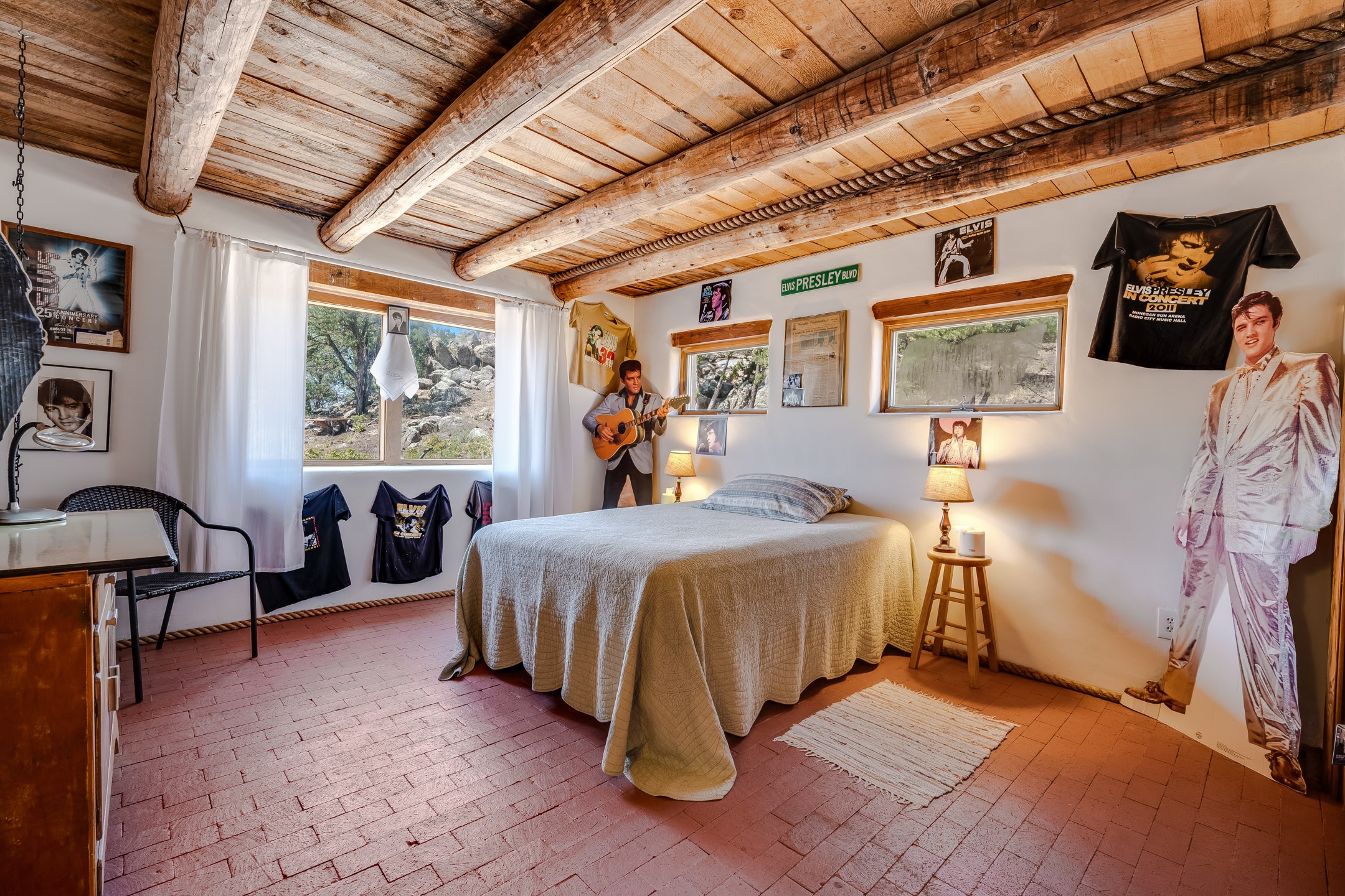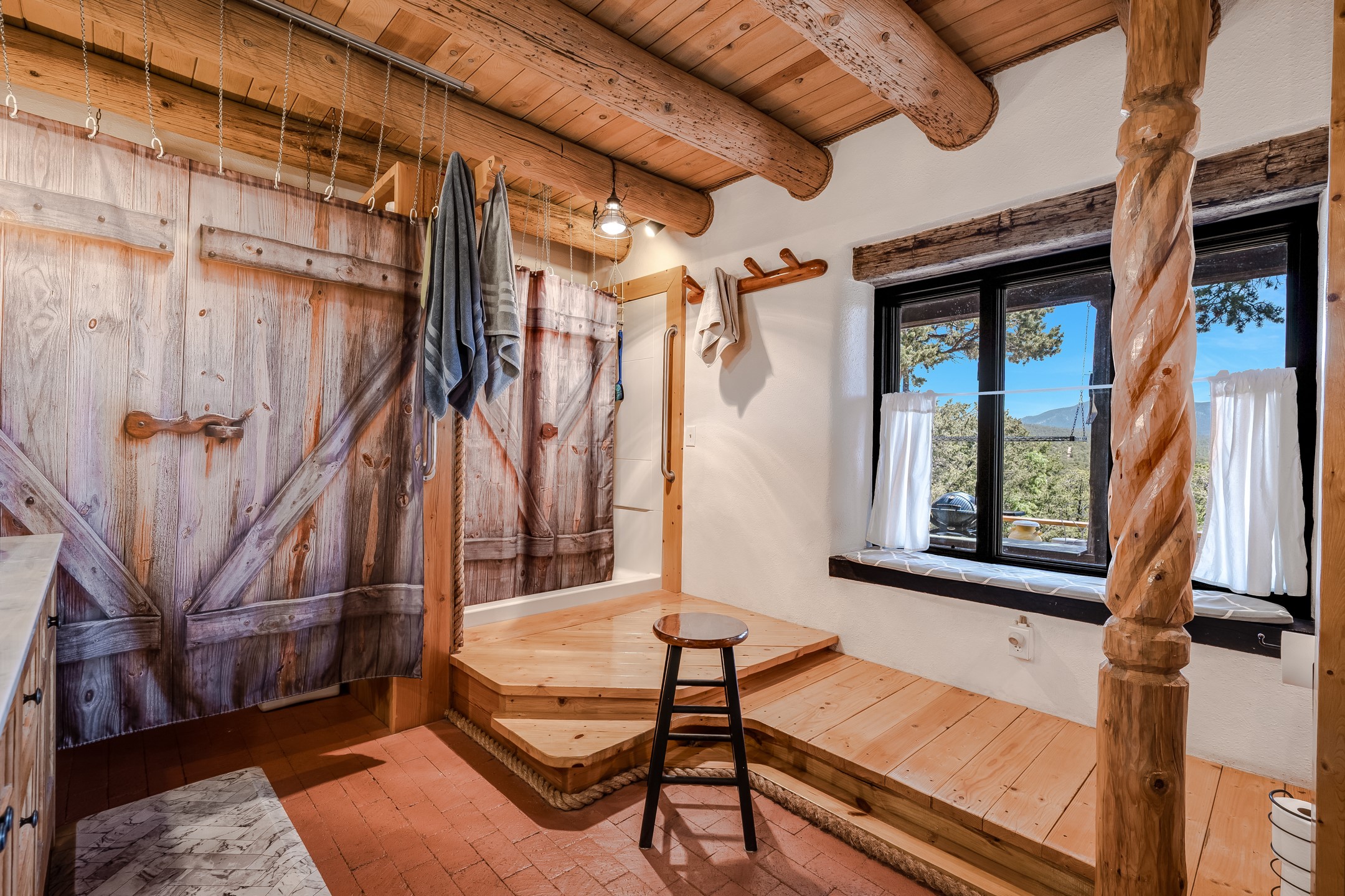 Set on 10 serene acres on the Old Santa Fe Trail and with striking mountain views, this unique 2-bedroom, 2.5-bath home offers space, versatility, and charm. Thoughtfully designed with high ceilings, custom woodwork, wood-burning fireplaces, and windows to capture the high desert terrain and fill the interiors with natural light, the open-concept living, kitchen, and dining areas create an inviting atmosphere. Additional workspace has been created with a built-ins and the bar/game room is sure to house many a fun night. The layout allows for an easy division into two one-bedroom units, presenting excellent rental income opportunities. Enjoy a peaceful lifestyle with whimsical gardens, a vibrant bar room, and a detached studio perfect for creative pursuits. A workshop with tools and a carport add function and value. The property features a private well, septic system, and can be divided into two 5-acre parcels for added potential. Located near Santa Fe's rail station, shopping at The Agora, and cultural destinations like Santa Fe Plaza only minutes away, this home blends rural tranquility with access to urban amenities--ideal for both full-time living or a flexible investment. **Details as provided by Sellers. See additional information in Broker Remarks and attached documents.