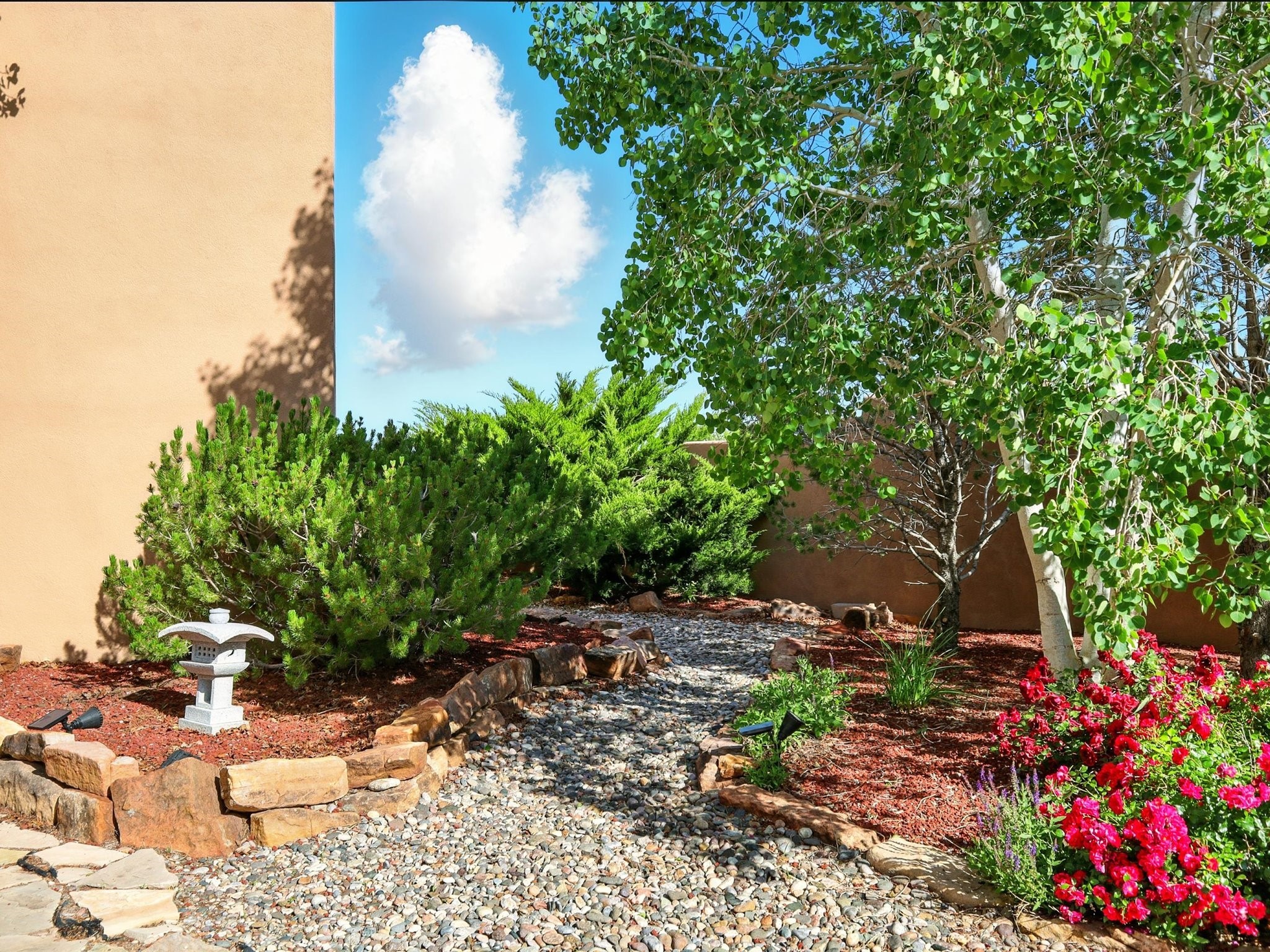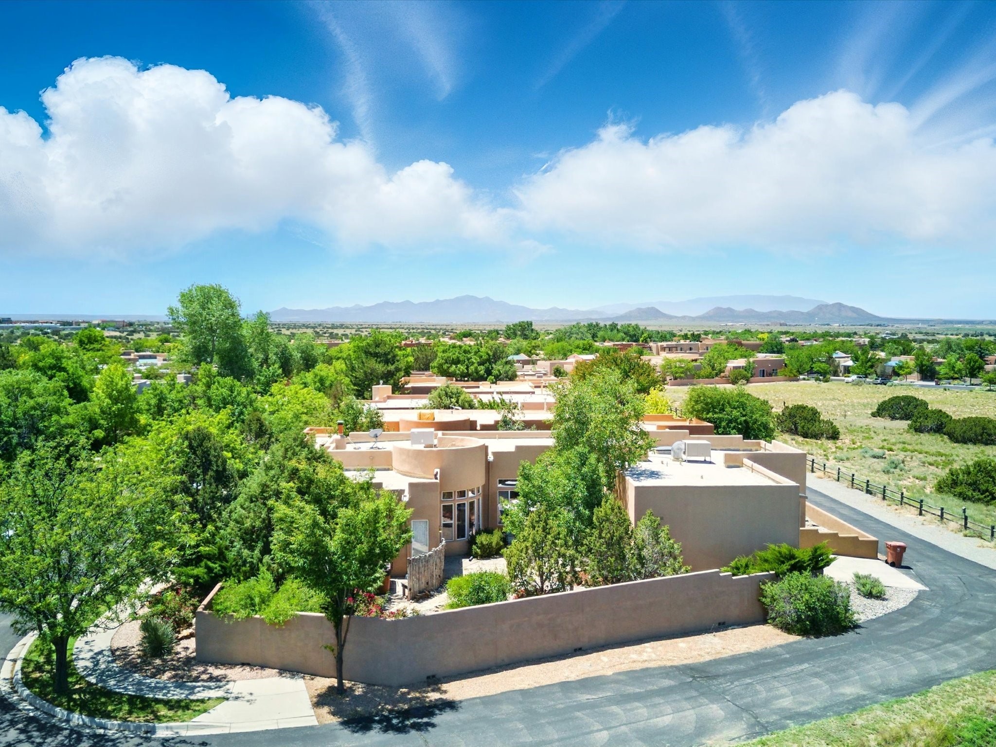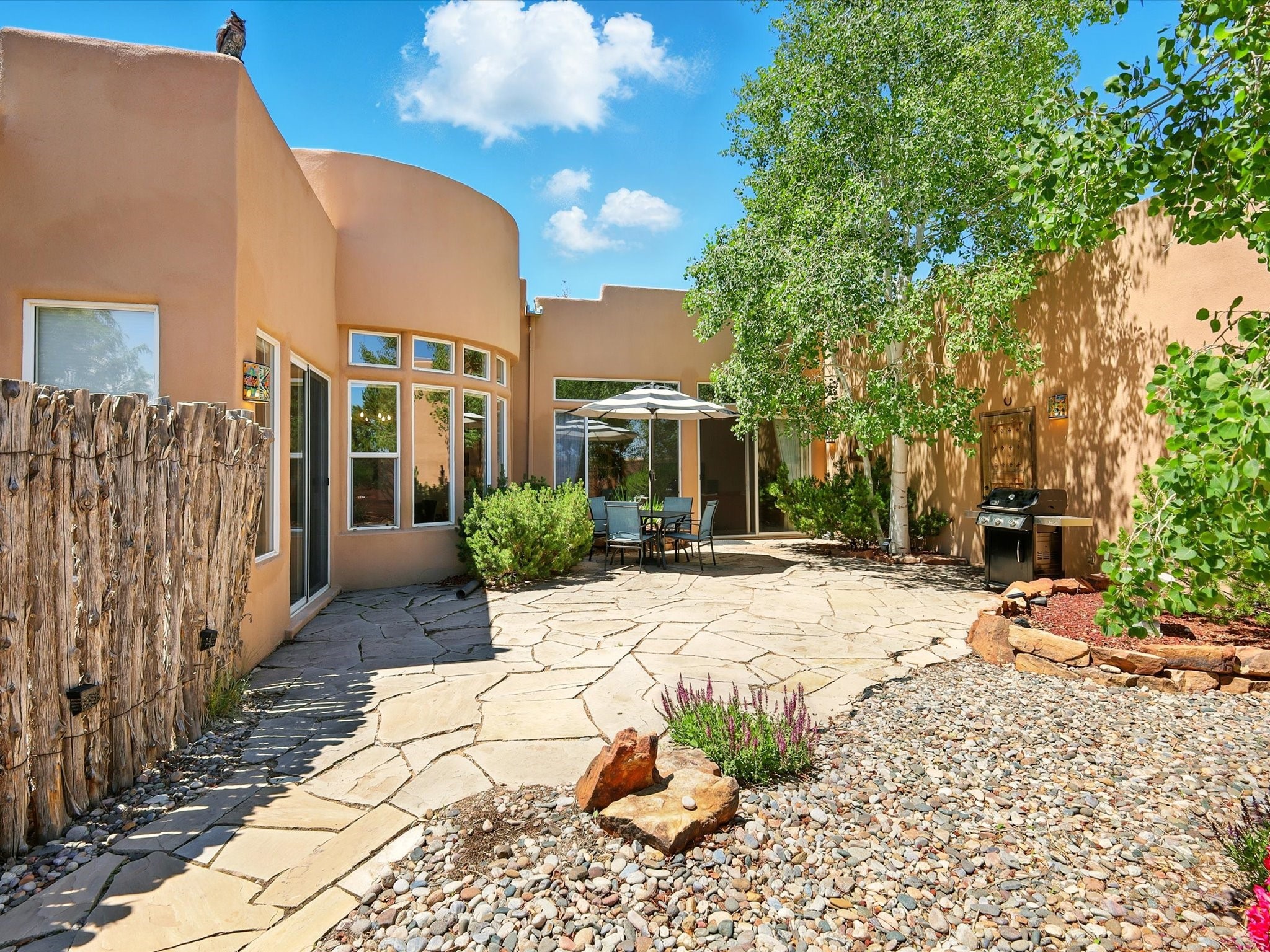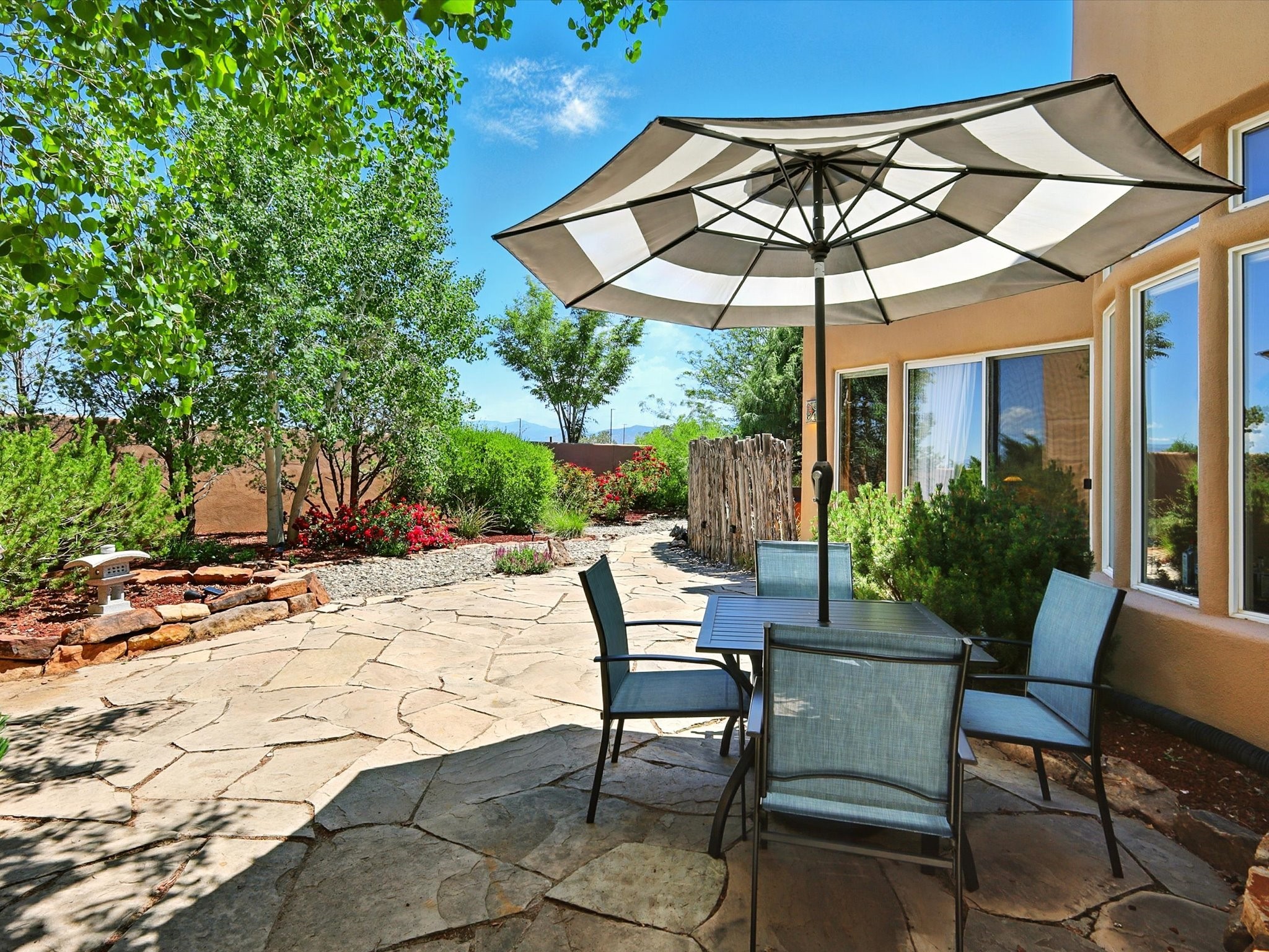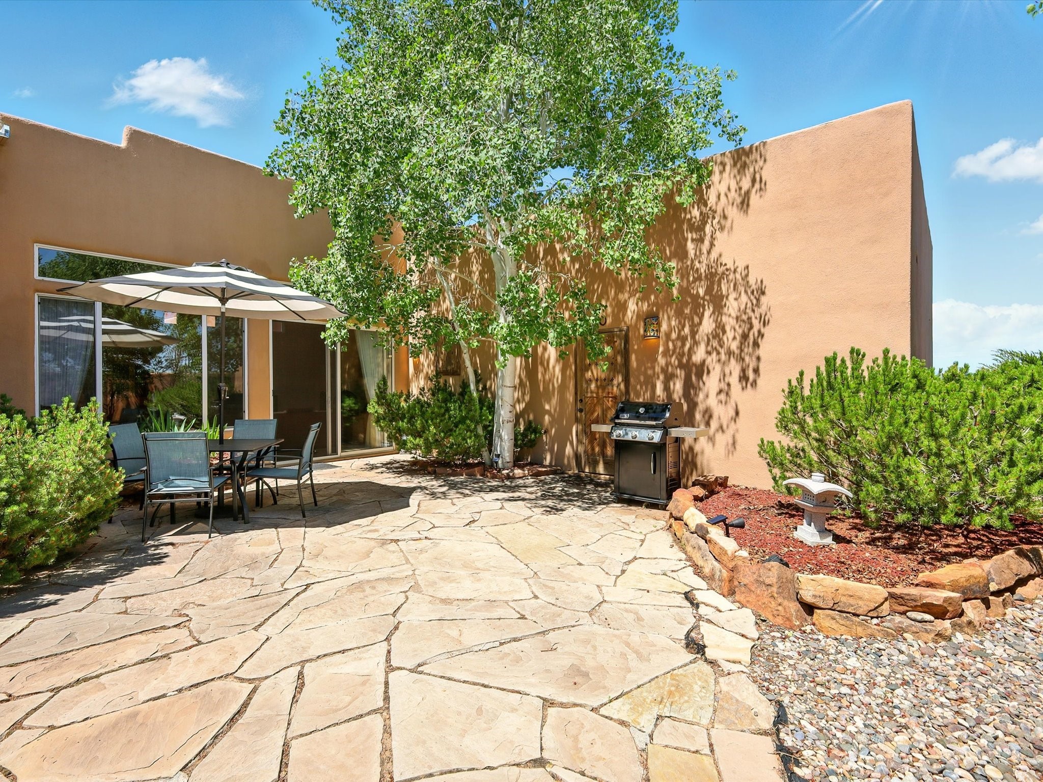 This is the special Rancho Viejo home you've been waiting for-- positioned on a fully landscaped corner lot at the end of the road, backing to open space and offering mountain views. The tranquil patio garden is a true retreat, featuring lush landscaping, custom wood doors, handcrafted sconces, and a tucked-away hot tub for ultimate relaxation. Inside, the home offers a thoughtful and spacious layout: three bedrooms, an office, a dedicated dining room, and two separate living areas, each with its own kiva fireplace. Every detail has been lovingly maintained. The primary suite includes a custom-designed closet, while the great room features upgraded Dolby Atmos ceiling speakers for an immersive audio experience. Throughout the home, lighting fixtures have been replaced with designer selections--no builder-grade finishes here. Set within the sought-after Rancho Viejo community, this home offers not just comfort but a connection to the land and sky. Known for its dark night skies and peaceful atmosphere, Rancho Viejo is ideal for stargazing from your own patio or enjoying the surrounding miles of walking trails. If you love a pastoral setting that feels quiet and removed, yet is still within easy reach of shopping, restaurants and short commuter routes, 29 Brilliant Sky Dr is a beautiful place to call home. Please enjoy the video tour attached to this listing.