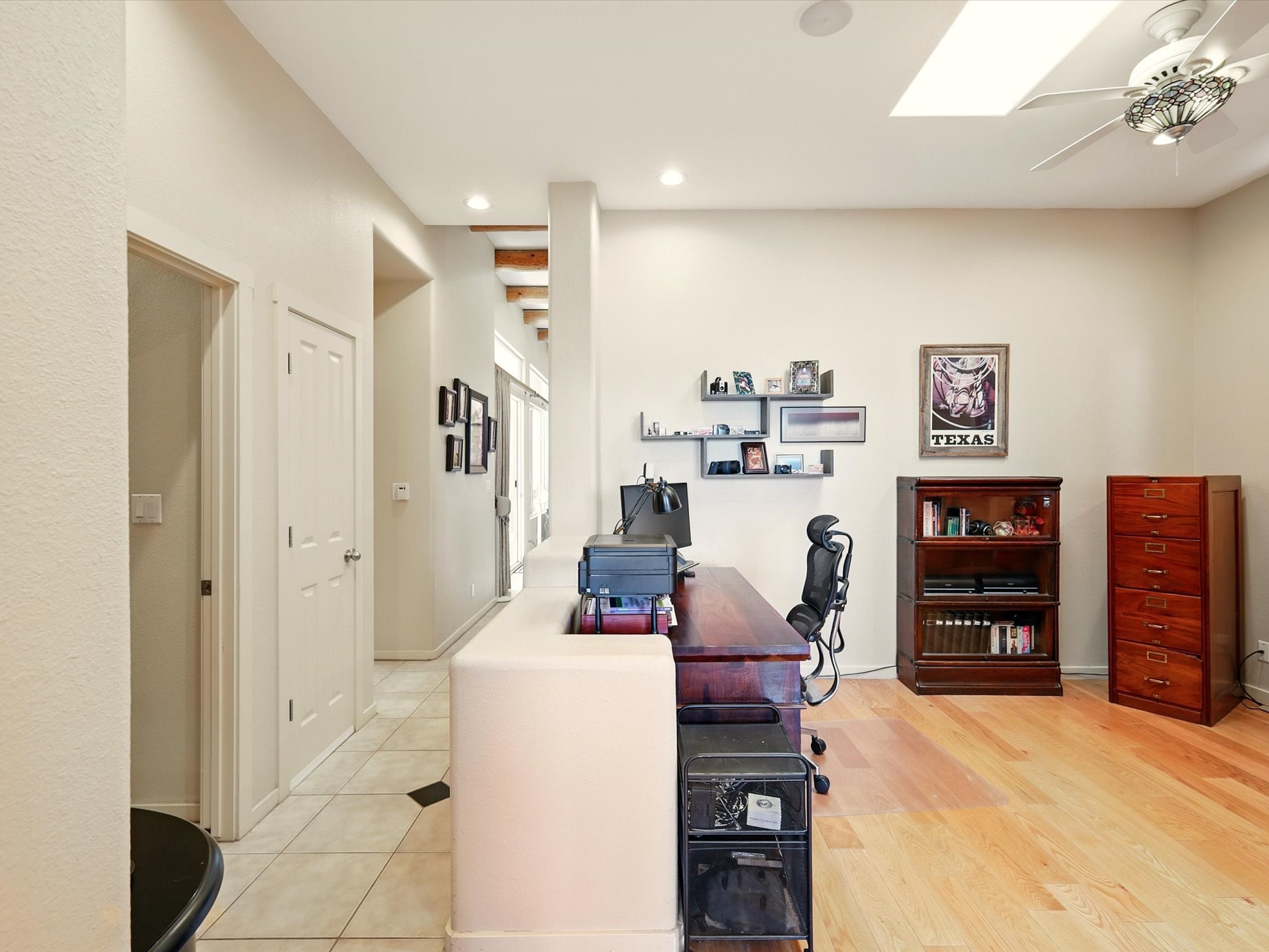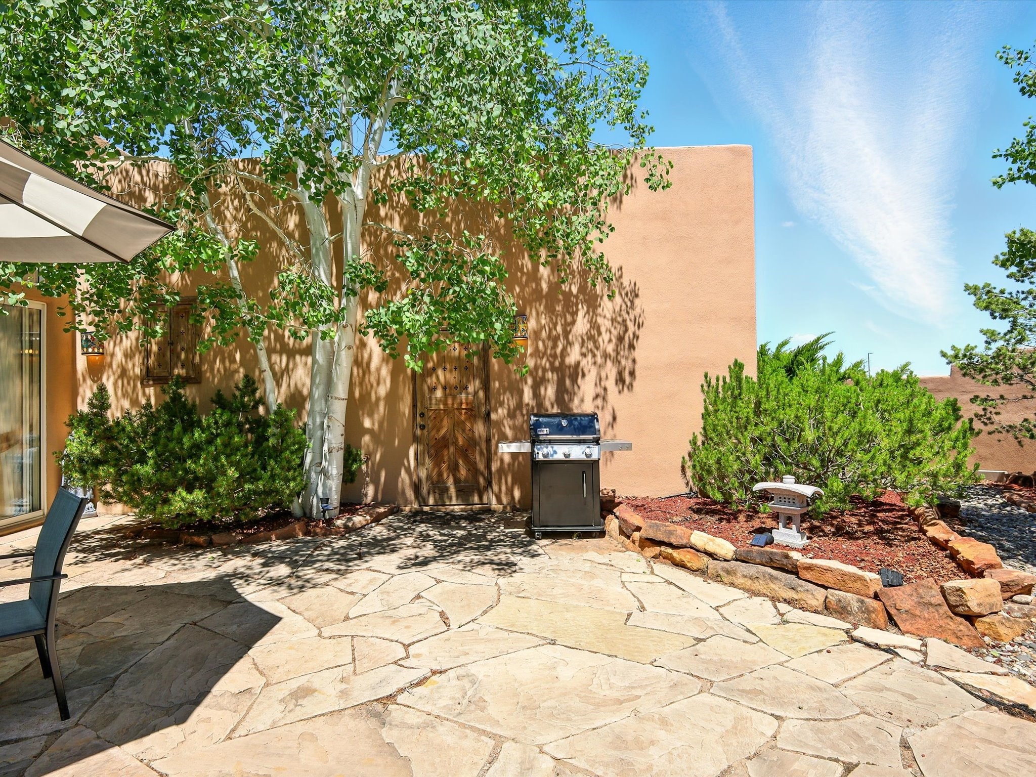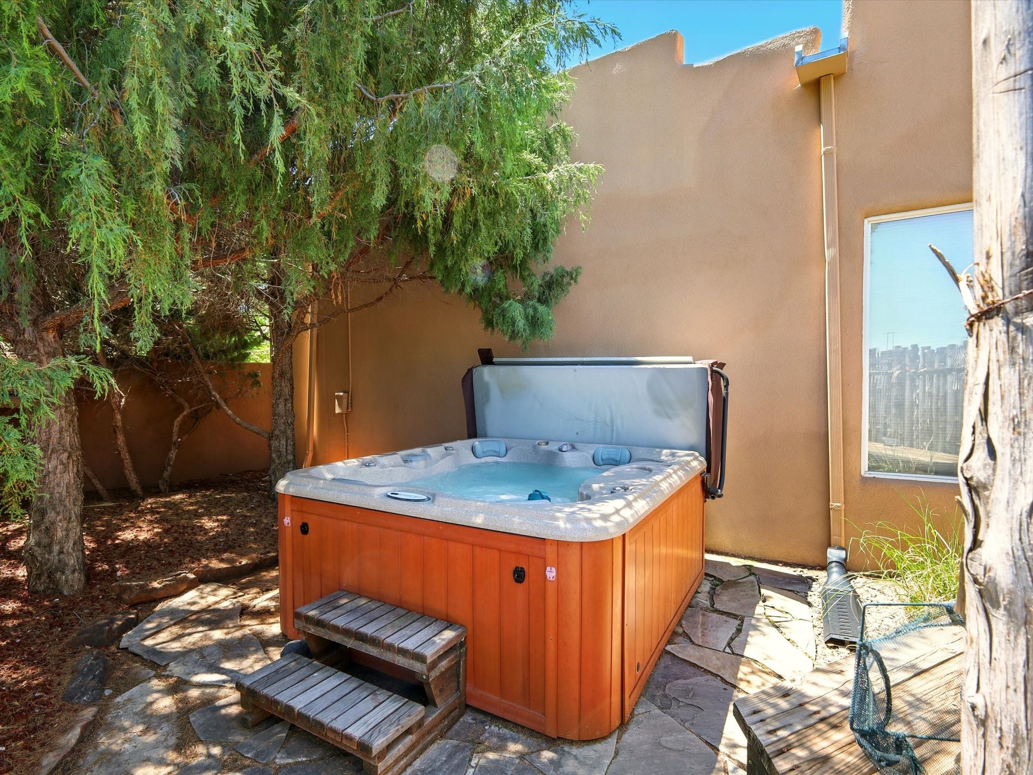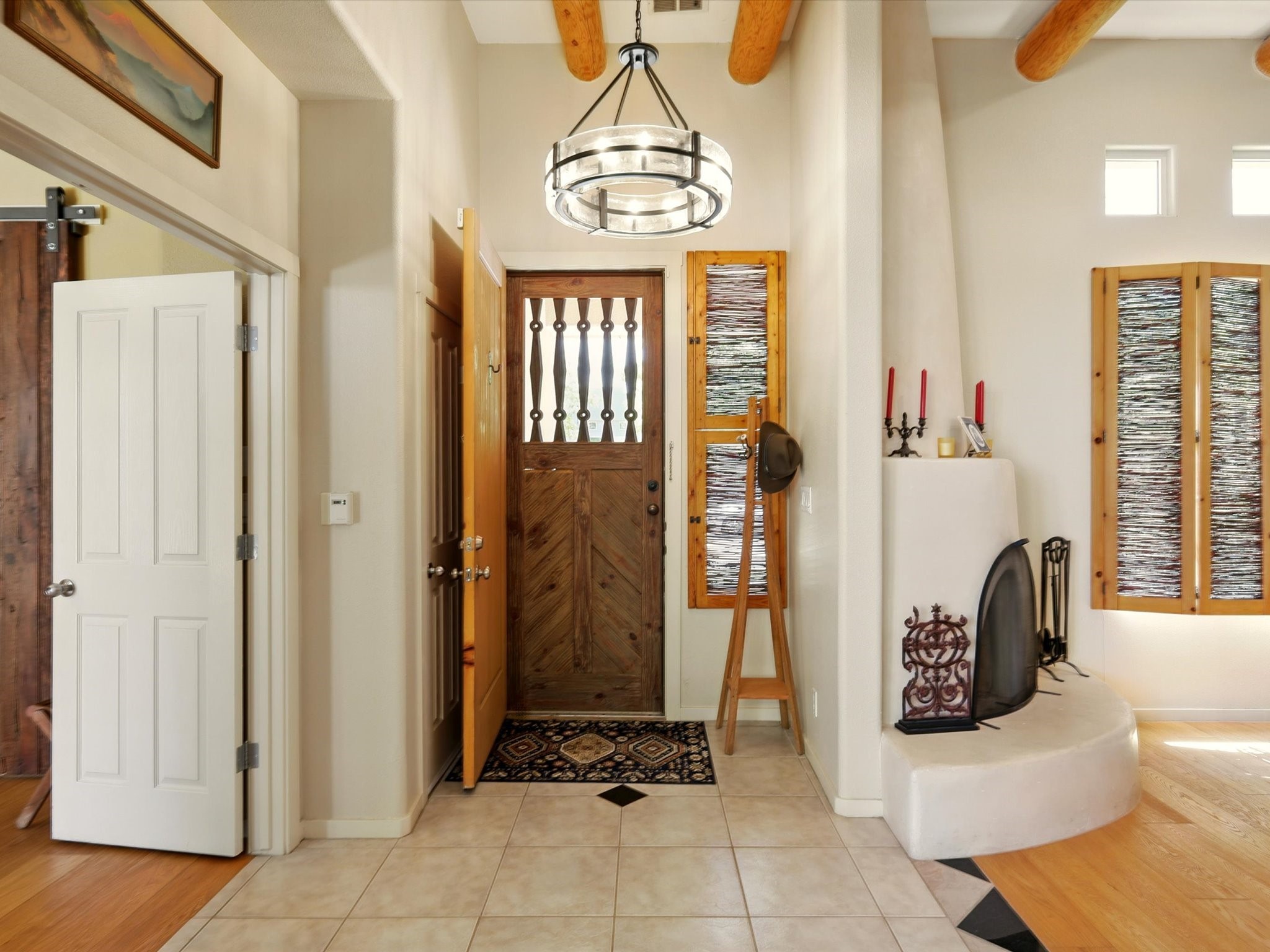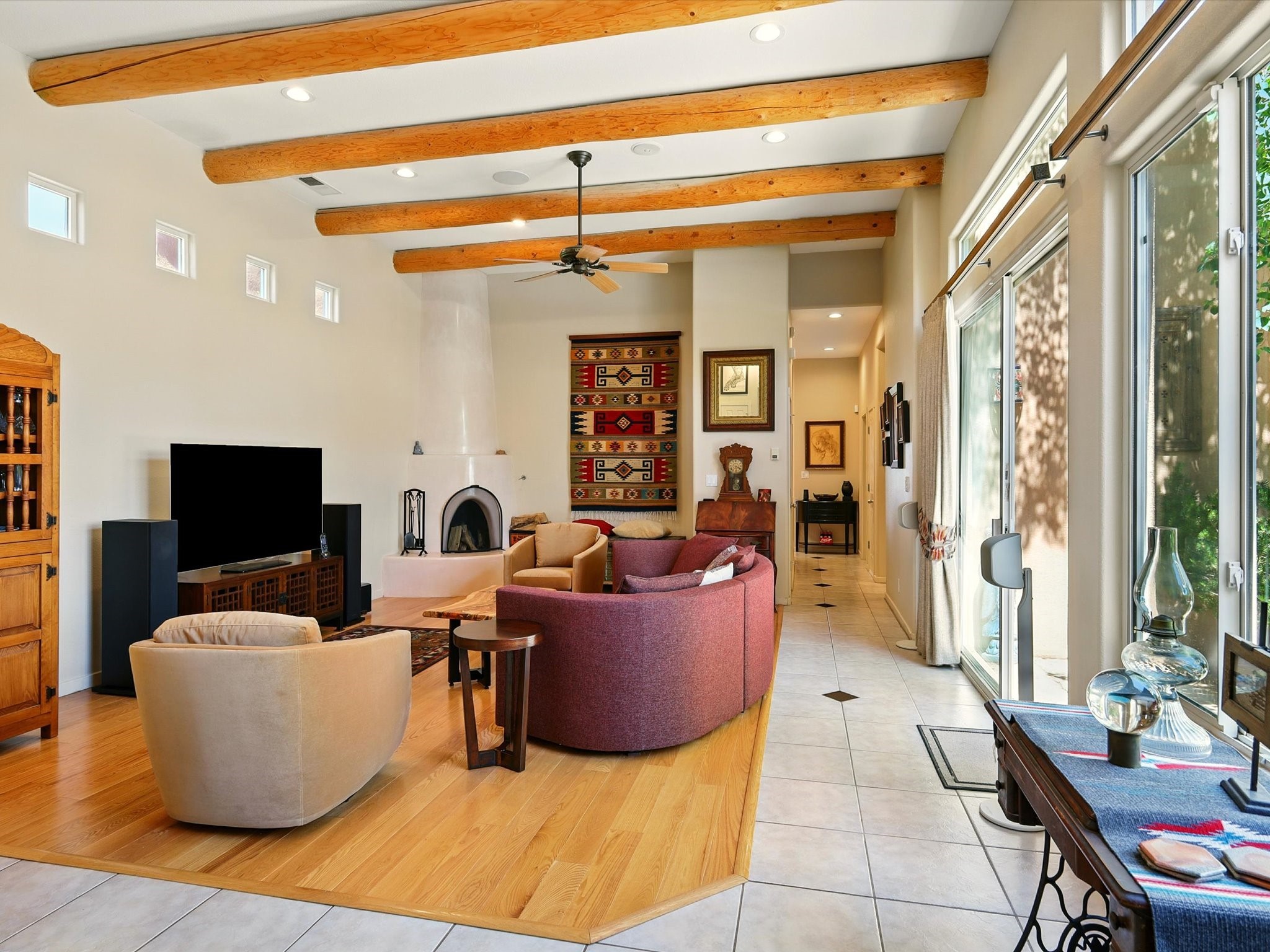 This is the special Rancho Viejo home you've been waiting for-- positioned on a fully landscaped corner lot at the end of the road, backing to open space and offering mountain views. The tranquil patio garden is a true retreat, featuring lush landscaping, custom wood doors, handcrafted sconces, and a tucked-away hot tub for ultimate relaxation. Inside, the home offers a thoughtful and spacious layout: three bedrooms, an office, a dedicated dining room, and two separate living areas, each with its own kiva fireplace. Every detail has been lovingly maintained. The primary suite includes a custom-designed closet, while the great room features upgraded Dolby Atmos ceiling speakers for an immersive audio experience. Throughout the home, lighting fixtures have been replaced with designer selections--no builder-grade finishes here. Set within the sought-after Rancho Viejo community, this home offers not just comfort but a connection to the land and sky. Known for its dark night skies and peaceful atmosphere, Rancho Viejo is ideal for stargazing from your own patio or enjoying the surrounding miles of walking trails. If you love a pastoral setting that feels quiet and removed, yet is still within easy reach of shopping, restaurants and short commuter routes, 29 Brilliant Sky Dr is a beautiful place to call home. Please enjoy the video tour attached to this listing.