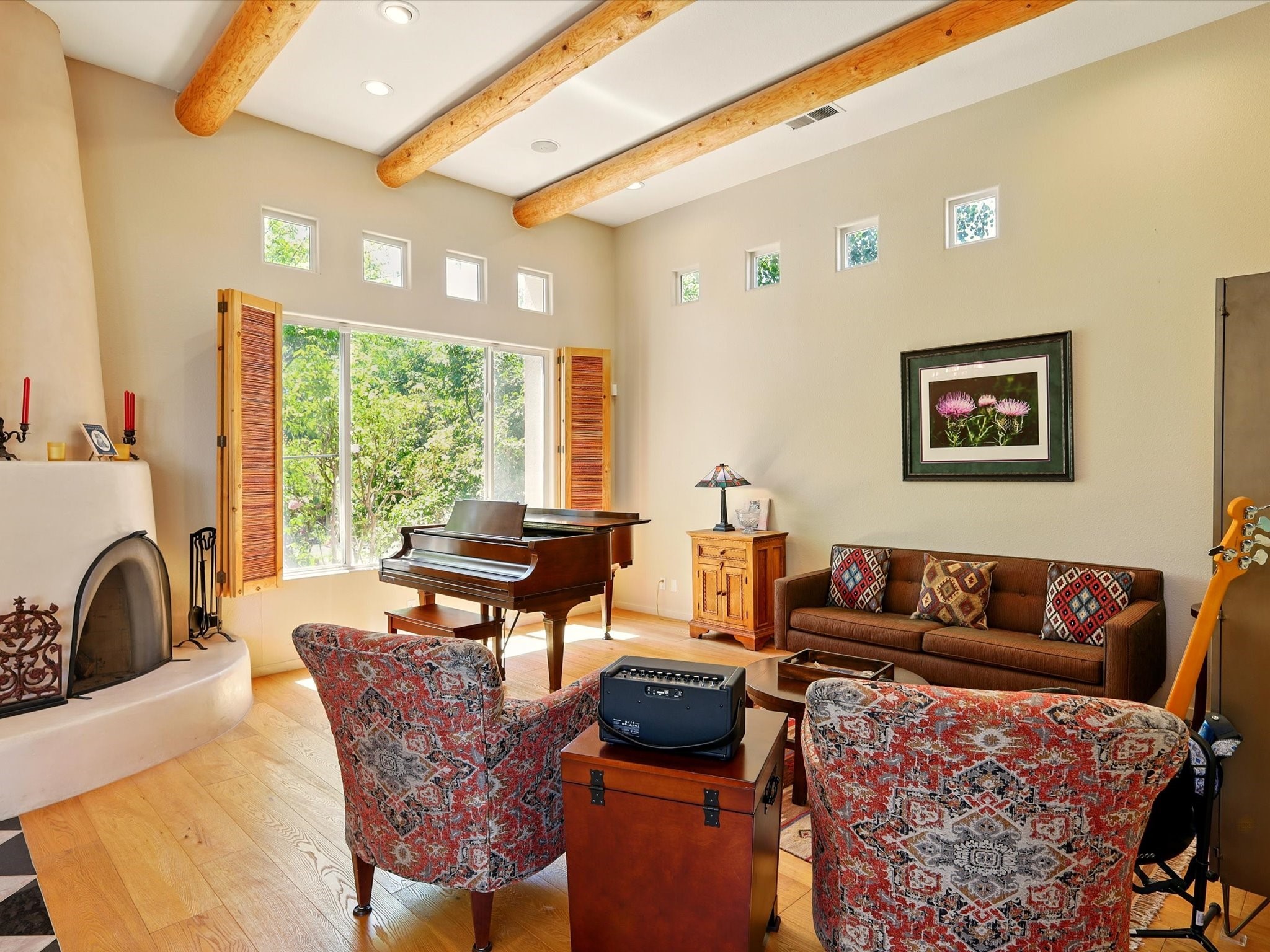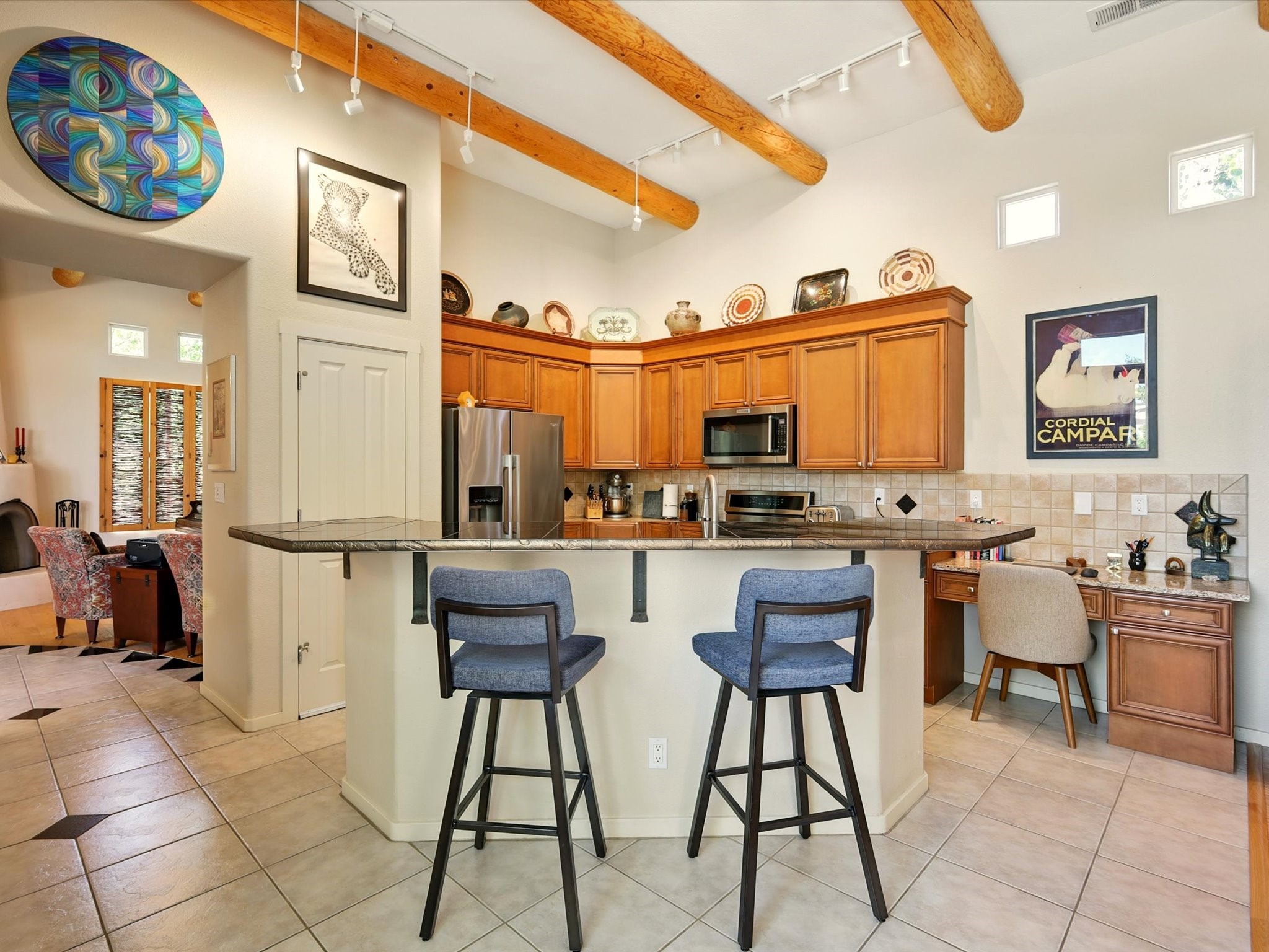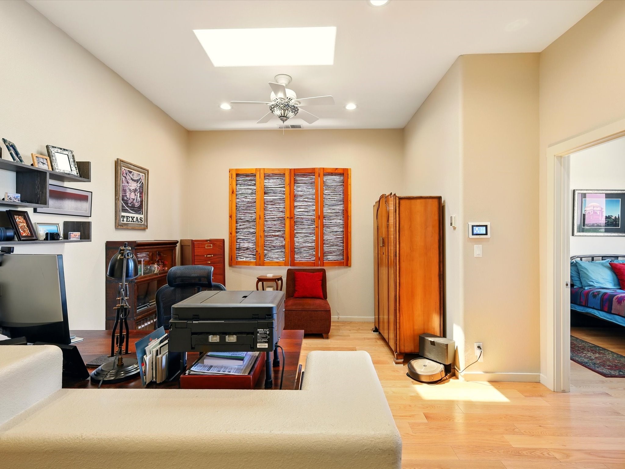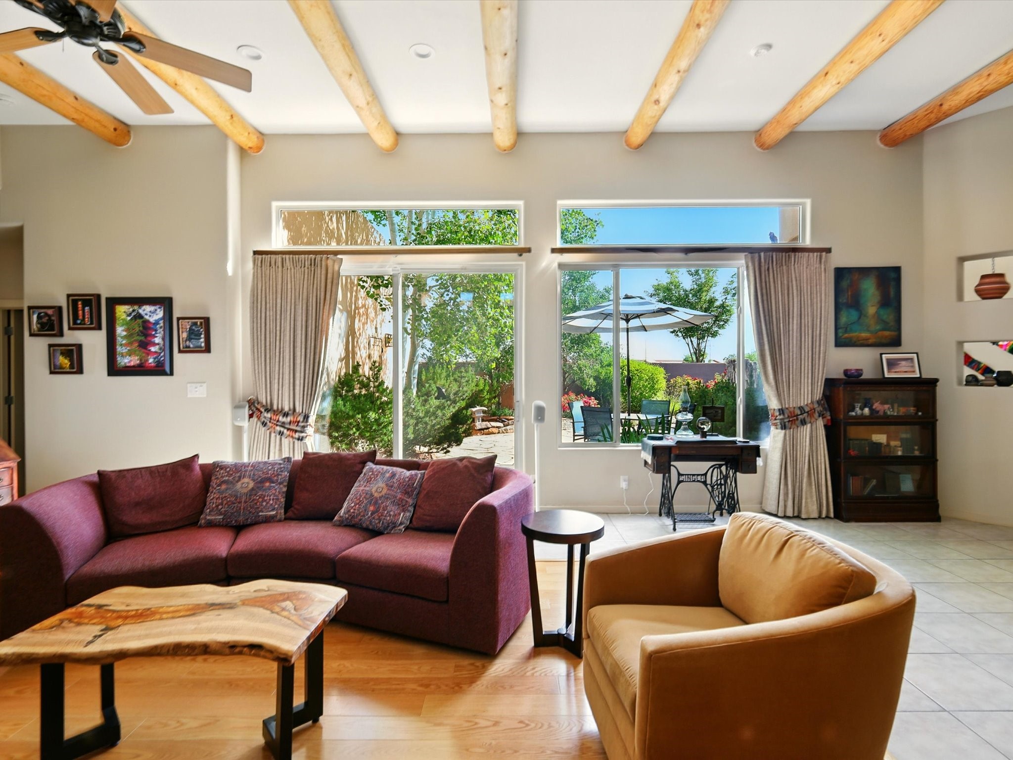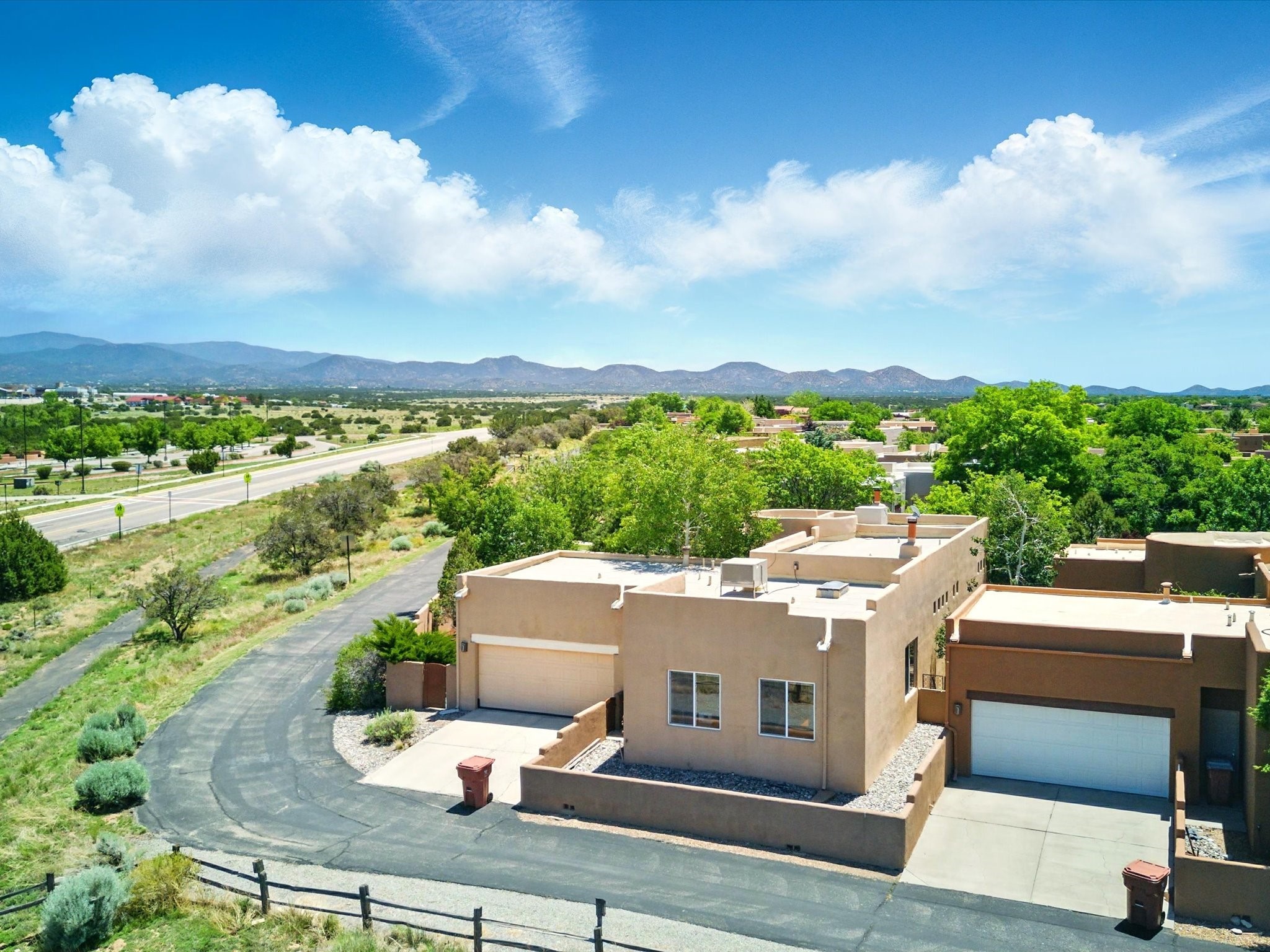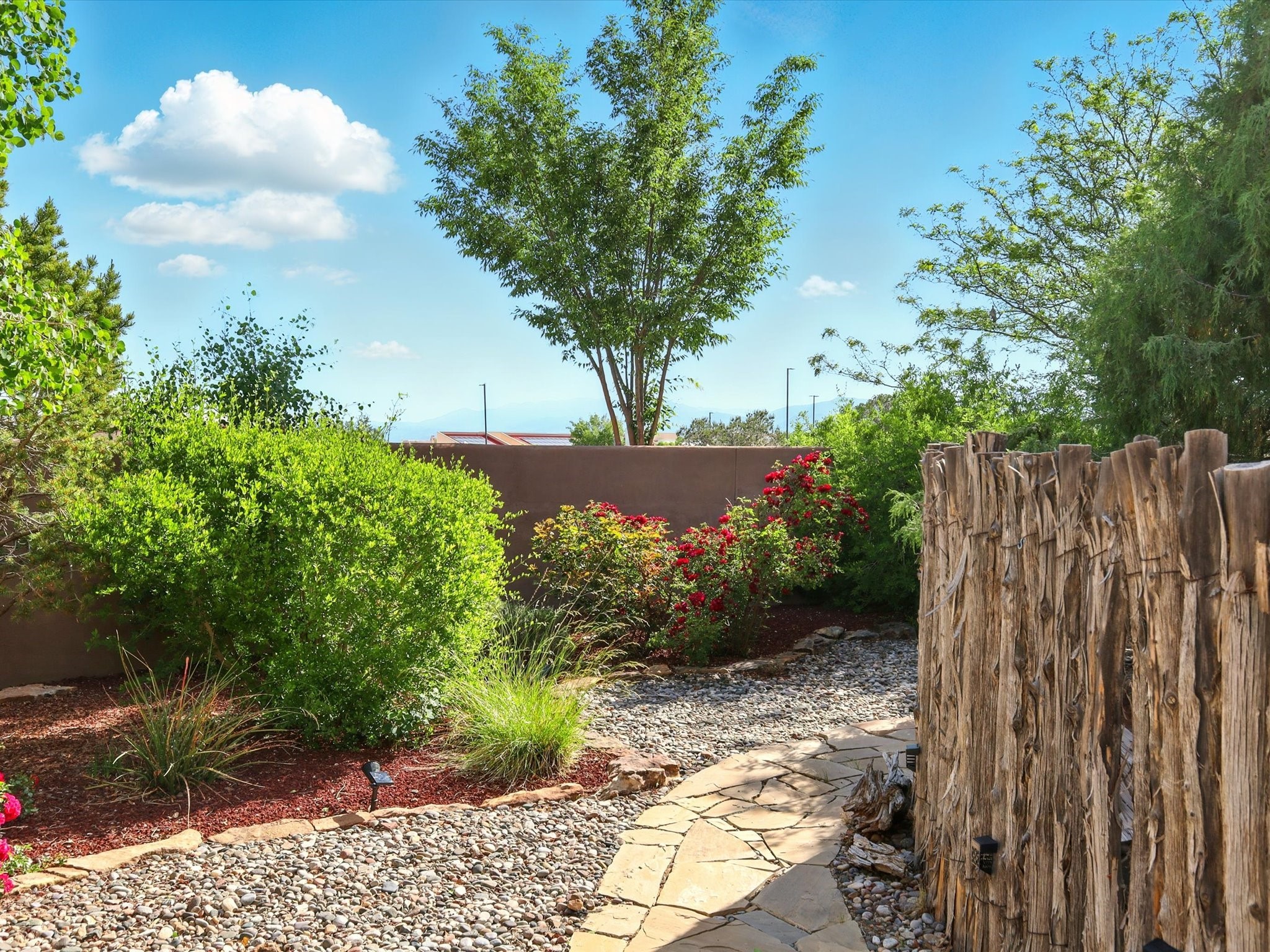 This is the special Rancho Viejo home you've been waiting for-- positioned on a fully landscaped corner lot at the end of the road, backing to open space and offering mountain views. The tranquil patio garden is a true retreat, featuring lush landscaping, custom wood doors, handcrafted sconces, and a tucked-away hot tub for ultimate relaxation. Inside, the home offers a thoughtful and spacious layout: three bedrooms, an office, a dedicated dining room, and two separate living areas, each with its own kiva fireplace. Every detail has been lovingly maintained. The primary suite includes a custom-designed closet, while the great room features upgraded Dolby Atmos ceiling speakers for an immersive audio experience. Throughout the home, lighting fixtures have been replaced with designer selections--no builder-grade finishes here. Set within the sought-after Rancho Viejo community, this home offers not just comfort but a connection to the land and sky. Known for its dark night skies and peaceful atmosphere, Rancho Viejo is ideal for stargazing from your own patio or enjoying the surrounding miles of walking trails. If you love a pastoral setting that feels quiet and removed, yet is still within easy reach of shopping, restaurants and short commuter routes, 29 Brilliant Sky Dr is a beautiful place to call home. Please enjoy the video tour attached to this listing.
