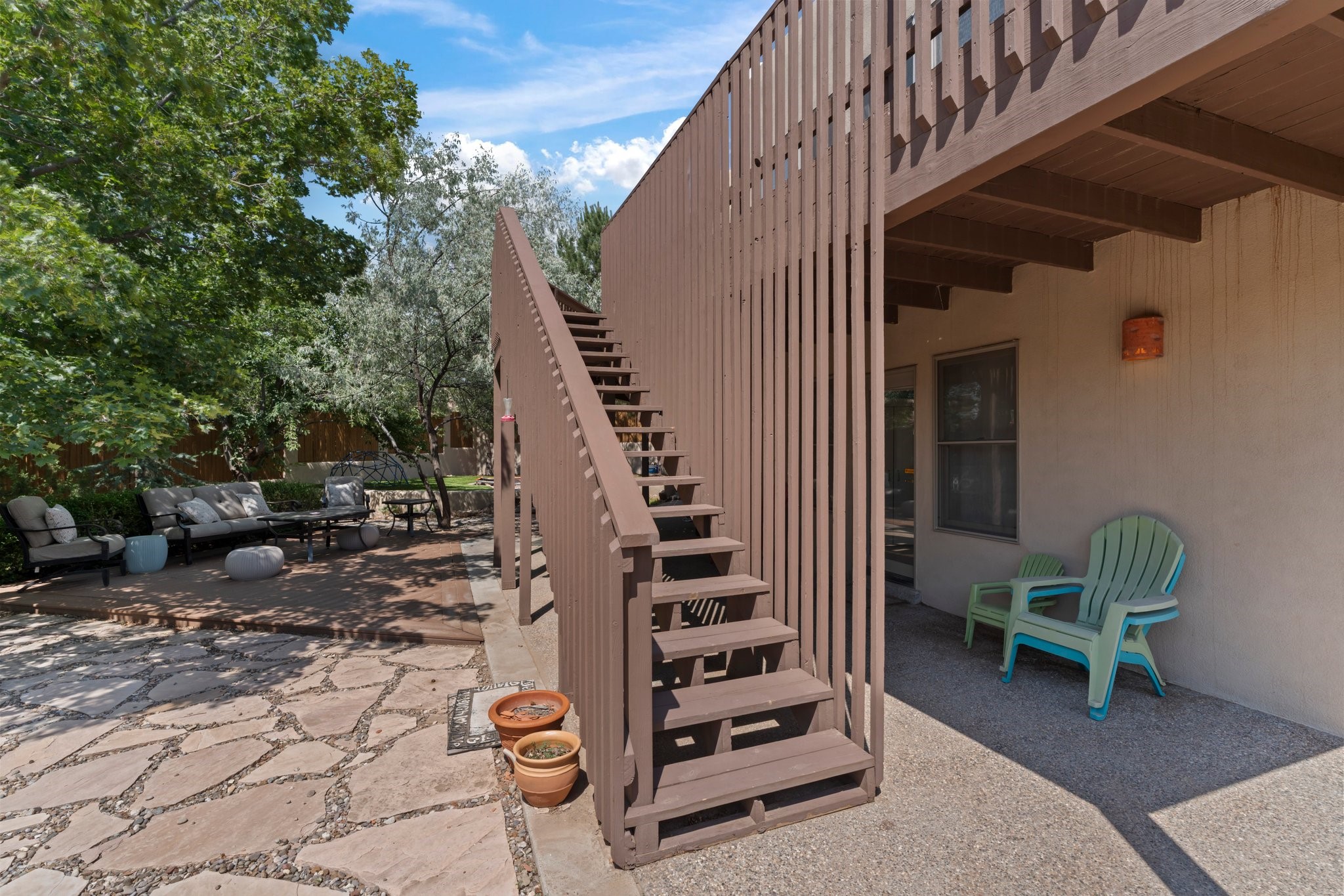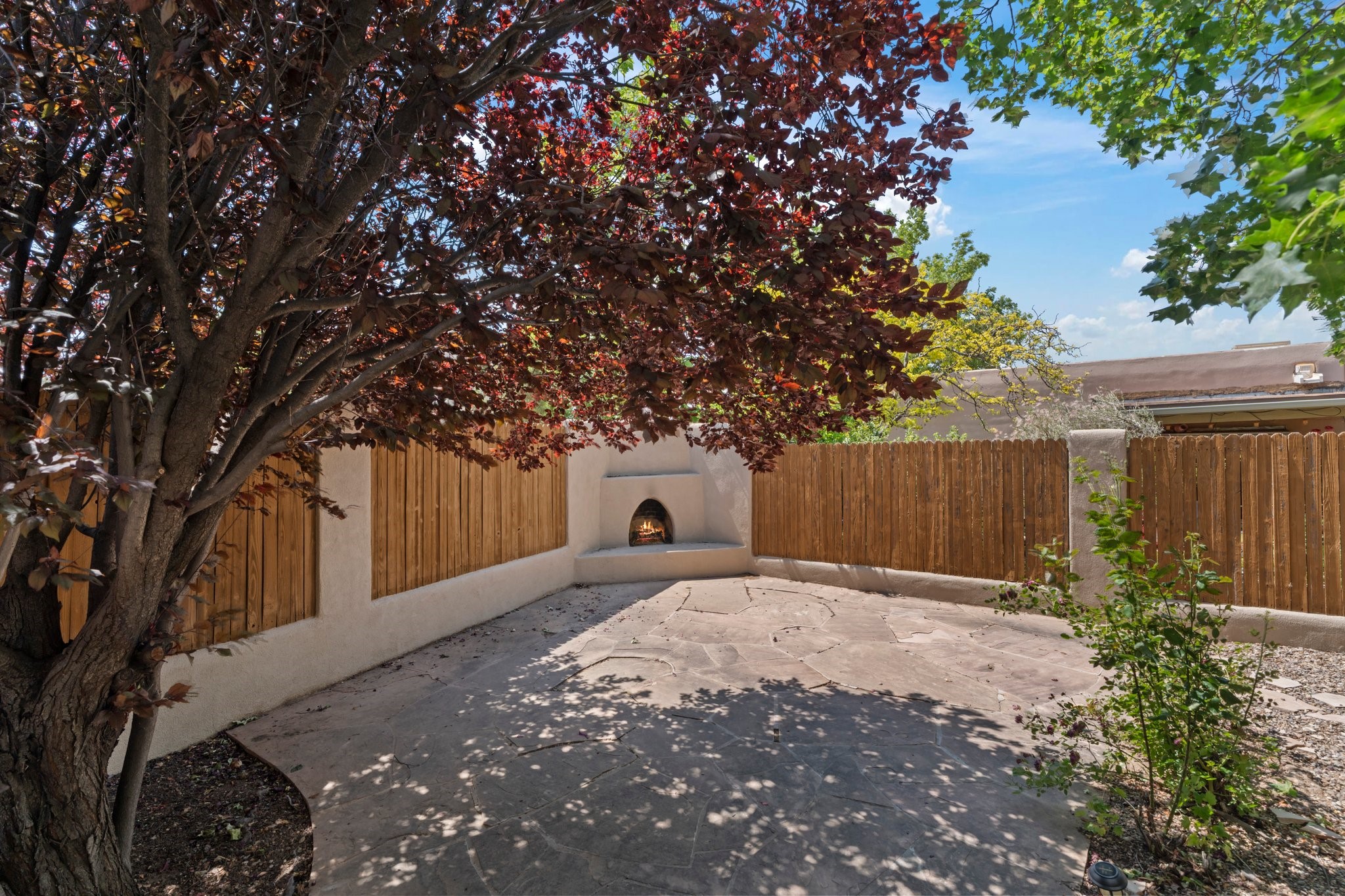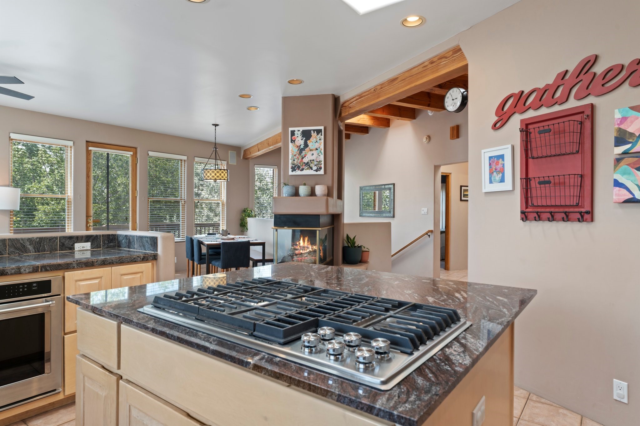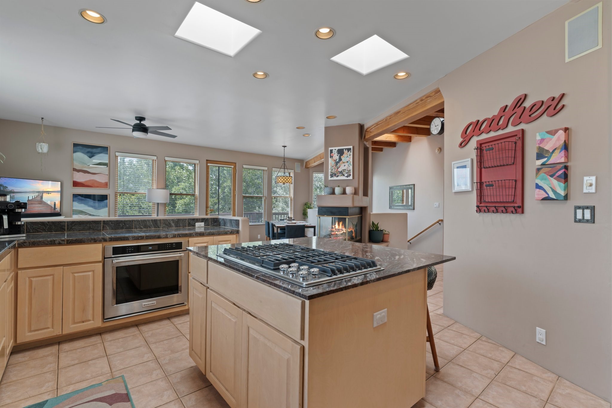 Welcome to your private sanctuary nestled on nearly a fifth of an acre of beautifully landscaped grounds, where comfort meets thoughtful design and timeless charm. This expansive 2,859 sq ft home, complemented by a detached 293 sq ft studio and a 308 sq ft storage space, offers exceptional versatility for modern living.Step inside to discover a spacious two-level layout designed with privacy and flow in mind. The main level is an entertainer's dream, featuring a light-filled chef's kitchen with granite countertops, a large center island, and newer appliances. The open dining area flows effortlessly into the family room with the living room just to the right of the front door, creating an inviting space for gatherings or quiet evenings at home. A full bath and a private bedroom on this level add convenience and flexibility for guests or a home office.Downstairs, you'll find the luxurious primary suite, where a spectacularly remodeled bathroom and expansive walk-in closet provide a serene retreat. Two additional well-appointed bedrooms, a stylish updated bathroom, and a conveniently located laundry room complete the lower level.Outside, the magic continues. The backyard is a peaceful haven with lush shade trees, a romantic sitting area, and a charming outdoor corner fireplace--perfect for alfresco evenings under the stars. Whether you're hosting guests or enjoying a quiet morning coffee, this outdoor space is designed to inspire.Additional highlights include a newer 4-year-old TPO roof, recently updated stucco, upgraded Pella picture windows, and a two-car garage with easy access to the kitchen.Don't miss this amazing home convenient to all things Santa Fe!