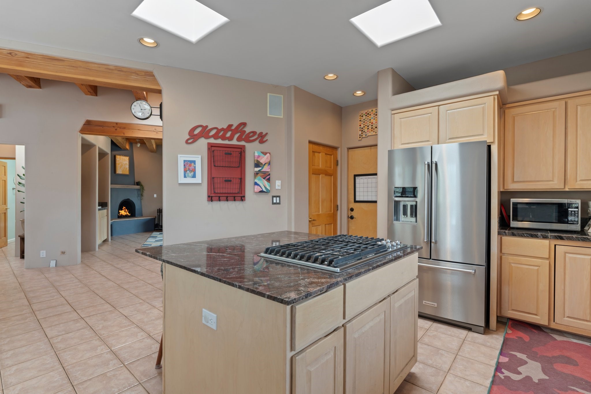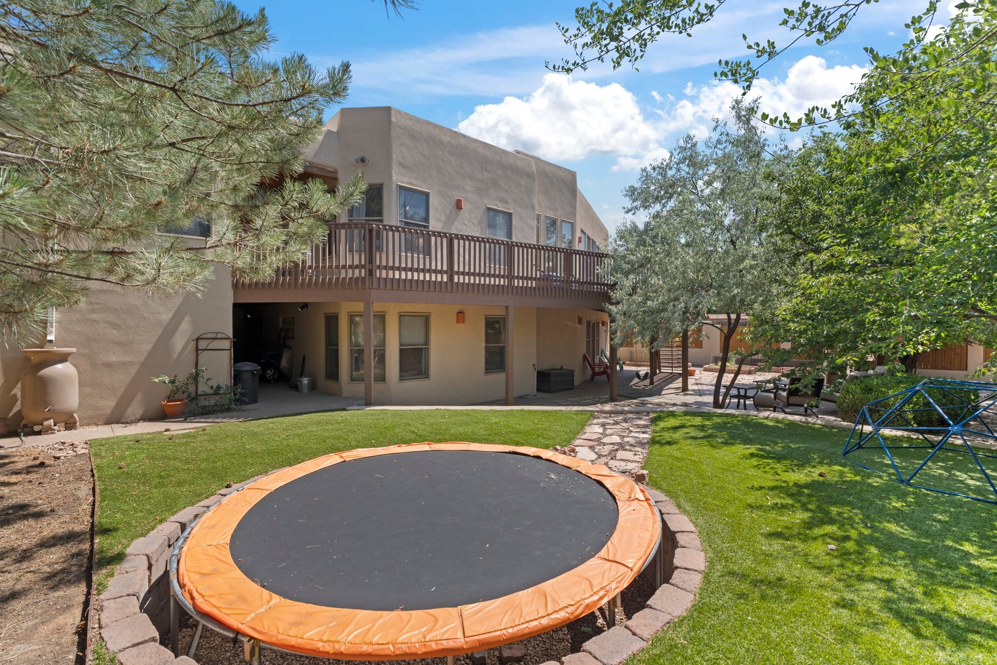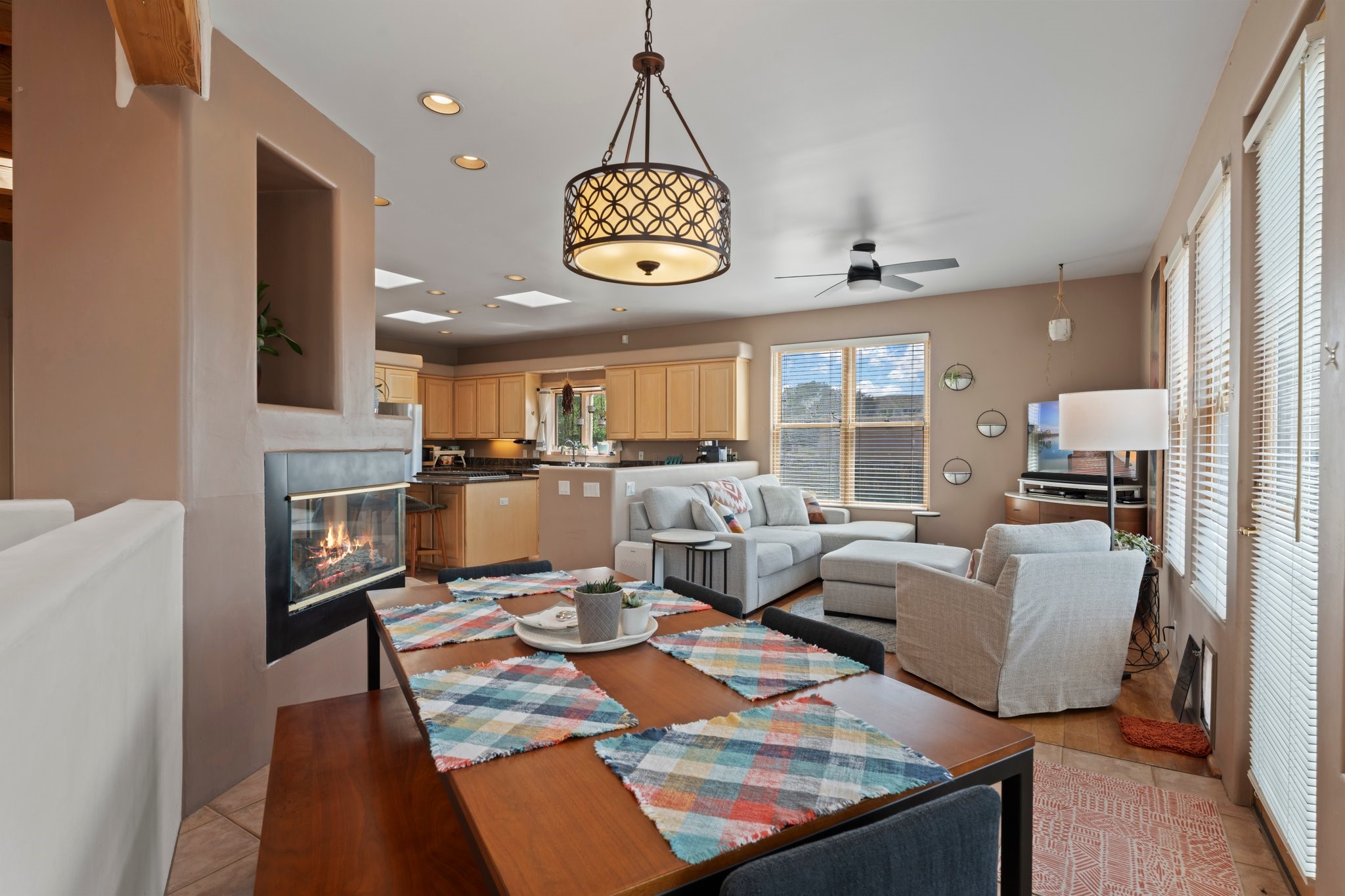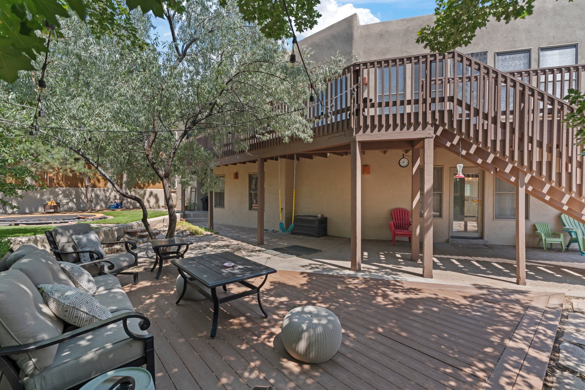 Welcome to your private sanctuary nestled on nearly a fifth of an acre of beautifully landscaped grounds, where comfort meets thoughtful design and timeless charm. This expansive 2,859 sq ft home, complemented by a detached 293 sq ft studio and a 308 sq ft storage space, offers exceptional versatility for modern living.Step inside to discover a spacious two-level layout designed with privacy and flow in mind. The main level is an entertainer's dream, featuring a light-filled chef's kitchen with granite countertops, a large center island, and newer appliances. The open dining area flows effortlessly into the family room with the living room just to the right of the front door, creating an inviting space for gatherings or quiet evenings at home. A full bath and a private bedroom on this level add convenience and flexibility for guests or a home office.Downstairs, you'll find the luxurious primary suite, where a spectacularly remodeled bathroom and expansive walk-in closet provide a serene retreat. Two additional well-appointed bedrooms, a stylish updated bathroom, and a conveniently located laundry room complete the lower level.Outside, the magic continues. The backyard is a peaceful haven with lush shade trees, a romantic sitting area, and a charming outdoor corner fireplace--perfect for alfresco evenings under the stars. Whether you're hosting guests or enjoying a quiet morning coffee, this outdoor space is designed to inspire.Additional highlights include a newer 4-year-old TPO roof, recently updated stucco, upgraded Pella picture windows, and a two-car garage with easy access to the kitchen.Don't miss this amazing home convenient to all things Santa Fe!