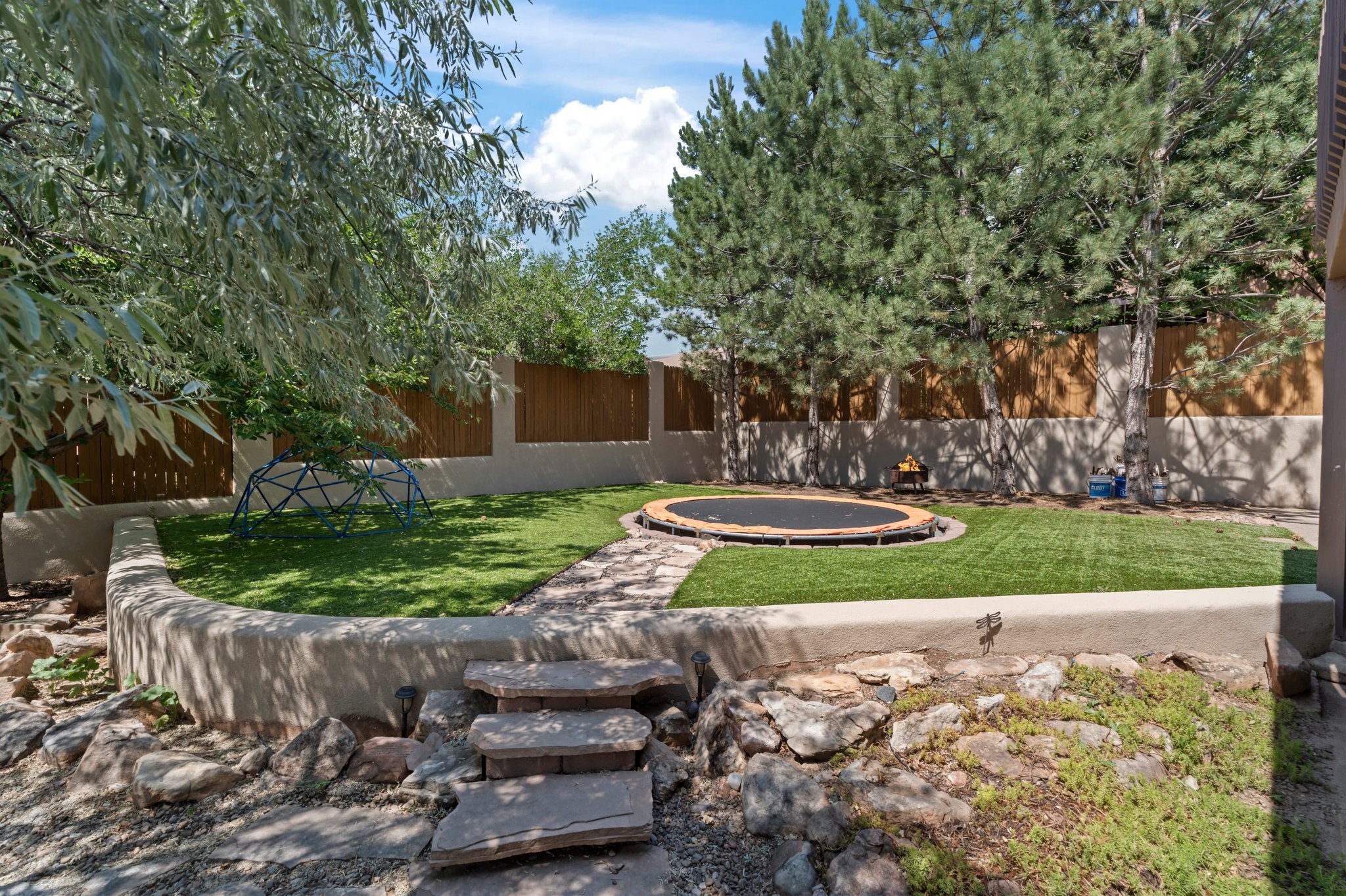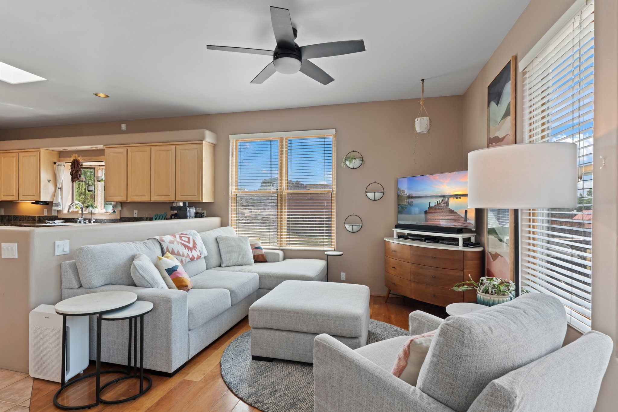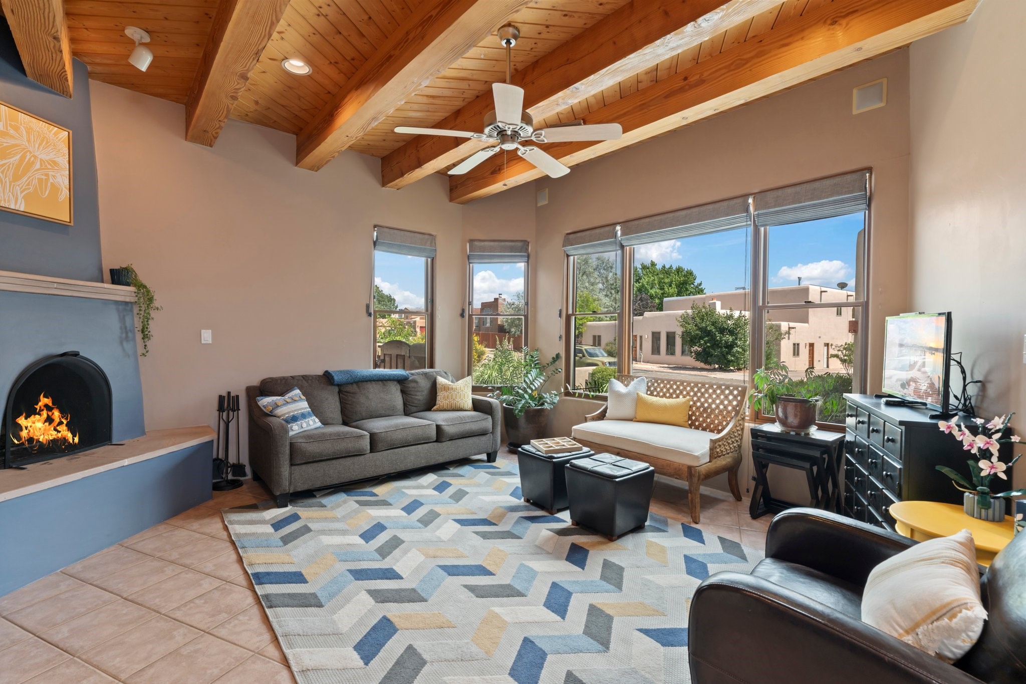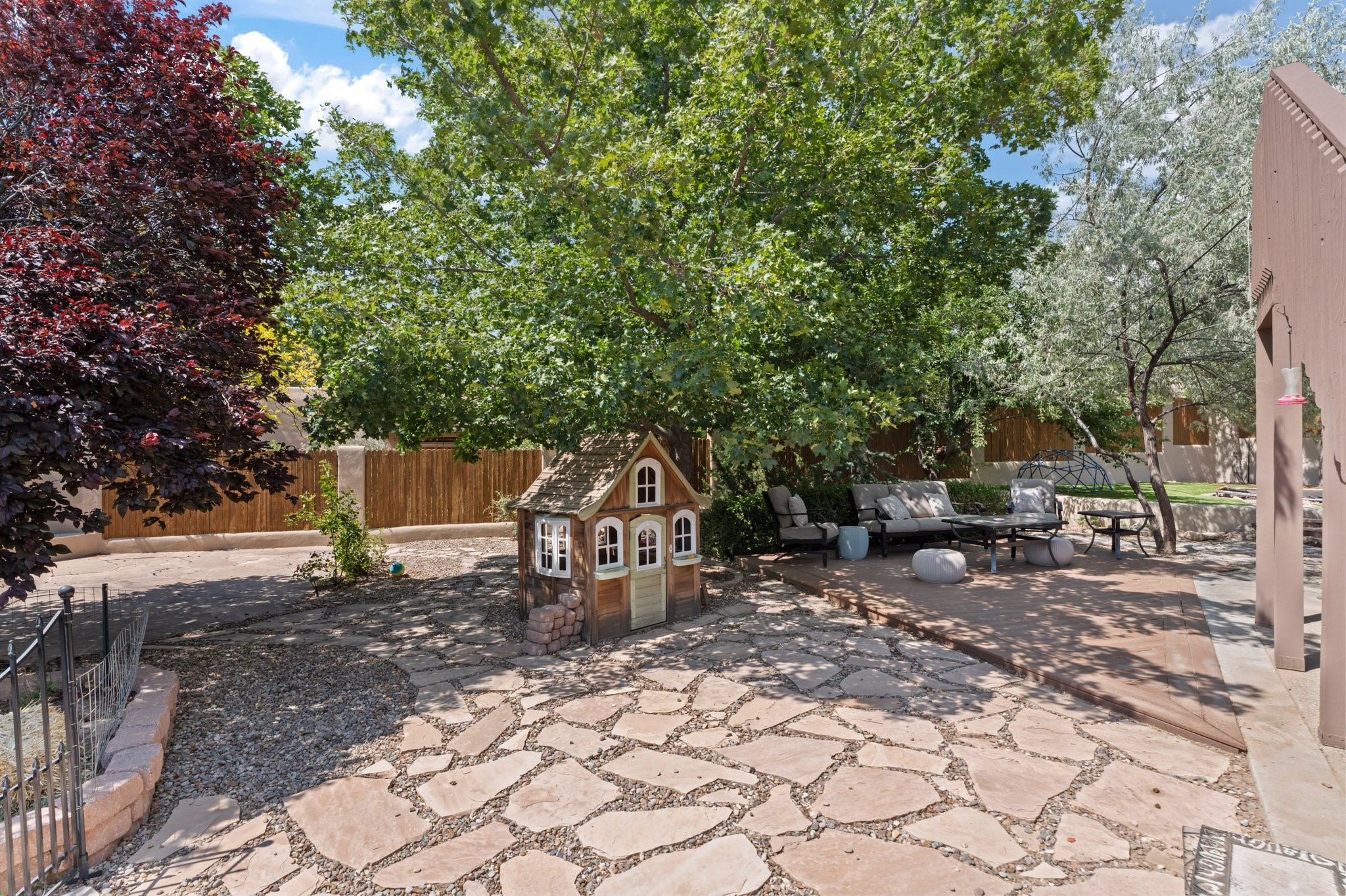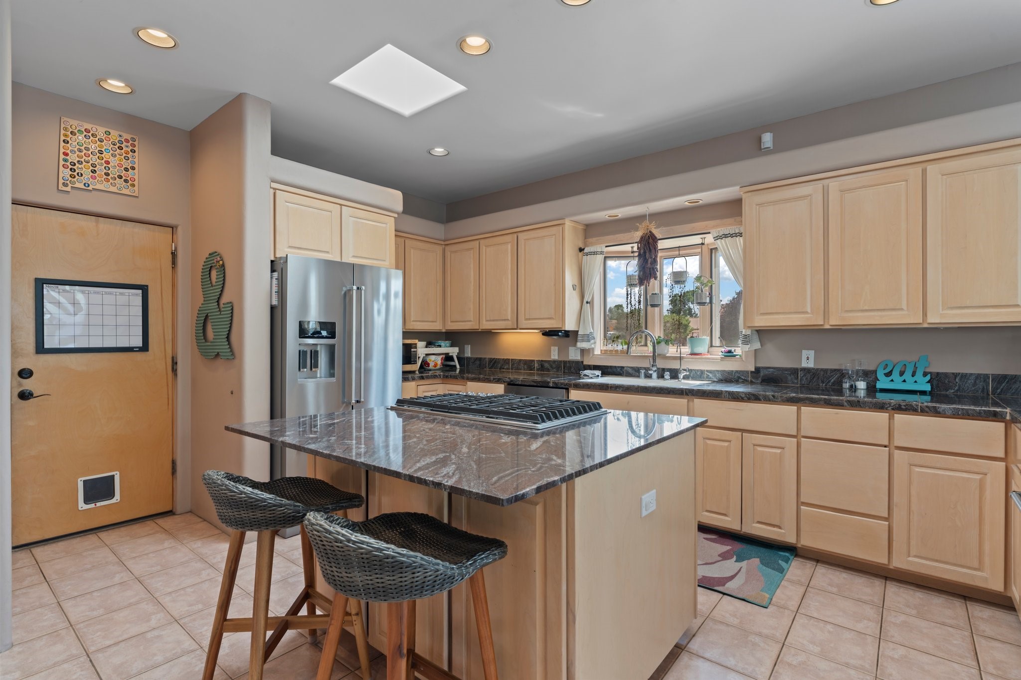 Welcome to your private sanctuary nestled on nearly a fifth of an acre of beautifully landscaped grounds, where comfort meets thoughtful design and timeless charm. This expansive 2,859 sq ft home, complemented by a detached 293 sq ft studio and a 308 sq ft storage space, offers exceptional versatility for modern living.Step inside to discover a spacious two-level layout designed with privacy and flow in mind. The main level is an entertainer's dream, featuring a light-filled chef's kitchen with granite countertops, a large center island, and newer appliances. The open dining area flows effortlessly into the family room with the living room just to the right of the front door, creating an inviting space for gatherings or quiet evenings at home. A full bath and a private bedroom on this level add convenience and flexibility for guests or a home office.Downstairs, you'll find the luxurious primary suite, where a spectacularly remodeled bathroom and expansive walk-in closet provide a serene retreat. Two additional well-appointed bedrooms, a stylish updated bathroom, and a conveniently located laundry room complete the lower level.Outside, the magic continues. The backyard is a peaceful haven with lush shade trees, a romantic sitting area, and a charming outdoor corner fireplace--perfect for alfresco evenings under the stars. Whether you're hosting guests or enjoying a quiet morning coffee, this outdoor space is designed to inspire.Additional highlights include a newer 4-year-old TPO roof, recently updated stucco, upgraded Pella picture windows, and a two-car garage with easy access to the kitchen.Don't miss this amazing home convenient to all things Santa Fe!