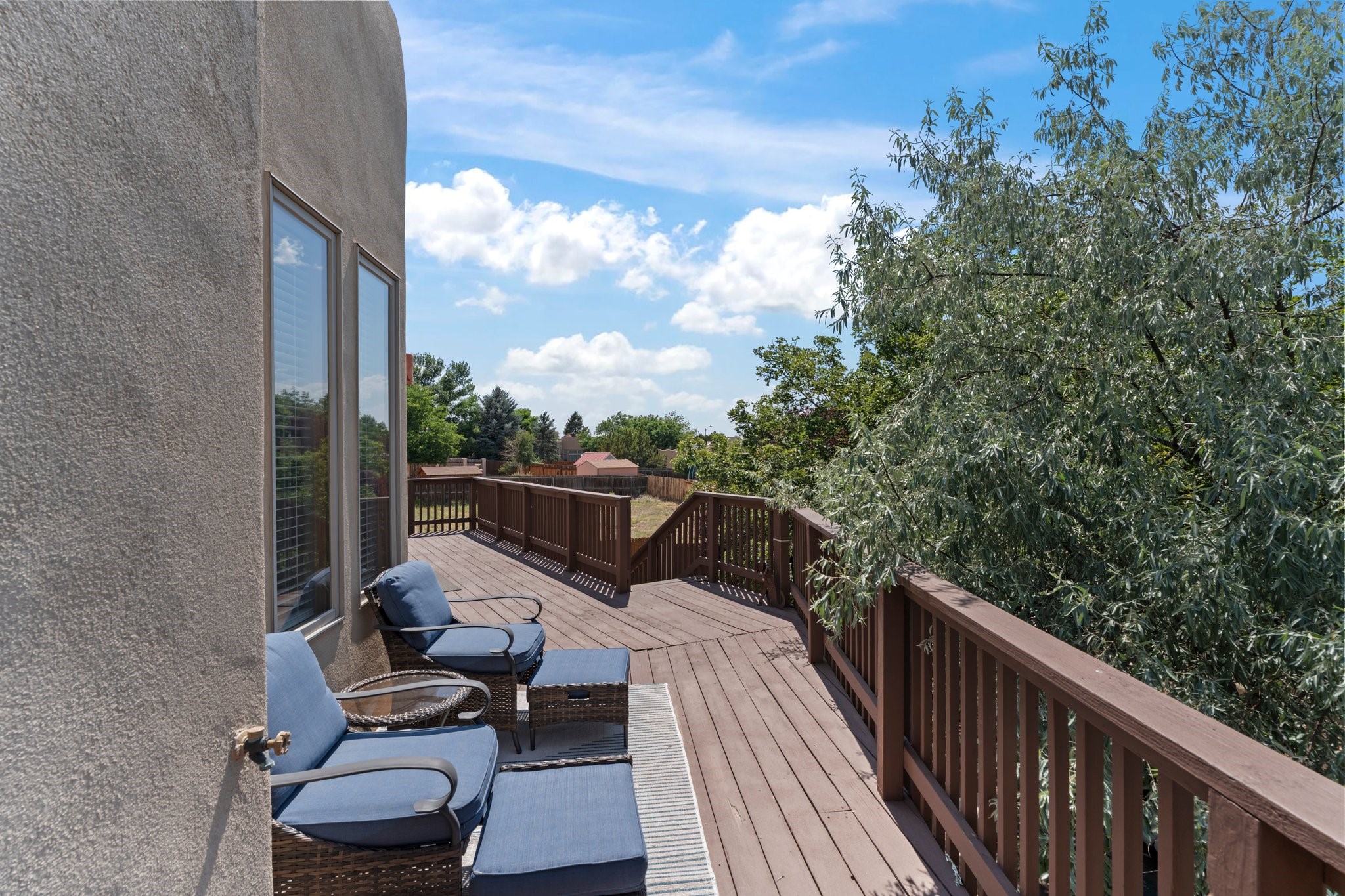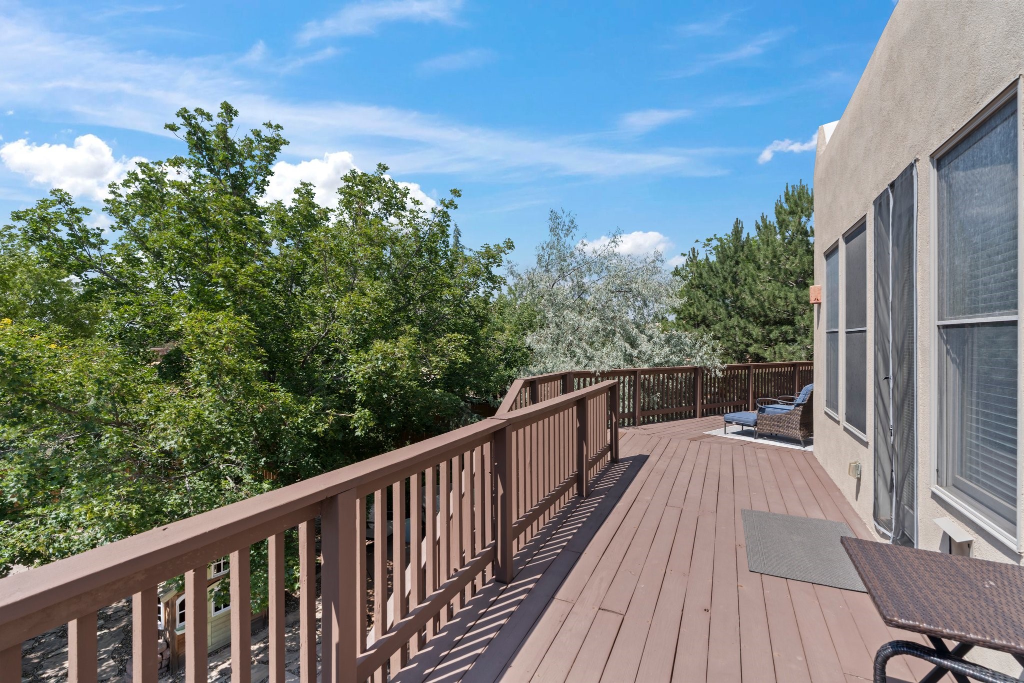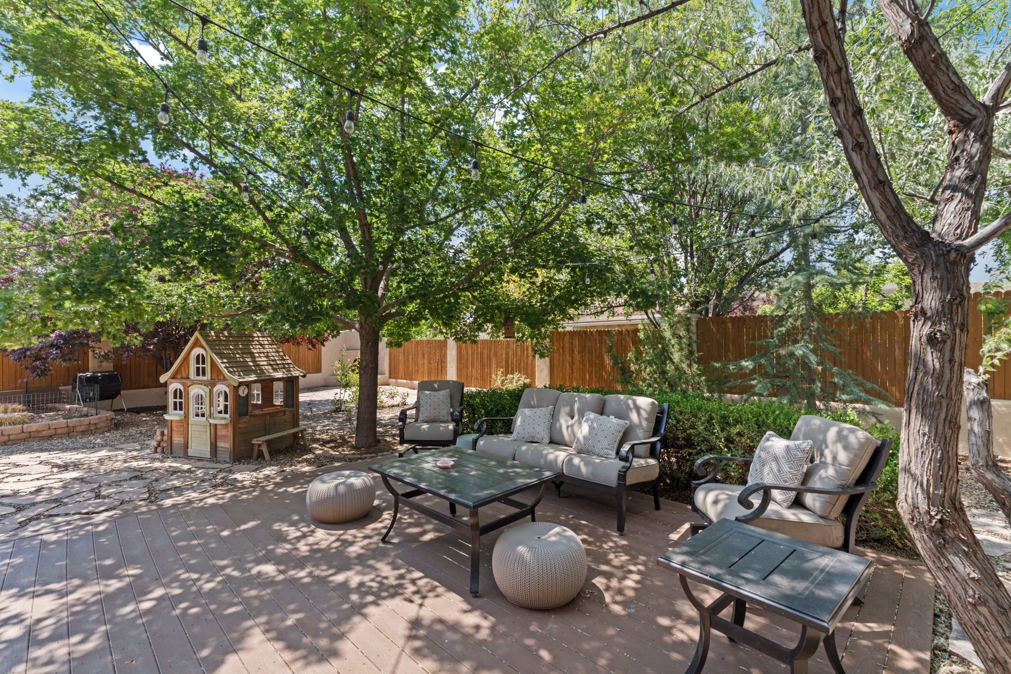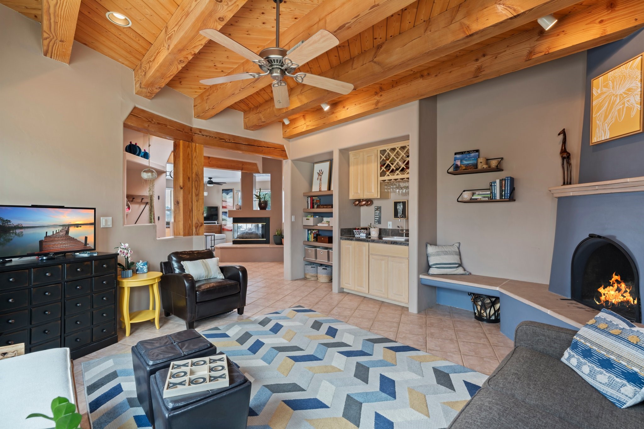 Welcome to your private sanctuary nestled on nearly a fifth of an acre of beautifully landscaped grounds, where comfort meets thoughtful design and timeless charm. This expansive 2,859 sq ft home, complemented by a detached 293 sq ft studio and a 308 sq ft storage space, offers exceptional versatility for modern living.Step inside to discover a spacious two-level layout designed with privacy and flow in mind. The main level is an entertainer's dream, featuring a light-filled chef's kitchen with granite countertops, a large center island, and newer appliances. The open dining area flows effortlessly into the family room with the living room just to the right of the front door, creating an inviting space for gatherings or quiet evenings at home. A full bath and a private bedroom on this level add convenience and flexibility for guests or a home office.Downstairs, you'll find the luxurious primary suite, where a spectacularly remodeled bathroom and expansive walk-in closet provide a serene retreat. Two additional well-appointed bedrooms, a stylish updated bathroom, and a conveniently located laundry room complete the lower level.Outside, the magic continues. The backyard is a peaceful haven with lush shade trees, a romantic sitting area, and a charming outdoor corner fireplace--perfect for alfresco evenings under the stars. Whether you're hosting guests or enjoying a quiet morning coffee, this outdoor space is designed to inspire.Additional highlights include a newer 4-year-old TPO roof, recently updated stucco, upgraded Pella picture windows, and a two-car garage with easy access to the kitchen.Don't miss this amazing home convenient to all things Santa Fe!