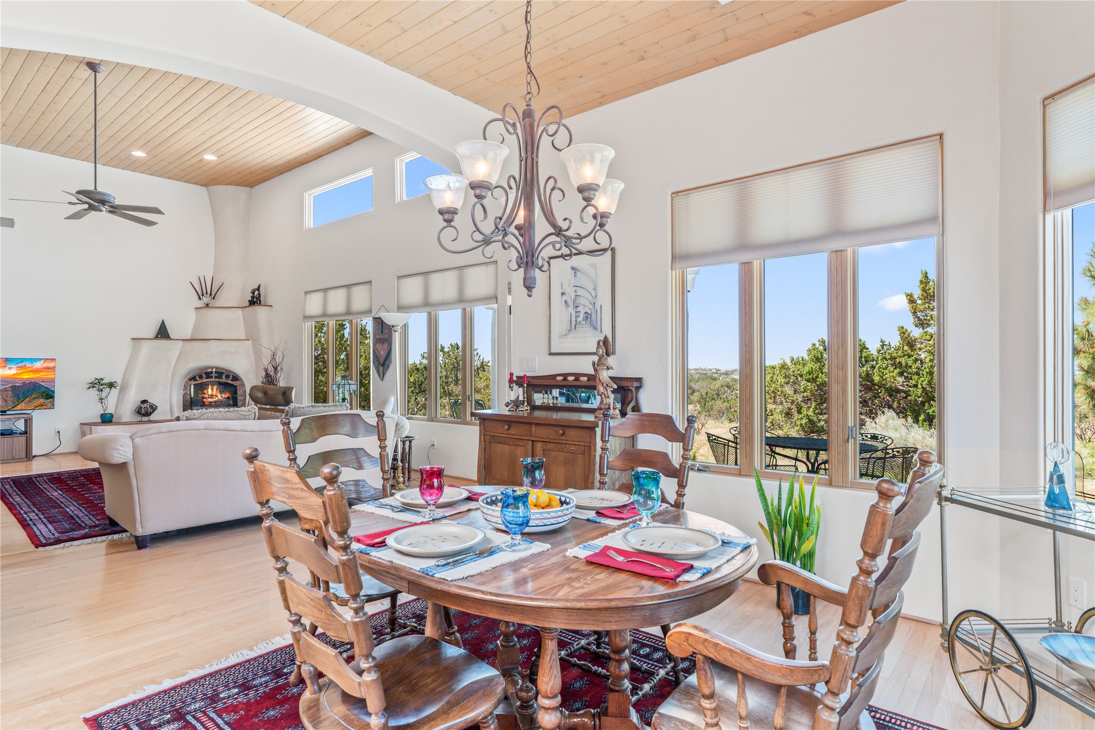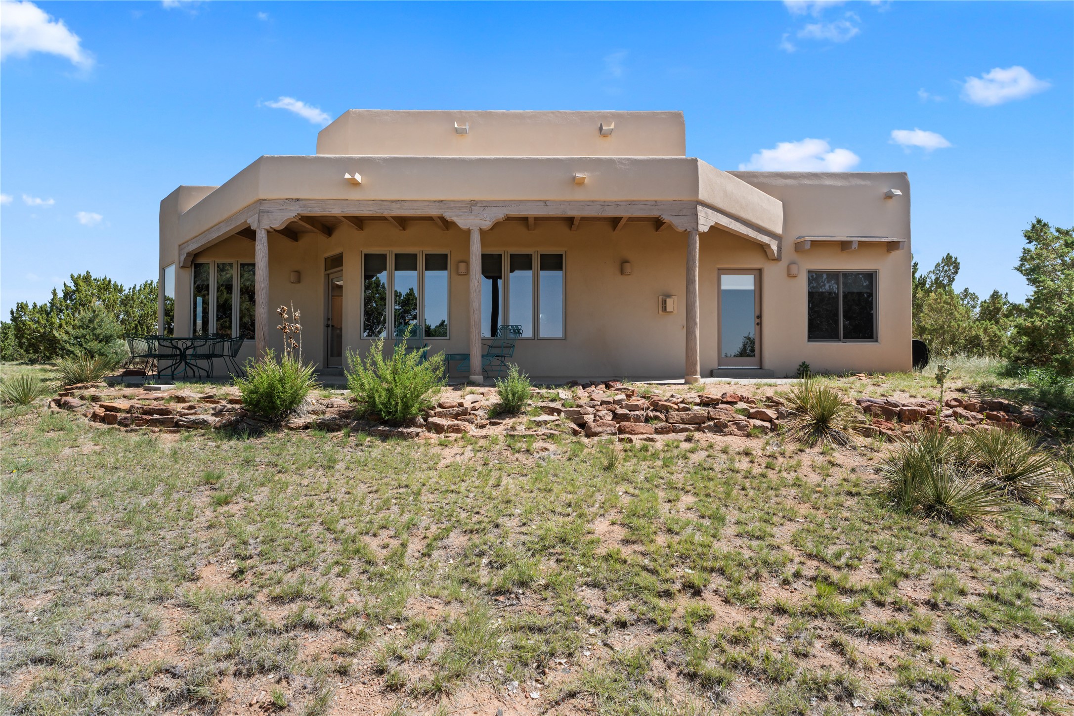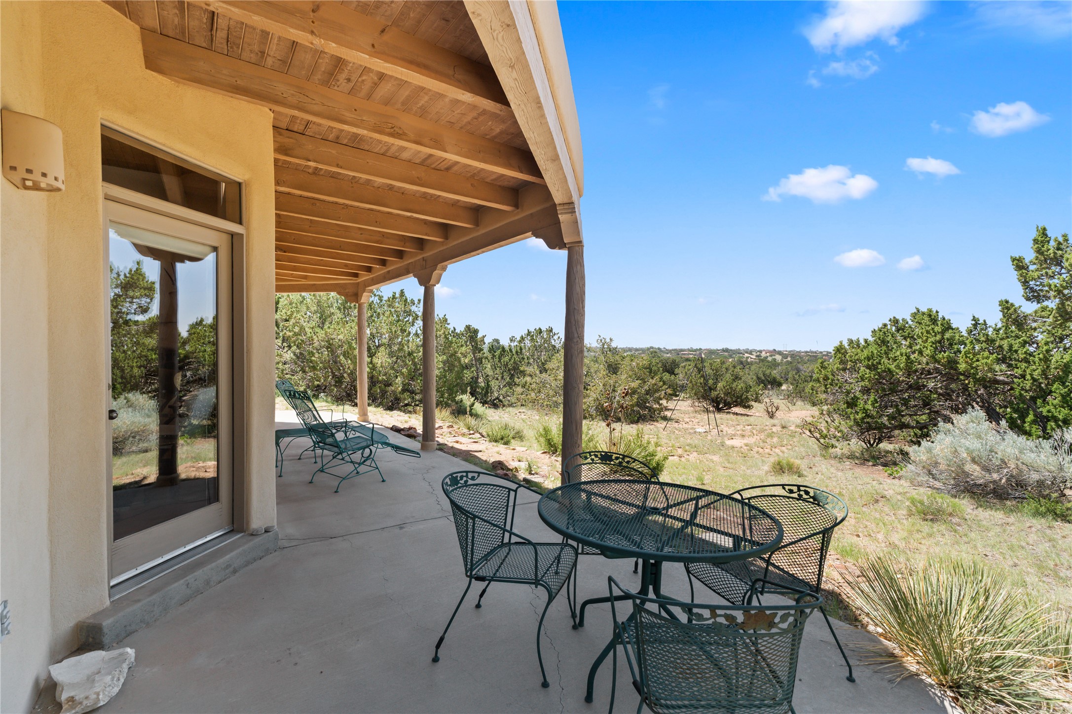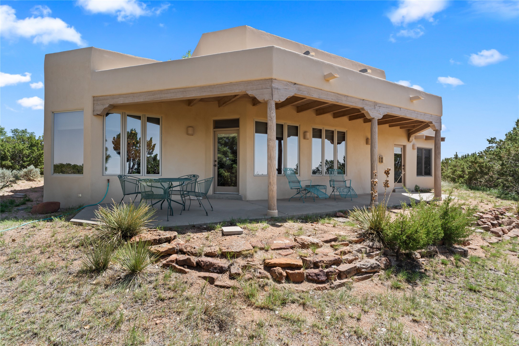 FIRST TIME ON THE MARKET! Gorgeous custom one-owner home sited high on a cul-de-sac for wonderful mountain views. Beautiful great room with sculpted handmade kiva fireplace and 14' cedar plank ceilings. Brand new stainless appliances including range, refrigerator, dishwasher, washer, dryer, microwave and kitchen sink. Kitchen opens to dining and living room with an island for an extra work area. Spacious pantry. Primary suite has exterior access, jetted tub, separate shower, double sinks and walk-in closet. Forced air heating and refrigerated air. Backs up to open space. PRIVATE WELL. This home has ample storage. Water heater and HVAC new in 2022. South-facing windows have UV coating to protect furniture. NO STEPS. NO CARPET. NO KITEC. NO WATER BILL. Property has been pre-inspected and most repairs completed. Report available on request.