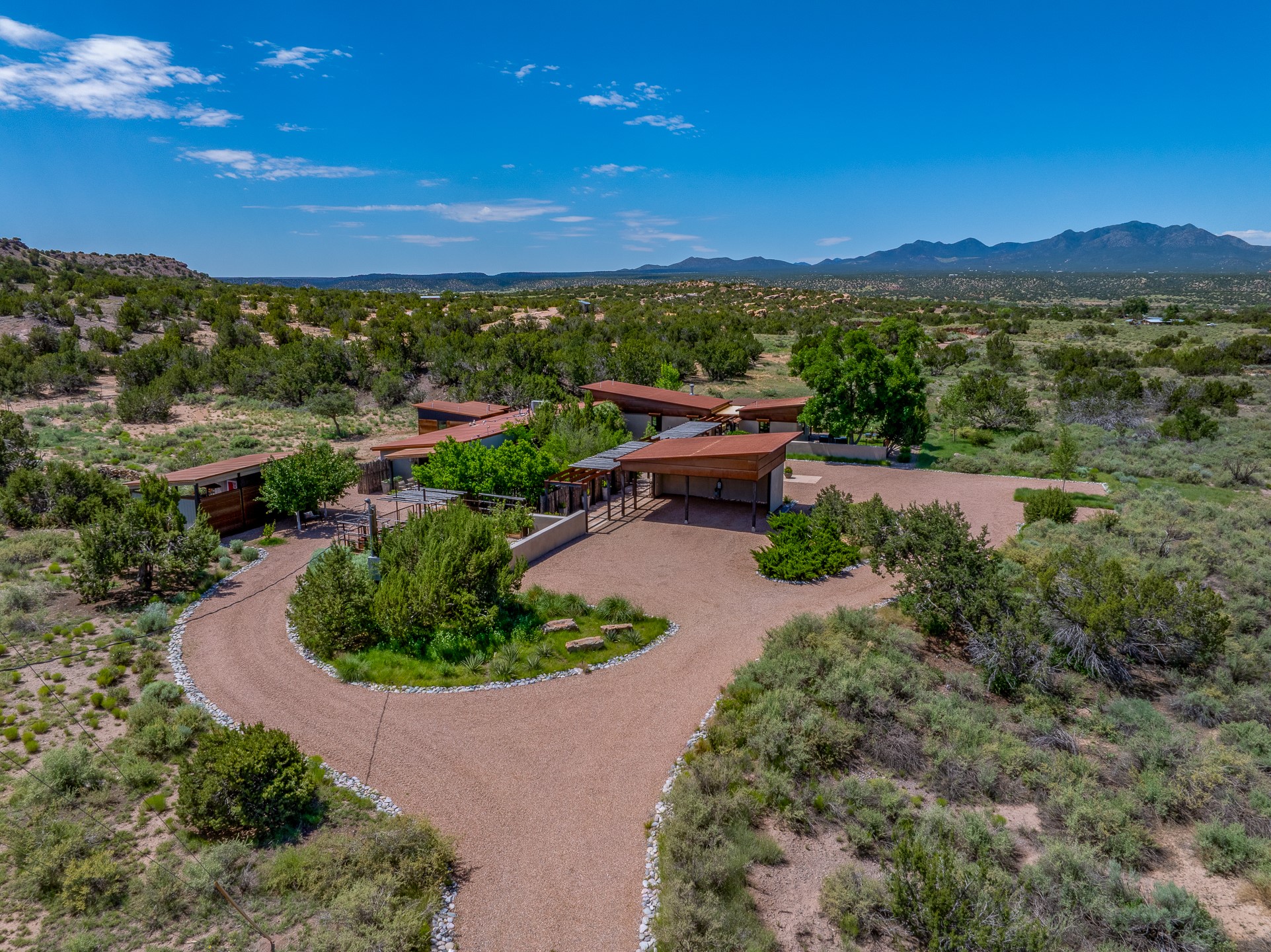 Architect-Designed Sanctuary on 44 Acres with Sweeping Ortiz Mountain ViewsSet on 44 pristine acres in the heart of Garden of the Gods rock formations, this architect-designed home is a striking fusion of form, function, and landscape. Completed in 2019 by its architect-owners, the residence reflects a deep sensitivity to place - modern in its lines, yet timeless in its connection to the land and its mesmerizing views of the Ortiz Mountains.The layout offers both simplicity and flexibility, with two bedrooms and a third space perfectly suited for a guest suite, office, or creative studio. Every detail is intentional--custom built-ins and integrated storage maintain clean lines without sacrificing utility. Expansive ceilings and precisely placed windows draw in natural light and frame breathtaking panoramas from nearly every room. The chef's kitchen is a showpiece of design and performance, anchored by a La Cornue range, Sub-Zero refrigerator and freezer, and Miele dishwasher. Raked German oak cabinetry and honed Taj Mahal marble countertops offer a warm, sculptural backdrop for both cooking and gathering. The primary suite is a peaceful retreat, complete with a spa-like bath featuring a Caldara salt-water hot tub, a custom walnut vanity with black Caesarstone counters, and a beautifully crafted walk-in shower. Seamless indoor-outdoor living defines the home. A welcoming entry courtyard, stone patios and covered areas extend the living space, perfectly oriented for sunrise coffee and sunset gatherings. A custom water feature adds a meditative element and is fed by a 12,000 gallon rain-catchment system that also supports the landscaping and garden irrigation. A 52-inch propane firepit, built-in pizza oven, and drought-tolerant yet lush landscaping complete the inviting feel of the exterior spaces. A 21 gal/min private well ensures abundant, high-quality water. A fenced and irrigated raised-bed vegetable garden/orchard and equipment/tractor workshop are adjacent to the 2 car carport (with EV car charger). The perimeter of the acreage is fenced and offers a perfect setting for equestrian facilities, including over two miles of scenic private riding/hiking trails that wind through rolling high desert terrain. An adjacent 20 acre parcel is also available for those seeking even more space and privacy. Rarely does a property of this architectural caliber and ecological sensitivity come to market. This is an extraordinary opportunity to own a soulful, design-forward retreat in one of Northern New Mexico's most scenic and serene settings. Only 10 minutes to Madrid and 20 minutes to Santa Fe.