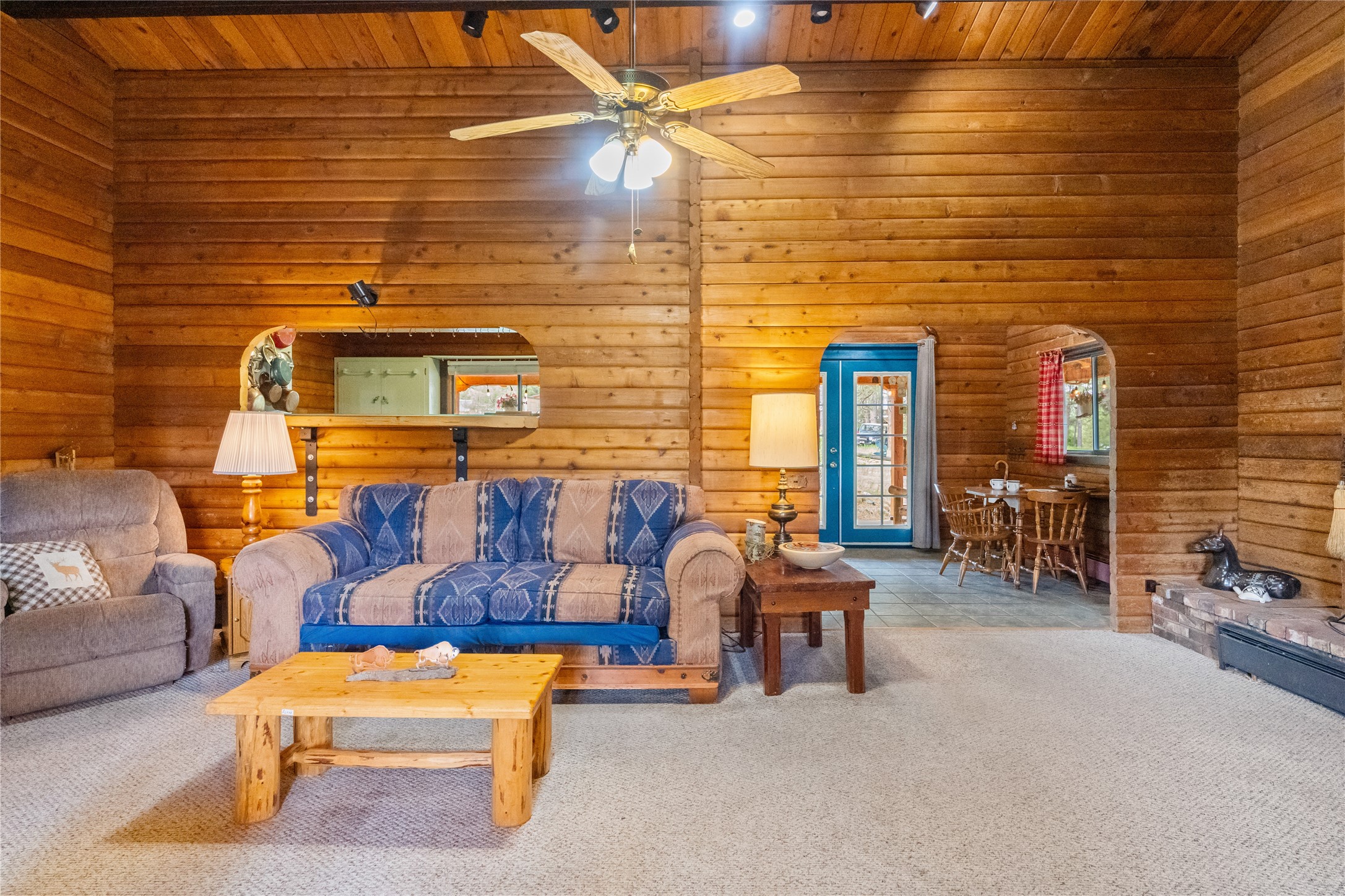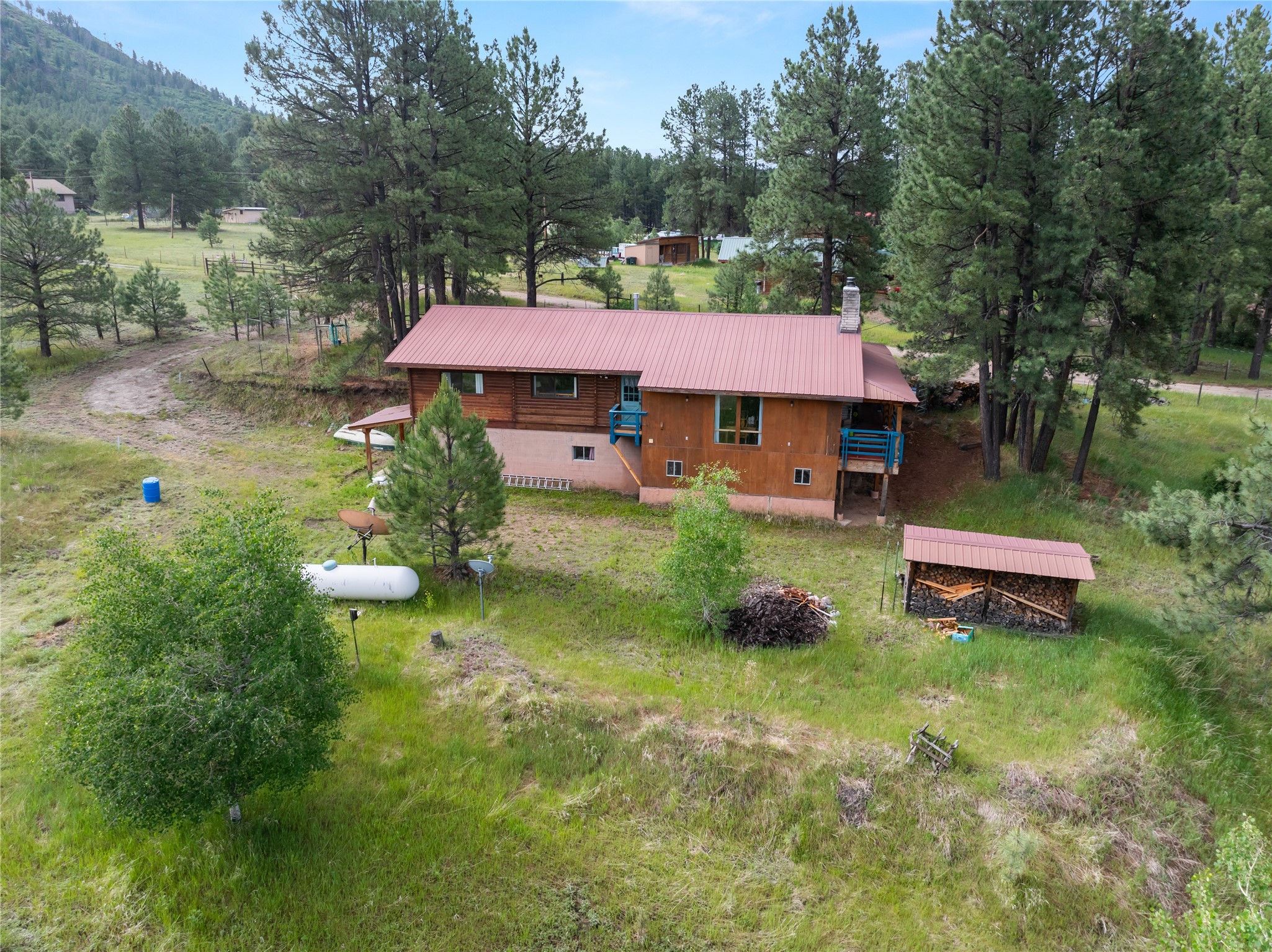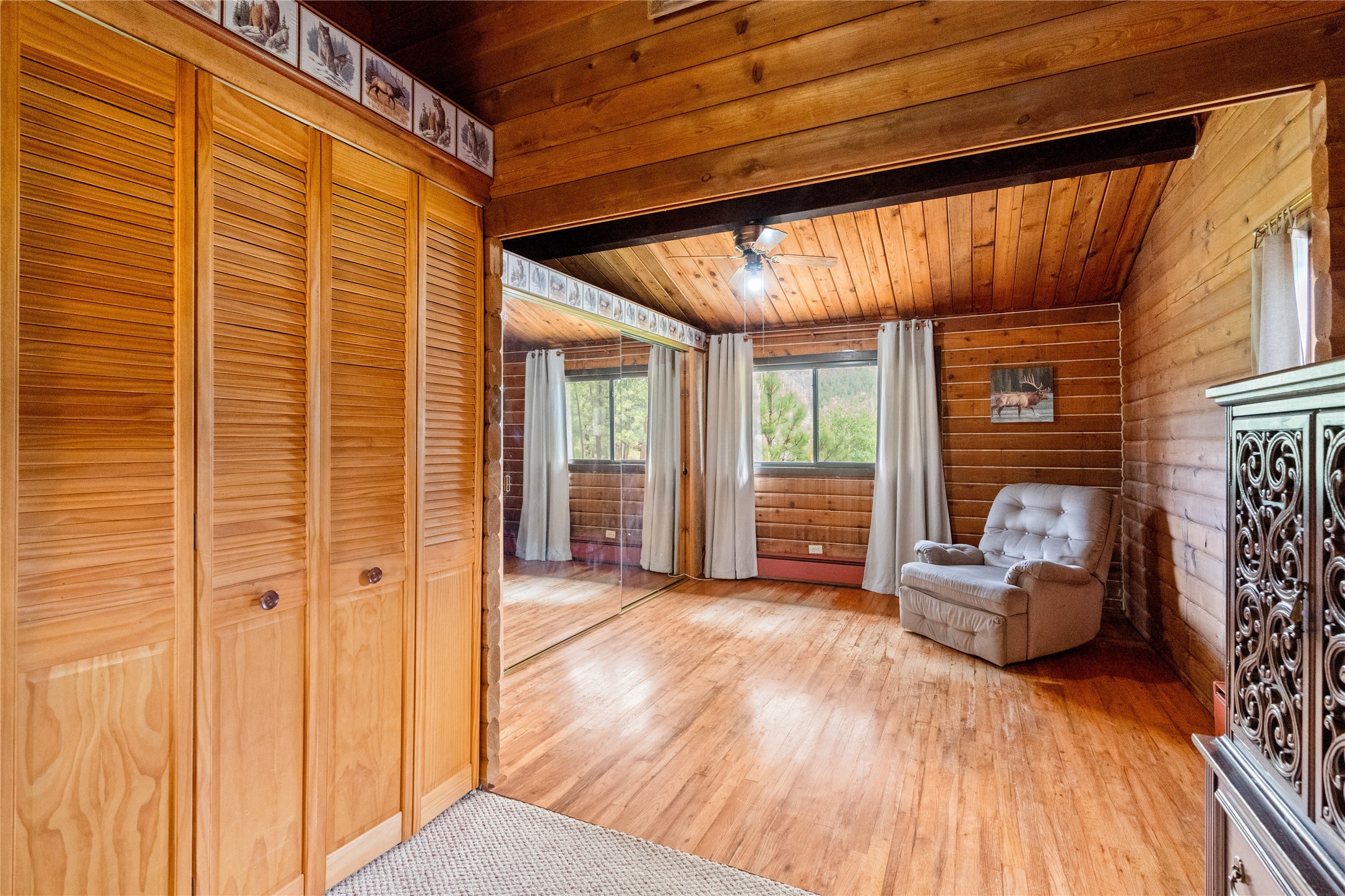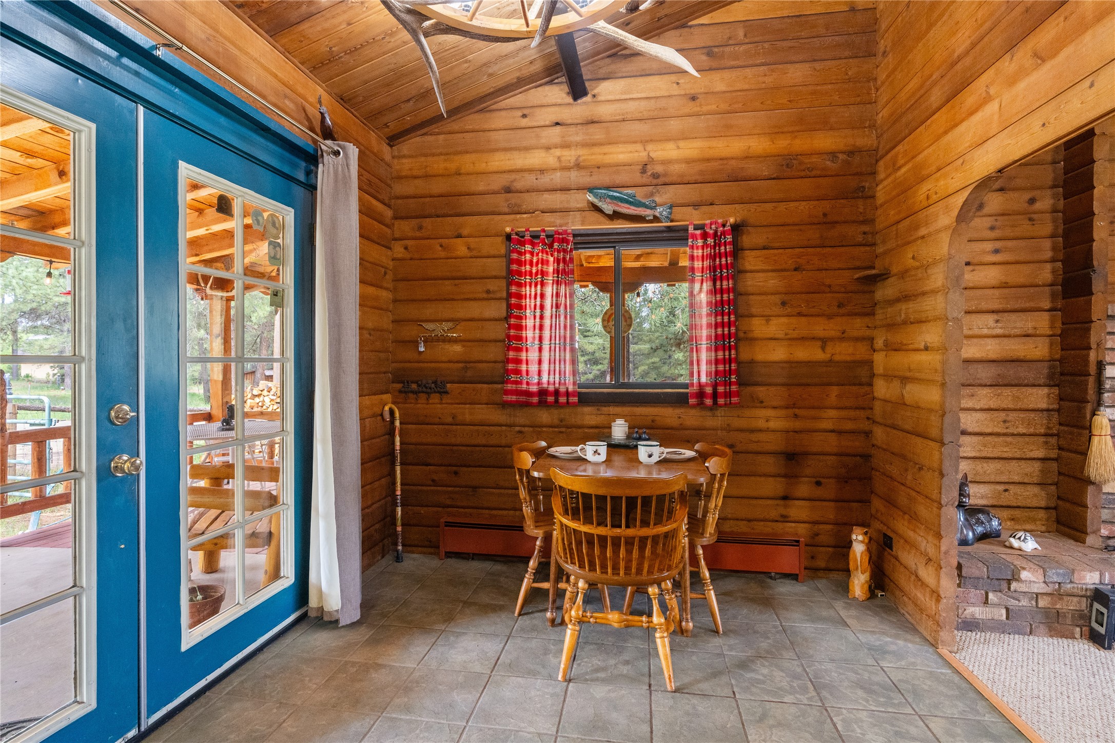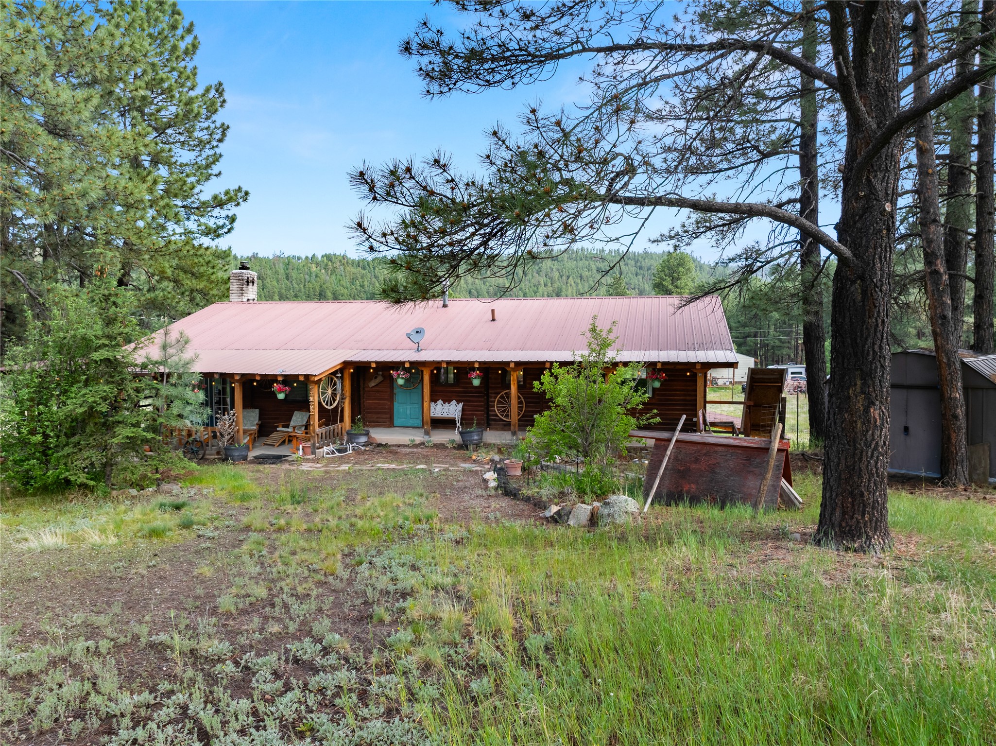 Lucky enough to live in the mountains...then you're lucky enough! This 2-bedroom, 1-bath 2,219 sq ft log cabin on 1.2 acres in La Cueva is the perfect spot! Originally a 3-bedroom, one room was opened up to expand the primary suite--but it could easily be converted back. The fabulous Panabode cabin with its interlocking log design blends modern living with traditional. From the wagon wheel-antler chandelier to the arched doorways & rustic warm interiors, the cedar tongue-&-groove cathedral wood ceiling, & the inviting rocking chair wrap-around covered porch, every detail enhances the home's irresistible charm! The spacious main bedroom is perfect to add in a cozy reading nook or office. Walk-out basement offers endless possibilities--finish it for extra bedrooms or a rec room or keep it as a workshop. You won't find a better location for a sweet weekend getaway or a full-time residence!