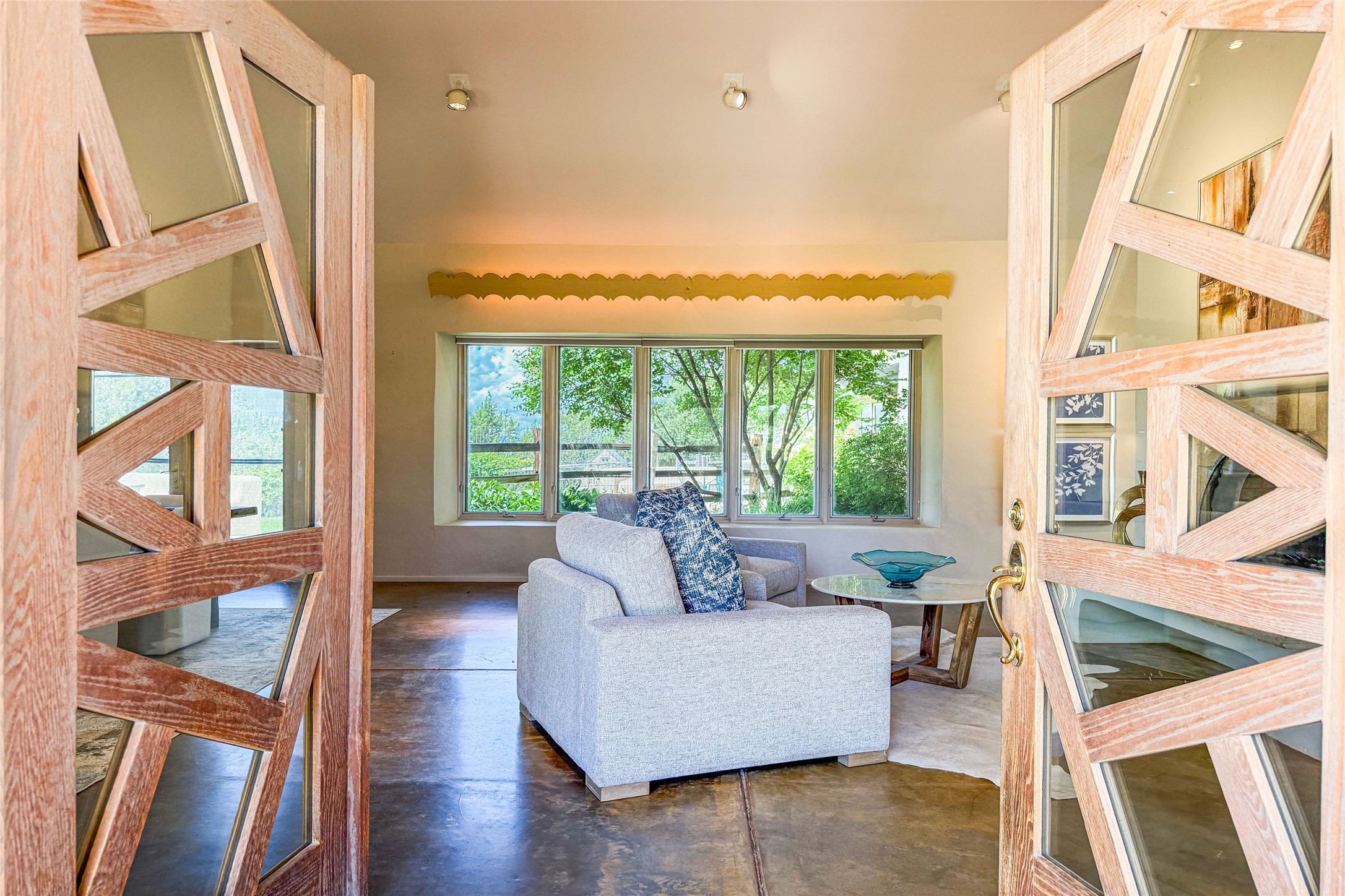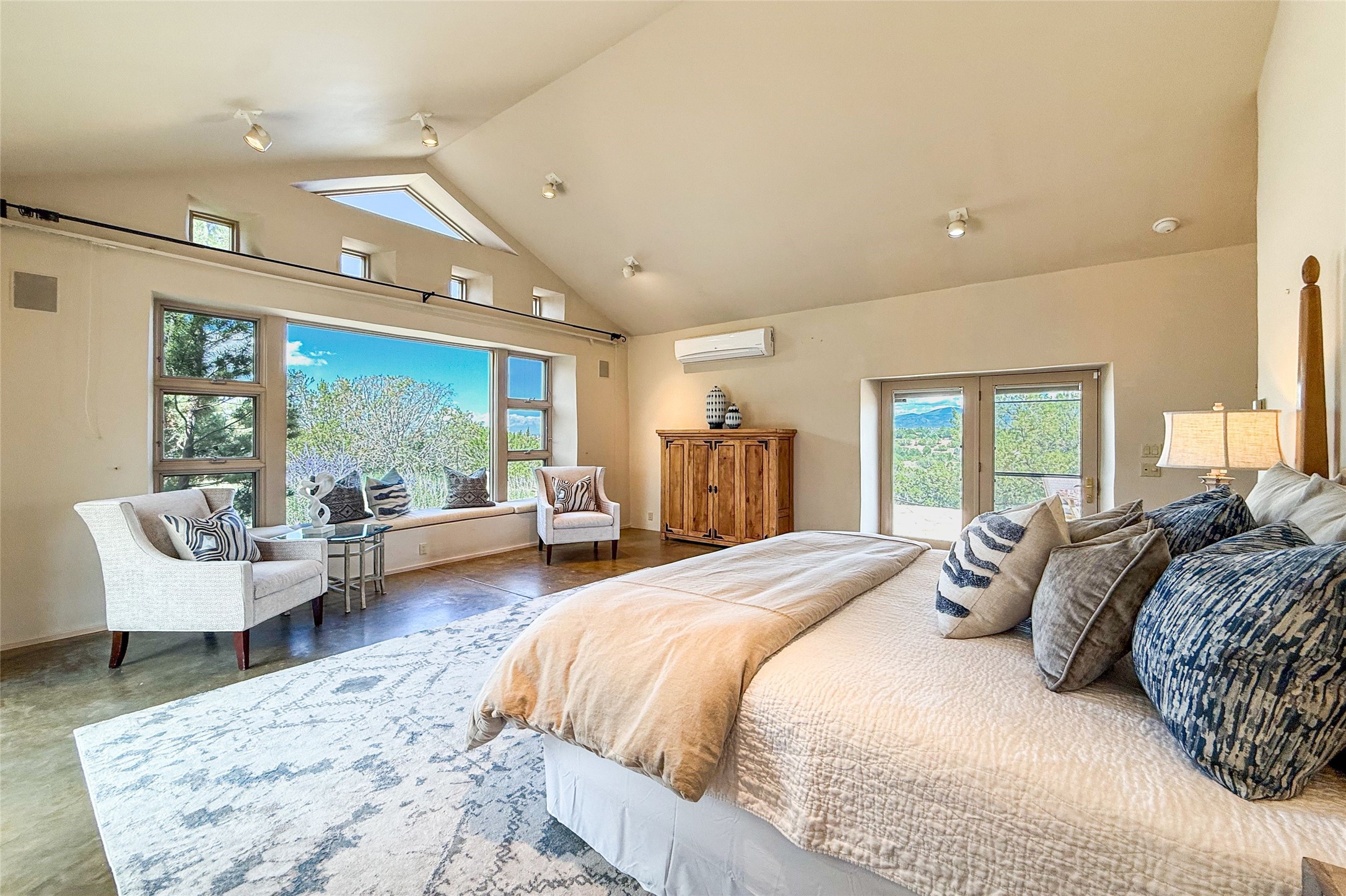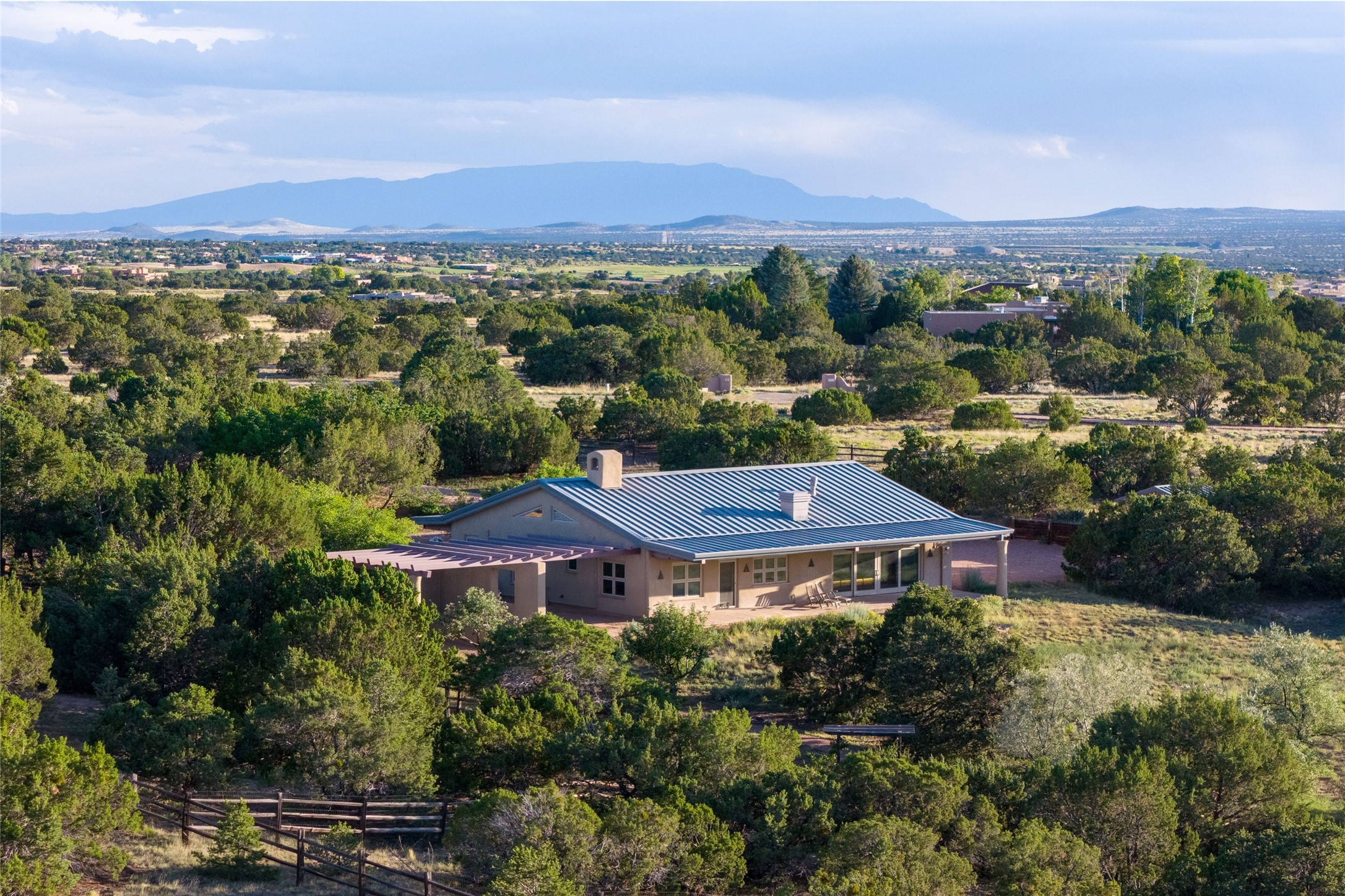 This serene La Tierra Nueva compound, with three distinct residences totaling 7,341 sq. feet of living space. Designed by renowned architect, Lila DeWindt, this lush oasis boasts mature landscaping in a serene, country-like setting with Sangre and Jemez mountain views, 11.85 acres, and vegetable and perennial gardens. The 3,982 sq. foot single level main residence features a blend of timeless Northern NM and modern design, a dramatic high-pitched roof, double-sided stone fireplace, copious natural light, andlarge windows that capture breathtaking Sangre views. With two sitting rooms, a media room and bedrooms that boast mountain views, this residence is truly stunning. Sitting in a bay window, the primary suite's tub overlooks a flower garden. An open-concept kitchen is centered around a large island, perfect for hosting.The home enjoys a portal and multiple patio spaces. The charming 1,334 sq. foot, two bedroom guest house includes a full kitchen, Saltillo tile flooring, a wood-burning stove, large windows, and wrap-around porch. The impressive 2,025 sq footmodern 1-bedroom studio has an open living/dining/kitchen area, and portal. The adult rec-room, with built-in bar, is ideal as live/work space, artist studio/music room, car enthusiast or convert to a barn. Perfect for large gatherings and relaxing with sunset Jemez views. Beneath the studio, lays a remarkable walk-in wine cellar for approx. 5000 bottles with wine tasting area. The property also includes a generous fenced dog area and room for horses.A truly peaceful, secluded atmosphere just 18 minutes from the heart of Santa Fe or the airport, and 8 minutes to The Club at Las Campanas. La Tierra Nueva is a coveted, gated, equestrian-friendly community with access to over 60,000 acres BLM land, and tennis/pickleball court. Ideal for multigenerational living, a large family, or patron of the arts, 7 Goodnight Trail West is a true hidden gem.