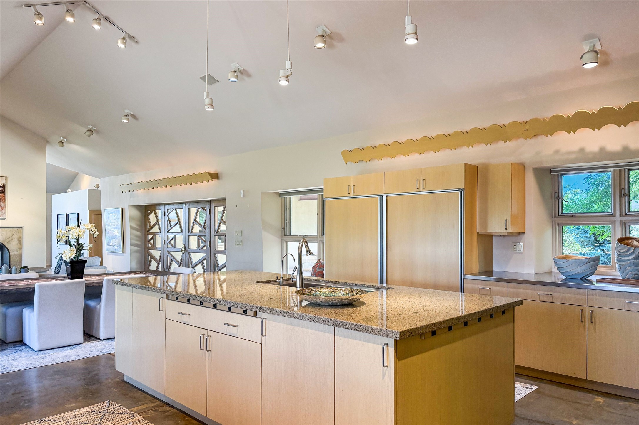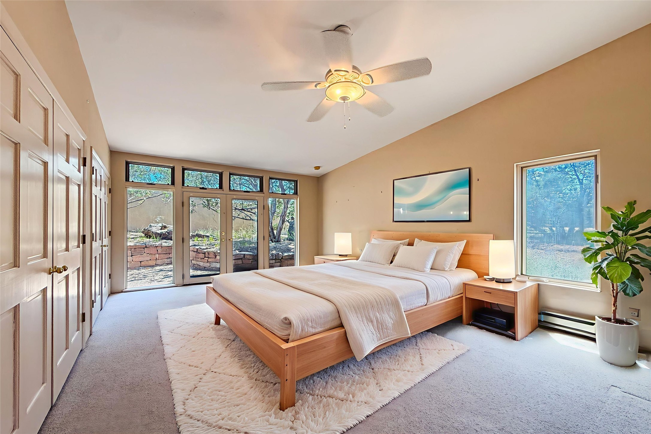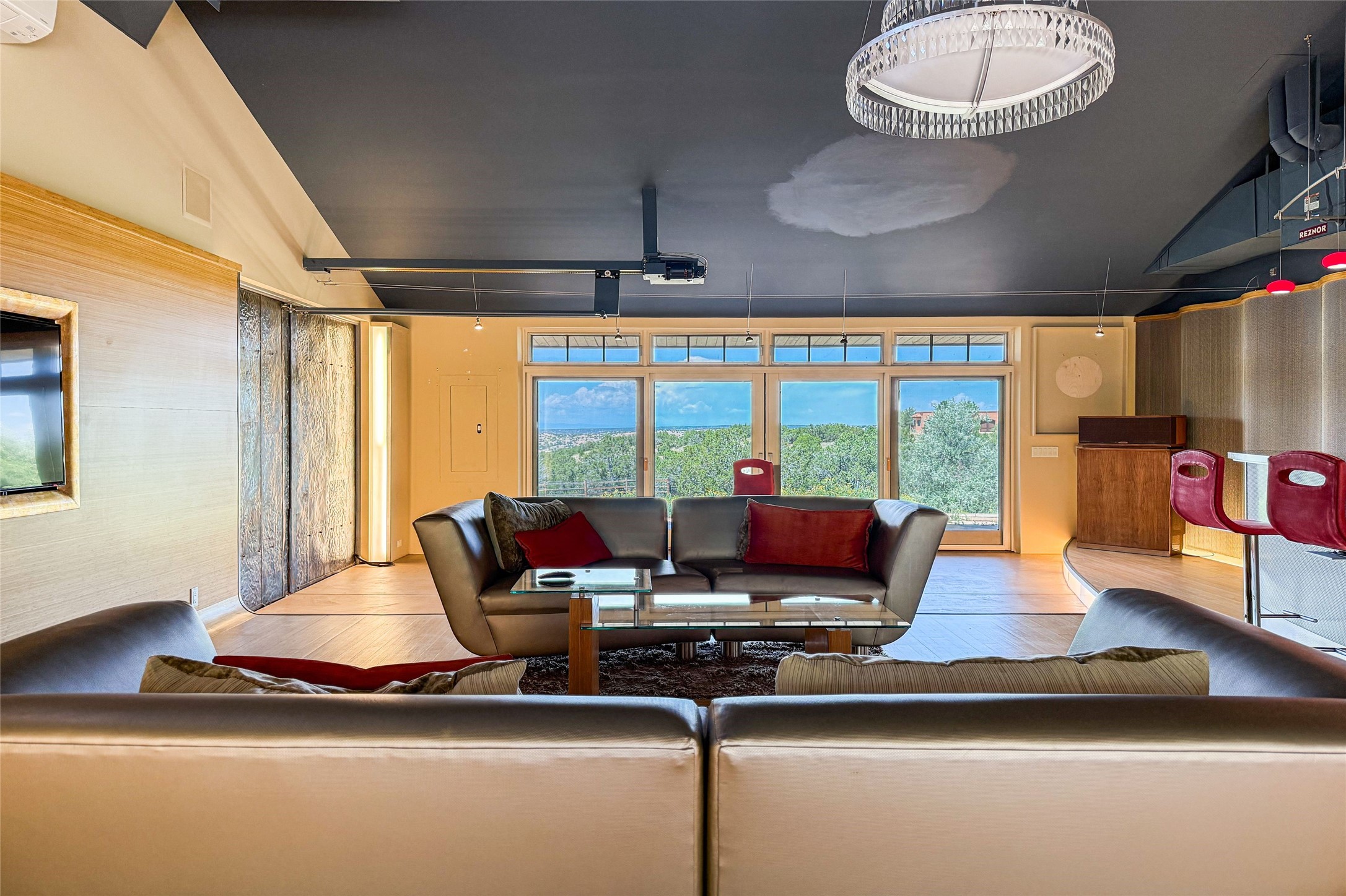 This serene La Tierra Nueva compound, with three distinct residences totaling 7,341 sq. feet of living space. Designed by renowned architect, Lila DeWindt, this lush oasis boasts mature landscaping in a serene, country-like setting with Sangre and Jemez mountain views, 11.85 acres, and vegetable and perennial gardens. The 3,982 sq. foot single level main residence features a blend of timeless Northern NM and modern design, a dramatic high-pitched roof, double-sided stone fireplace, copious natural light, andlarge windows that capture breathtaking Sangre views. With two sitting rooms, a media room and bedrooms that boast mountain views, this residence is truly stunning. Sitting in a bay window, the primary suite's tub overlooks a flower garden. An open-concept kitchen is centered around a large island, perfect for hosting.The home enjoys a portal and multiple patio spaces. The charming 1,334 sq. foot, two bedroom guest house includes a full kitchen, Saltillo tile flooring, a wood-burning stove, large windows, and wrap-around porch. The impressive 2,025 sq footmodern 1-bedroom studio has an open living/dining/kitchen area, and portal. The adult rec-room, with built-in bar, is ideal as live/work space, artist studio/music room, car enthusiast or convert to a barn. Perfect for large gatherings and relaxing with sunset Jemez views. Beneath the studio, lays a remarkable walk-in wine cellar for approx. 5000 bottles with wine tasting area. The property also includes a generous fenced dog area and room for horses.A truly peaceful, secluded atmosphere just 18 minutes from the heart of Santa Fe or the airport, and 8 minutes to The Club at Las Campanas. La Tierra Nueva is a coveted, gated, equestrian-friendly community with access to over 60,000 acres BLM land, and tennis/pickleball court. Ideal for multigenerational living, a large family, or patron of the arts, 7 Goodnight Trail West is a true hidden gem.