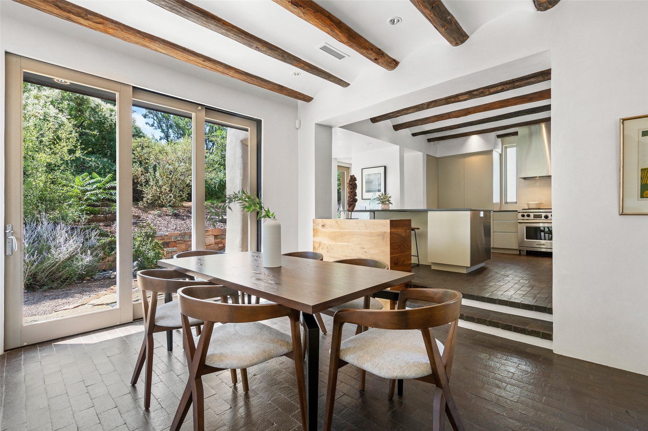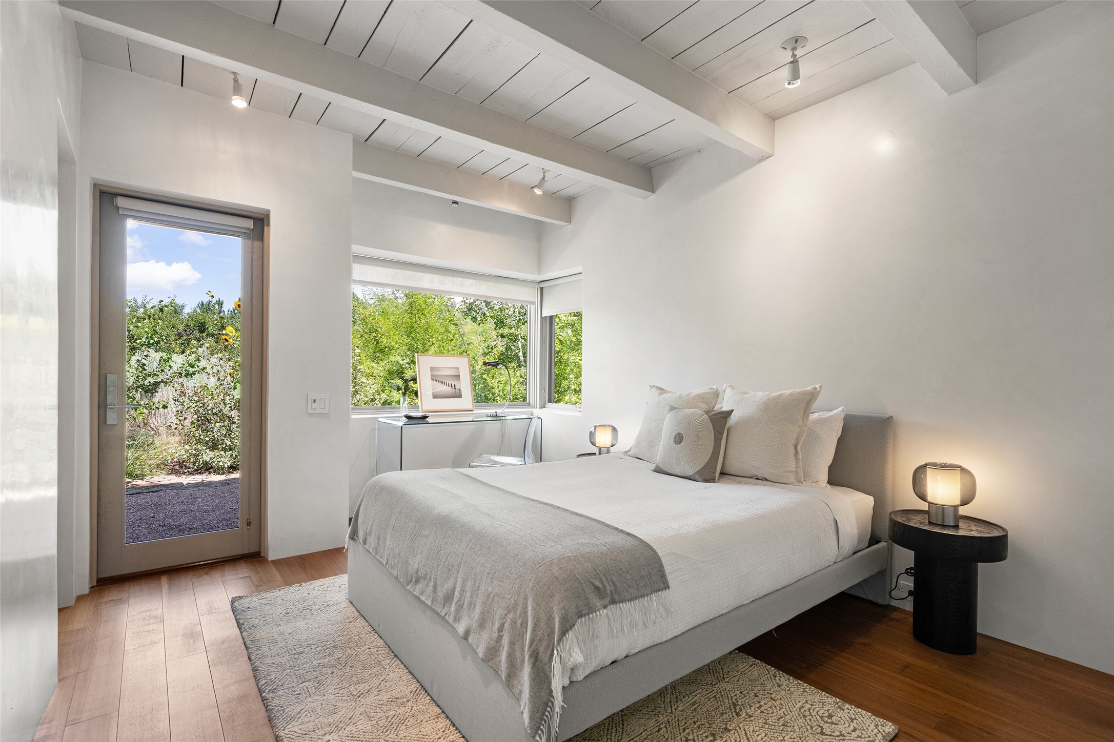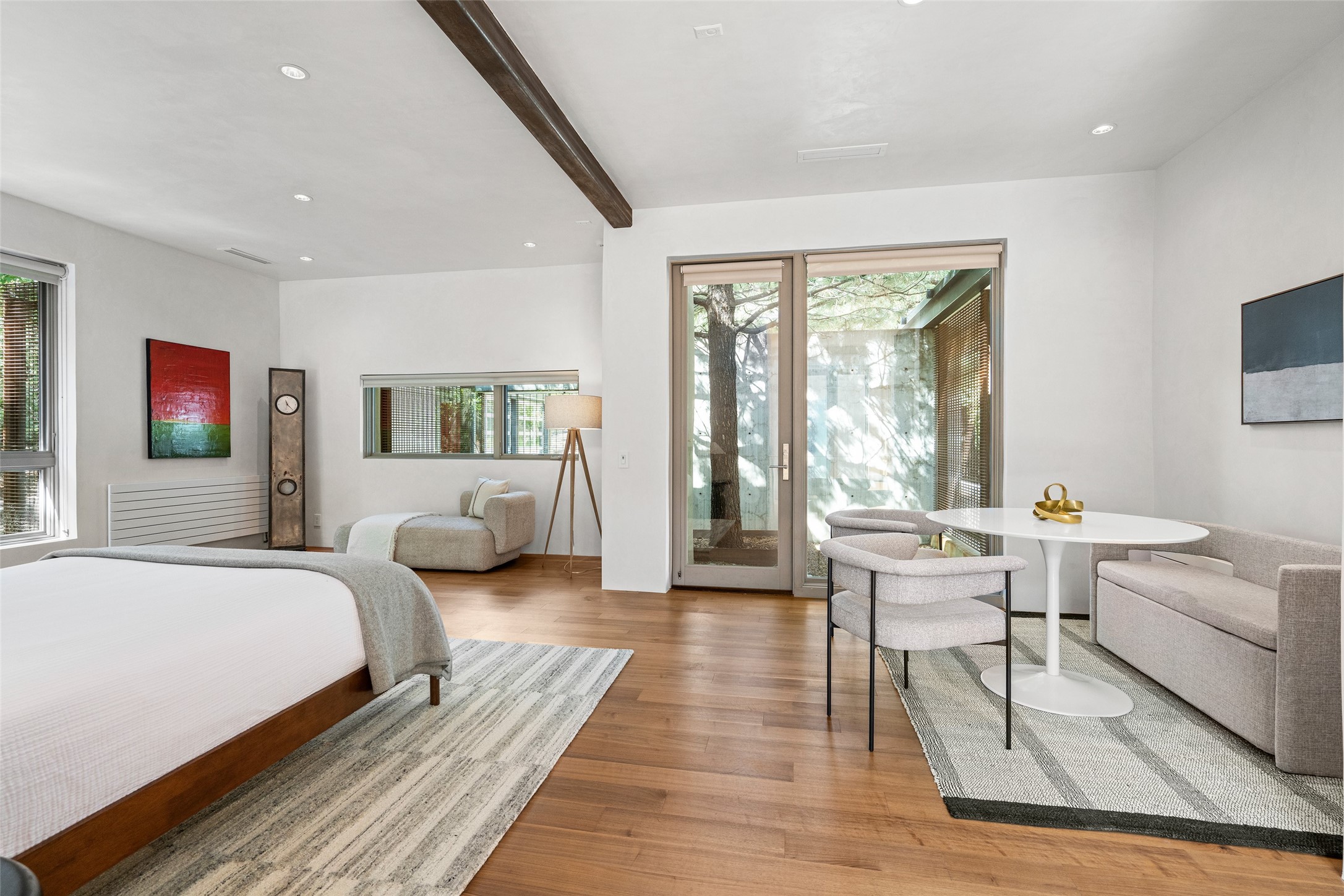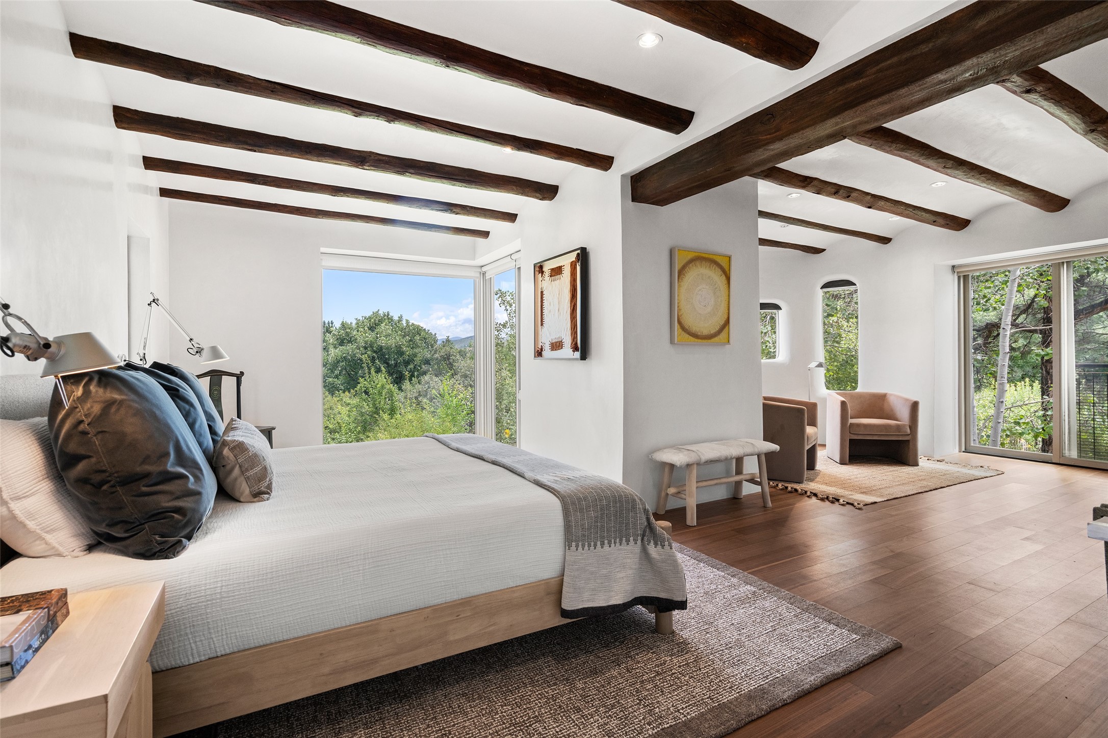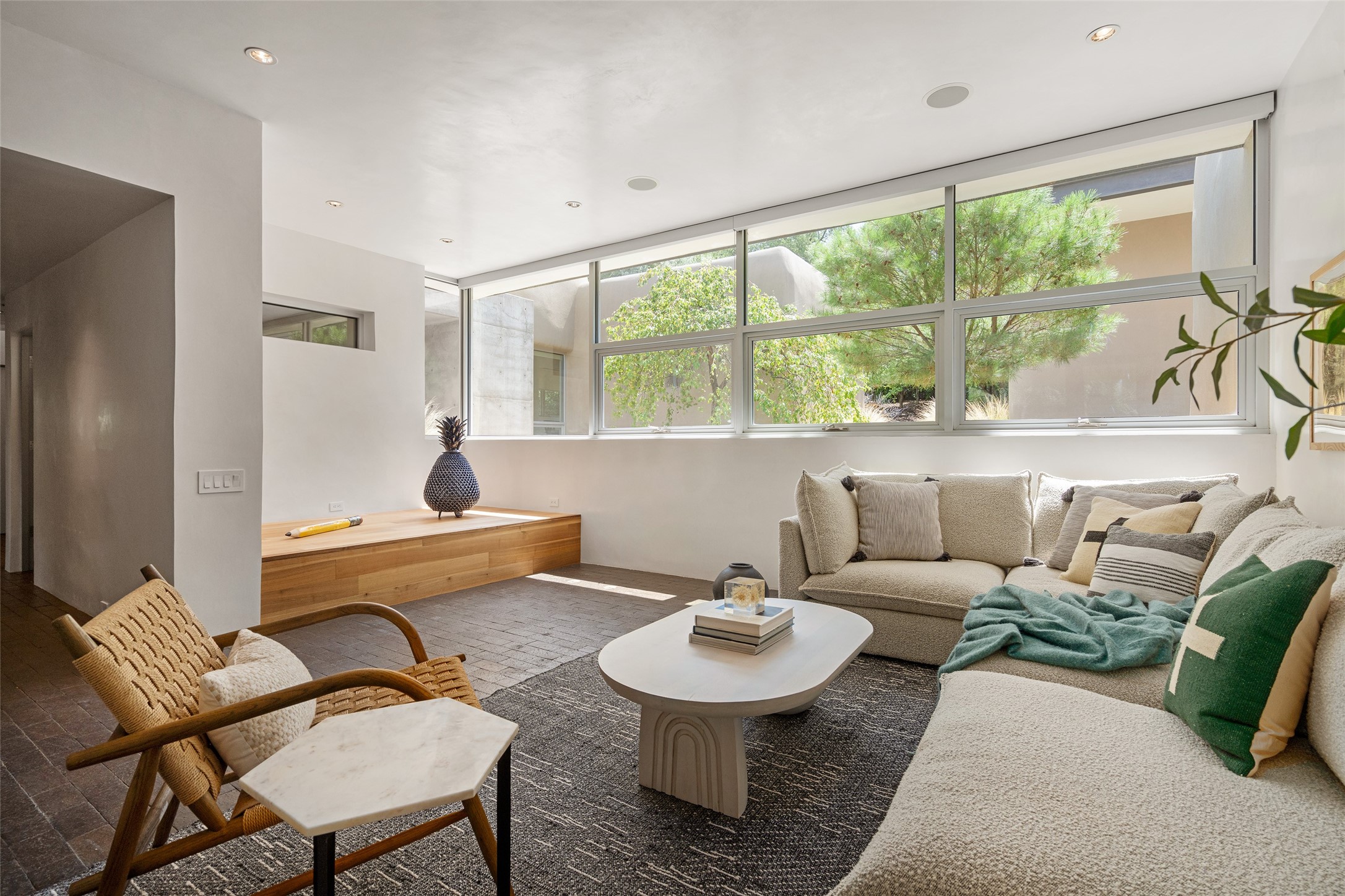 Set along one of Santa Fe's most iconic and sought-after streets, 535 Camino del Monte Sol is a masterful blend of historic authenticity and contemporary refinement. Nestled on a quiet, tree-lined lane just steps from the world-renowned Canyon Road, this exceptional residence offers a rare opportunity to experience the essence of Santa Fe's artistic and architectural heritage.Originally designed and occupied by renowned architect Bill Lumpkins and constructed in classic double adobe, the home has been thoughtfully reimagined by acclaimed designer Trey Jordan. The result is a warm, sophisticated sanctuary that honors its Southwest roots while embracing modern luxury. Passive solar design and timeless craftsmanship create an effortless harmony between beauty and functionality.Privately sited on 1.56 acres behind a gated entrance with a heated driveway and ample parking, the property feels like a hidden retreat. Lush gardens and fruit trees surround the home, blurring the lines between indoors and out, offering multiple tranquil spaces for relaxation and entertaining featuring a swimming pond and in-ground hot tub. A charming studio/casita adds versatility for guests, creative pursuits, or a private office.The gourmet kitchen is a chef's dream, featuring high-end Wolf and Miele appliances, custom cabinetry, and a thoughtful layout perfect for both everyday living and elegant entertaining. The spacious primary suite is a serene haven, complete with views of the Sangre de Cristo Mountains.This property is a premier Eastside sanctuary for those who desire it all -- elegance, comfort, and a coveted Santa Fe address. 535 Camino del Monte Sol is not just a home - it is a legacy.
