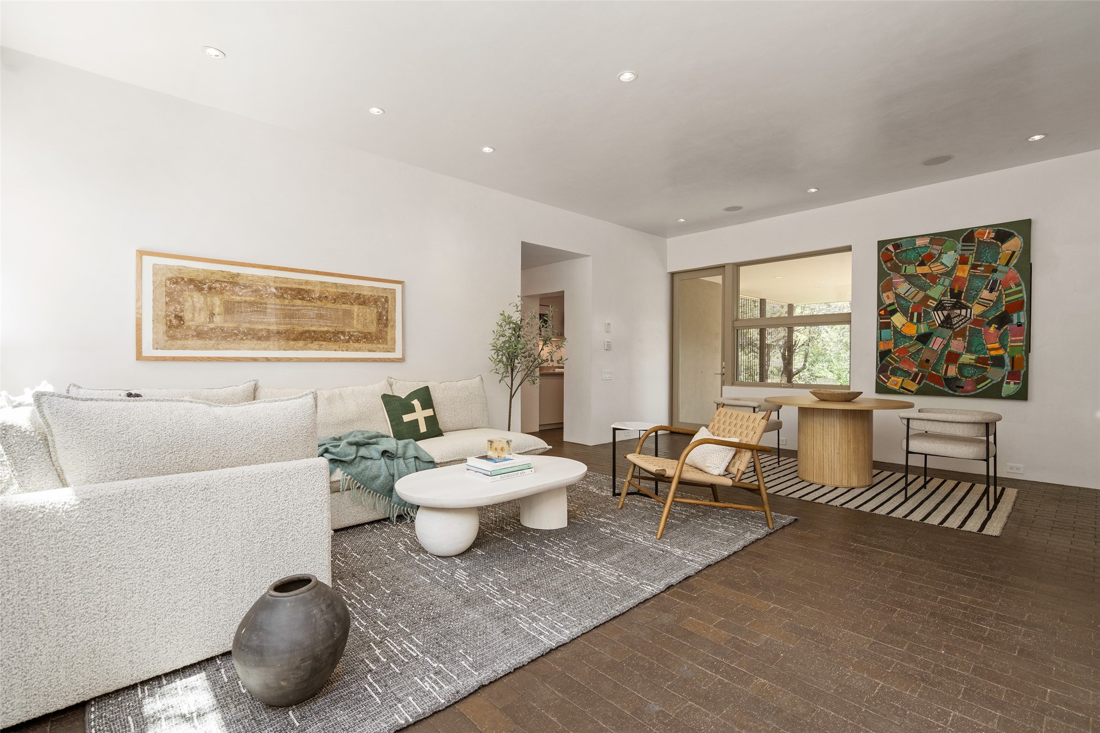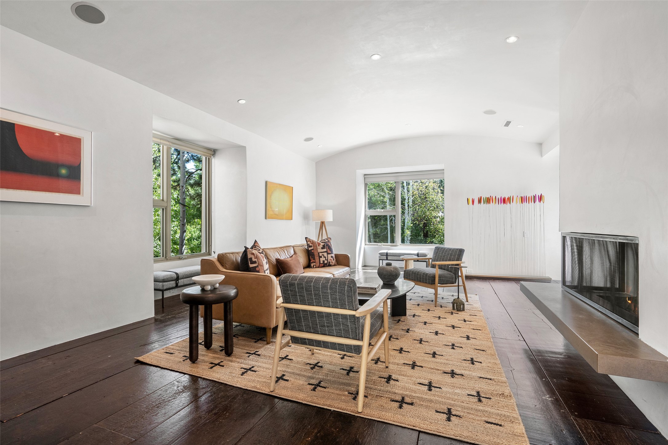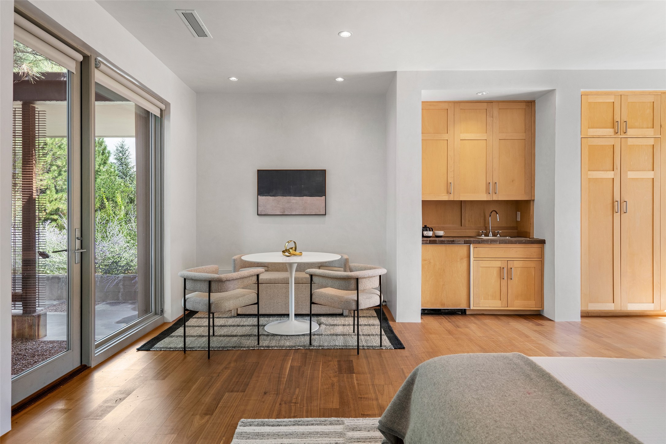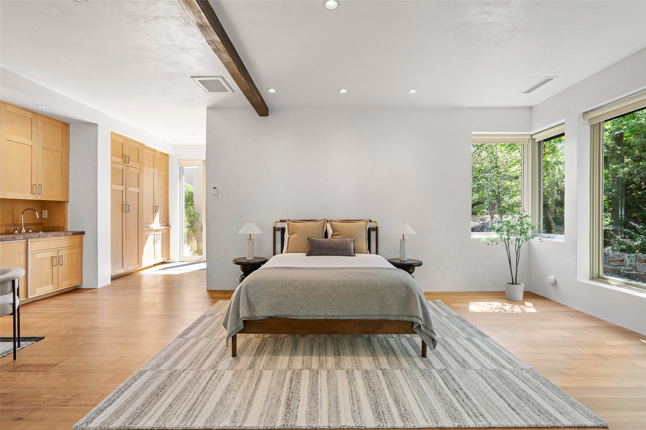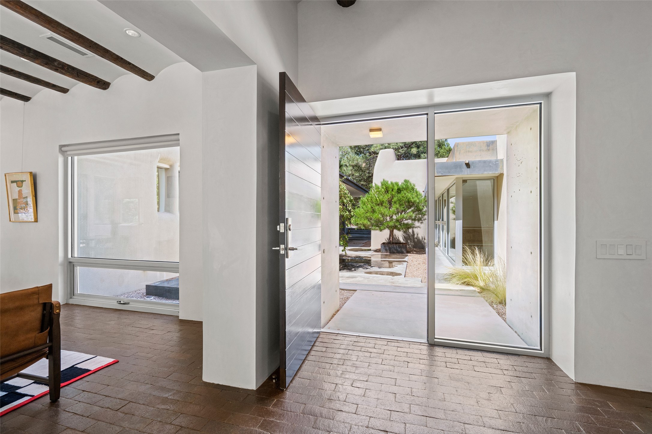 Set along one of Santa Fe's most iconic and sought-after streets, 535 Camino del Monte Sol is a masterful blend of historic authenticity and contemporary refinement. Nestled on a quiet, tree-lined lane just steps from the world-renowned Canyon Road, this exceptional residence offers a rare opportunity to experience the essence of Santa Fe's artistic and architectural heritage.Originally designed and occupied by renowned architect Bill Lumpkins and constructed in classic double adobe, the home has been thoughtfully reimagined by acclaimed designer Trey Jordan. The result is a warm, sophisticated sanctuary that honors its Southwest roots while embracing modern luxury. Passive solar design and timeless craftsmanship create an effortless harmony between beauty and functionality.Privately sited on 1.56 acres behind a gated entrance with a heated driveway and ample parking, the property feels like a hidden retreat. Lush gardens and fruit trees surround the home, blurring the lines between indoors and out, offering multiple tranquil spaces for relaxation and entertaining featuring a swimming pond and in-ground hot tub. A charming studio/casita adds versatility for guests, creative pursuits, or a private office.The gourmet kitchen is a chef's dream, featuring high-end Wolf and Miele appliances, custom cabinetry, and a thoughtful layout perfect for both everyday living and elegant entertaining. The spacious primary suite is a serene haven, complete with views of the Sangre de Cristo Mountains.This property is a premier Eastside sanctuary for those who desire it all -- elegance, comfort, and a coveted Santa Fe address. 535 Camino del Monte Sol is not just a home - it is a legacy.