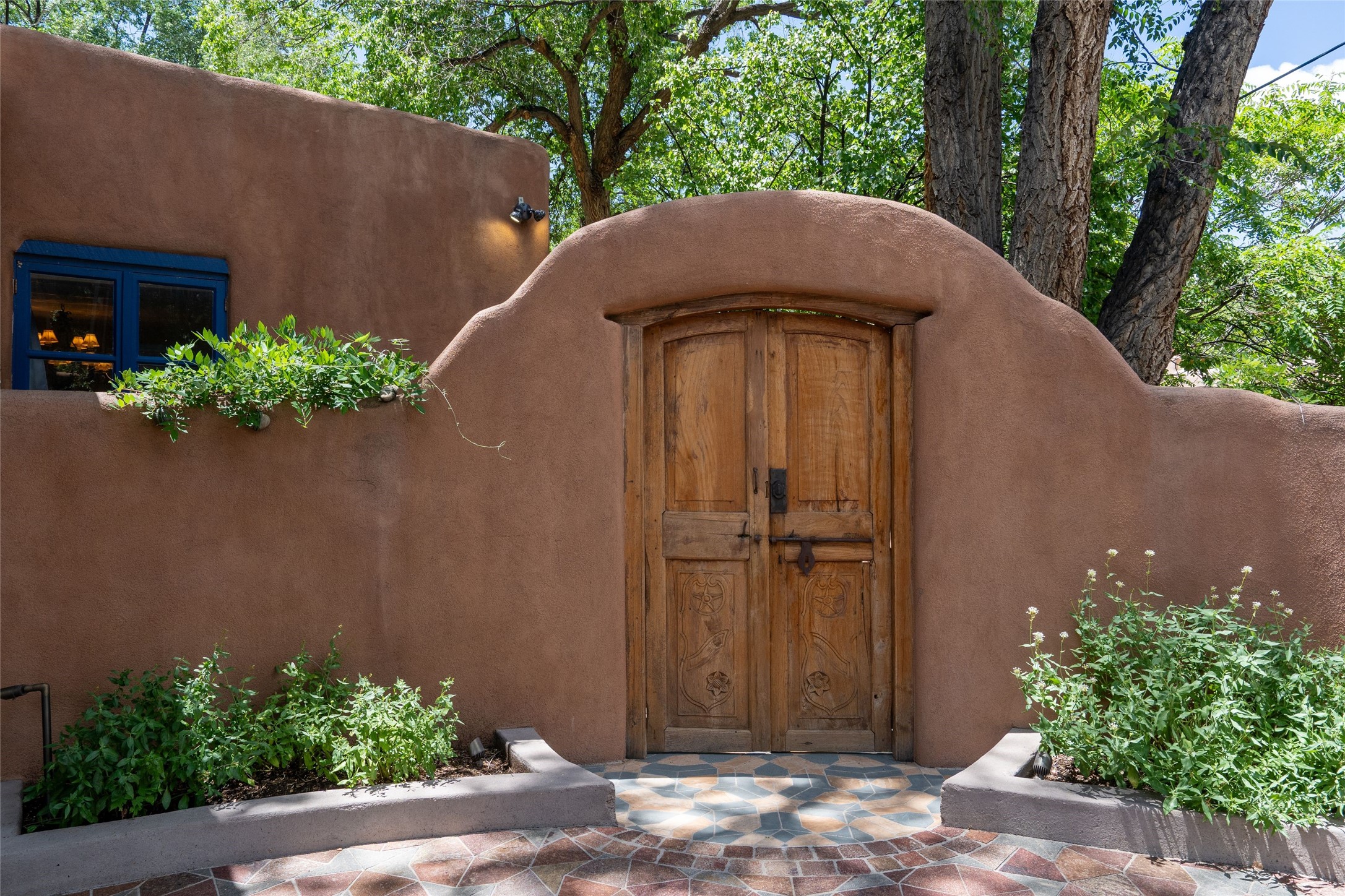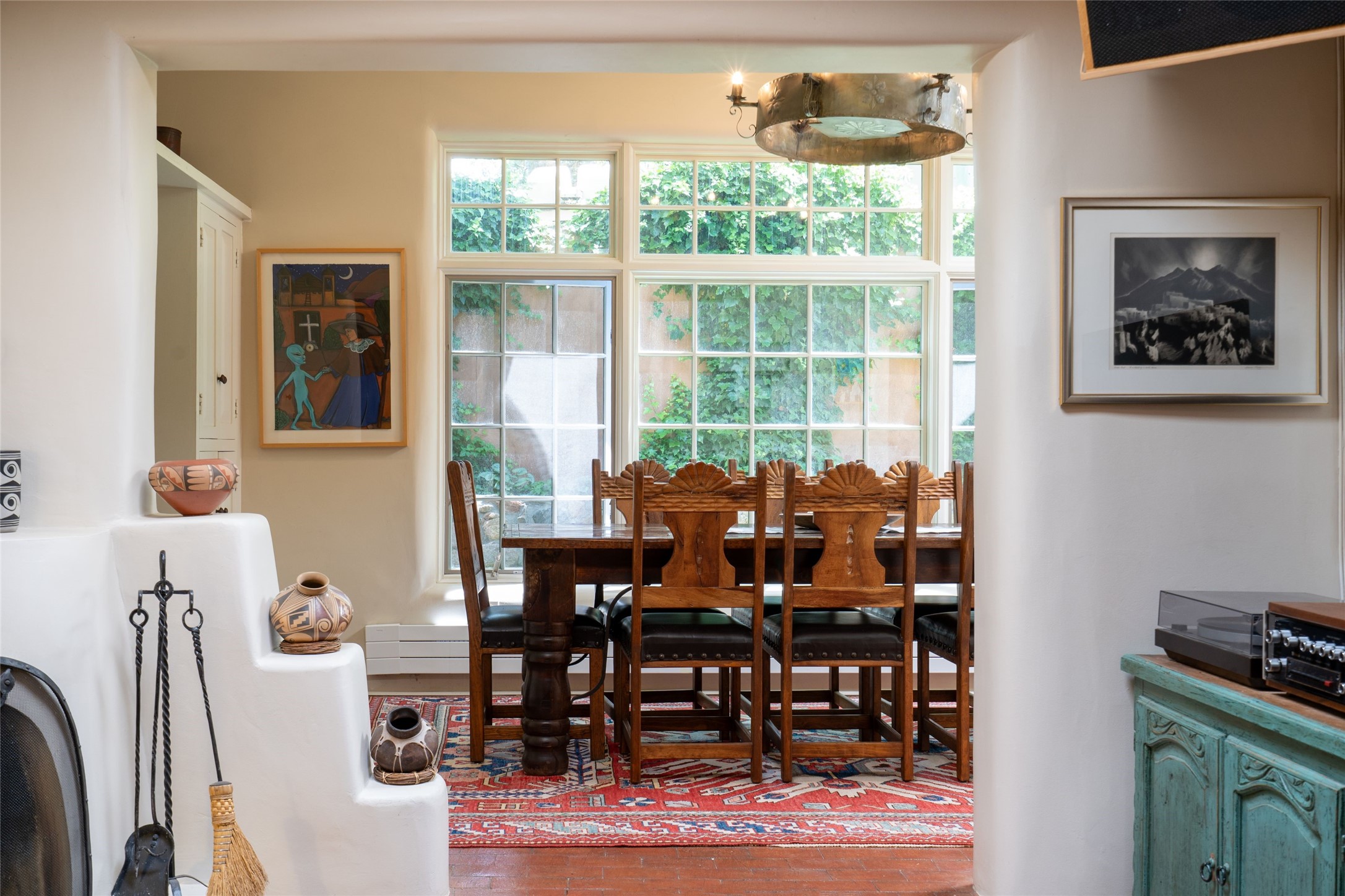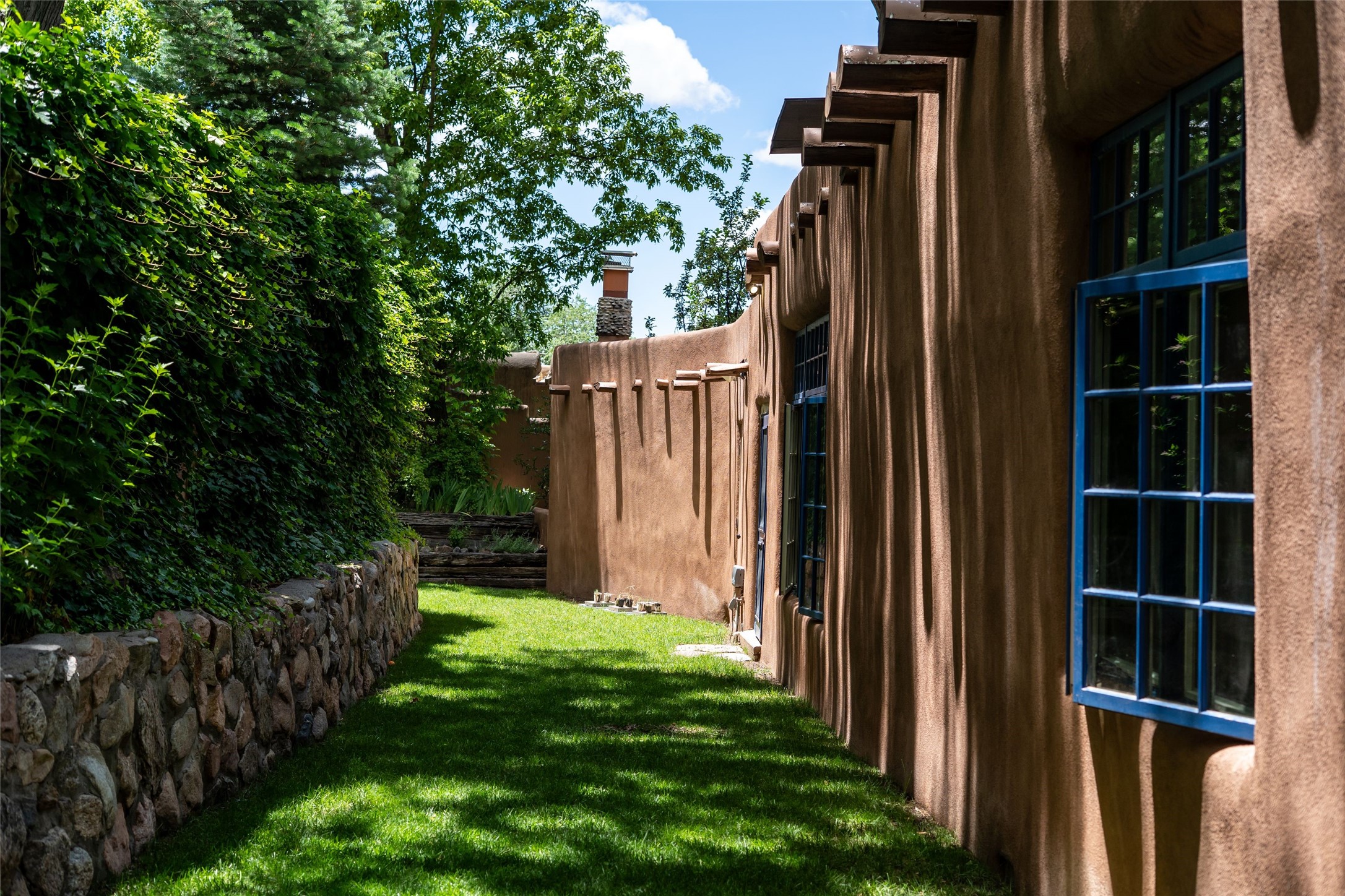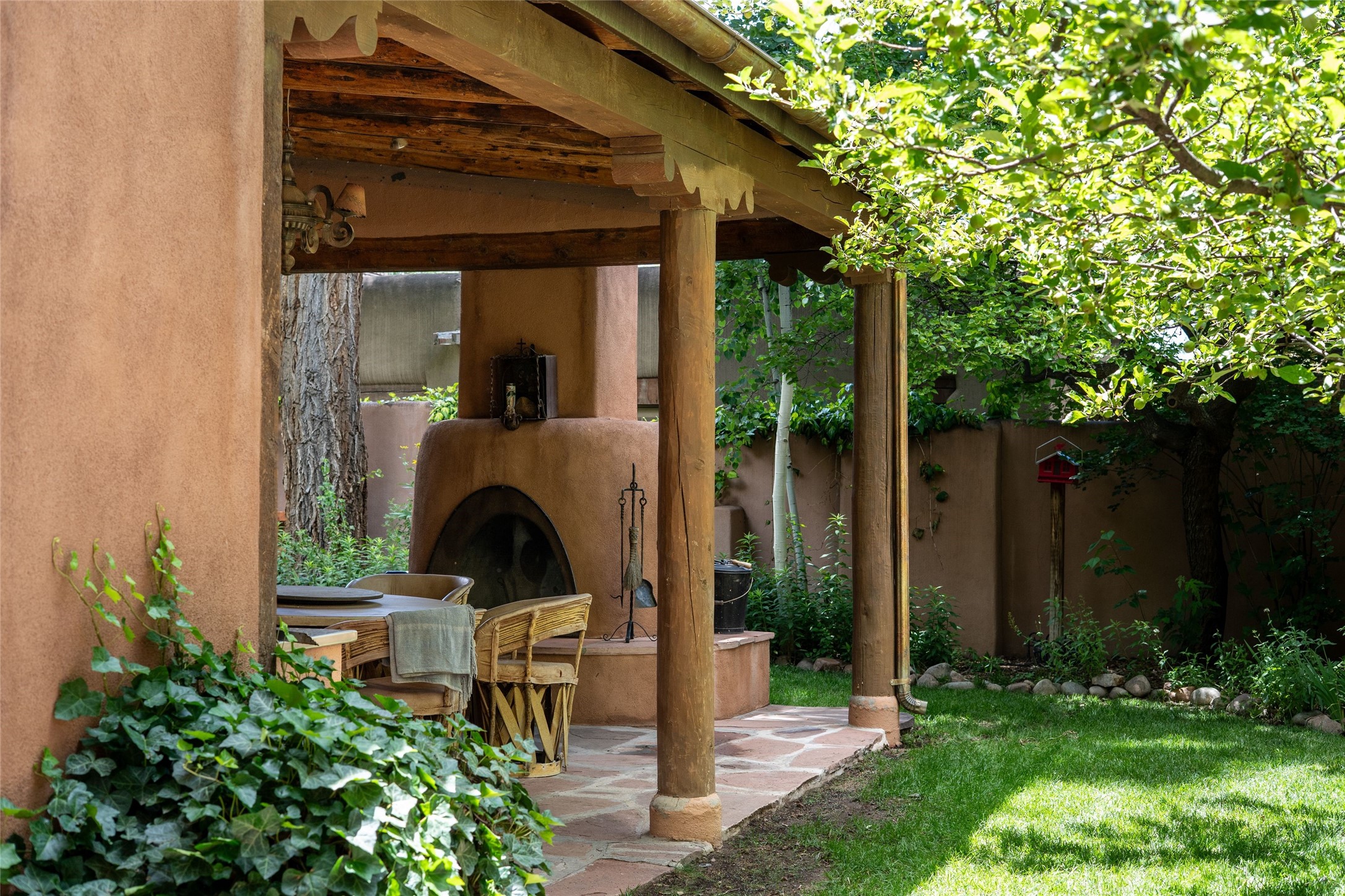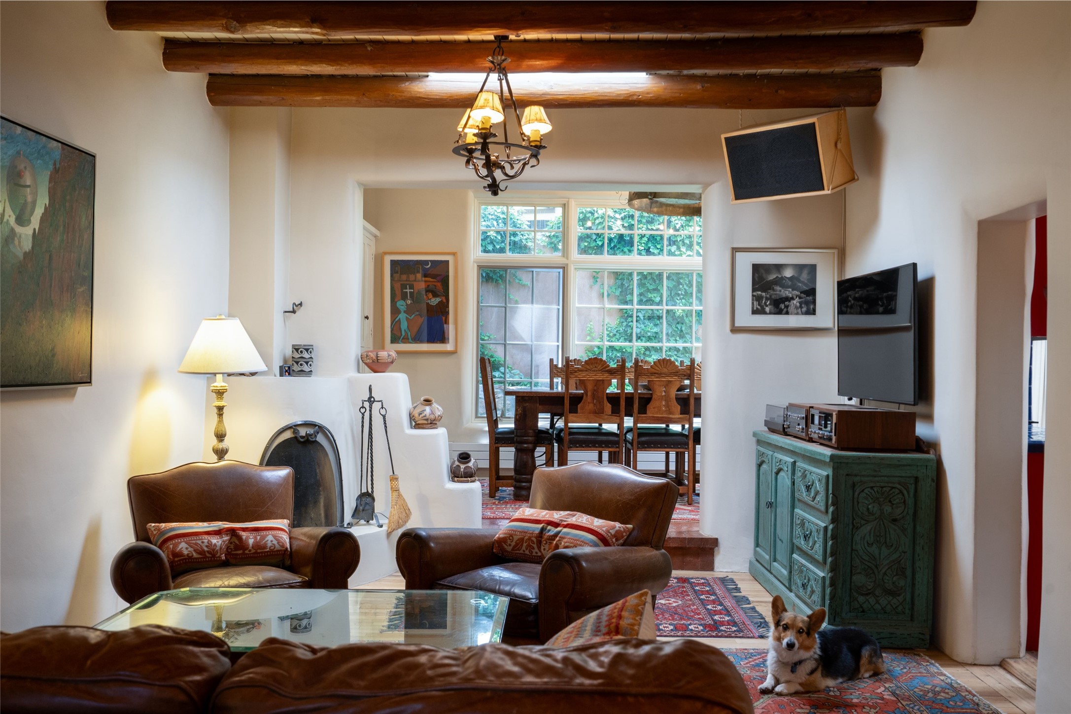 3 BED, 3 BATH ADOBE HOME | |2390 SQFT | HISTORIC EASTSIDE | Nestled on one of Santa Fe's most cherished streets, this exceptional adobe estate offers timeless charm and an unbeatable location--just 3 blocks from Canyon Road and Downtown Subscription, and six blocks from the historic Plaza. Enter through classic wooden gates into a private oasis featuring three lush, landscaped outdoor areas. The heart of the home is a vibrant kitchen adorned with hand-painted Talavera tile and custom tinwork by a local artisan. The adjacent dining area features mullioned windows framing garden views and a table that comfortably seats eight--perfect for entertaining. A step down from the dining room leads to the inviting living area, where a kiva fireplace, leather armchairs, and a cozy sofa create a warm and intimate gathering space. Each of the three bedrooms includes its own en suite bathroom and is brimming with Santa Fe style. The vast primary suite features a sitting room and its own outdoor sitting area. The first guest bedroom includes its own kiva fireplace and an office. The second guest bedroom opens directly onto a covered portal through double glass doors. The portal is designed for year-round enjoyment, with a large outdoor kiva fireplace, a built-in BBQ, a dining table for six, and ample lounge seating. Beyond, meandering garden paths lead to peaceful sitting areas enclosed by privacy walls--an ideal sanctuary for reading, relaxing, or soaking up Santa Fe's famous light.