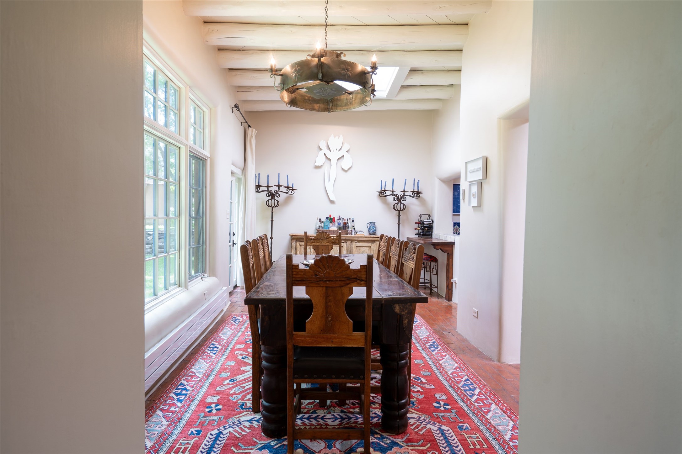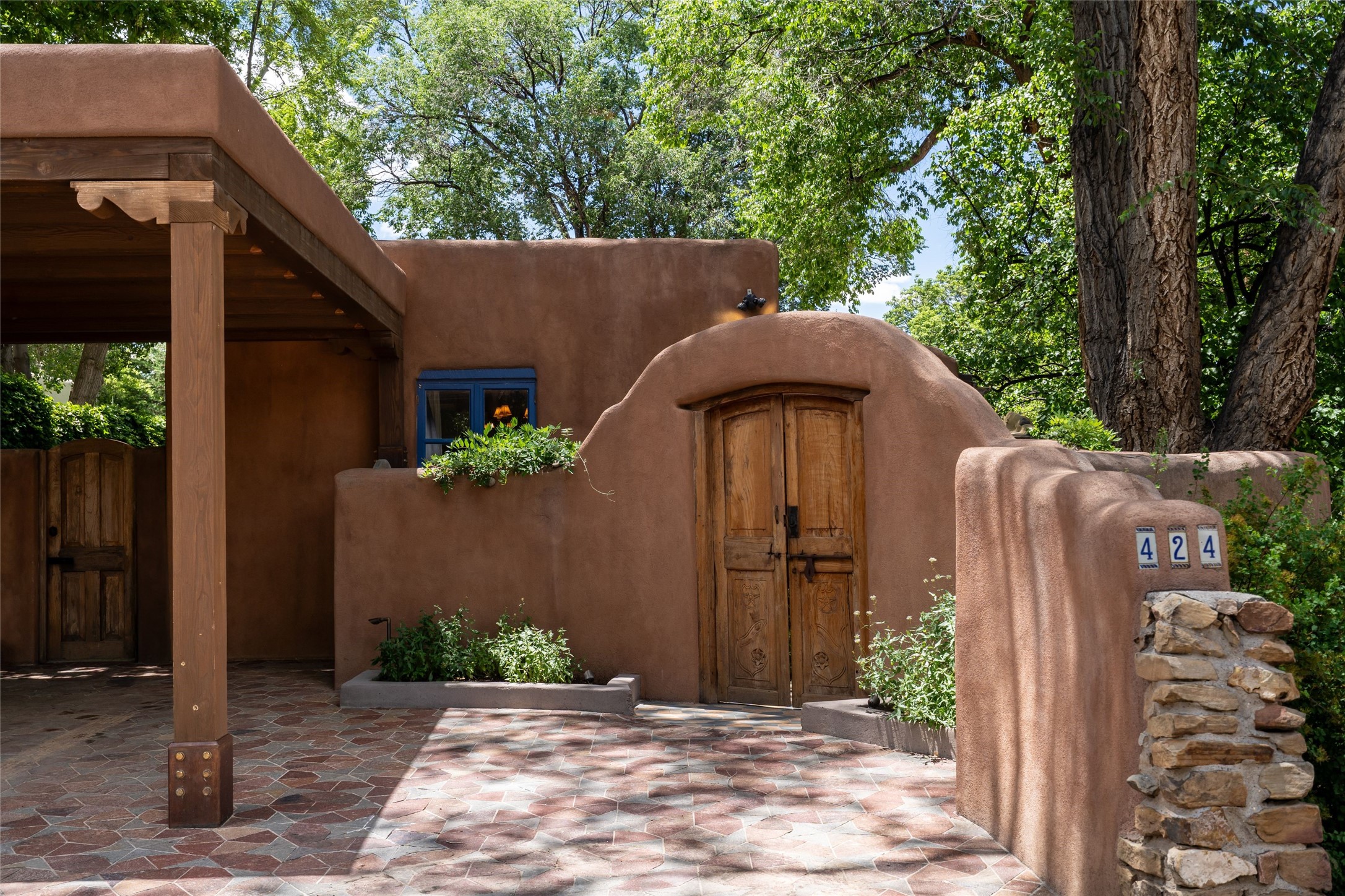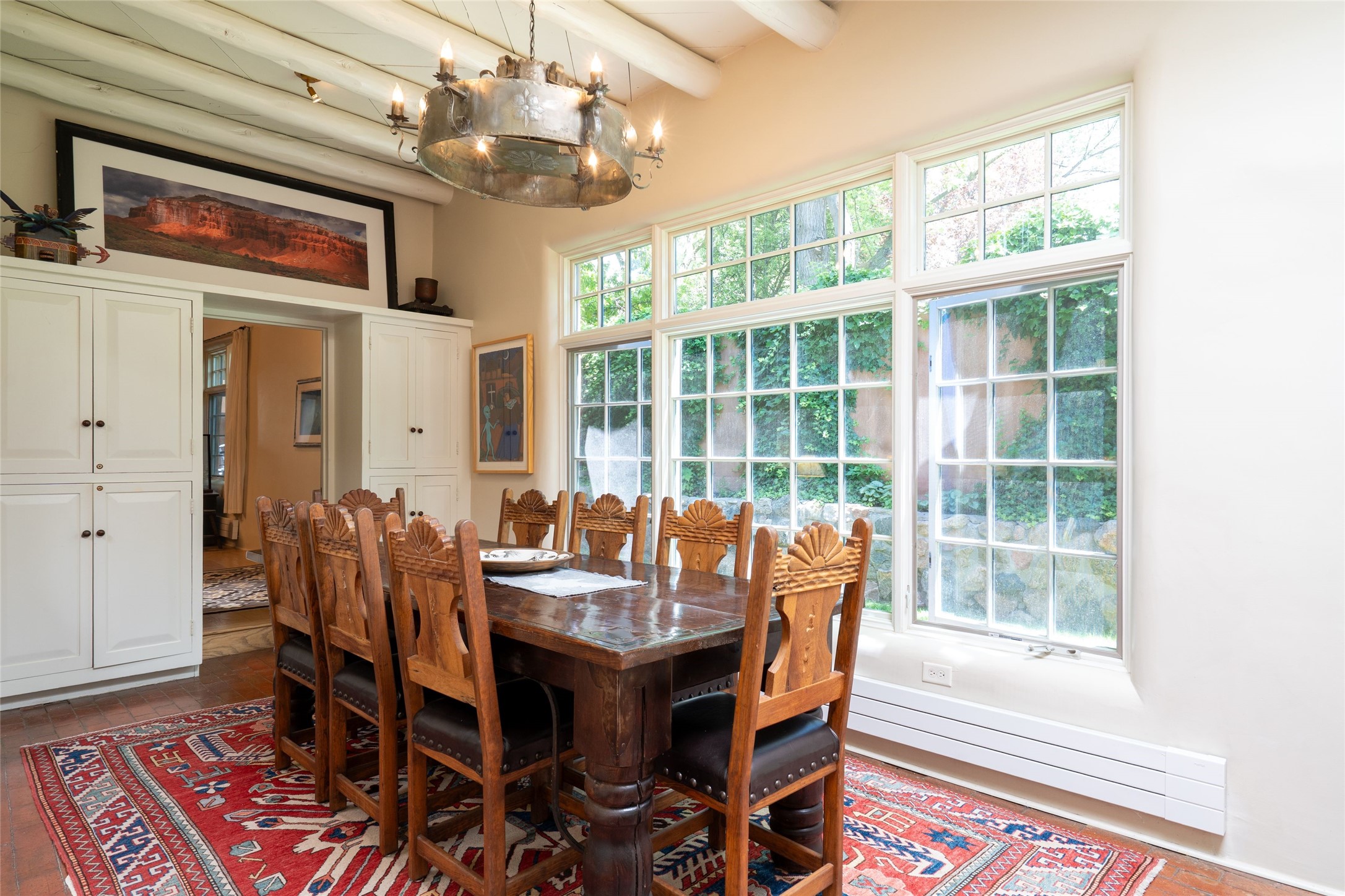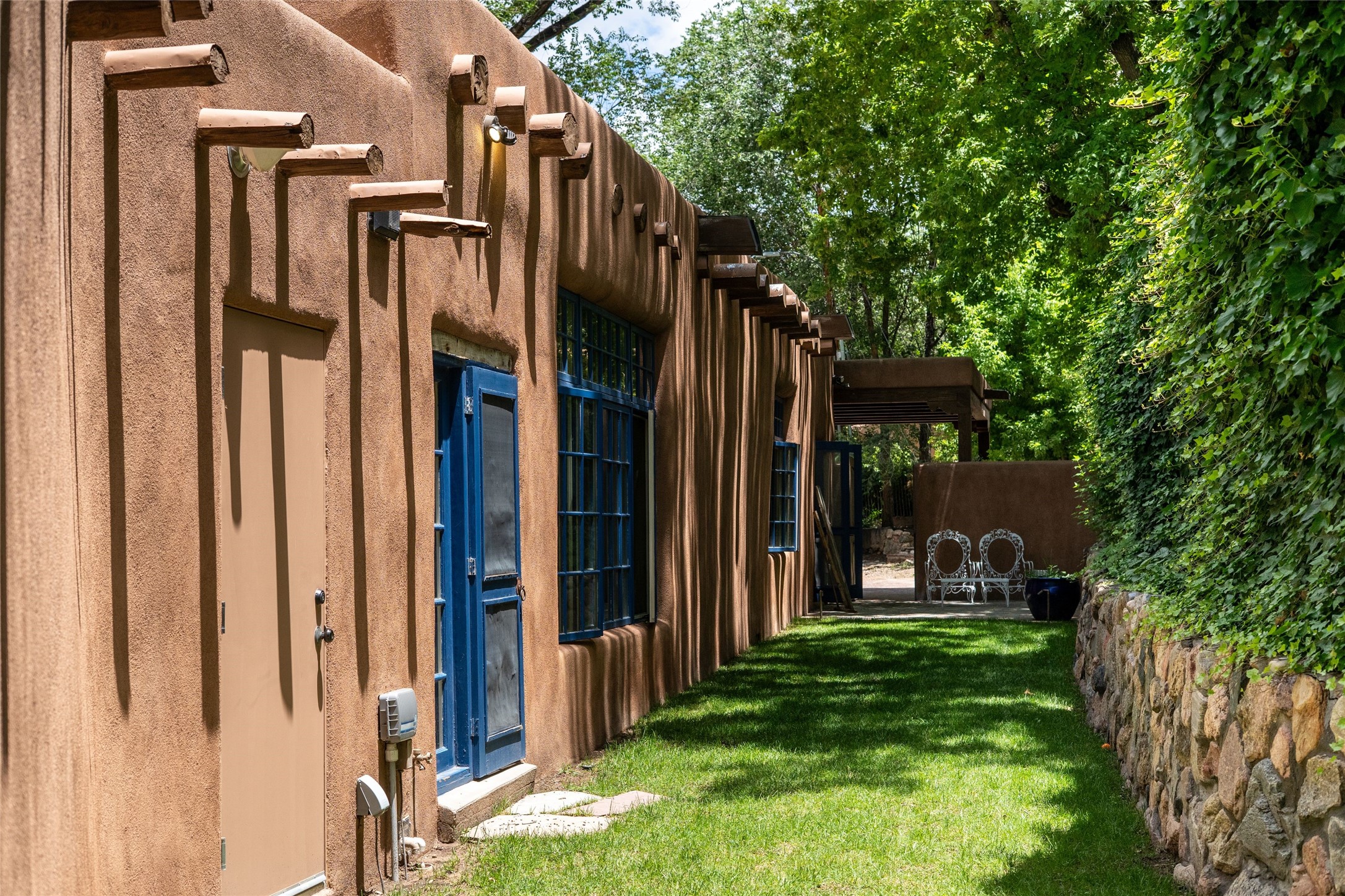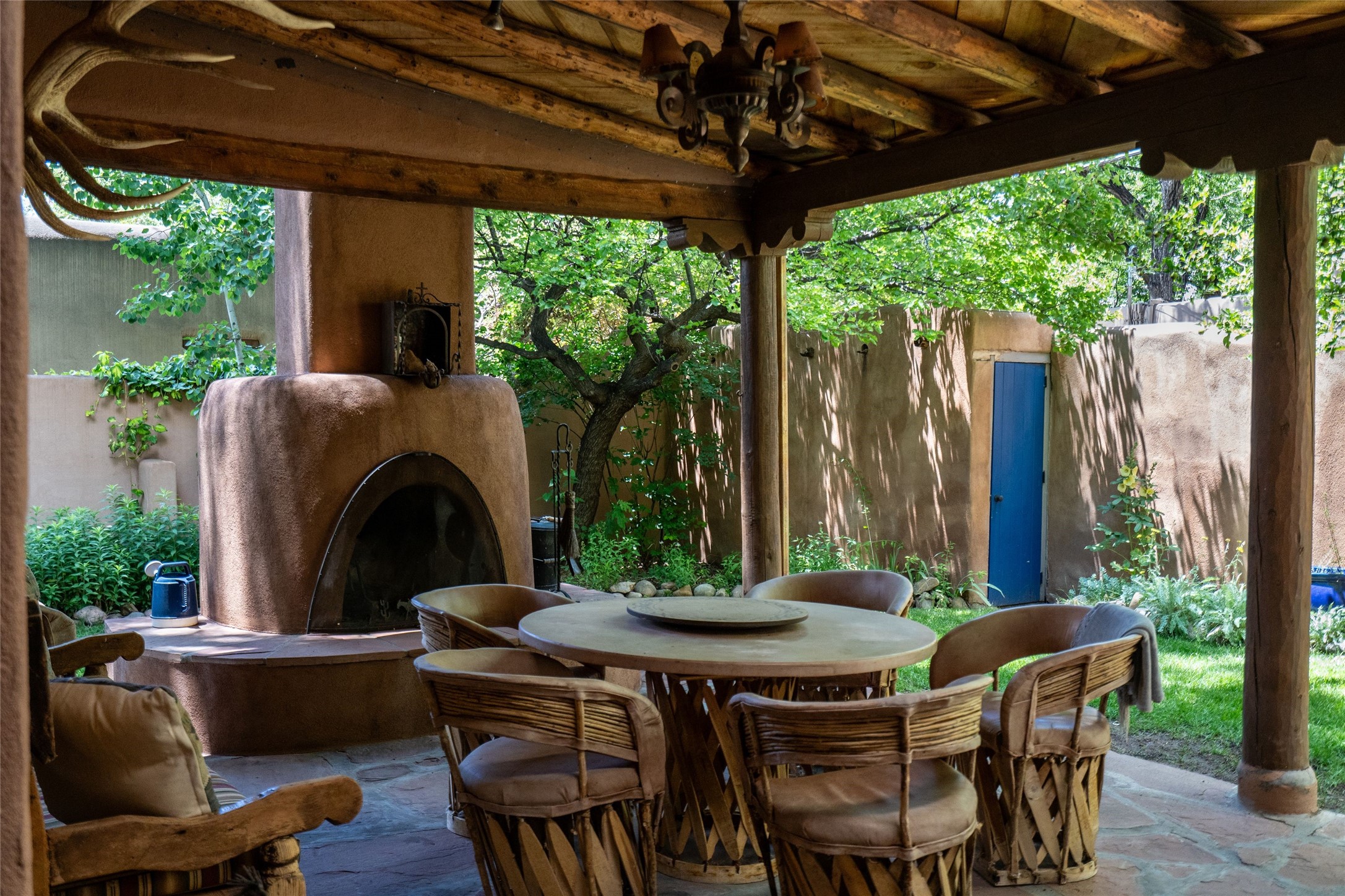 3 BED, 3 BATH ADOBE HOME | |2390 SQFT | HISTORIC EASTSIDE | Nestled on one of Santa Fe's most cherished streets, this exceptional adobe estate offers timeless charm and an unbeatable location--just 3 blocks from Canyon Road and Downtown Subscription, and six blocks from the historic Plaza. Enter through classic wooden gates into a private oasis featuring three lush, landscaped outdoor areas. The heart of the home is a vibrant kitchen adorned with hand-painted Talavera tile and custom tinwork by a local artisan. The adjacent dining area features mullioned windows framing garden views and a table that comfortably seats eight--perfect for entertaining. A step down from the dining room leads to the inviting living area, where a kiva fireplace, leather armchairs, and a cozy sofa create a warm and intimate gathering space. Each of the three bedrooms includes its own en suite bathroom and is brimming with Santa Fe style. The vast primary suite features a sitting room and its own outdoor sitting area. The first guest bedroom includes its own kiva fireplace and an office. The second guest bedroom opens directly onto a covered portal through double glass doors. The portal is designed for year-round enjoyment, with a large outdoor kiva fireplace, a built-in BBQ, a dining table for six, and ample lounge seating. Beyond, meandering garden paths lead to peaceful sitting areas enclosed by privacy walls--an ideal sanctuary for reading, relaxing, or soaking up Santa Fe's famous light.