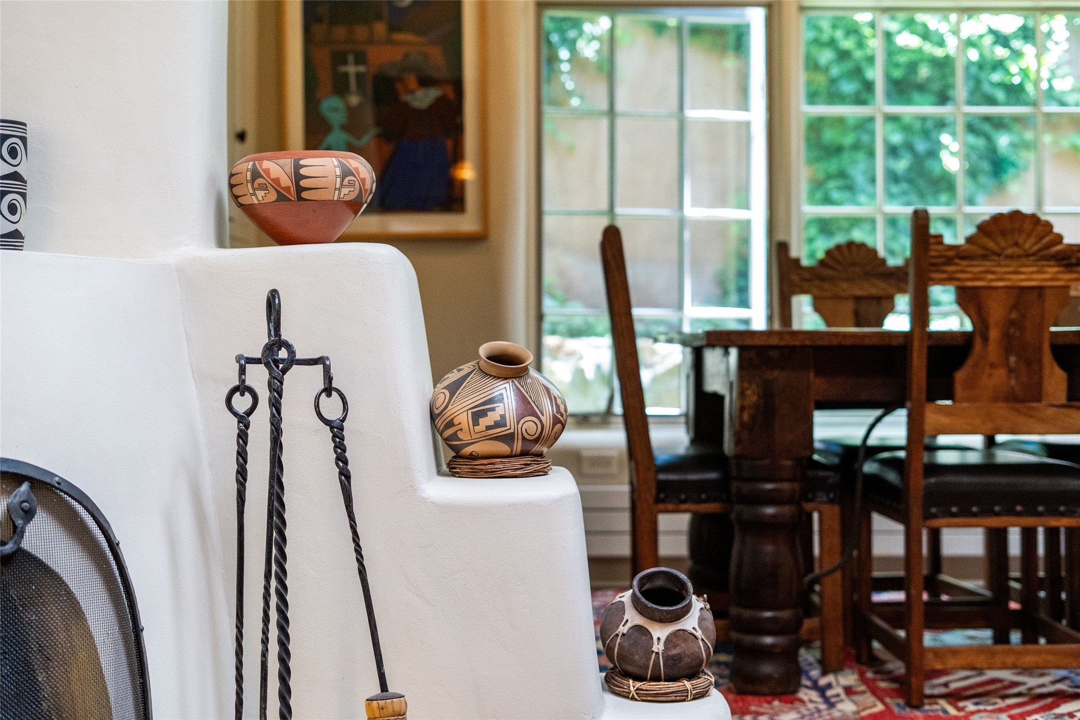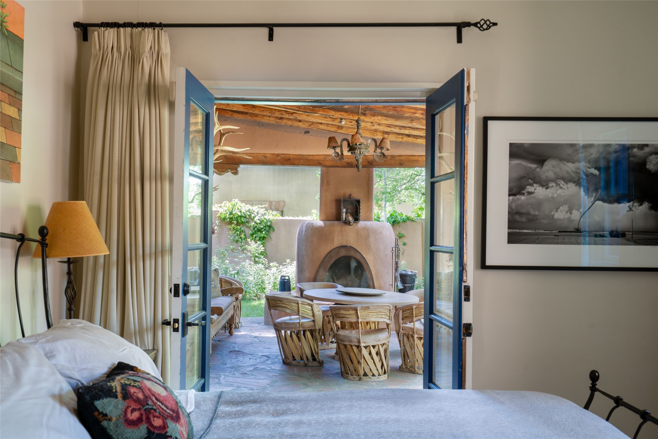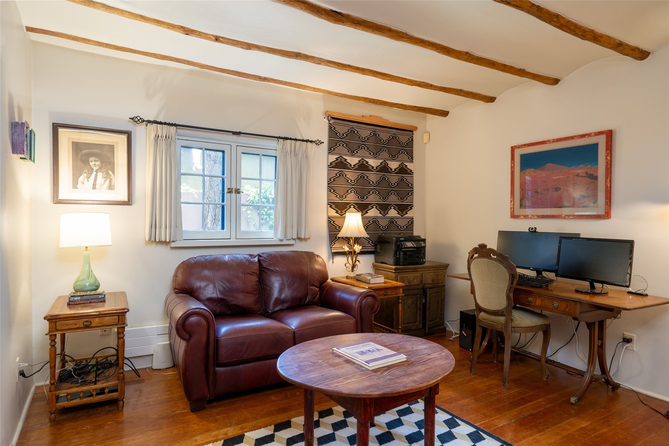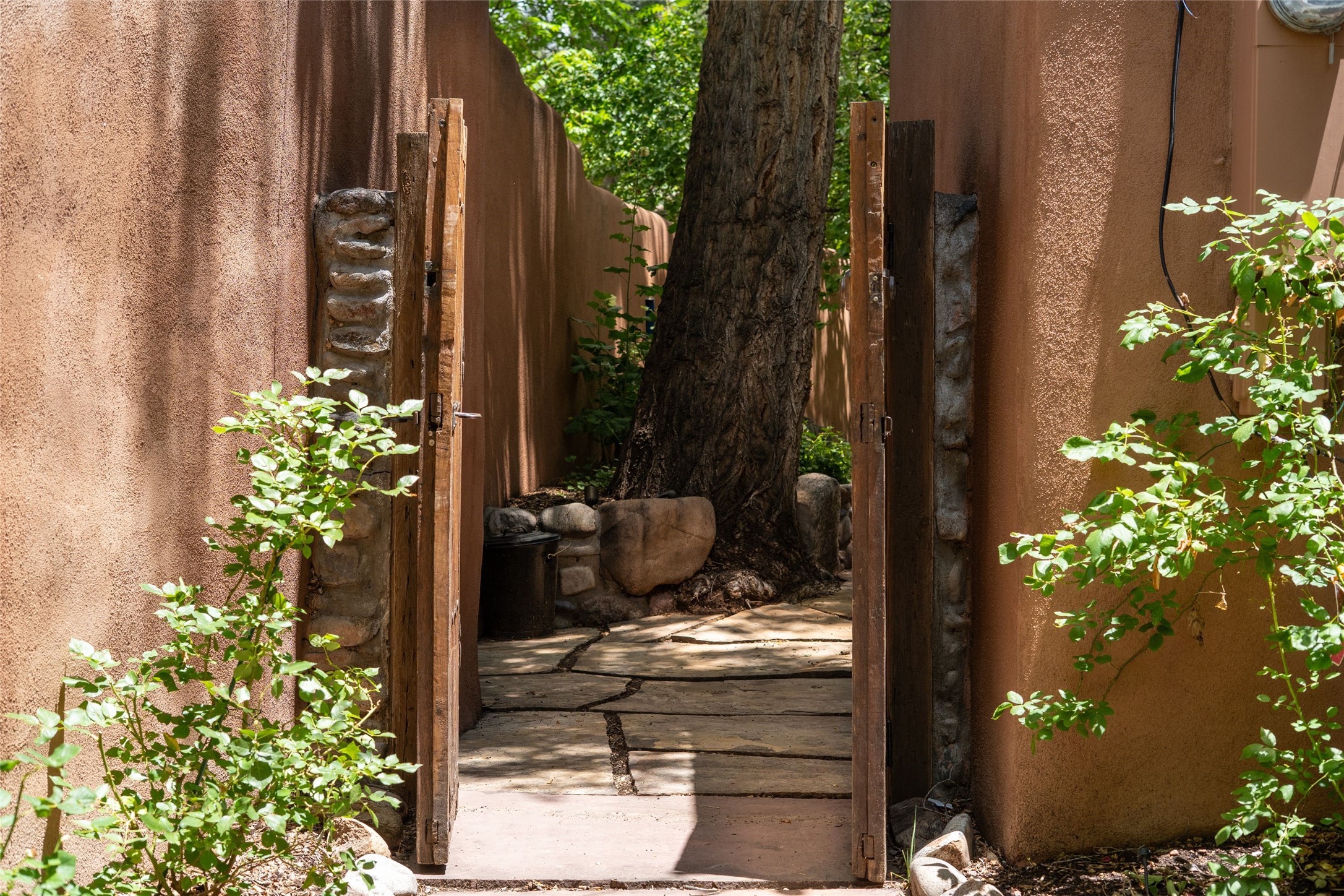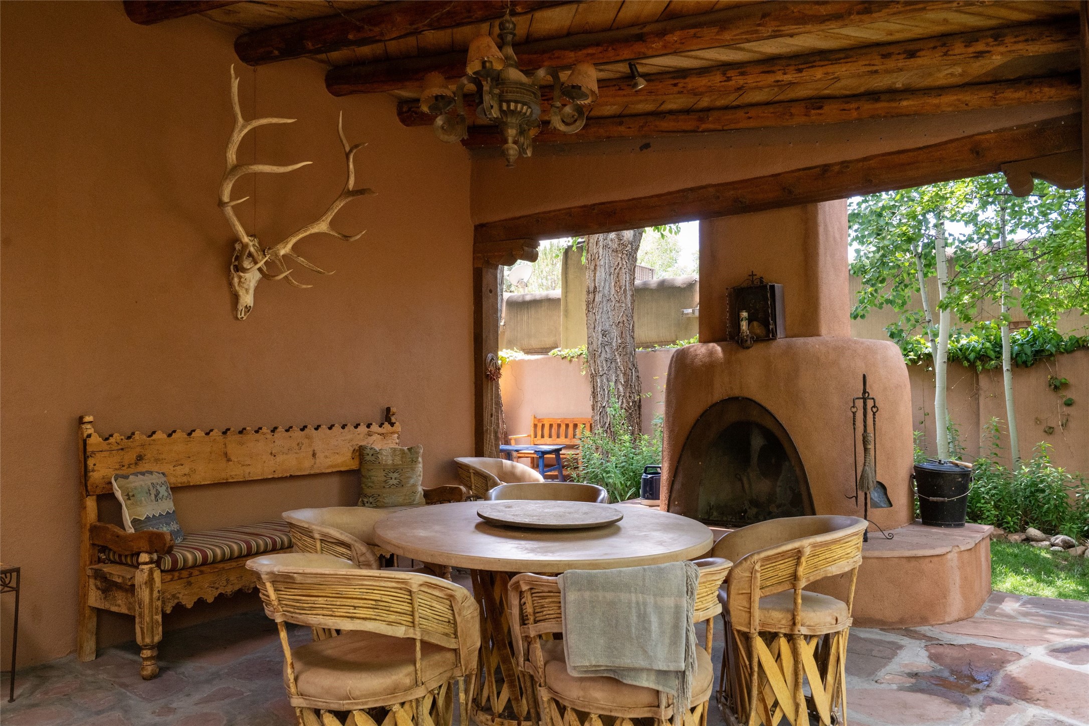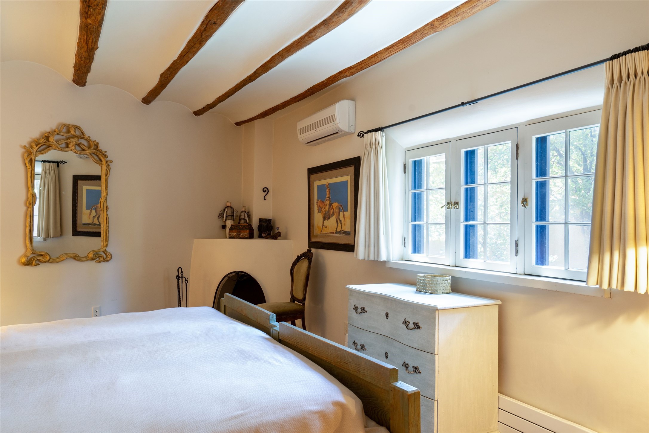 3 BED, 3 BATH ADOBE HOME | |2390 SQFT | HISTORIC EASTSIDE | Nestled on one of Santa Fe's most cherished streets, this exceptional adobe estate offers timeless charm and an unbeatable location--just 3 blocks from Canyon Road and Downtown Subscription, and six blocks from the historic Plaza. Enter through classic wooden gates into a private oasis featuring three lush, landscaped outdoor areas. The heart of the home is a vibrant kitchen adorned with hand-painted Talavera tile and custom tinwork by a local artisan. The adjacent dining area features mullioned windows framing garden views and a table that comfortably seats eight--perfect for entertaining. A step down from the dining room leads to the inviting living area, where a kiva fireplace, leather armchairs, and a cozy sofa create a warm and intimate gathering space. Each of the three bedrooms includes its own en suite bathroom and is brimming with Santa Fe style. The vast primary suite features a sitting room and its own outdoor sitting area. The first guest bedroom includes its own kiva fireplace and an office. The second guest bedroom opens directly onto a covered portal through double glass doors. The portal is designed for year-round enjoyment, with a large outdoor kiva fireplace, a built-in BBQ, a dining table for six, and ample lounge seating. Beyond, meandering garden paths lead to peaceful sitting areas enclosed by privacy walls--an ideal sanctuary for reading, relaxing, or soaking up Santa Fe's famous light.