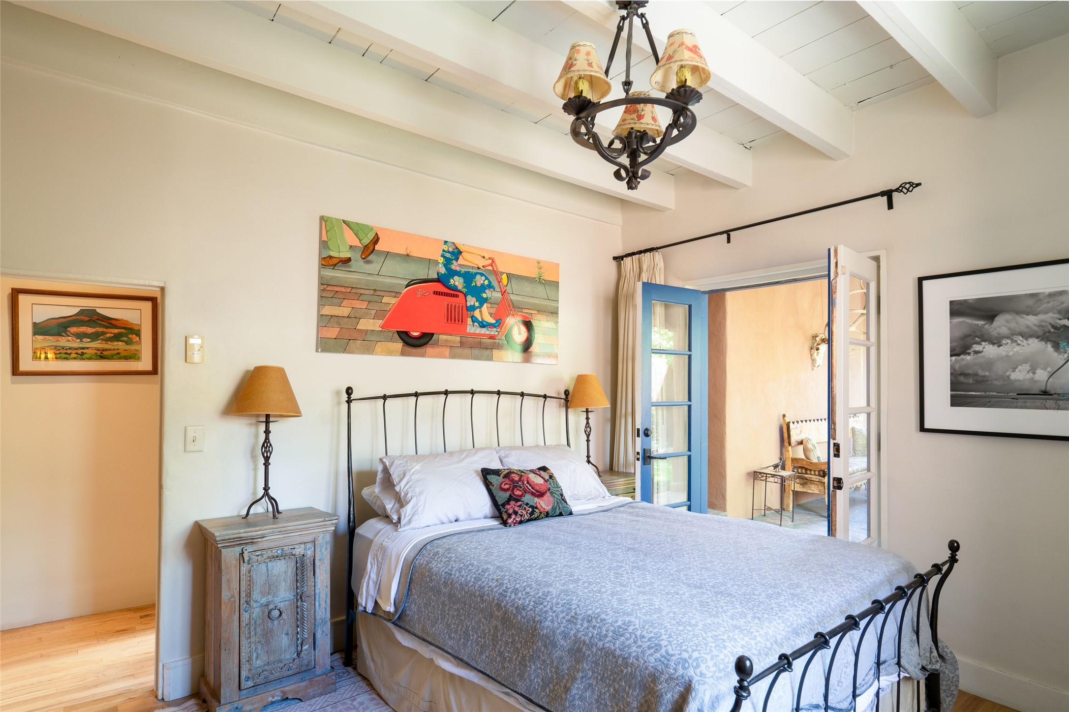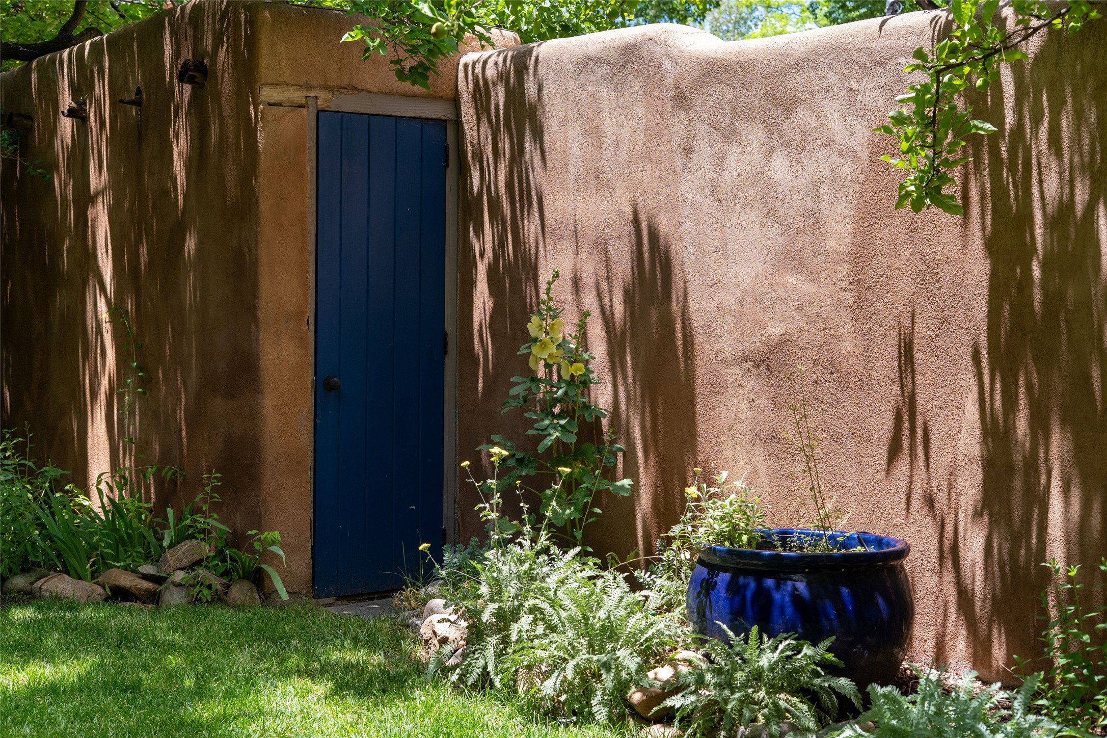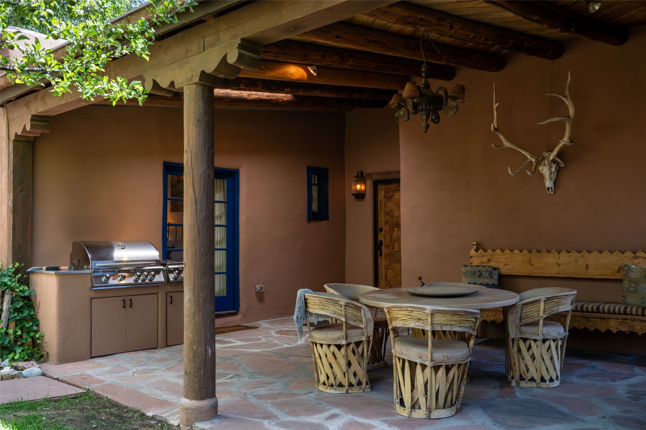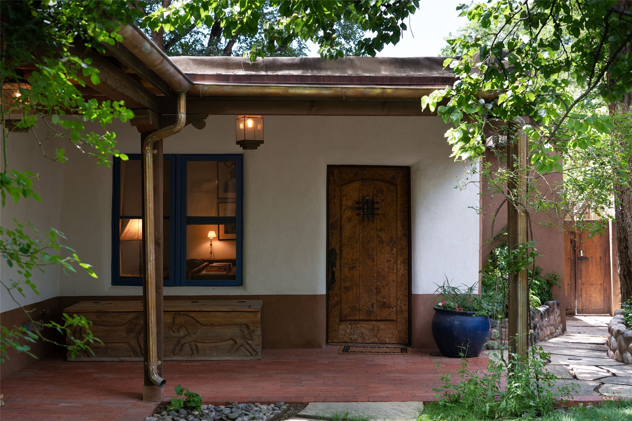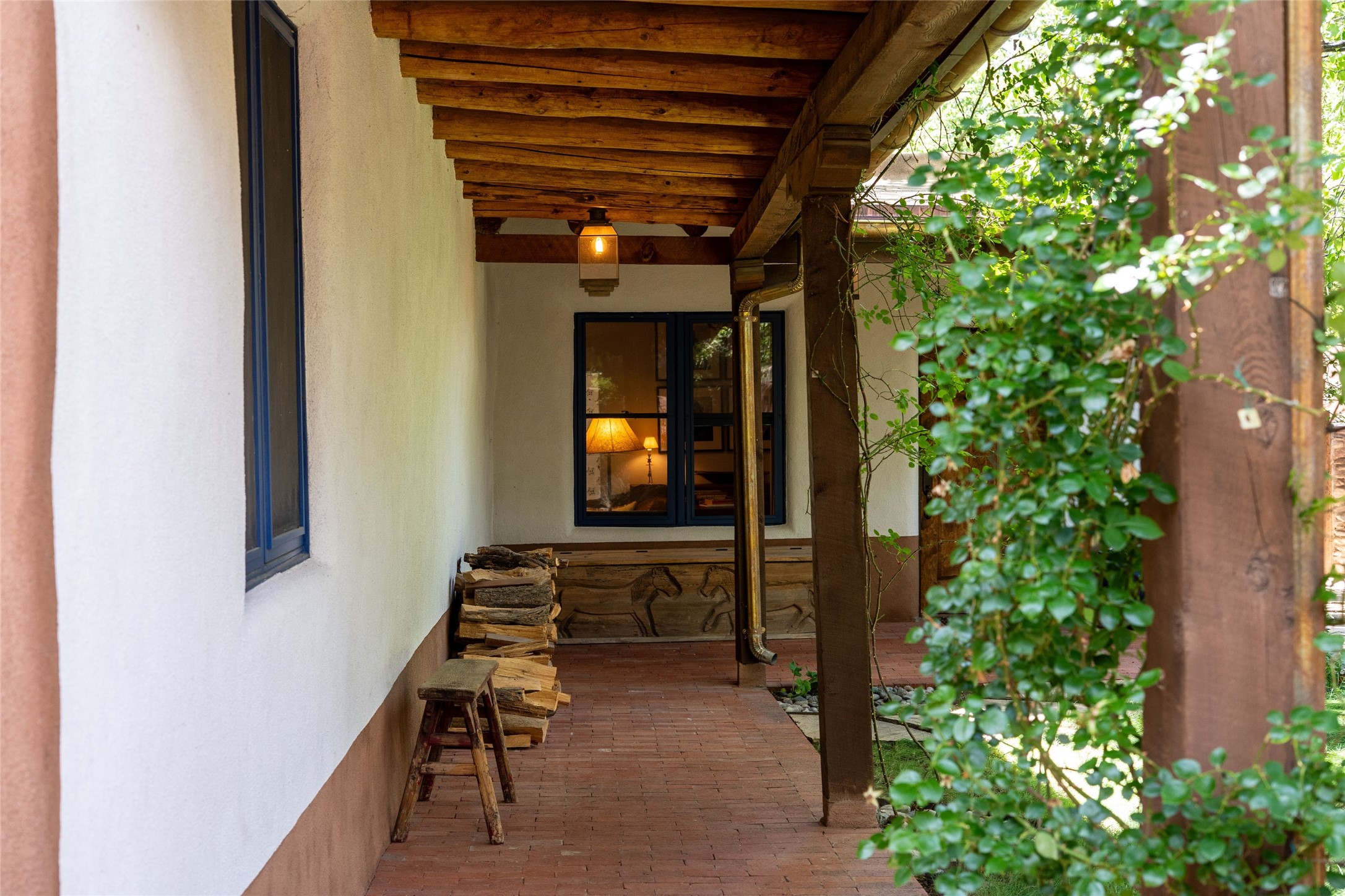 3 BED, 3 BATH ADOBE HOME | |2390 SQFT | HISTORIC EASTSIDE | Nestled on one of Santa Fe's most cherished streets, this exceptional adobe estate offers timeless charm and an unbeatable location--just 3 blocks from Canyon Road and Downtown Subscription, and six blocks from the historic Plaza. Enter through classic wooden gates into a private oasis featuring three lush, landscaped outdoor areas. The heart of the home is a vibrant kitchen adorned with hand-painted Talavera tile and custom tinwork by a local artisan. The adjacent dining area features mullioned windows framing garden views and a table that comfortably seats eight--perfect for entertaining. A step down from the dining room leads to the inviting living area, where a kiva fireplace, leather armchairs, and a cozy sofa create a warm and intimate gathering space. Each of the three bedrooms includes its own en suite bathroom and is brimming with Santa Fe style. The vast primary suite features a sitting room and its own outdoor sitting area. The first guest bedroom includes its own kiva fireplace and an office. The second guest bedroom opens directly onto a covered portal through double glass doors. The portal is designed for year-round enjoyment, with a large outdoor kiva fireplace, a built-in BBQ, a dining table for six, and ample lounge seating. Beyond, meandering garden paths lead to peaceful sitting areas enclosed by privacy walls--an ideal sanctuary for reading, relaxing, or soaking up Santa Fe's famous light.