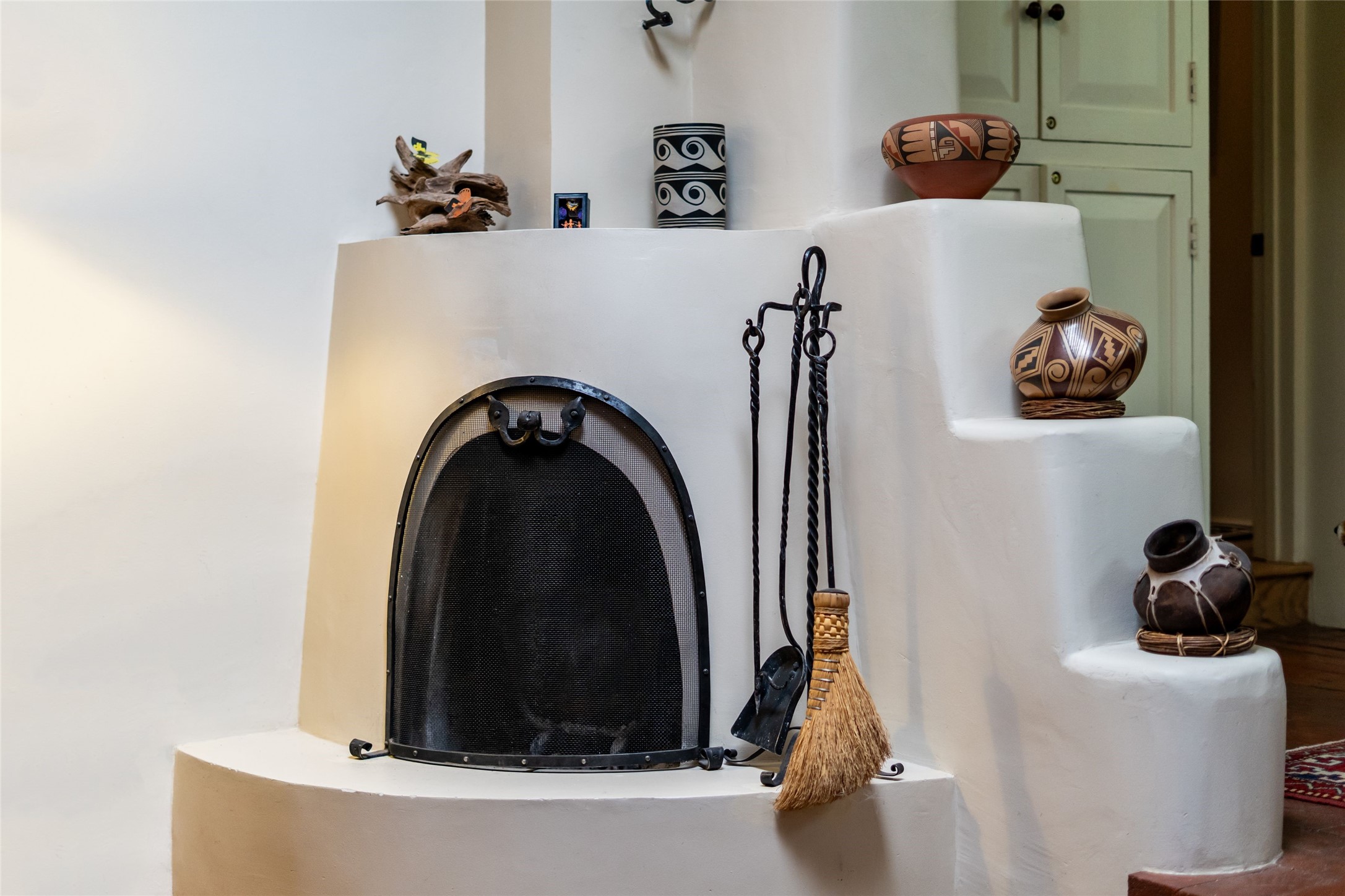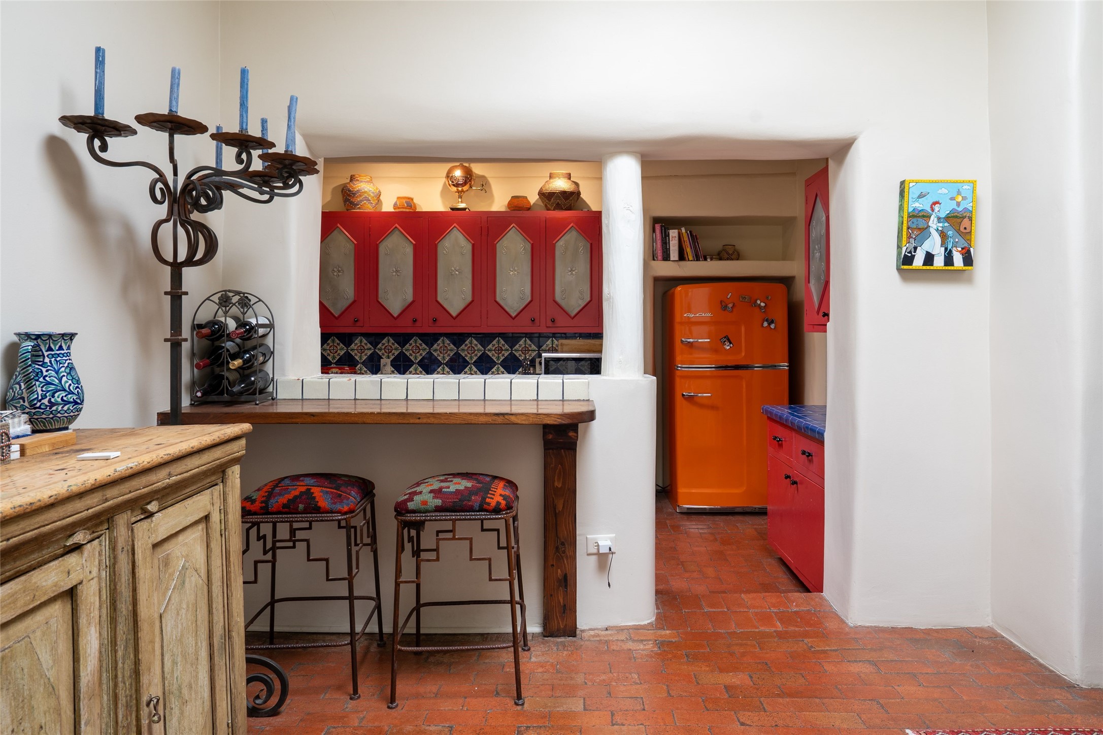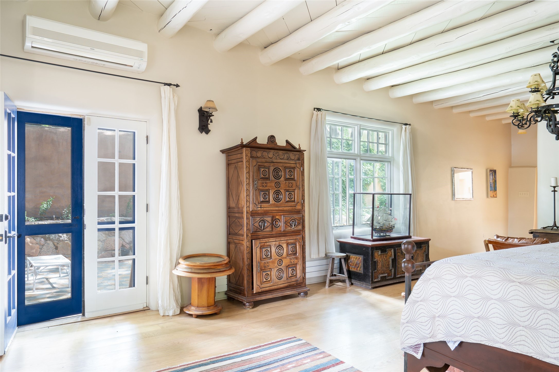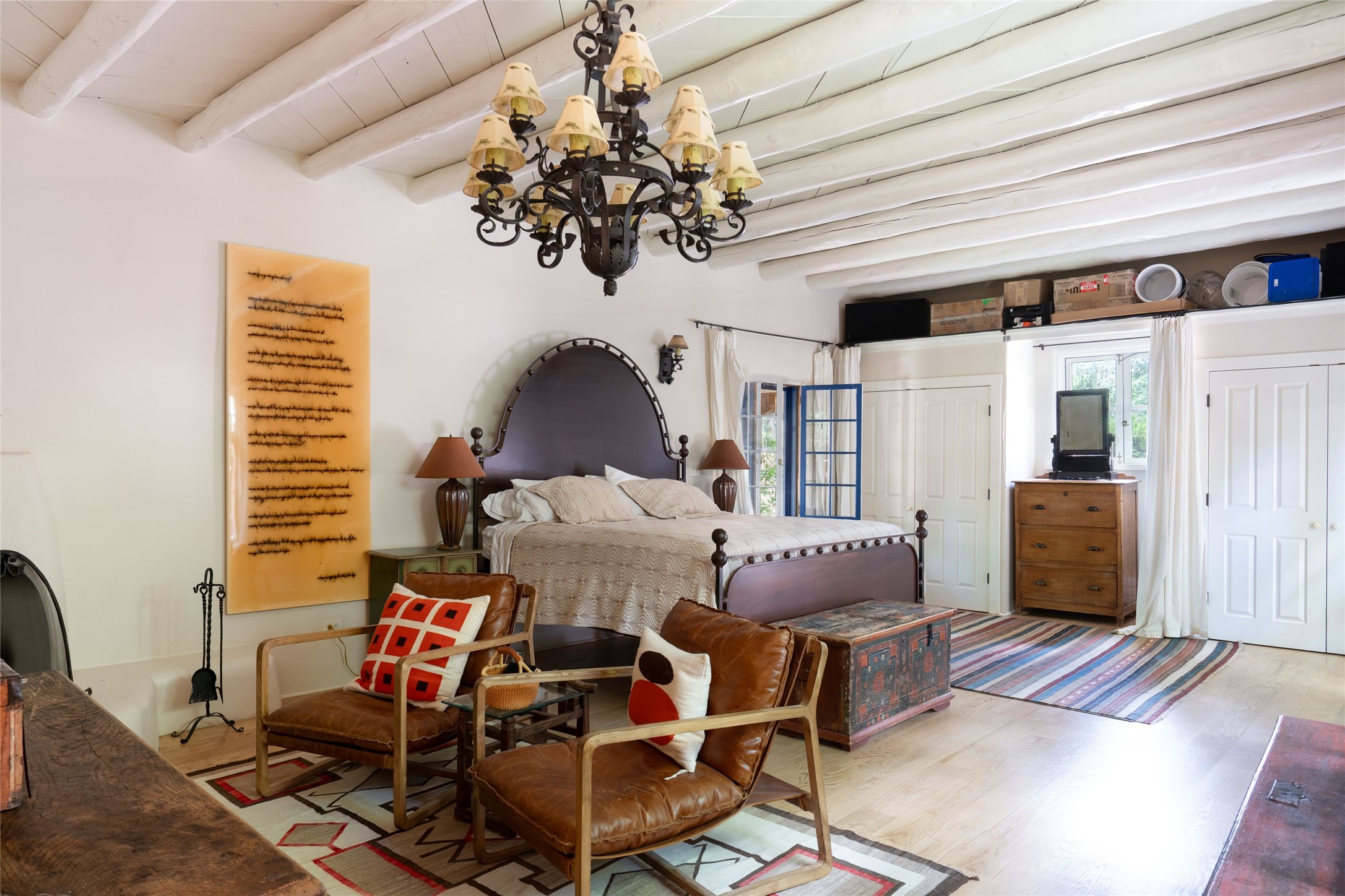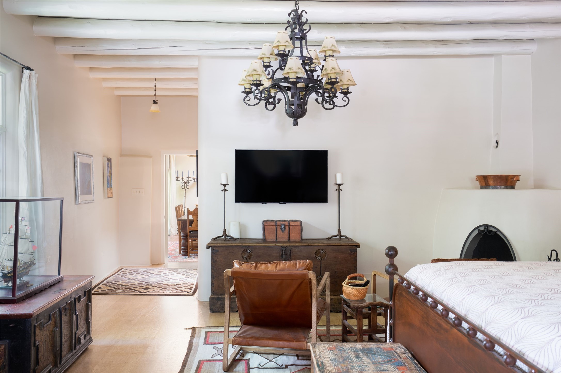 3 BED, 3 BATH ADOBE HOME | |2390 SQFT | HISTORIC EASTSIDE | Nestled on one of Santa Fe's most cherished streets, this exceptional adobe estate offers timeless charm and an unbeatable location--just 3 blocks from Canyon Road and Downtown Subscription, and six blocks from the historic Plaza. Enter through classic wooden gates into a private oasis featuring three lush, landscaped outdoor areas. The heart of the home is a vibrant kitchen adorned with hand-painted Talavera tile and custom tinwork by a local artisan. The adjacent dining area features mullioned windows framing garden views and a table that comfortably seats eight--perfect for entertaining. A step down from the dining room leads to the inviting living area, where a kiva fireplace, leather armchairs, and a cozy sofa create a warm and intimate gathering space. Each of the three bedrooms includes its own en suite bathroom and is brimming with Santa Fe style. The vast primary suite features a sitting room and its own outdoor sitting area. The first guest bedroom includes its own kiva fireplace and an office. The second guest bedroom opens directly onto a covered portal through double glass doors. The portal is designed for year-round enjoyment, with a large outdoor kiva fireplace, a built-in BBQ, a dining table for six, and ample lounge seating. Beyond, meandering garden paths lead to peaceful sitting areas enclosed by privacy walls--an ideal sanctuary for reading, relaxing, or soaking up Santa Fe's famous light.