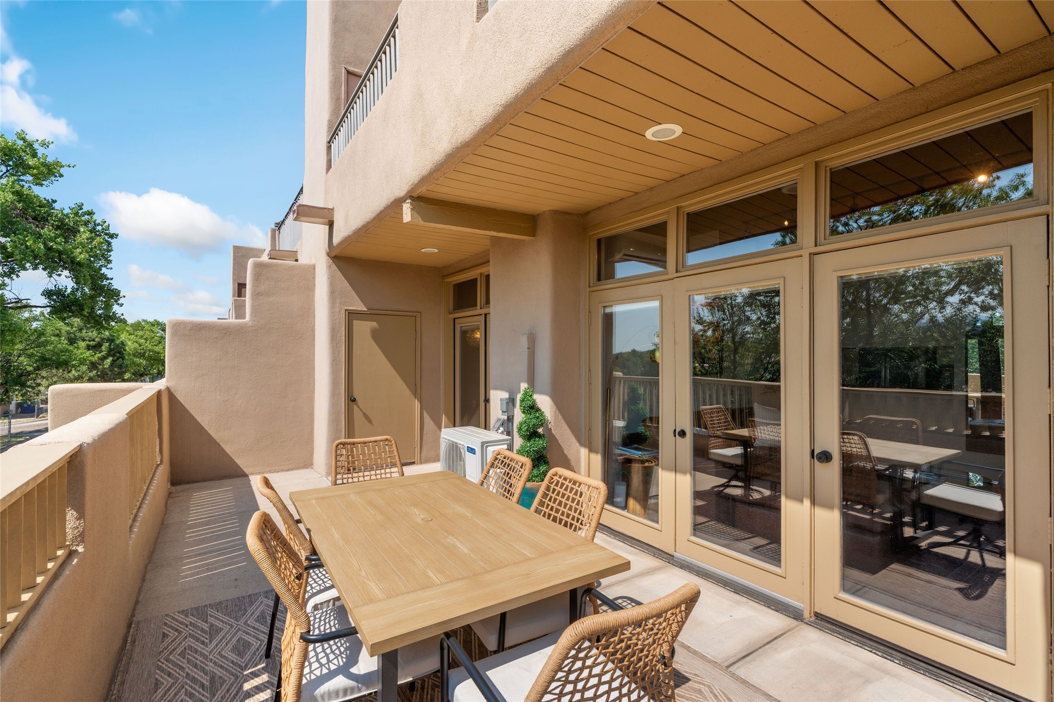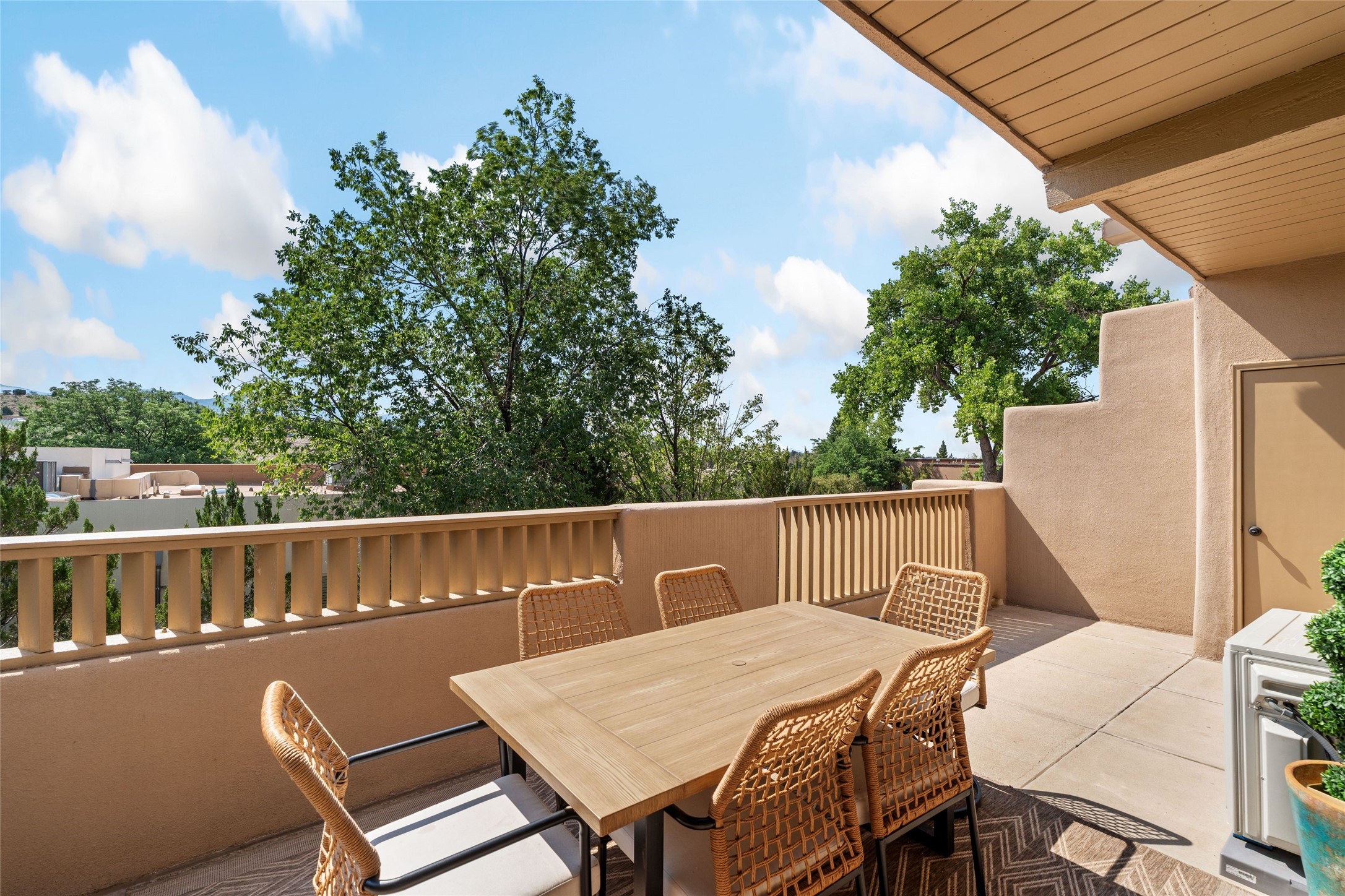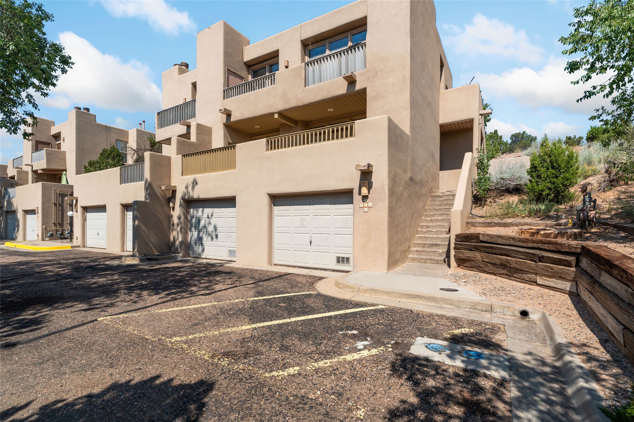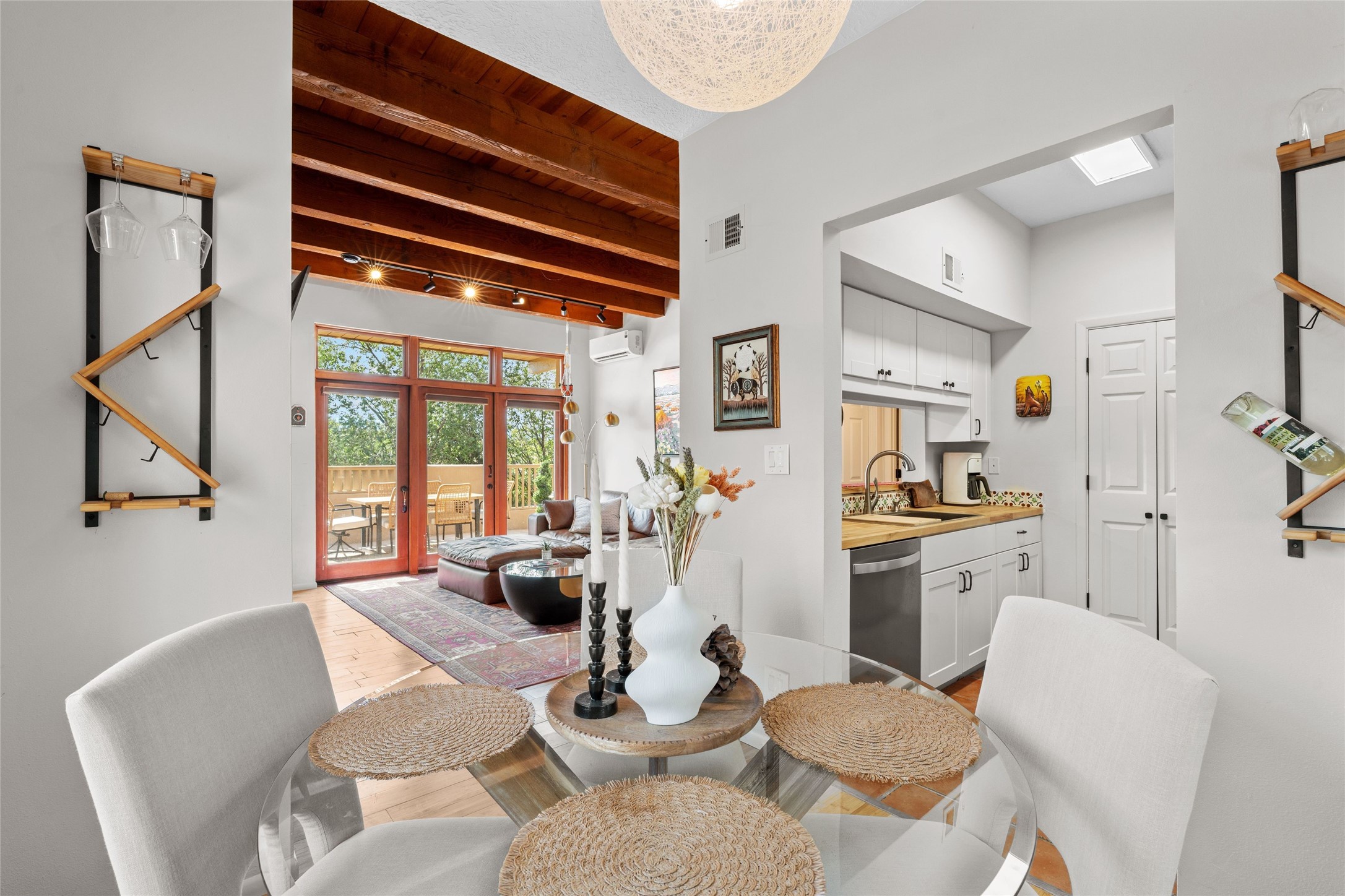 Charming 1-bedroom, 1-bath condo located in the convenient Viento del Norte Condominiums. This end unit offers a unique advantage with no neighbors on the north side, allowing for an abundance of natural light to fill your living space through extra windows. Bright and inviting interior flows seamlessly into a spacious balcony, nearly doubling your entertaining area. Imagine hosting friends and family as you enjoy the beautiful Santa Fe weather! The condo features elegant wood and tile floors, complemented by square-cut beamed ceilings that add a touch of rustic charm. The wood-framed glass doors enhance the open feel and bring the outdoors in. Create a relaxing atmosphere in the evenings by the stylish fireplace with glowing flames by touch of a button. The galley kitchen showcases white cabinets paired with butcher block countertops. A stacked washer/dryer is in the large pantry/storage area. This condo includes both assigned parking and a one-car garage downstairs, offering added value and ease. Just minutes from the Devargas Center and downtown Santa Fe. An ideal condo for a seasonal foothold in Santa Fe, a profitable rental property, or a carefree home in a prime part of Santa Fe.