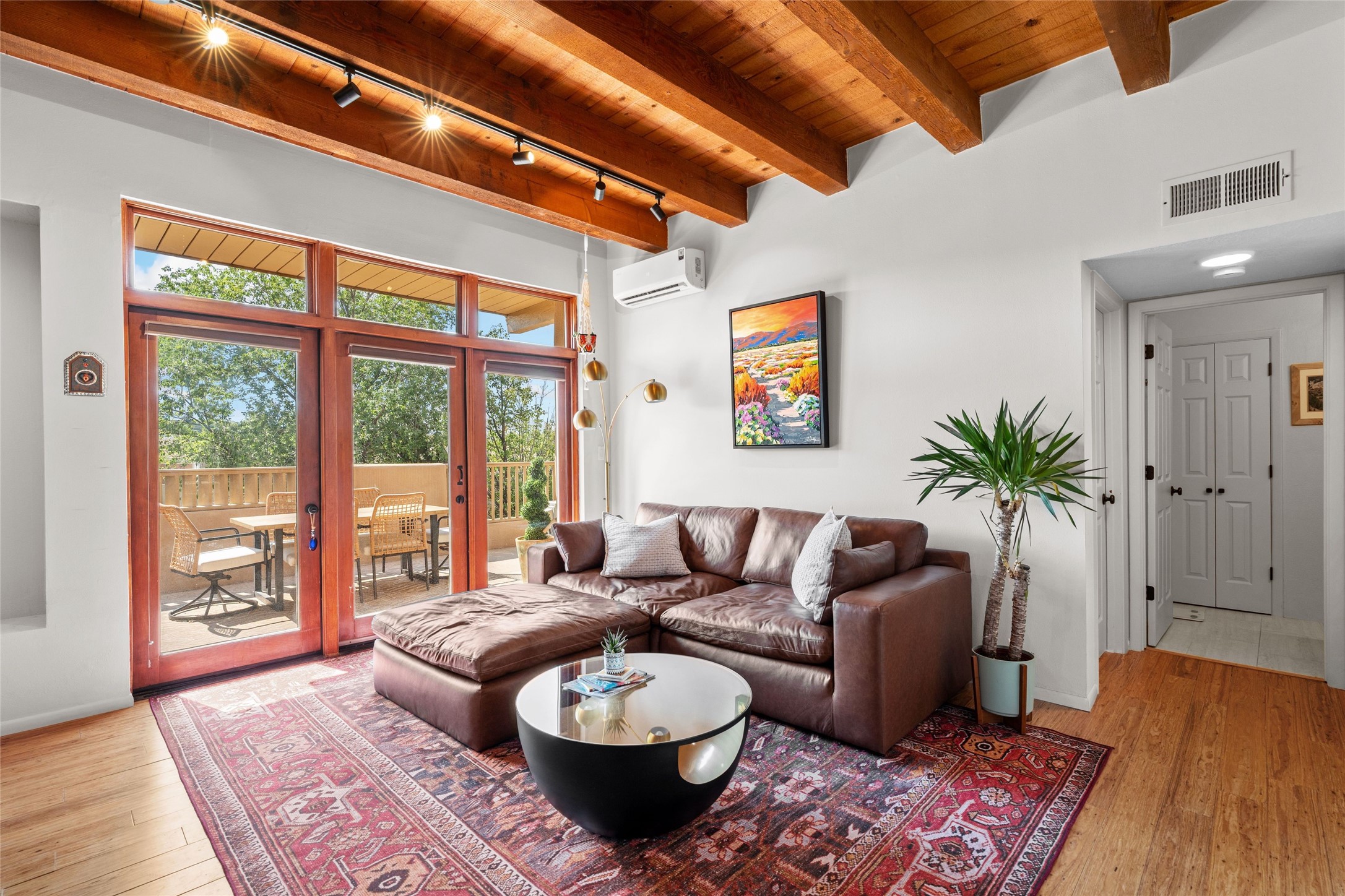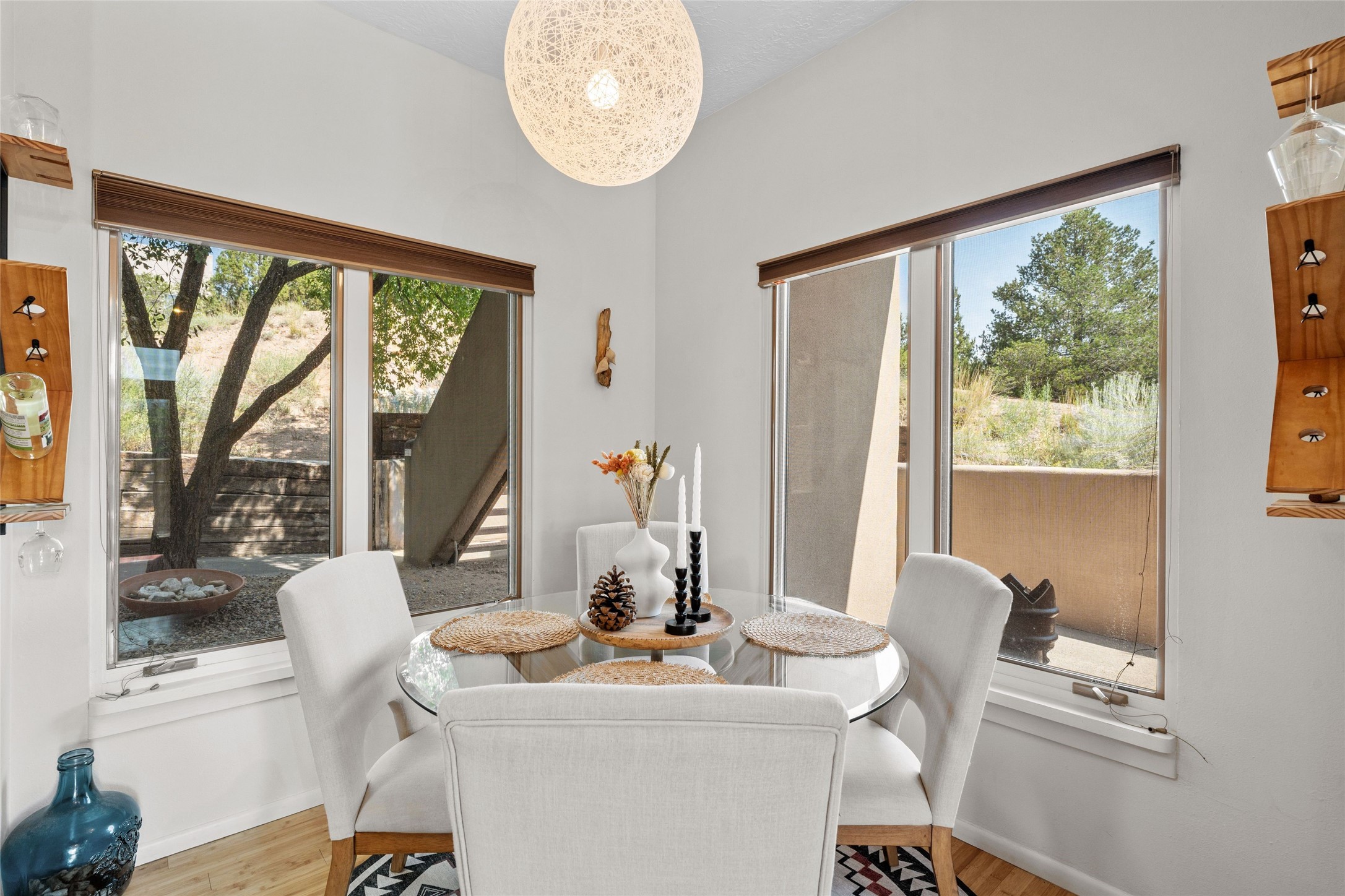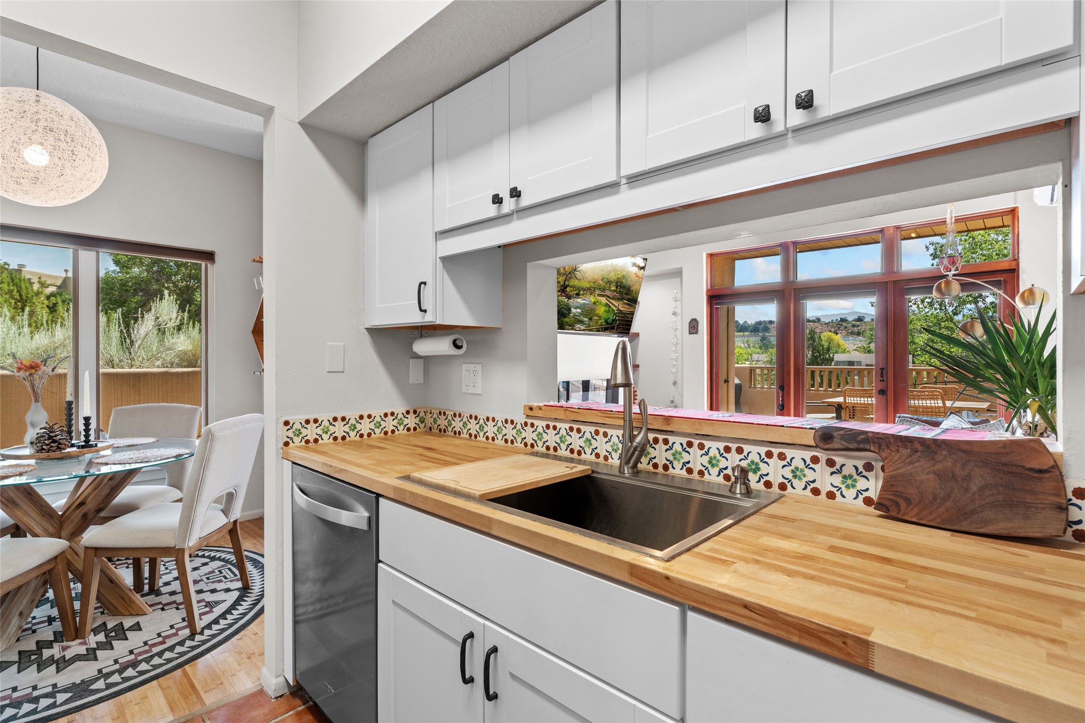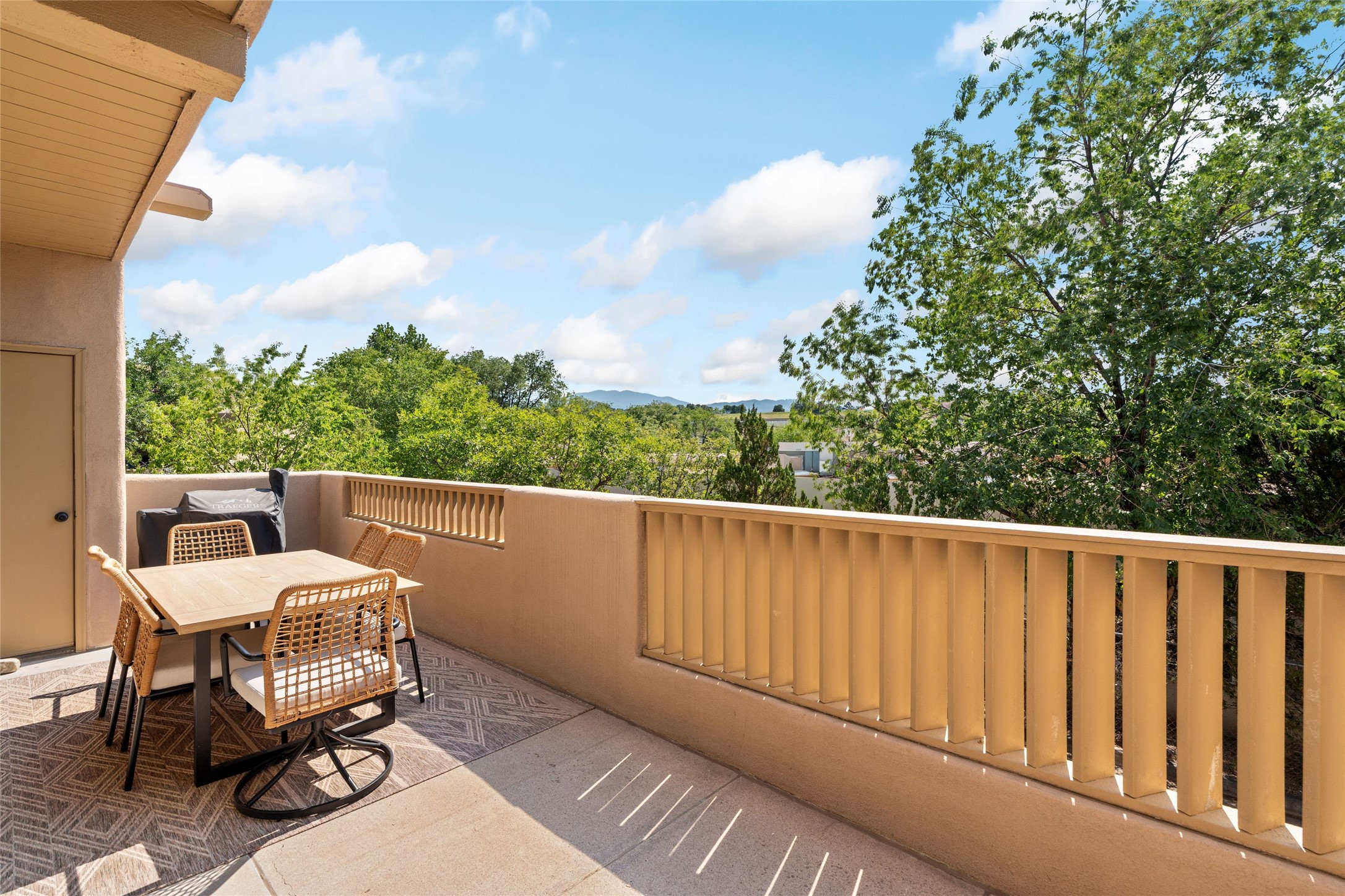 Charming 1-bedroom, 1-bath condo located in the convenient Viento del Norte Condominiums. This end unit offers a unique advantage with no neighbors on the north side, allowing for an abundance of natural light to fill your living space through extra windows. Bright and inviting interior flows seamlessly into a spacious balcony, nearly doubling your entertaining area. Imagine hosting friends and family as you enjoy the beautiful Santa Fe weather! The condo features elegant wood and tile floors, complemented by square-cut beamed ceilings that add a touch of rustic charm. The wood-framed glass doors enhance the open feel and bring the outdoors in. Create a relaxing atmosphere in the evenings by the stylish fireplace with glowing flames by touch of a button. The galley kitchen showcases white cabinets paired with butcher block countertops. A stacked washer/dryer is in the large pantry/storage area. This condo includes both assigned parking and a one-car garage downstairs, offering added value and ease. Just minutes from the Devargas Center and downtown Santa Fe. An ideal condo for a seasonal foothold in Santa Fe, a profitable rental property, or a carefree home in a prime part of Santa Fe.